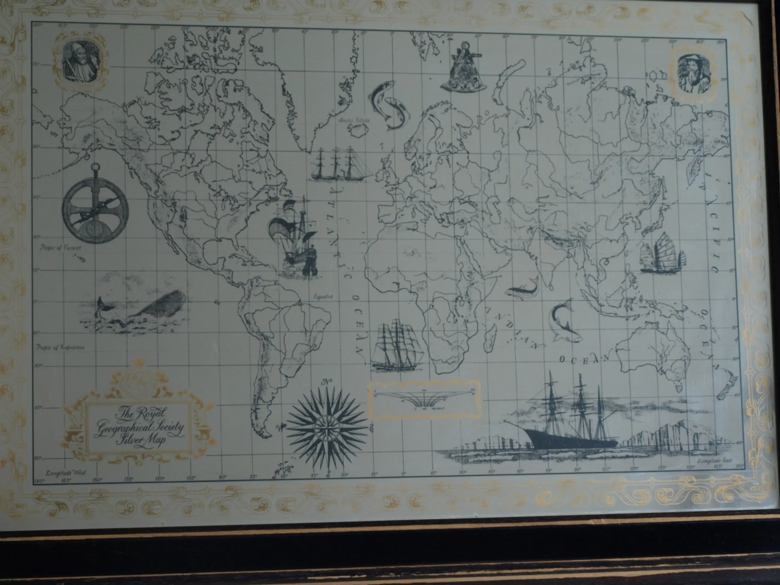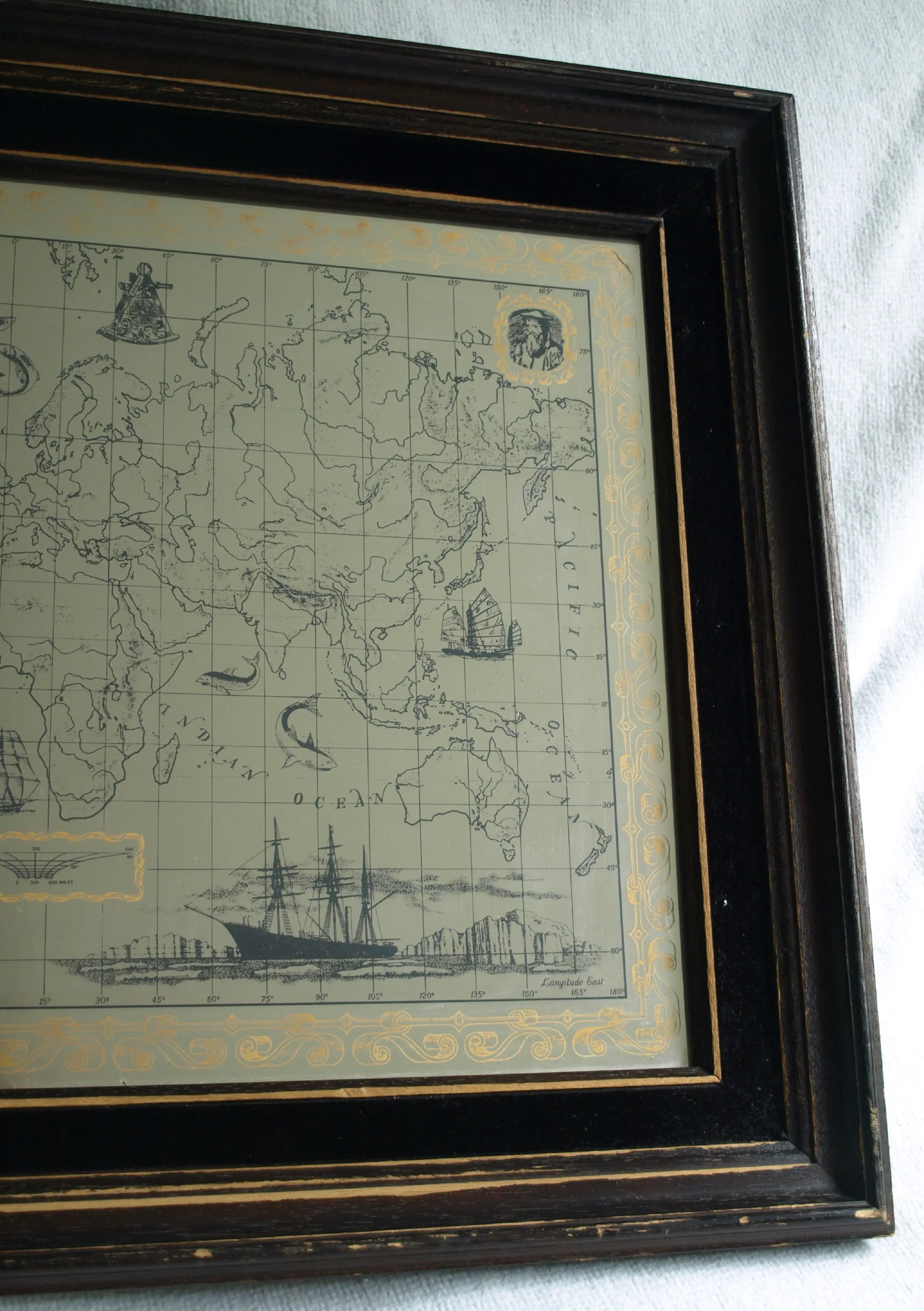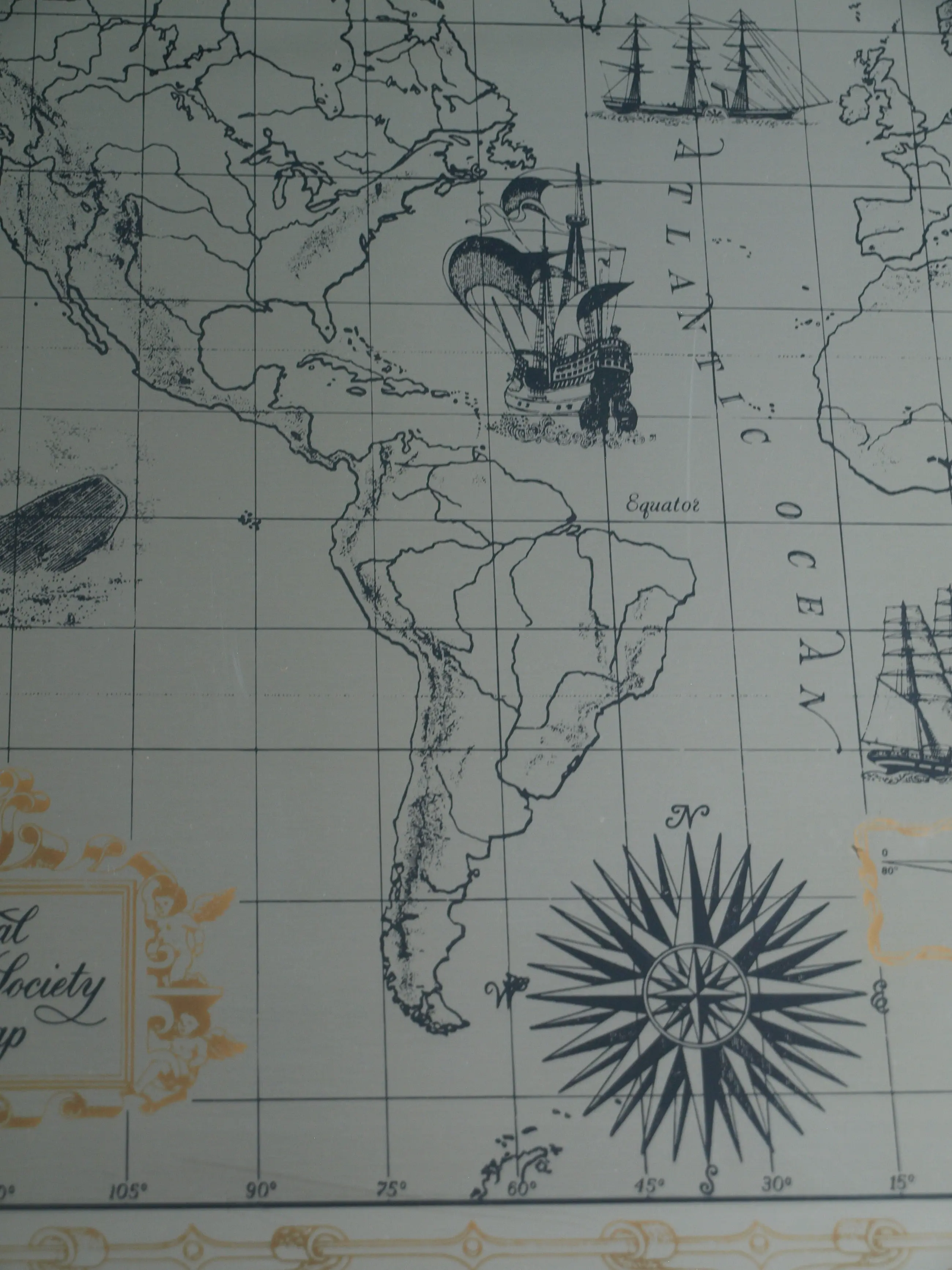 • Een "zilveren" kaart van de wereld, gegraveerd op een 18e-eeuwse manier.