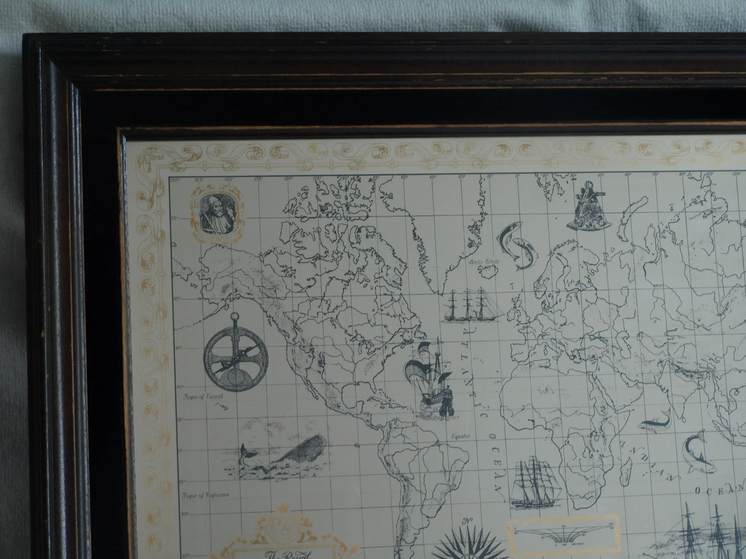 -Conditie: De ‘zilveren’ kaart is in goede staat. De houten lijst heeft slijtplekken en beschadigingen.