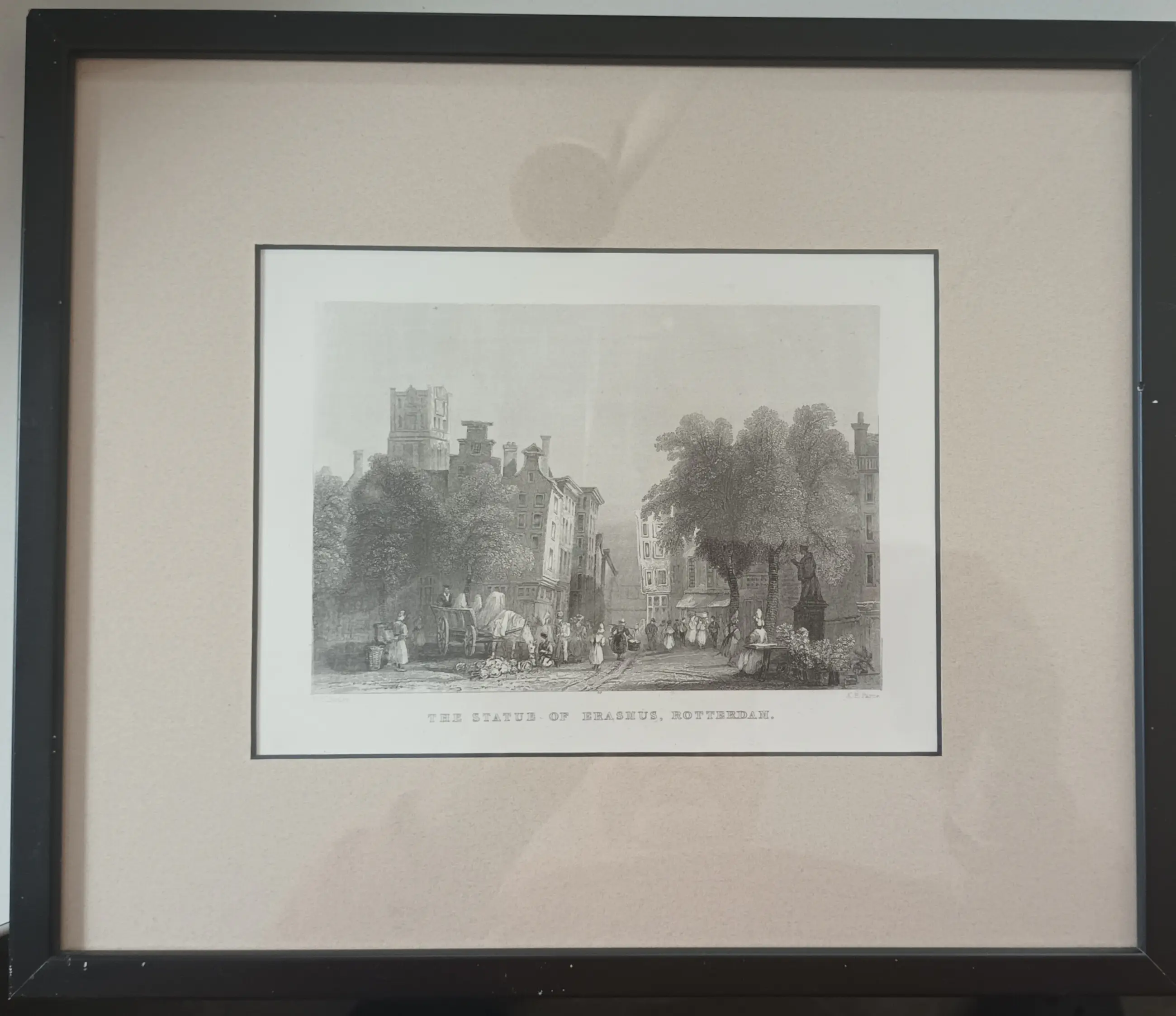 Rotterdam met op de achtergrond de St. Laurenskerk. Grijze passe-partout op zwart karton