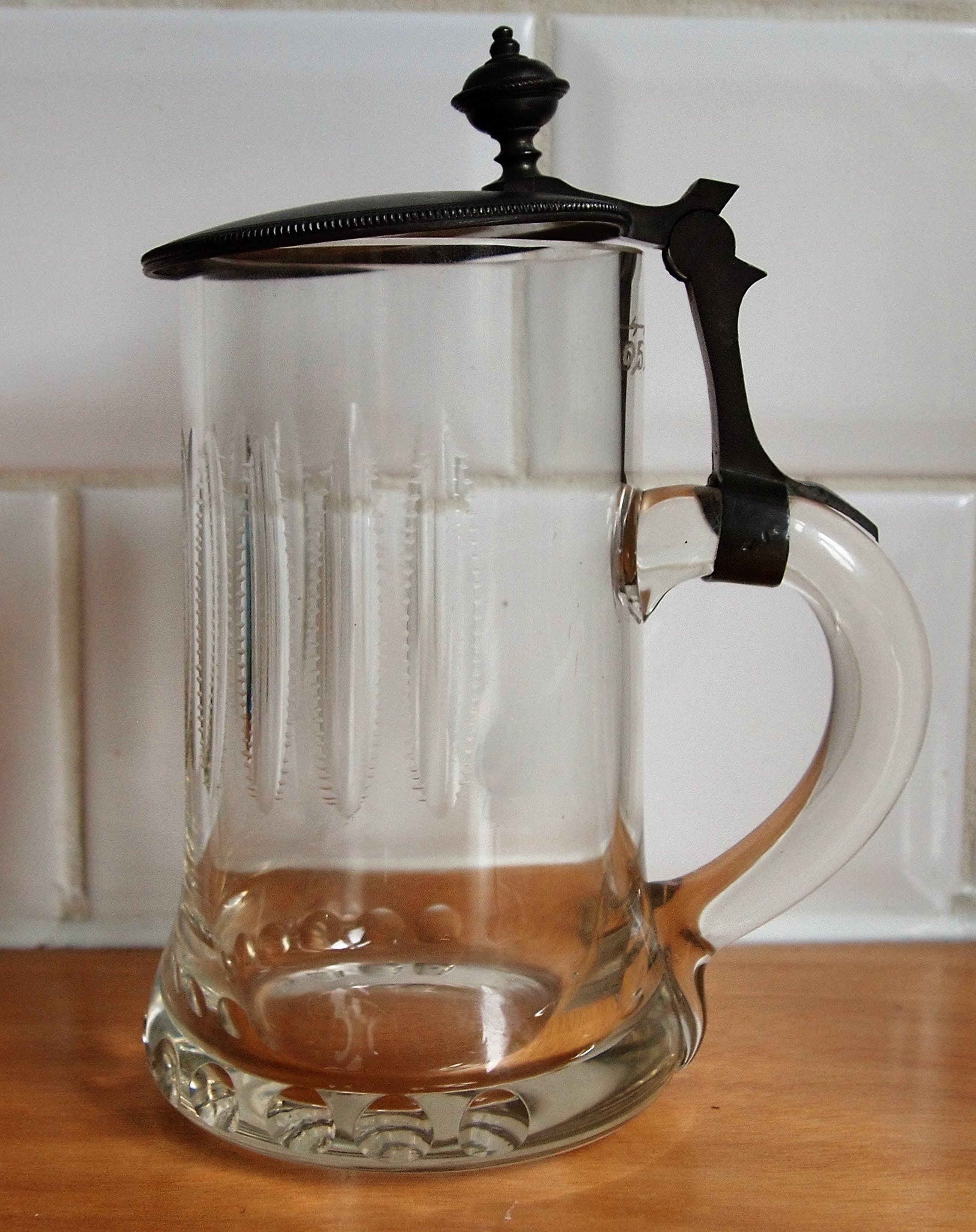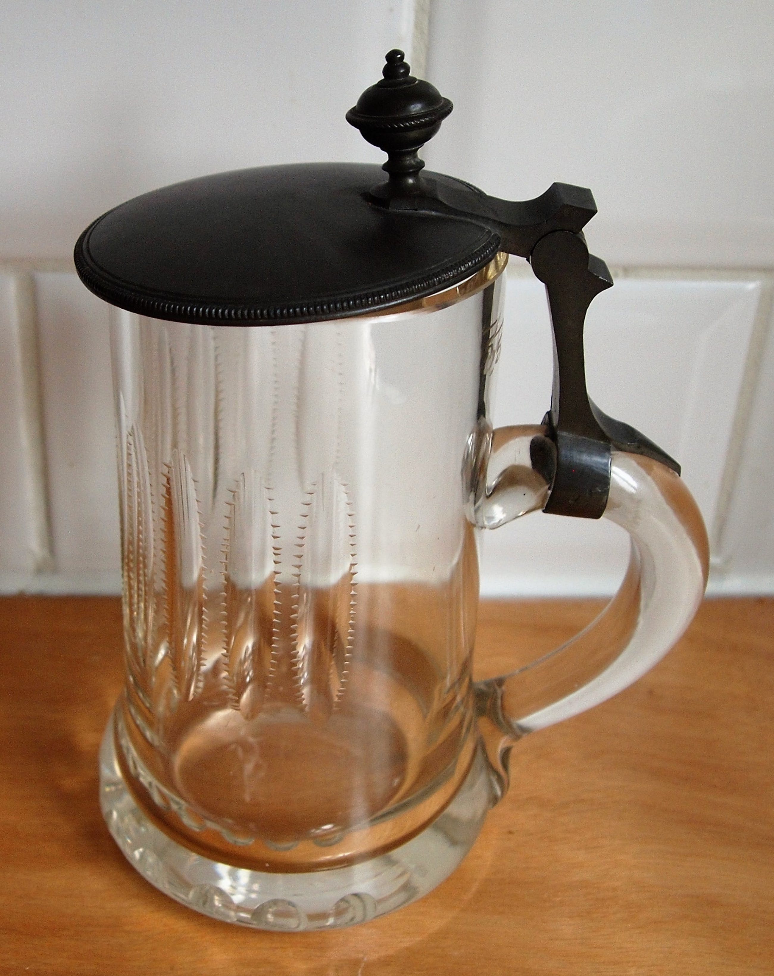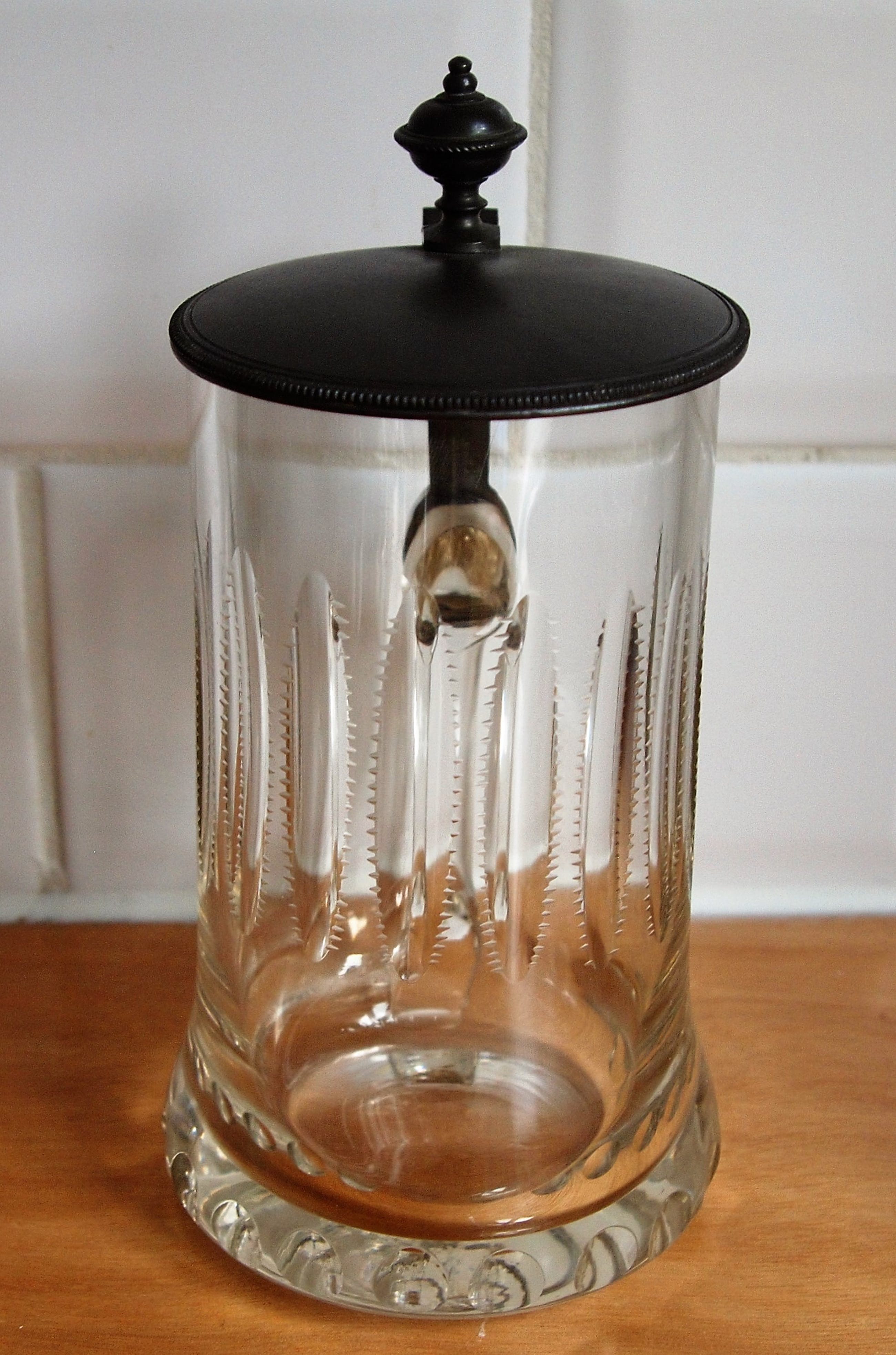 Art nouveau geslepen blank kristallen bierkruik van Theresienthal met origineel tinnen deksel van de firma F.Th.M. uit Muenchen. In. De deksel is aan de binnenzijde voorzien van een ingedrukt merk.Afmetingen; 15 cm hoog en een maximale diameter van 9 cm.