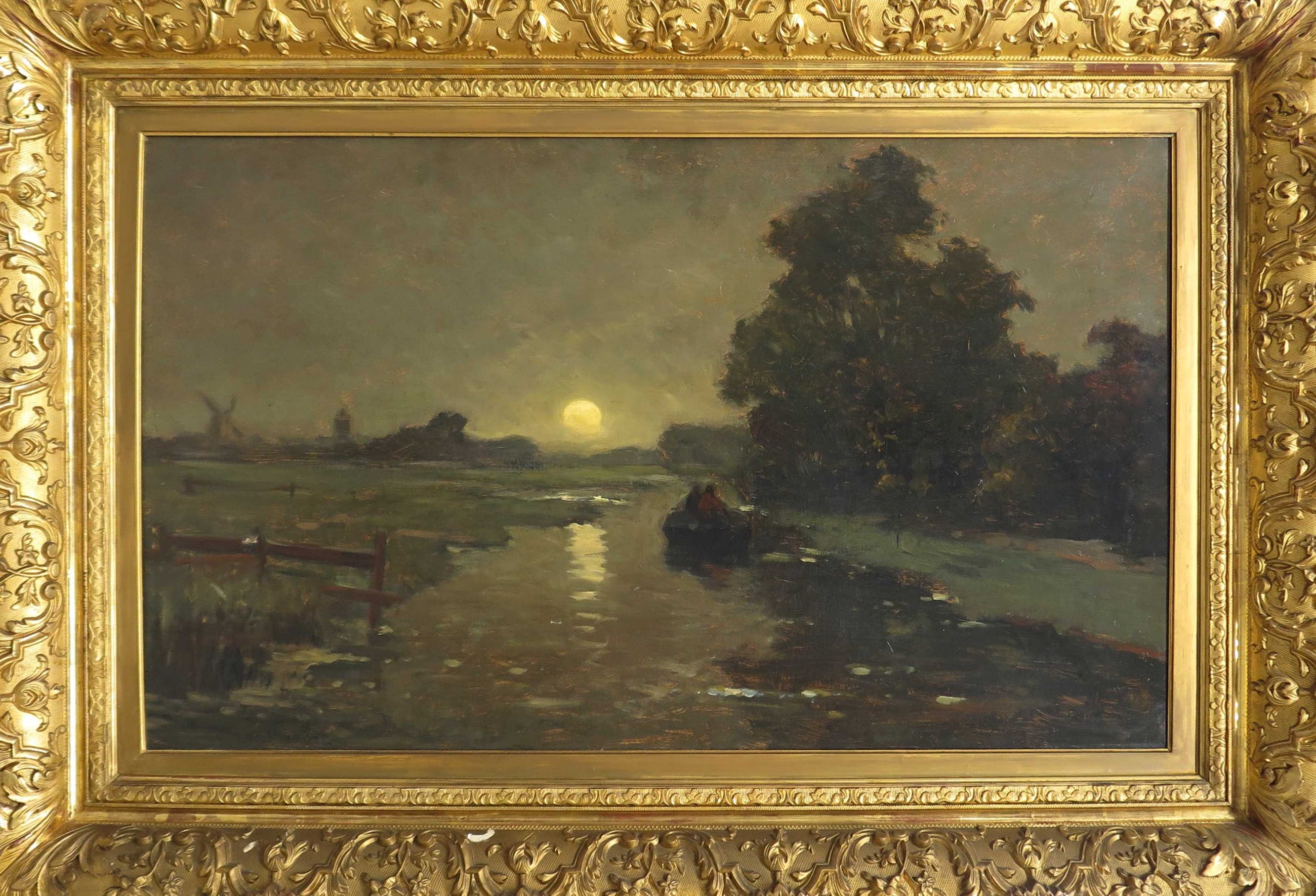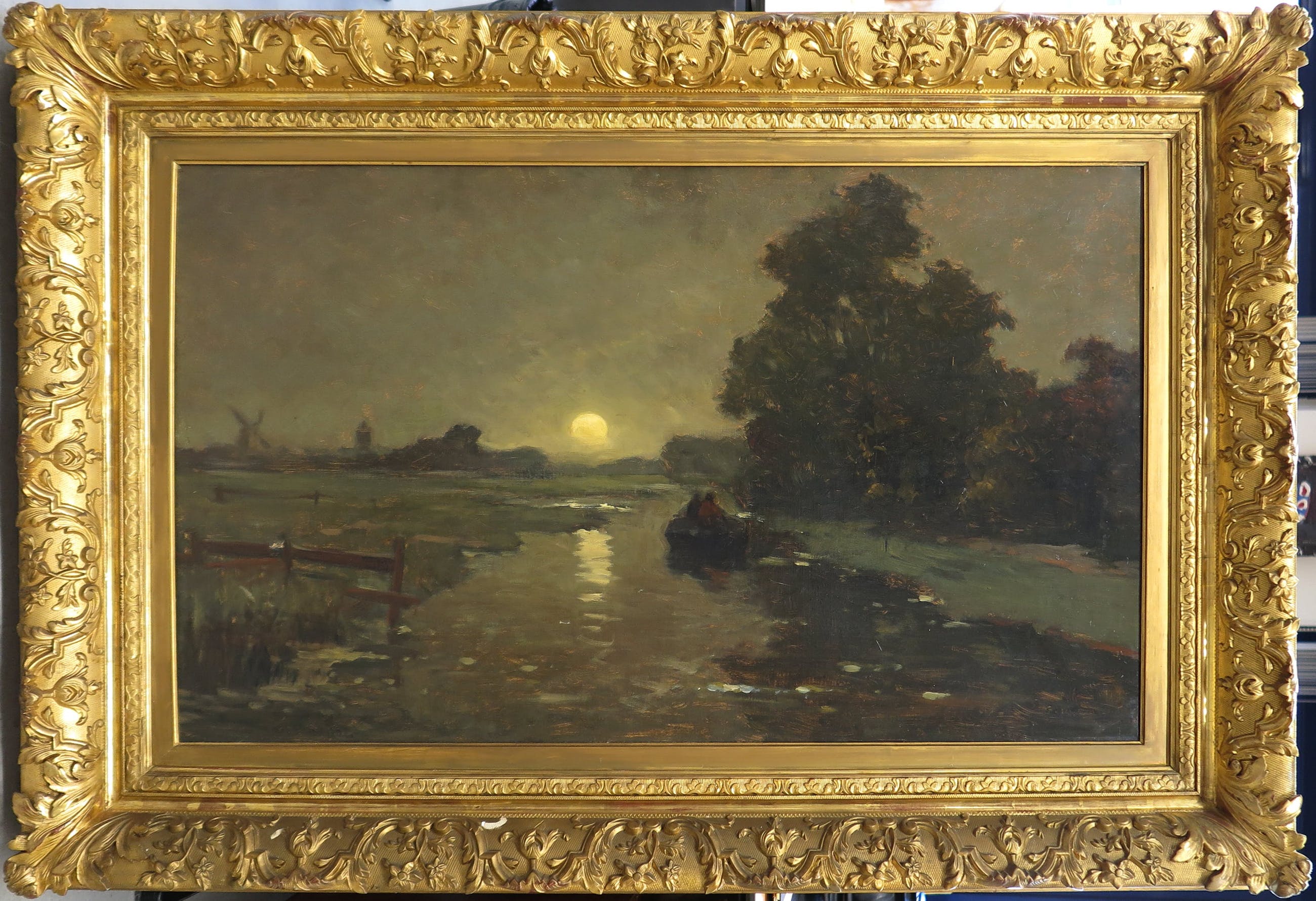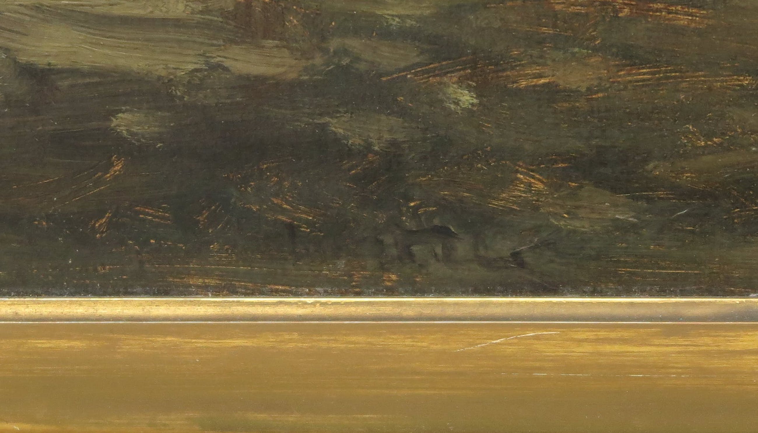 Groot schilderij in zeer zware lijst. Olieverf op canvas. Doordat de signatuur is vervaagd is ons helaas niet bekend wie de maker is. Maar het is van zeer goede kwaliteit.