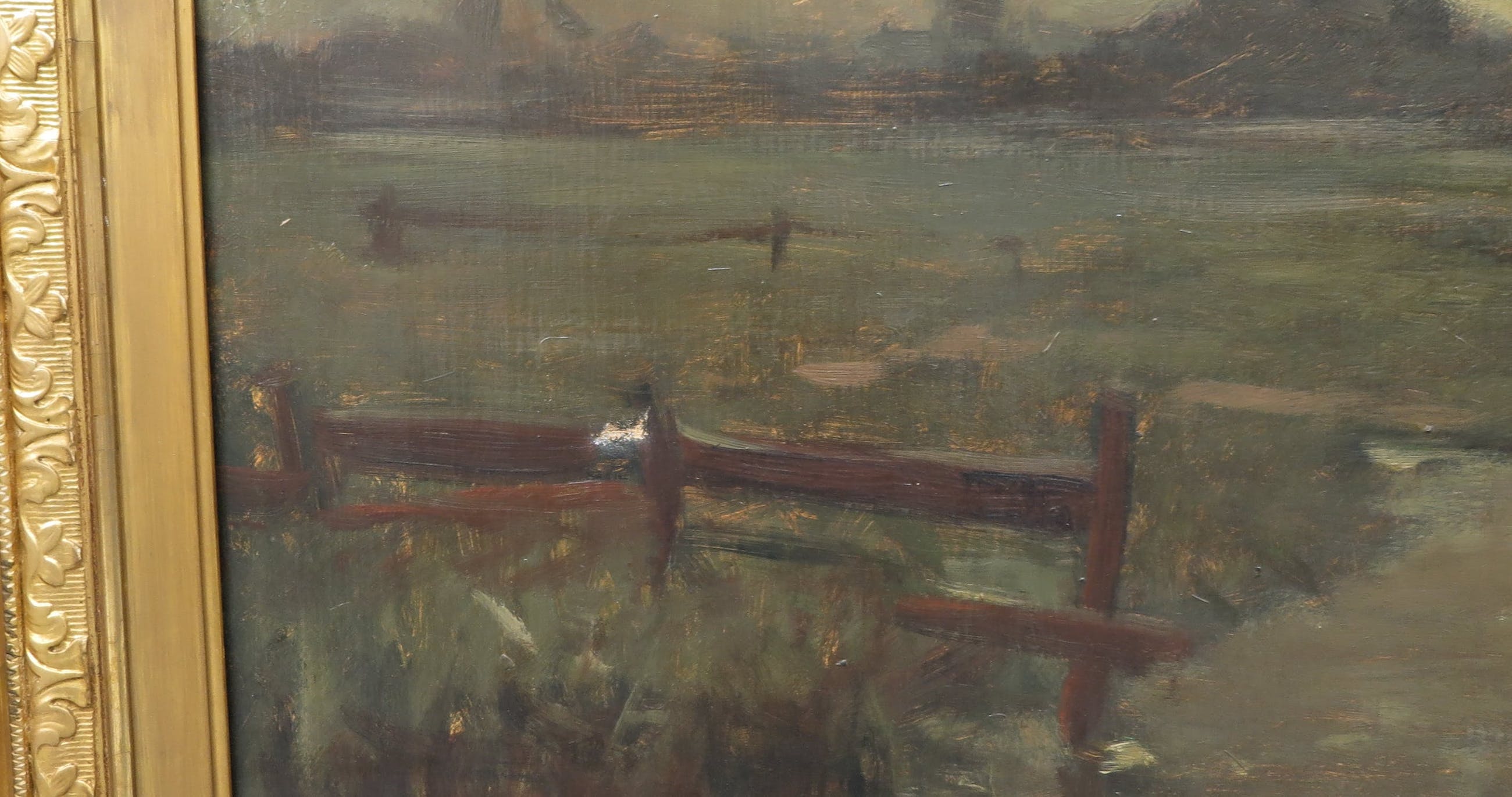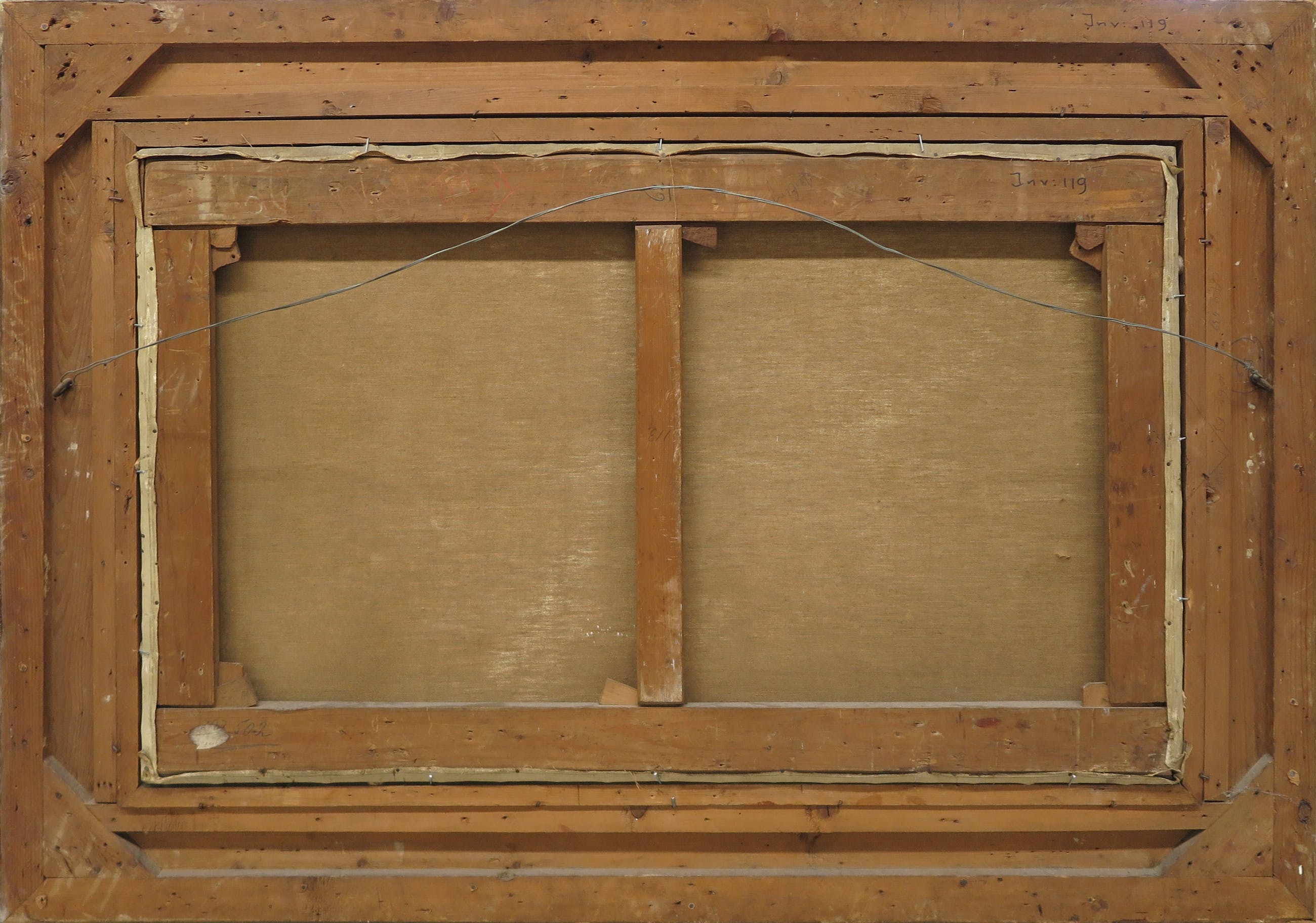 | In goede staat, doch helaas met een (recente) beschadiging linksonder in het beeld (t.h.g. van het hek): gaatje/scheurtje in het doek met verfverlies. Tevens in de lucht een kleine retouche. De lijst mist een paar kleine stukjes. | |