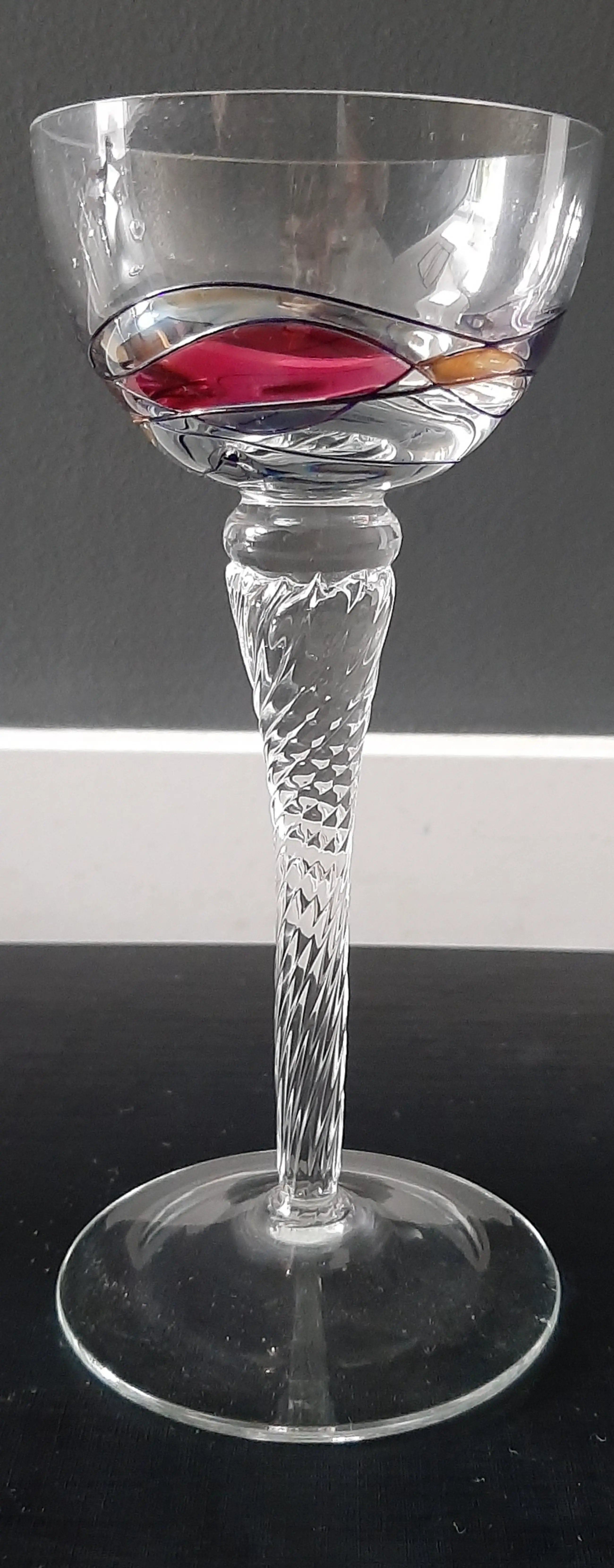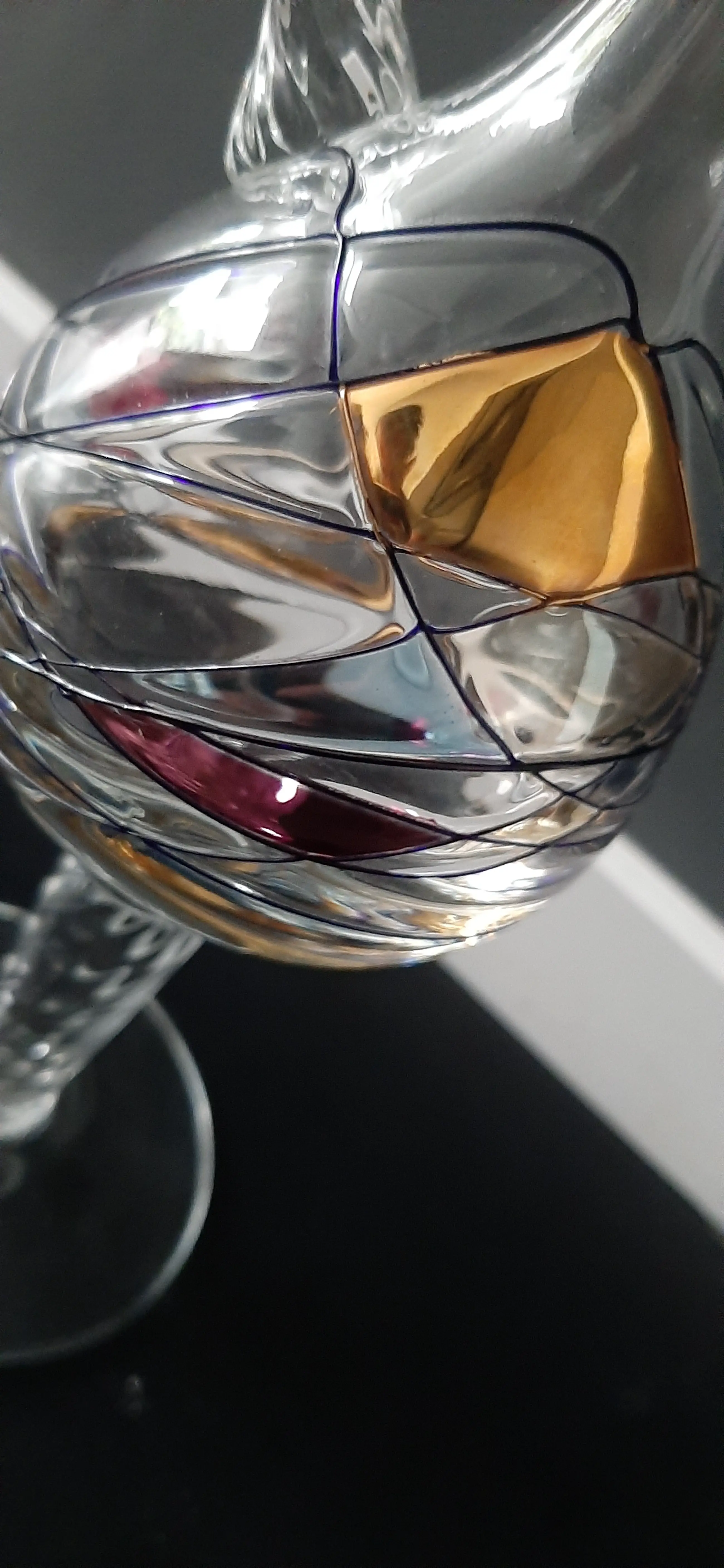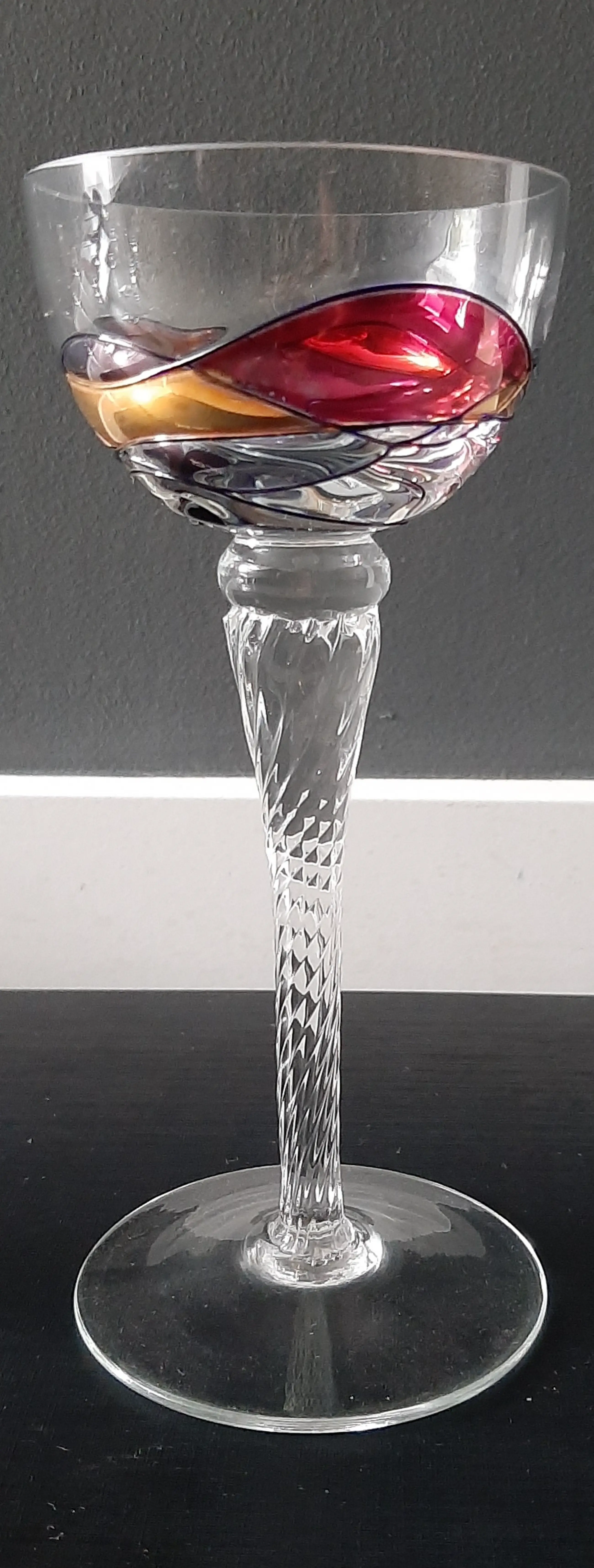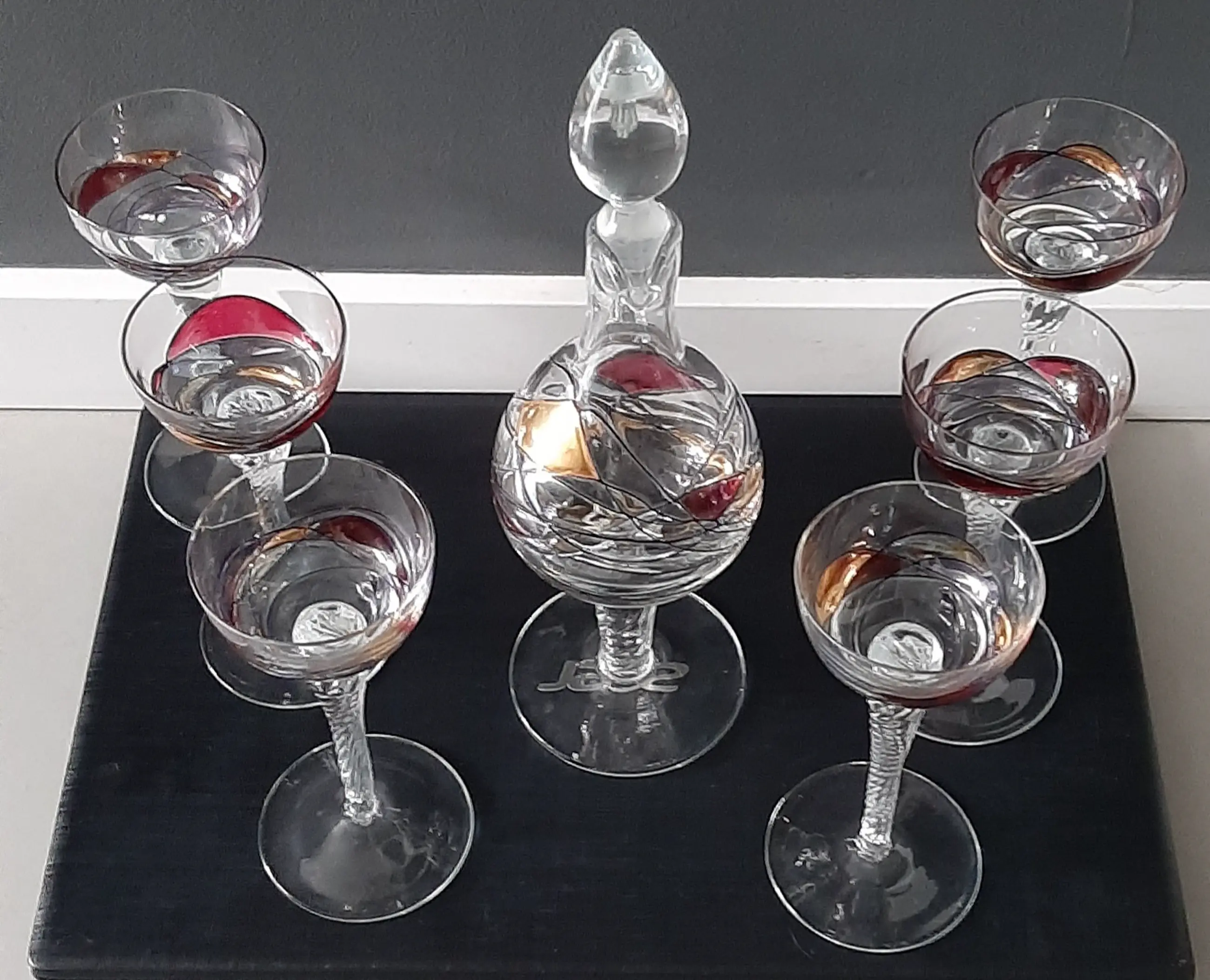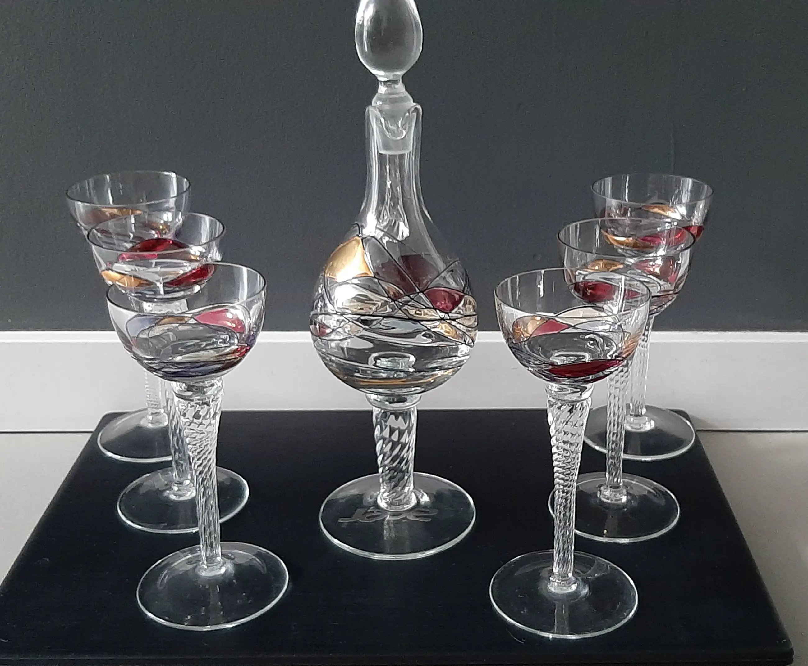 Set van 6 prachtige unieke Tiffany (1980) kristallen borrelglazen op hoge voet met een karaf. Van geen enkel glas is het reliëf identiek. De kleuren zijn allemaal hetzelfde maar anders verwerkt op het glas. Dit komt omdat de glazen met de hand gemaakt zijn. De kleuren zijn met de hand gedecoreerd.