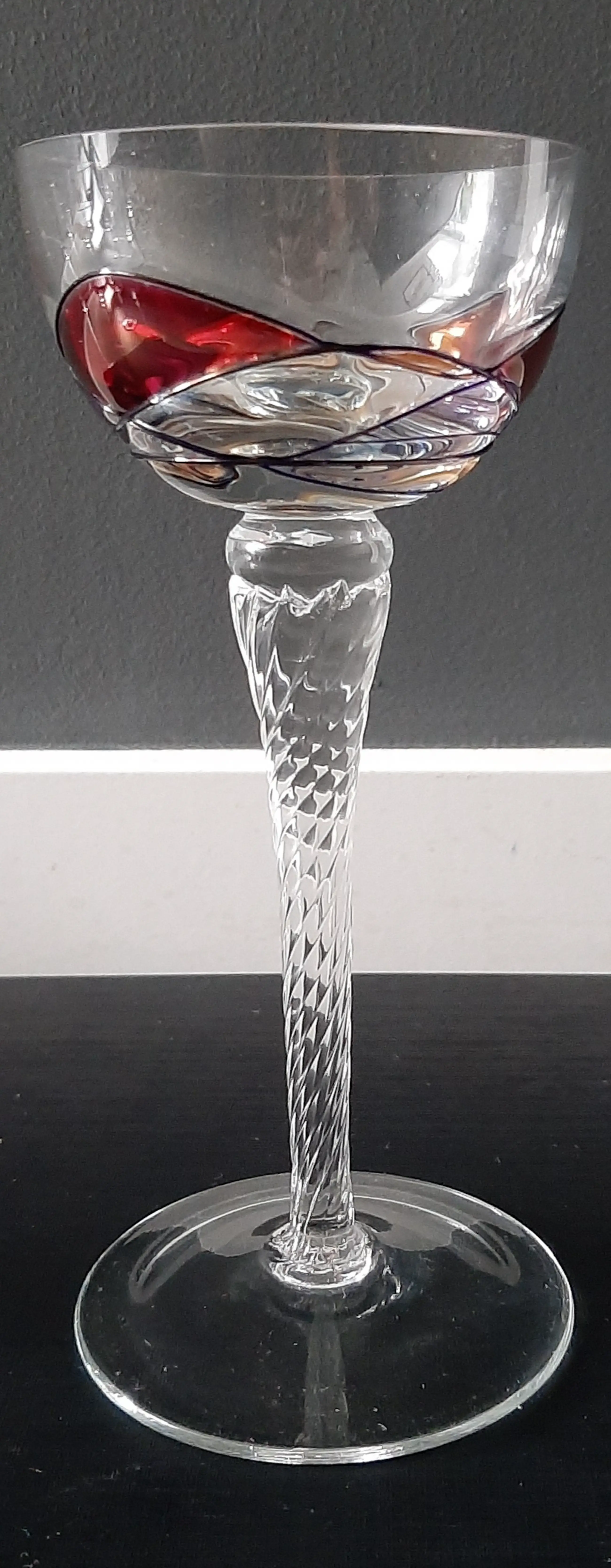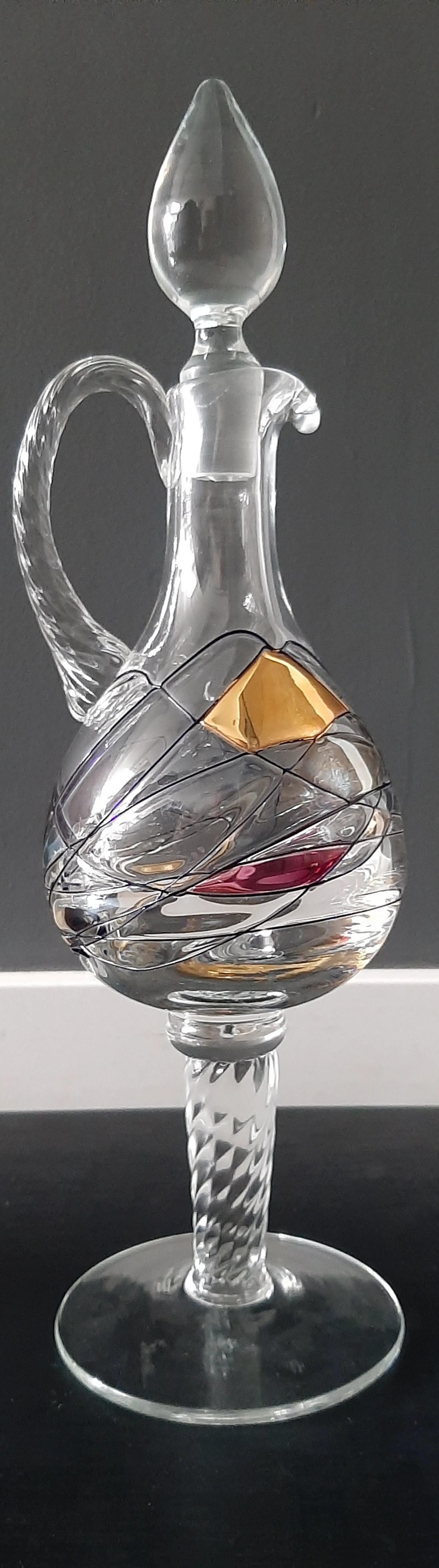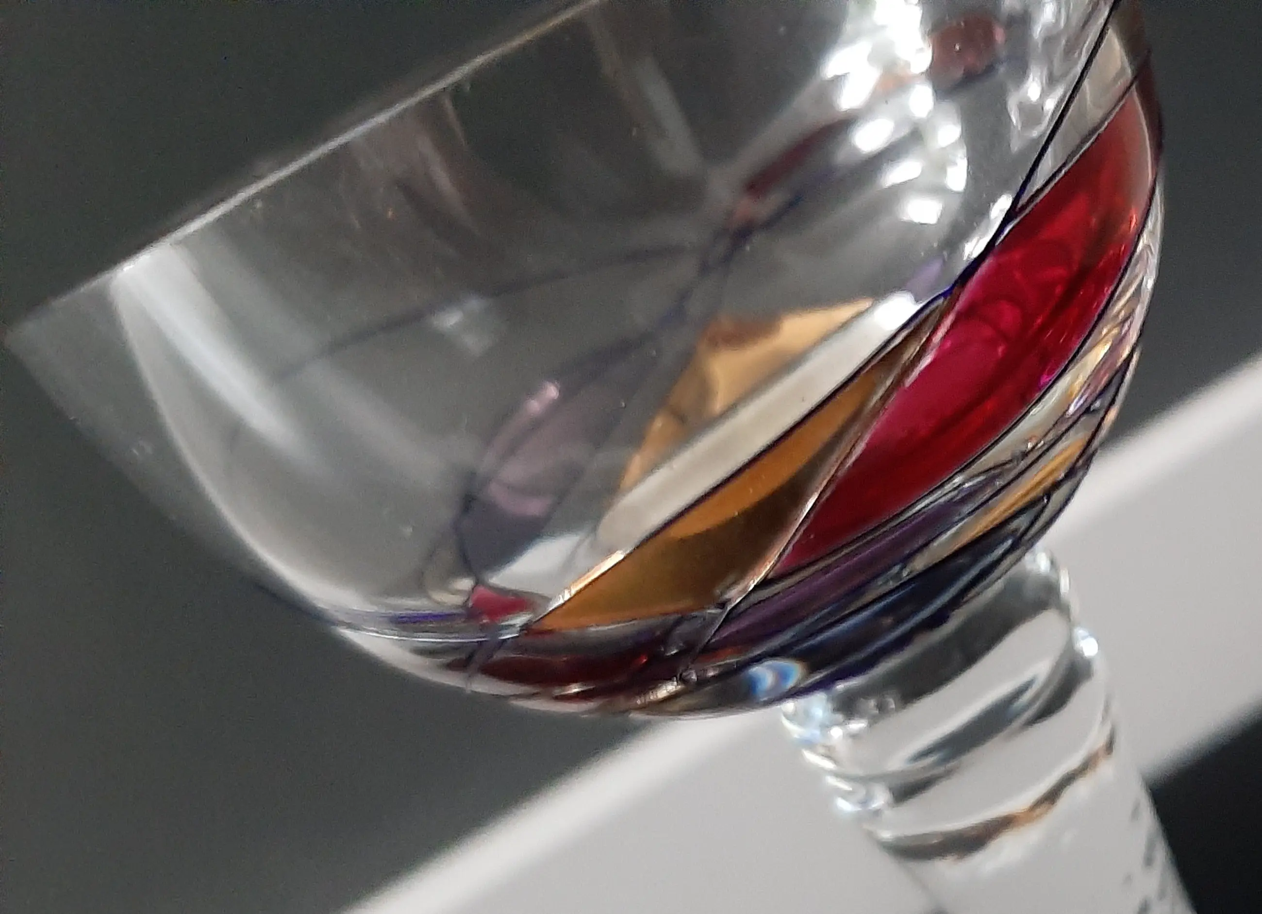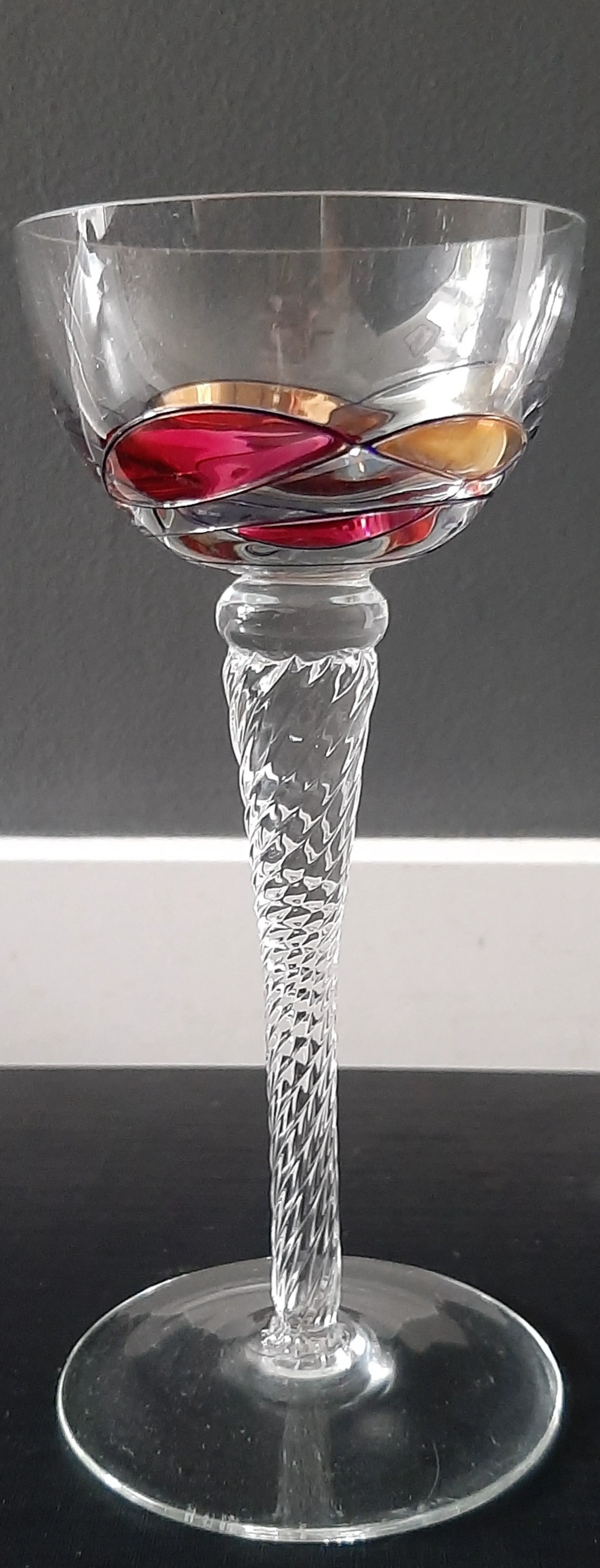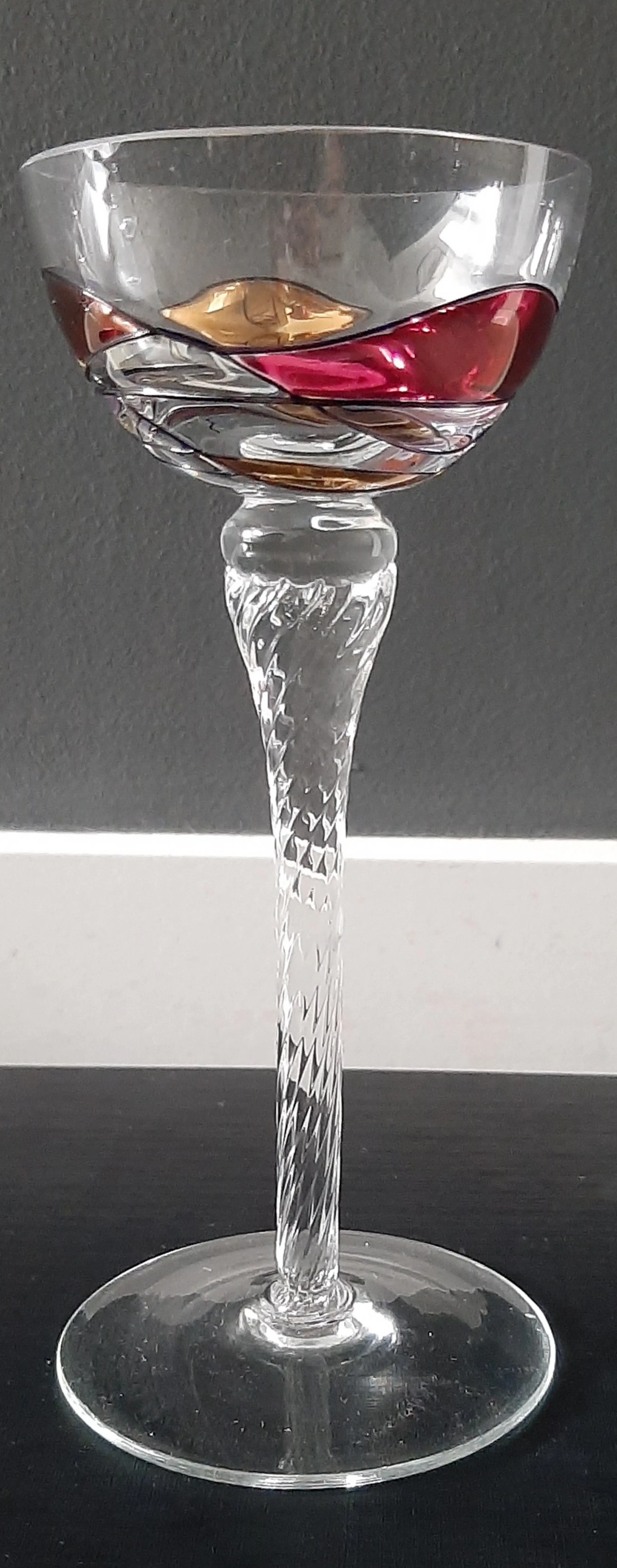 Set van 6 prachtige unieke Tiffany (1980) kristallen borrelglazen op hoge voet met een karaf. Van geen enkel glas is het reliëf identiek. De kleuren zijn allemaal hetzelfde maar anders verwerkt op het glas. Dit komt omdat de glazen met de hand gemaakt zijn. De kleuren zijn met de hand gedecoreerd.