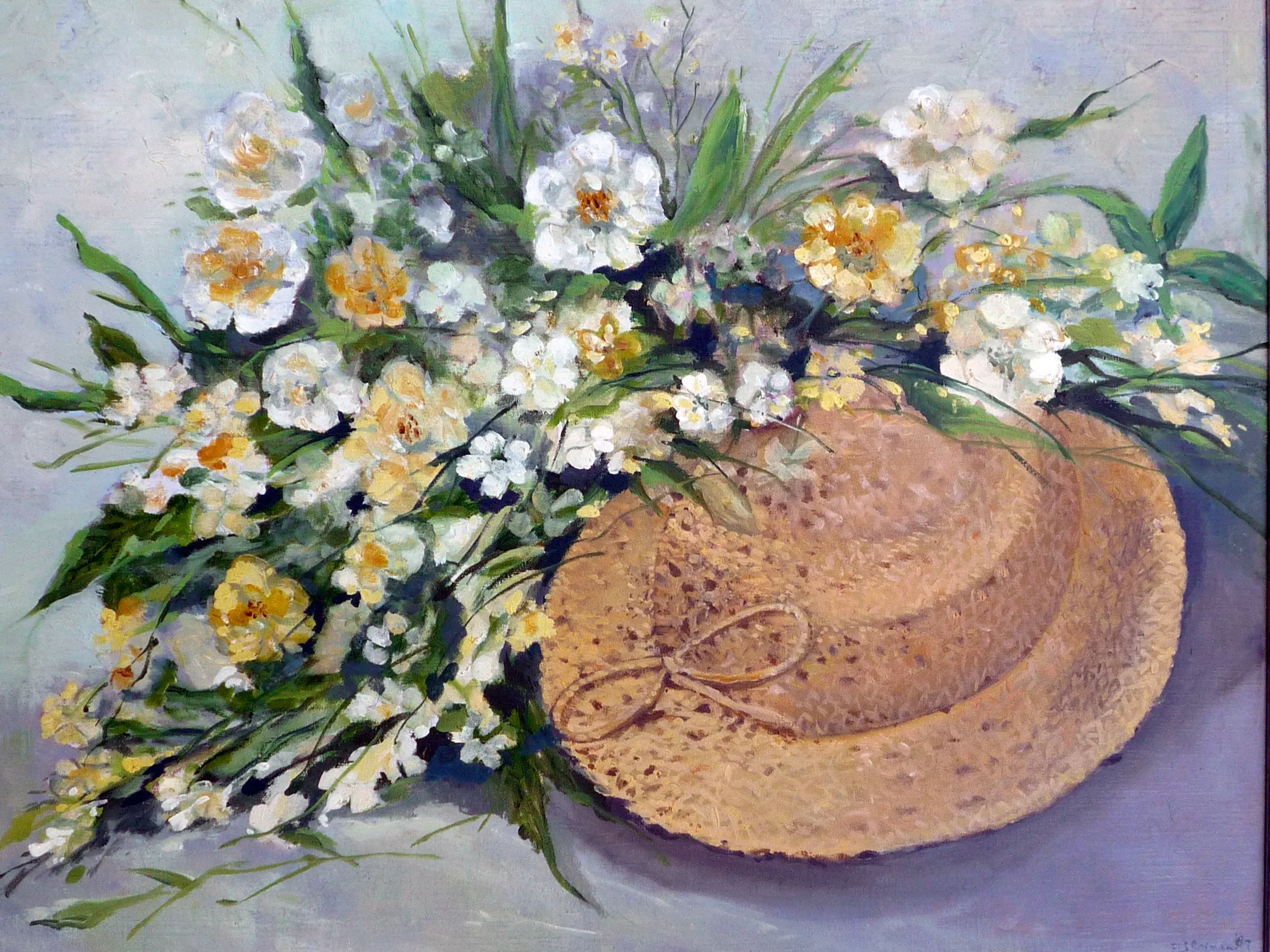 Gezellig voorjaarsstilleven met bloemen en strooien hoed