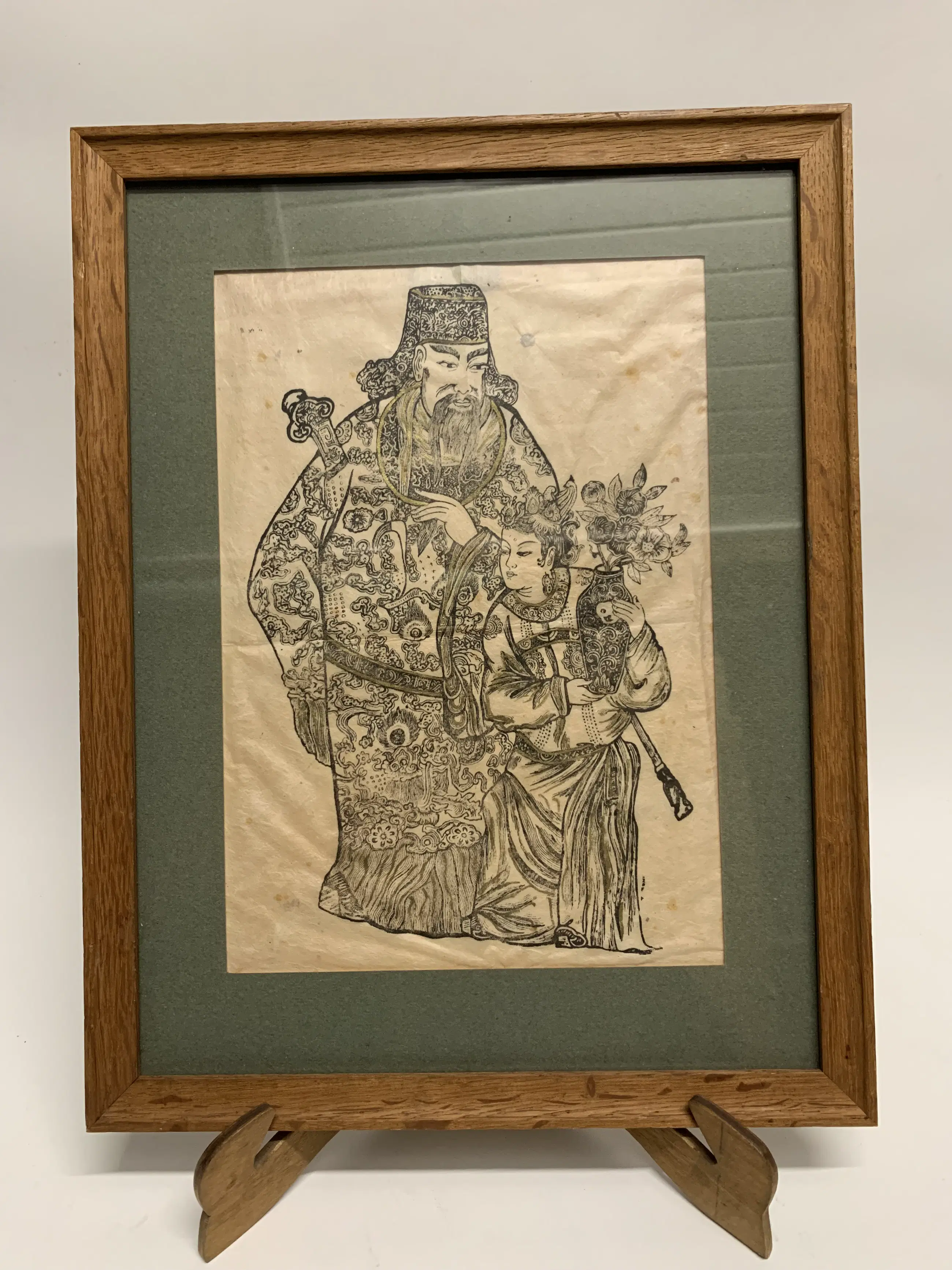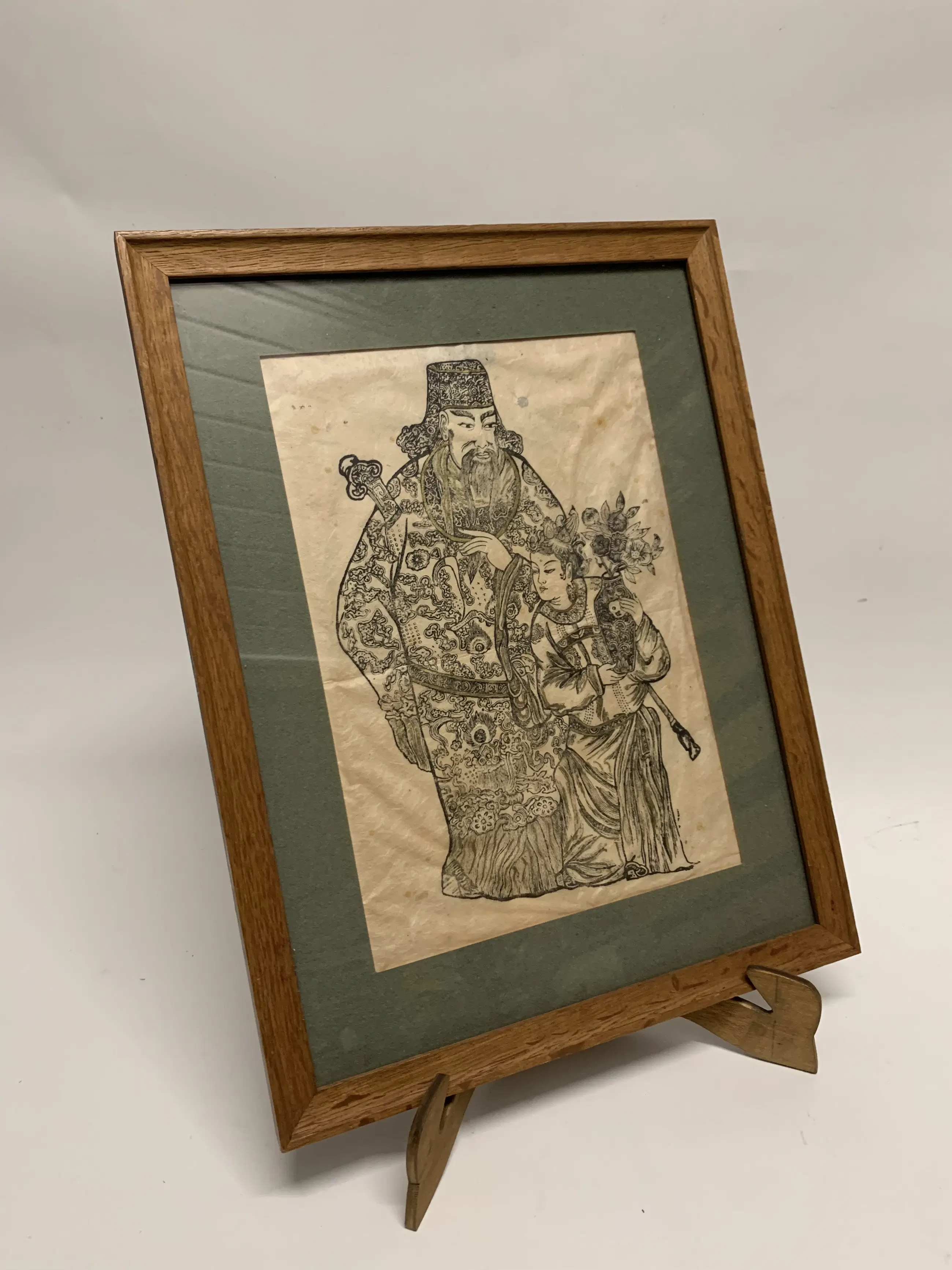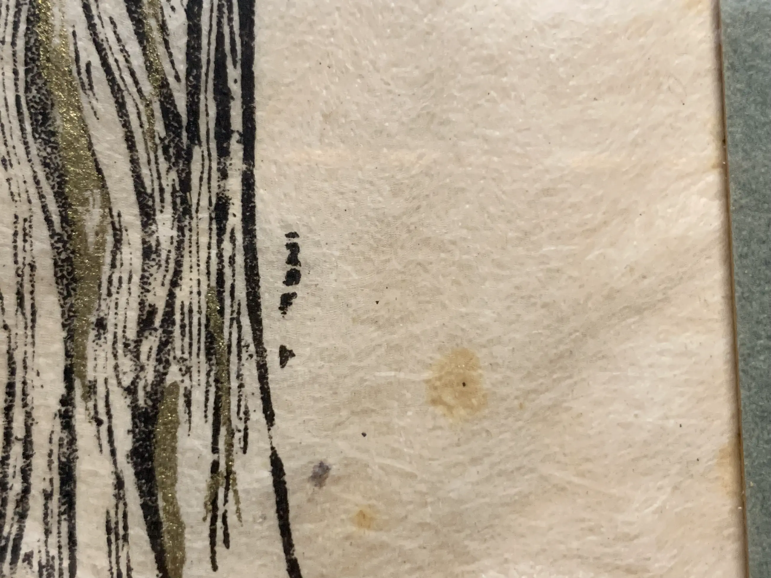 Japanse houtblokprint, handgeschilderd op rijstpapier, ondertekend met 'T.Muni' en ingelijst met blauwe tinten en goudverf. Een prachtige foto die de Japanse cultuur weergeeft.