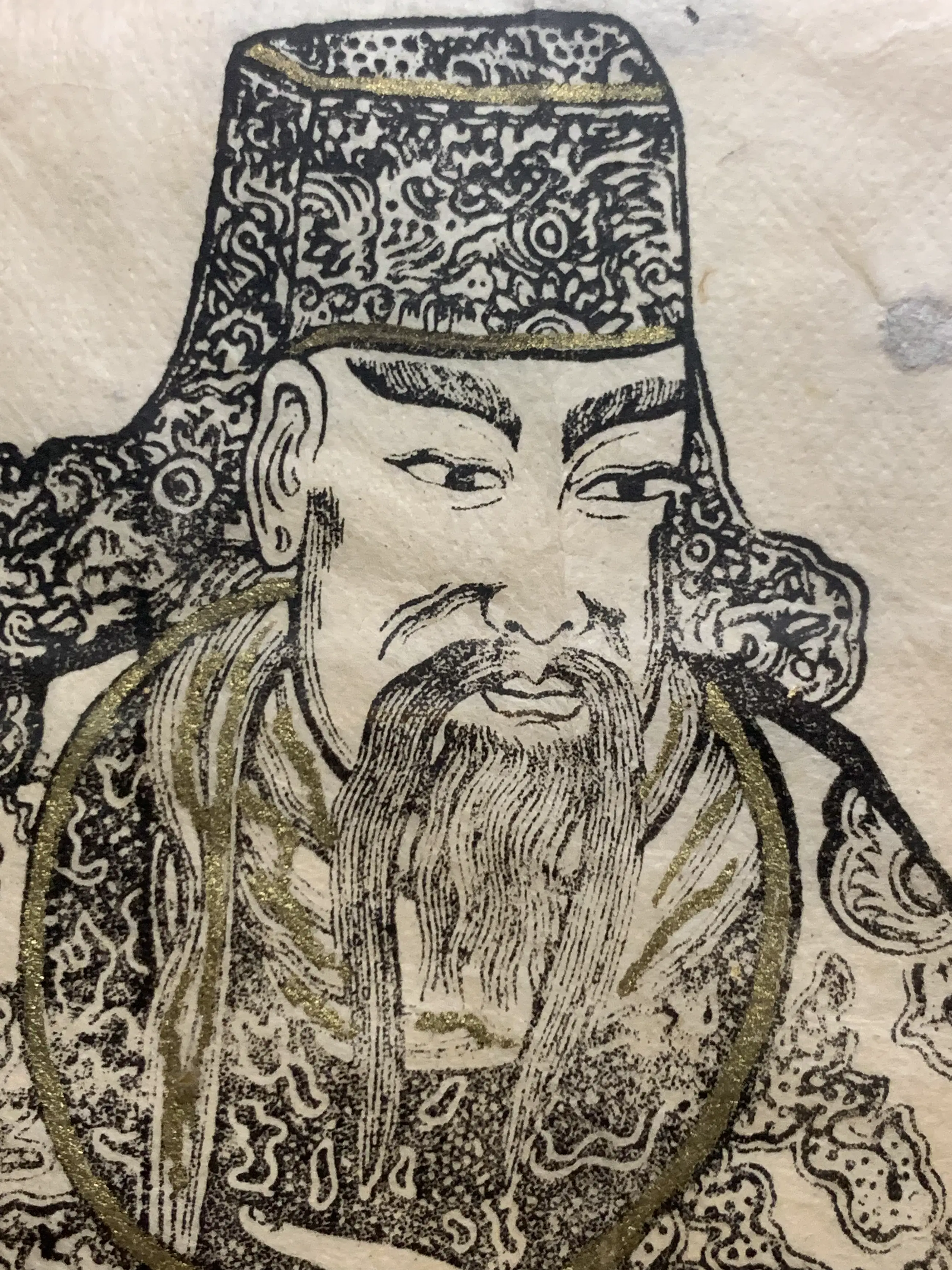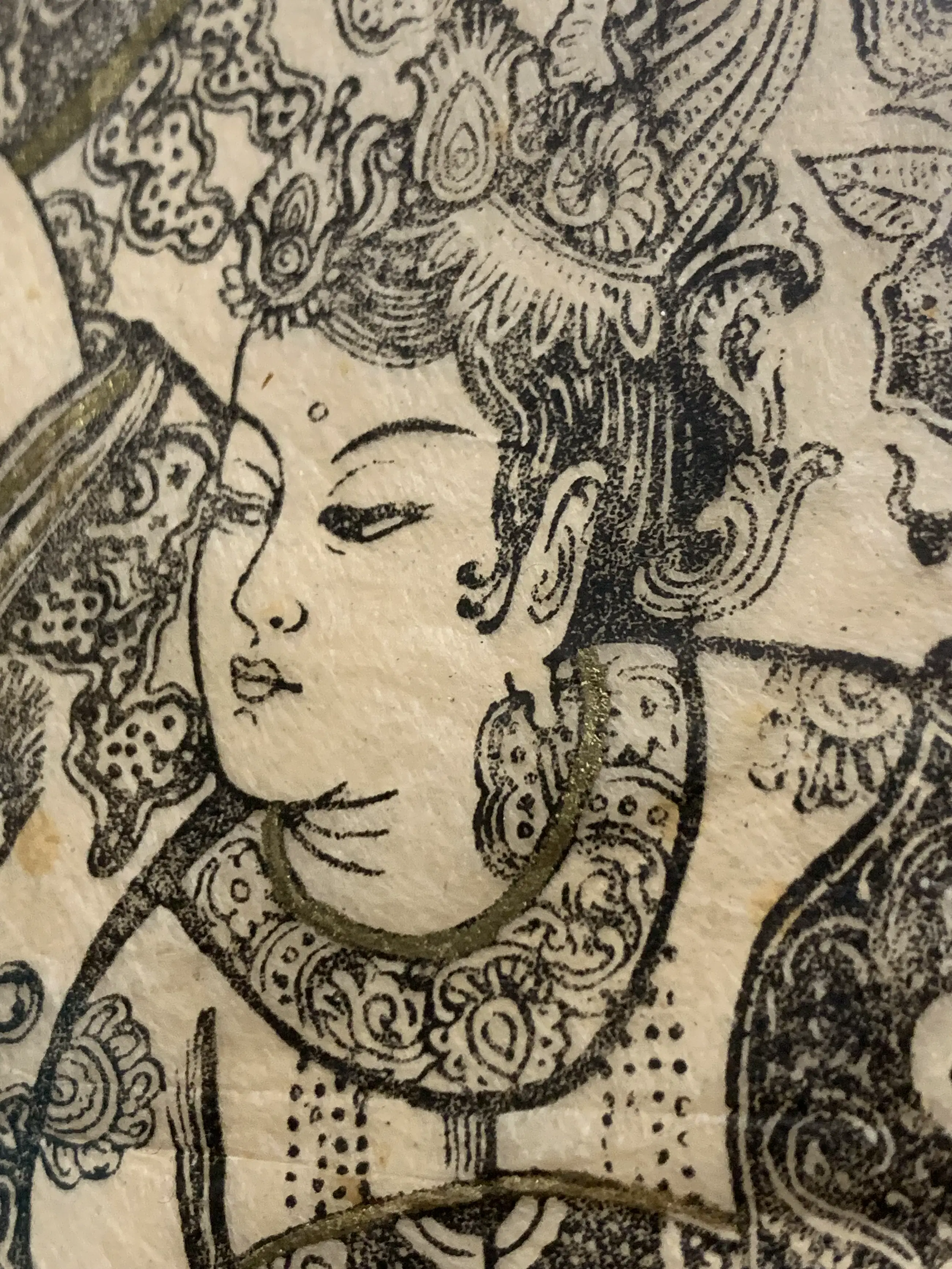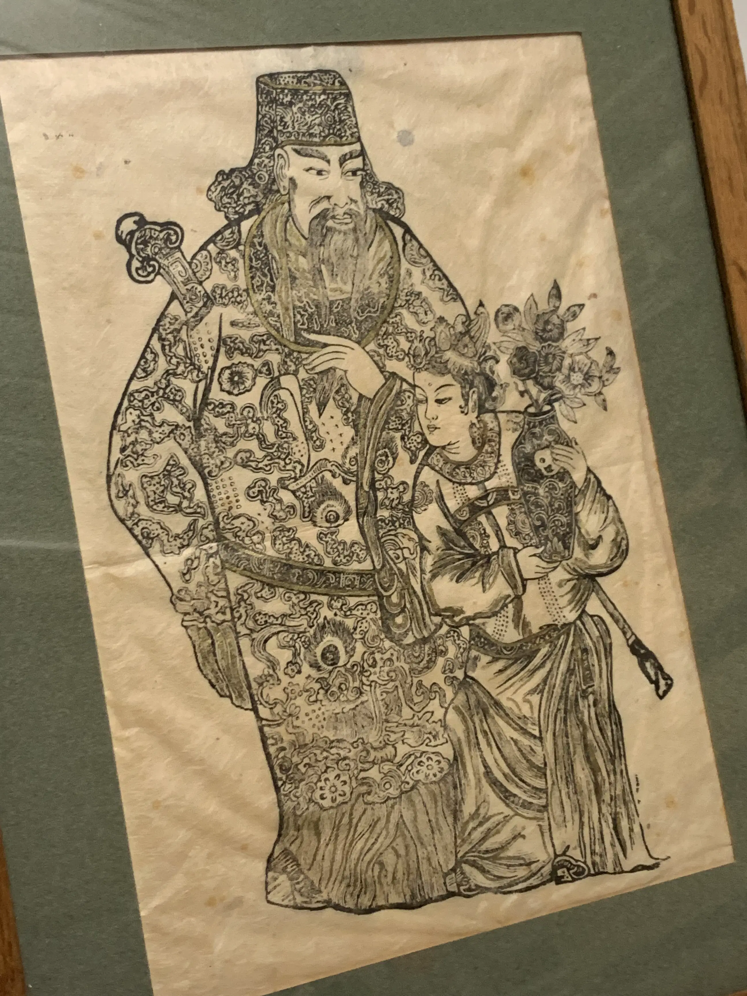 Japanse houtblokprint, handgeschilderd op rijstpapier, ondertekend met 'T.Muni' en ingelijst met blauwe tinten en goudverf. Een prachtige foto die de Japanse cultuur weergeeft.