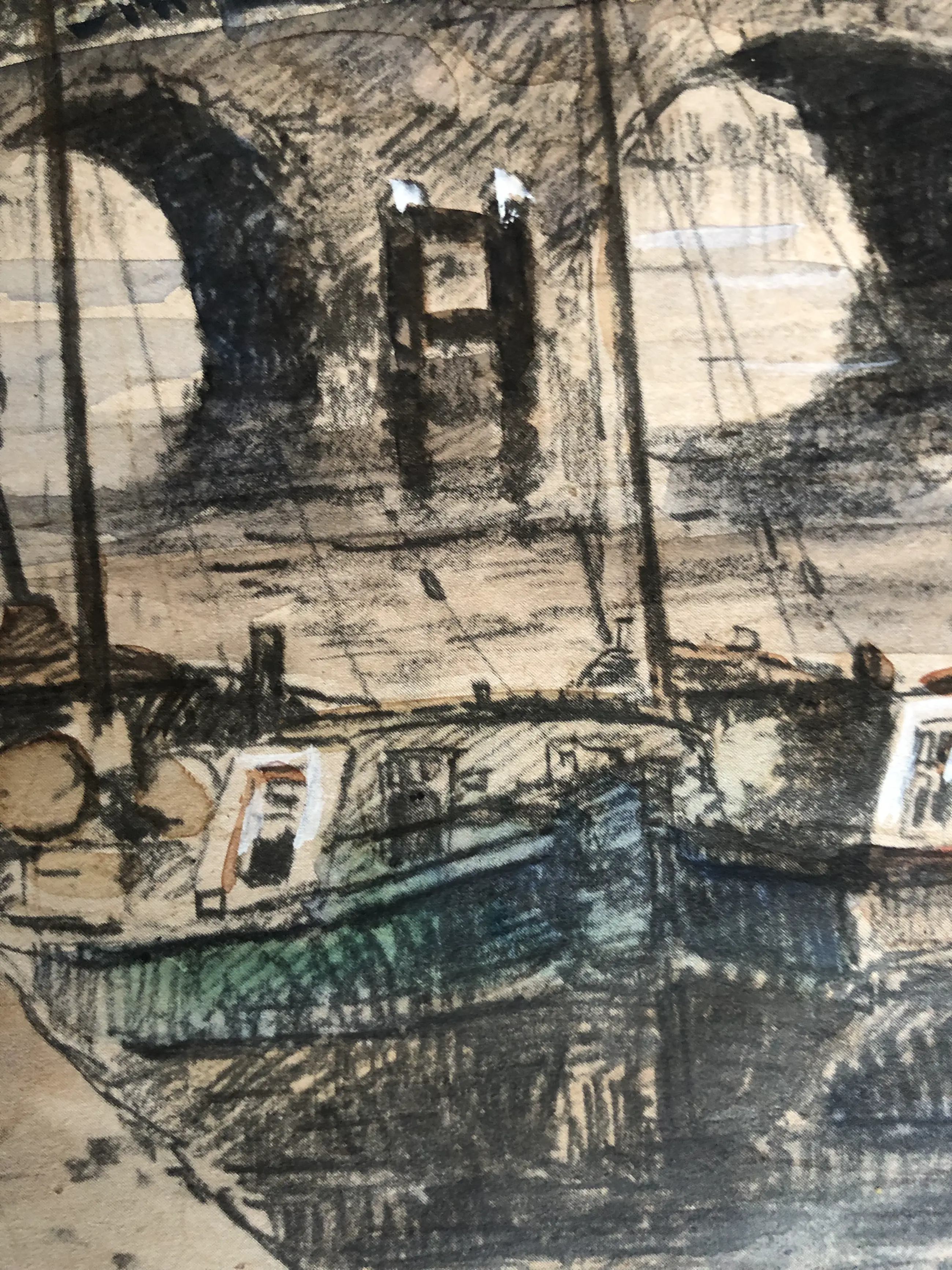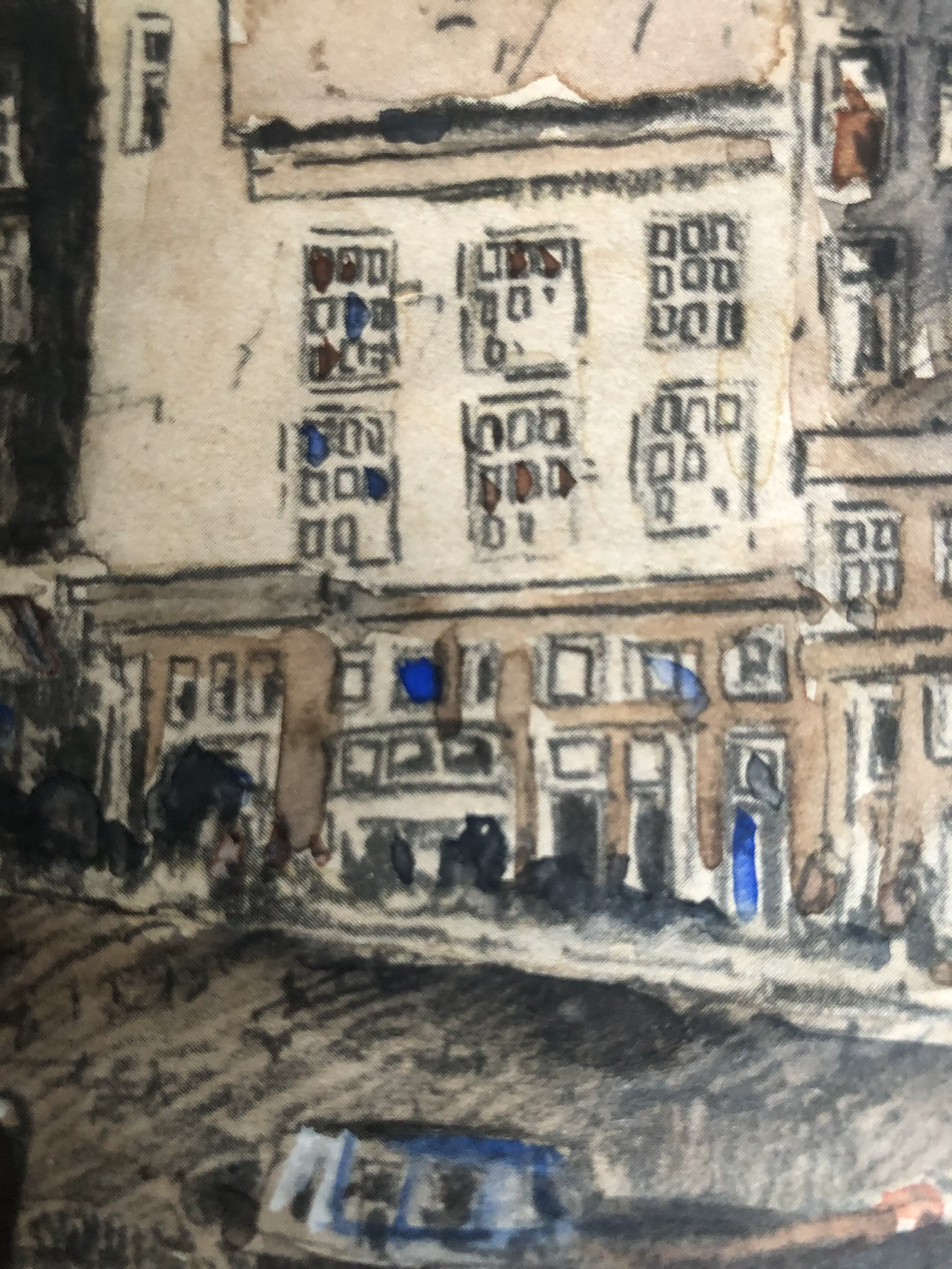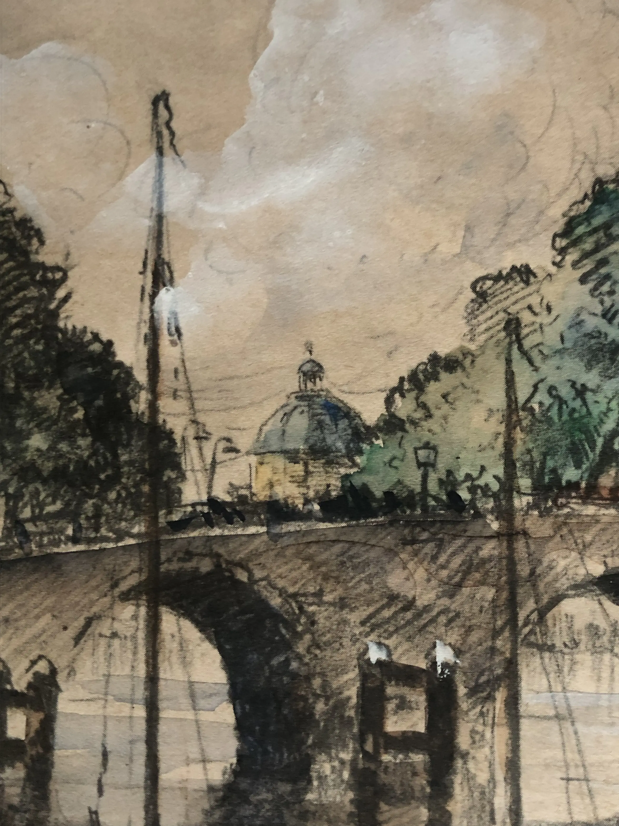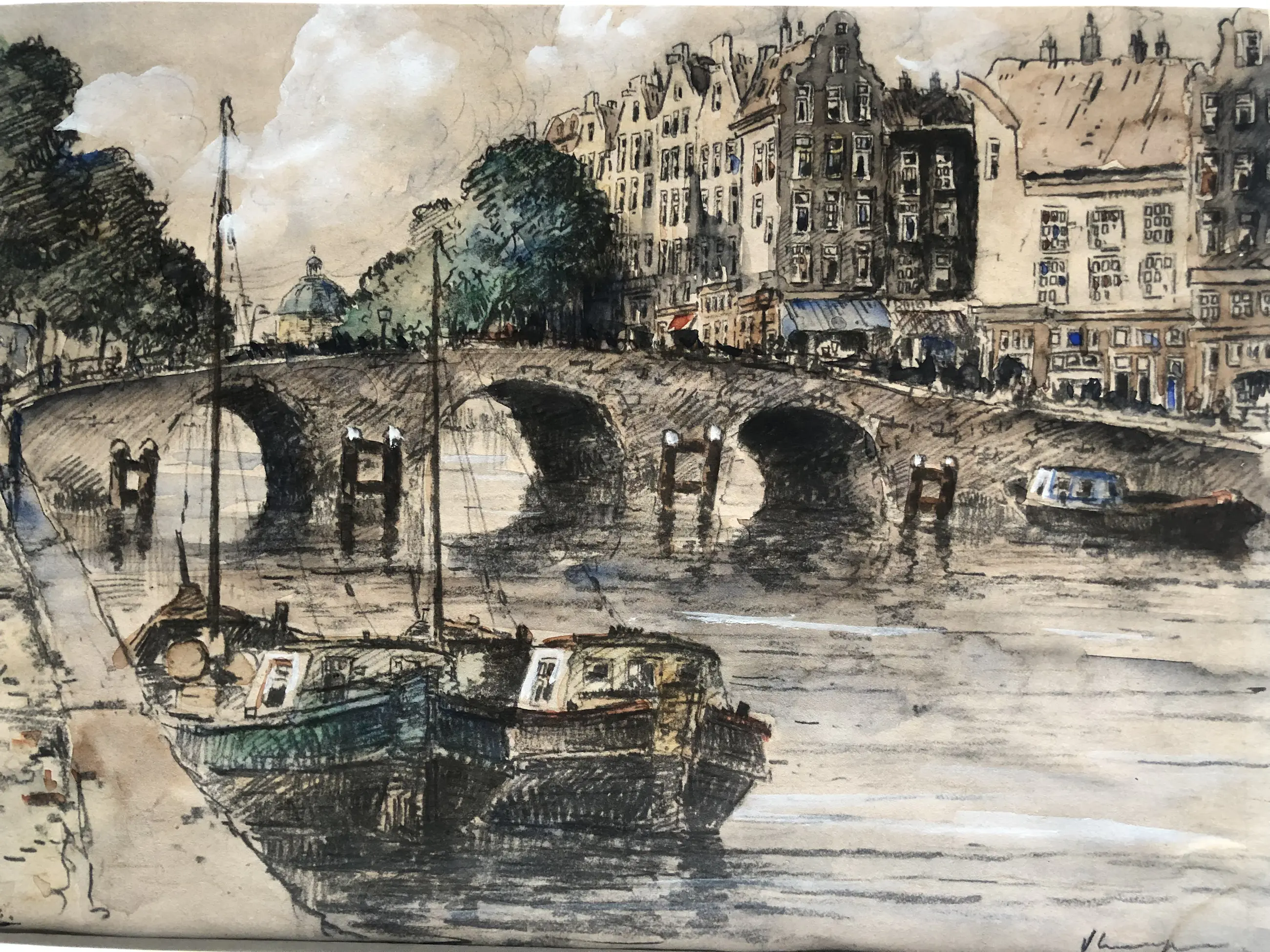 Prachtig gedetailleerde tekening/aquarel van de Torensluis en het Singel in Amsterdam met in de verte de koepel van de Ronde Lutherse Kerk.