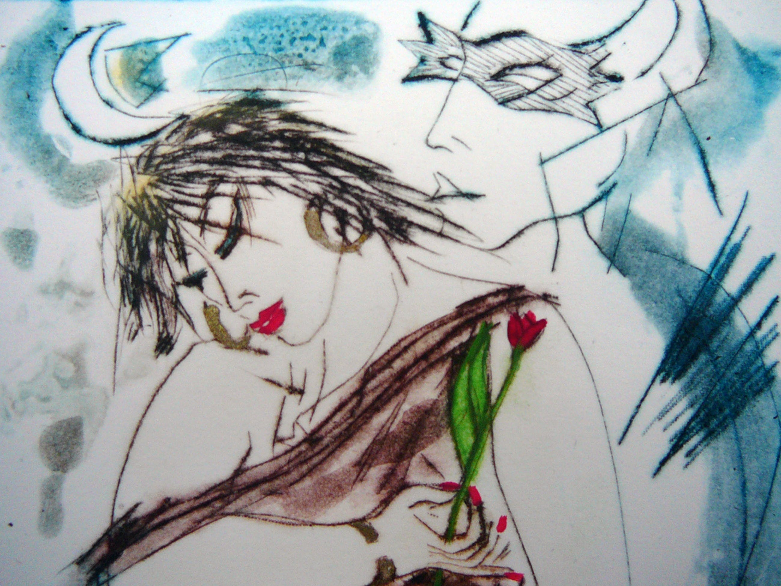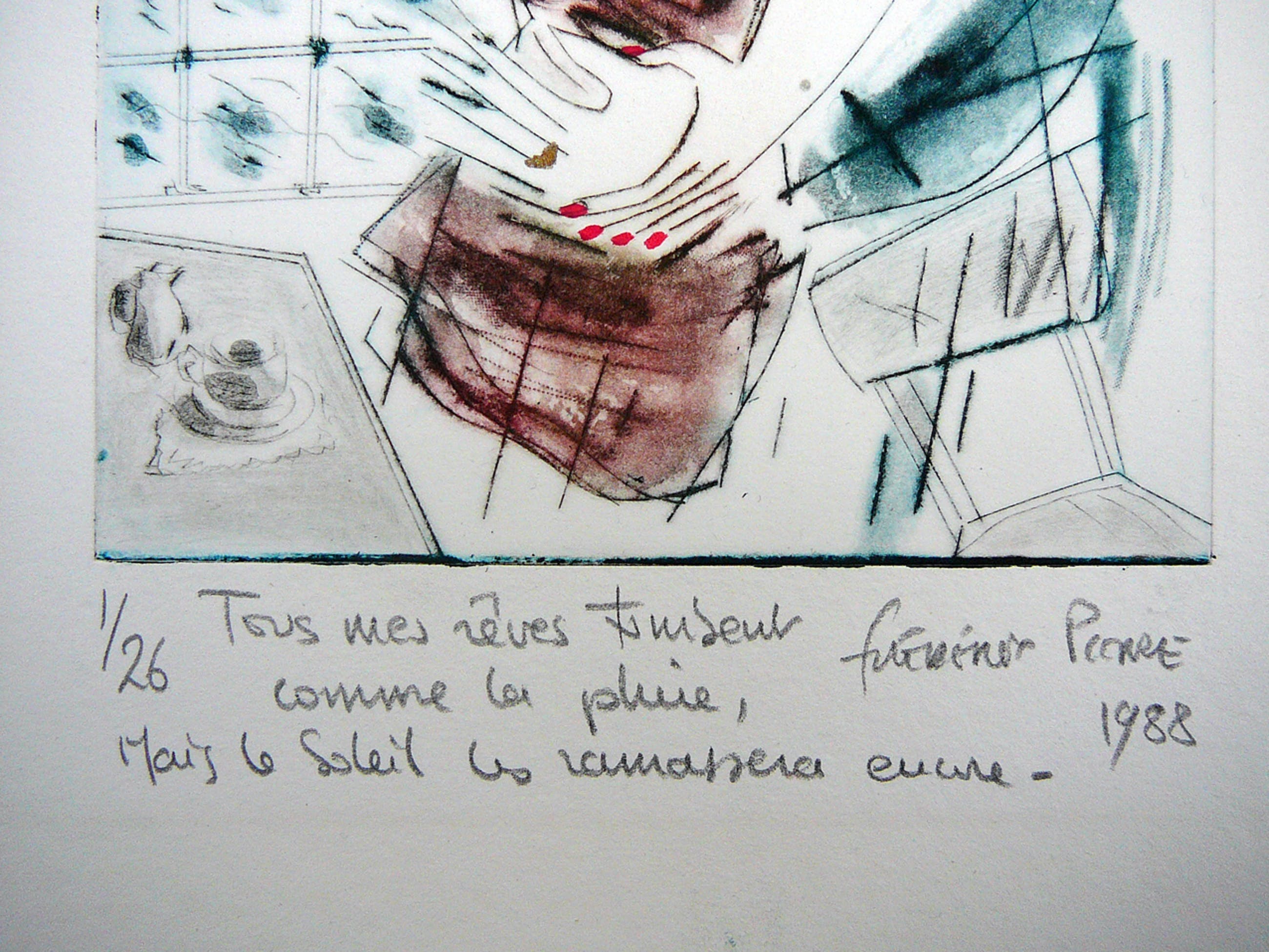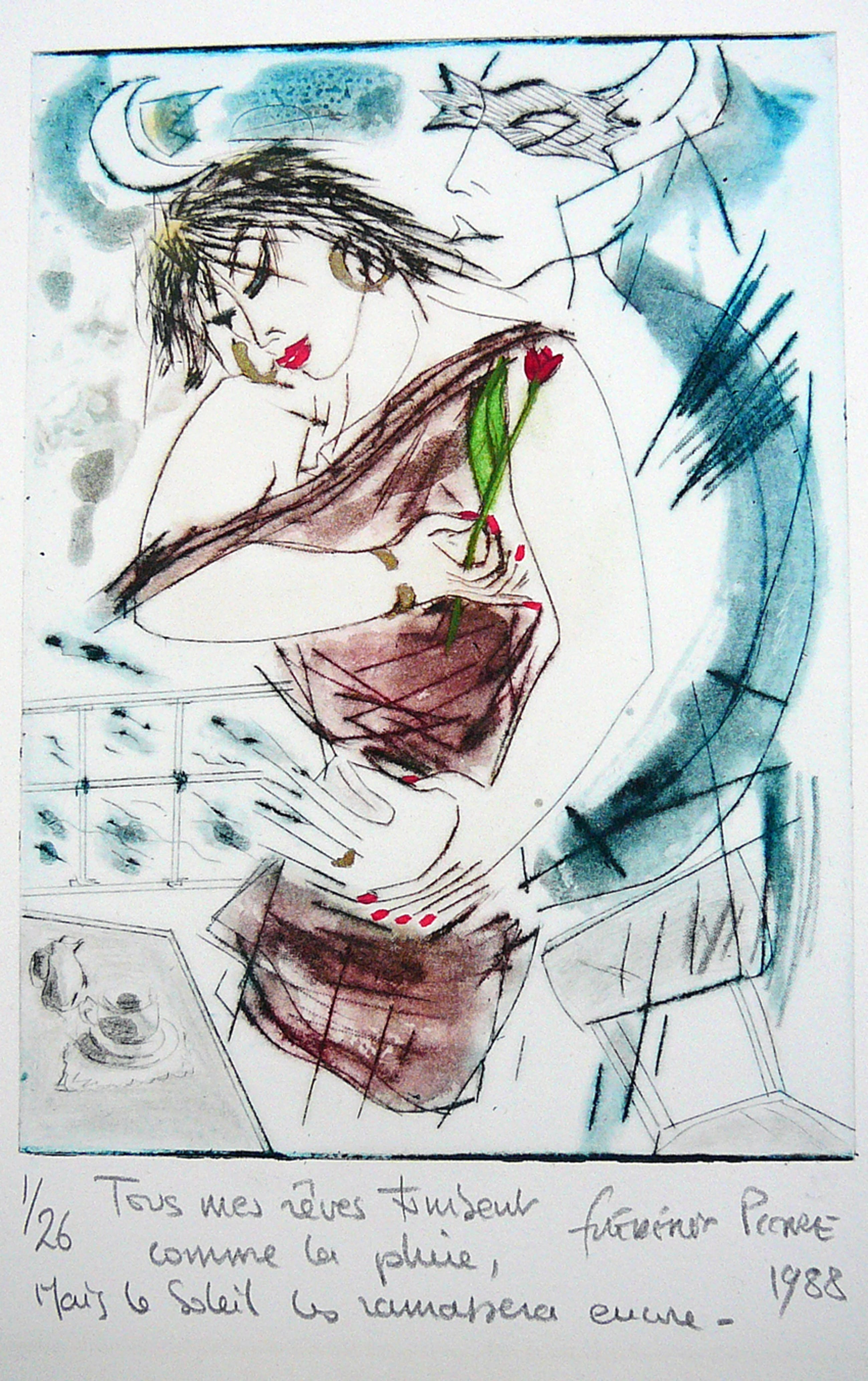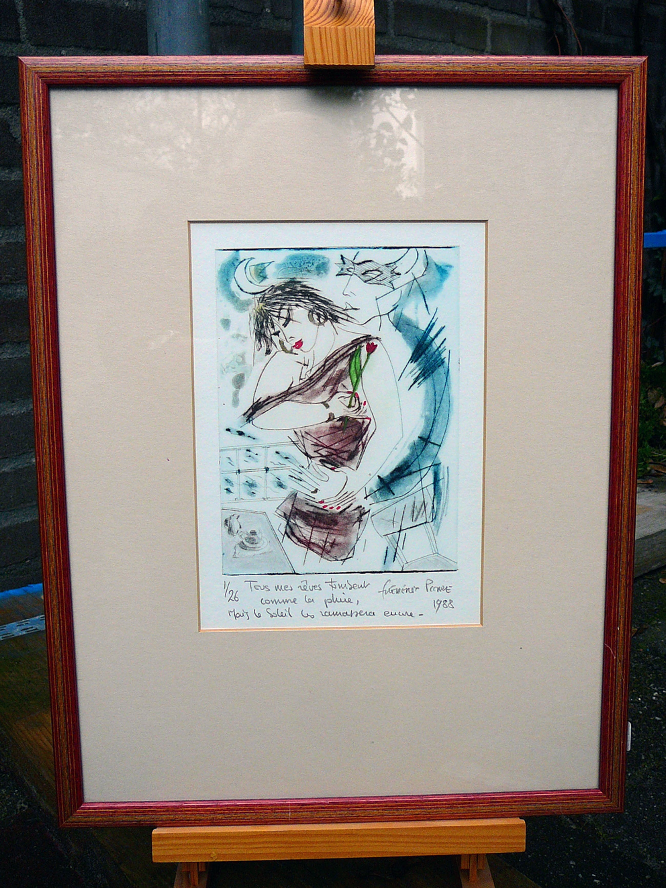 Illustratieve ets bewerkt met aquarel van een mij onbekende Franse kunstenaar, Nr 1 van 26 exemplaren in zeer goede staat. Gesigneerd en gedateerd.