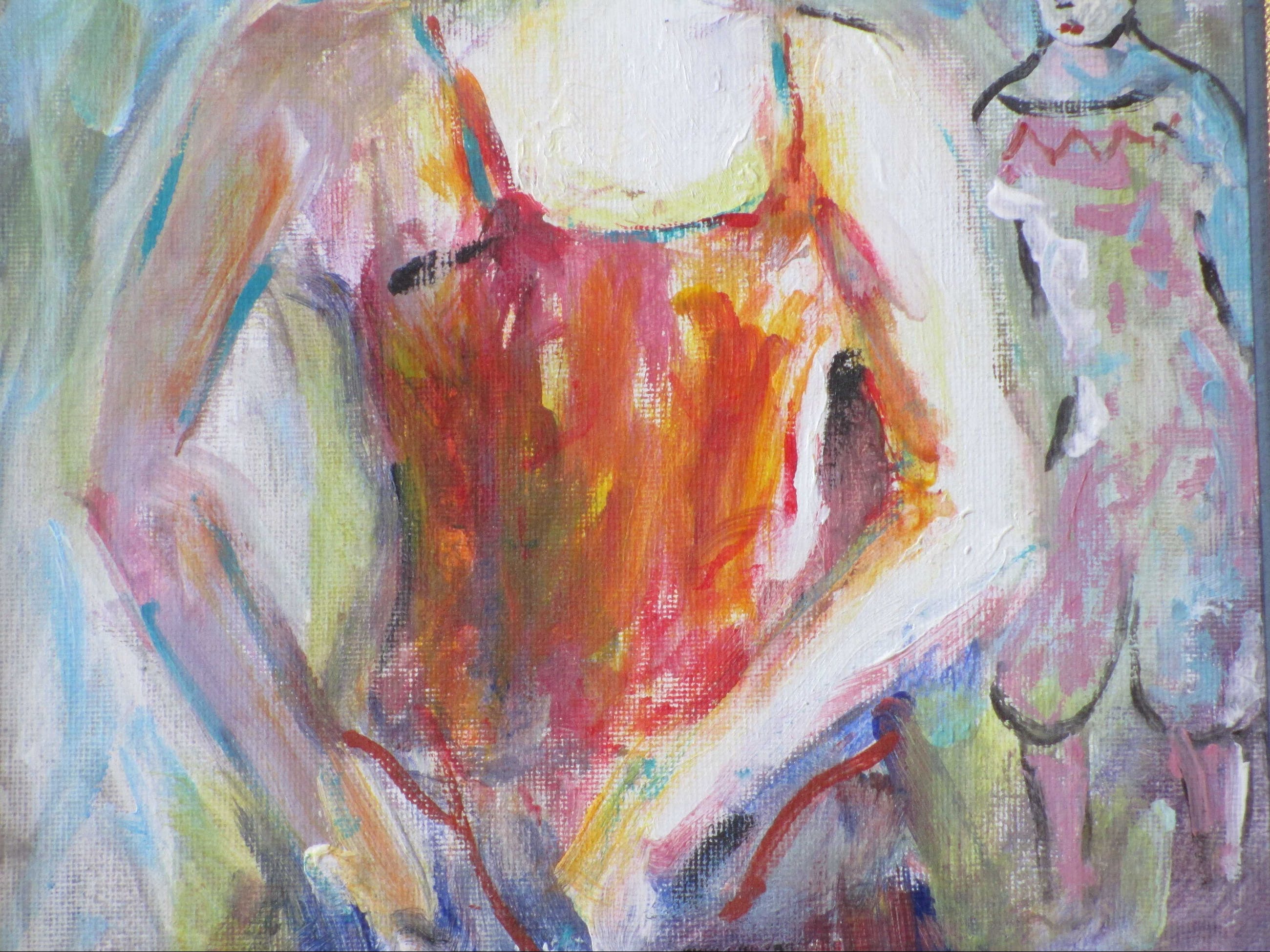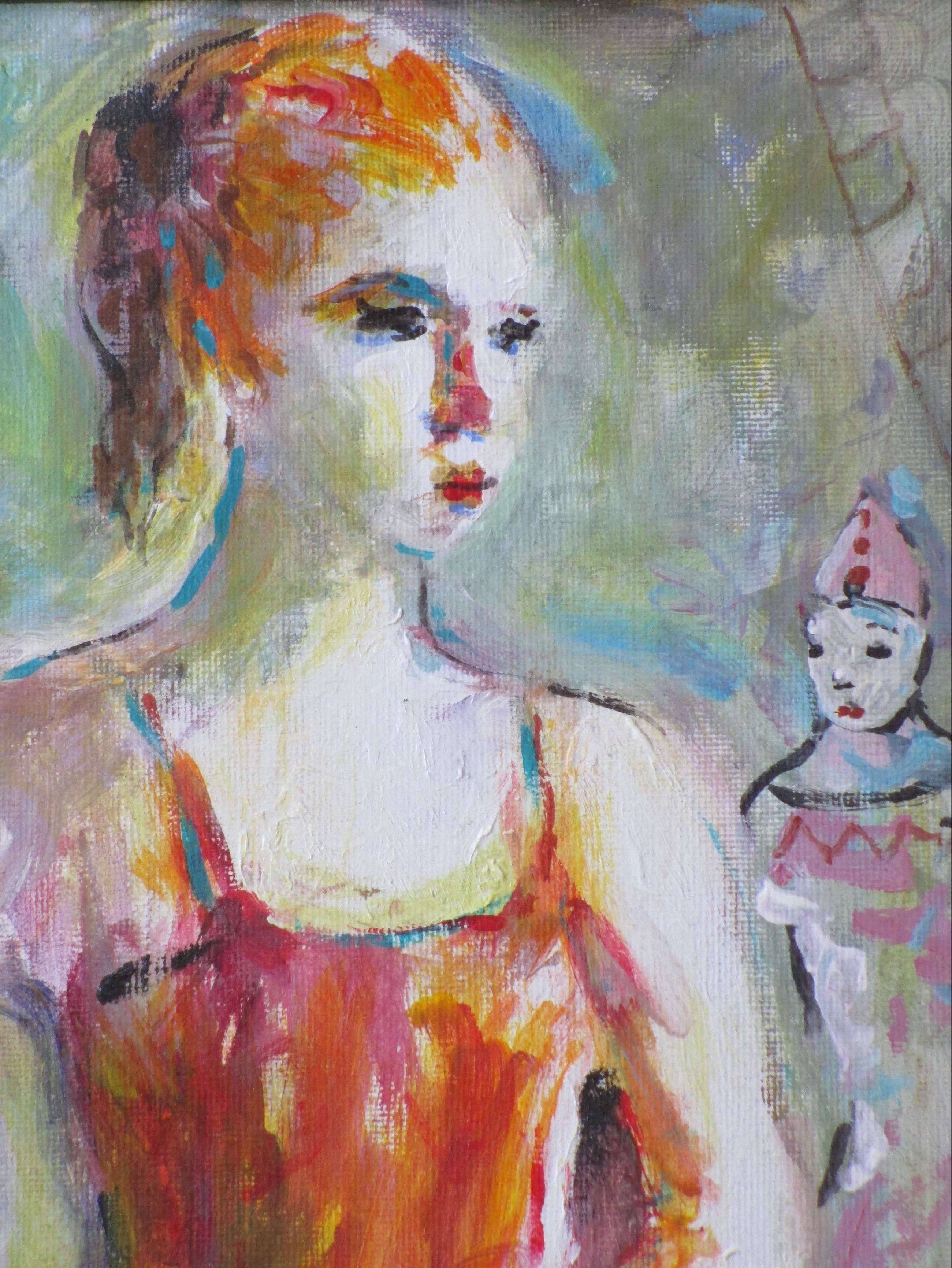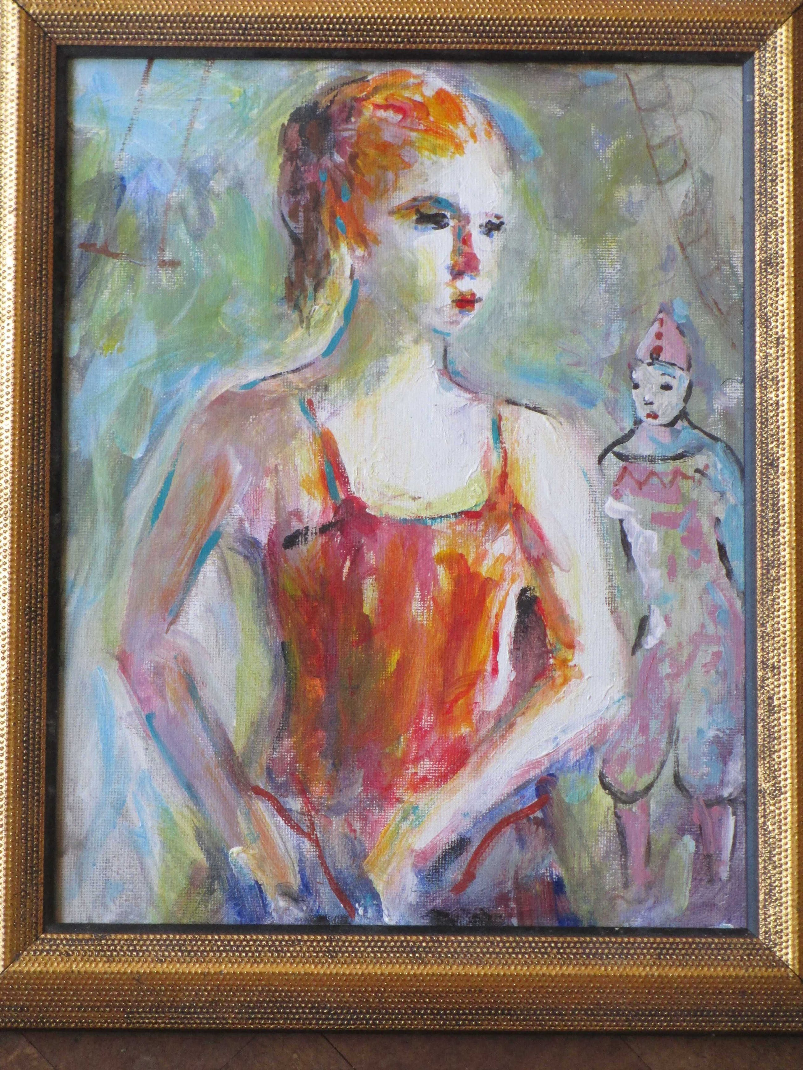 Olieverf op board in de traditie van de Franse School Voorstelling van trapeze-artiesten in het circus Gelijst, beeldmaat 30x24, lijstmaat 36x30 Niet gesigneerd Toeschrijving op achterzijde: 'Andre Planson'