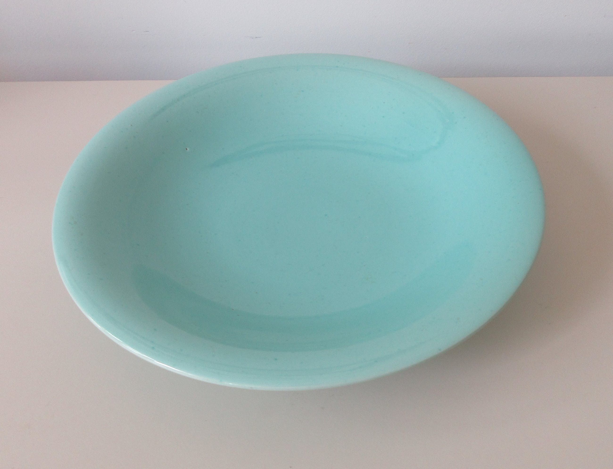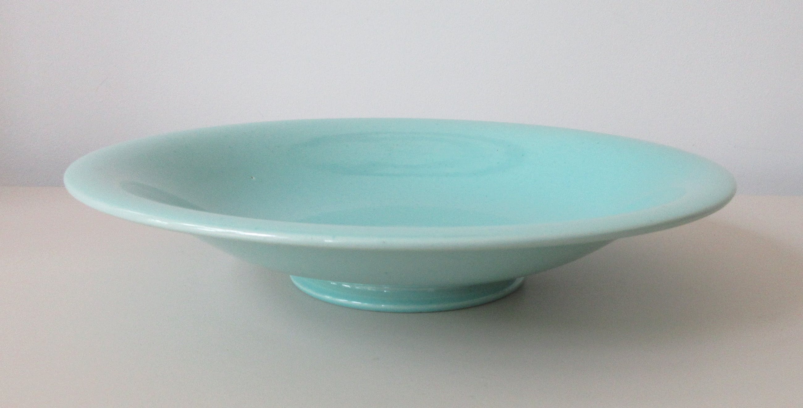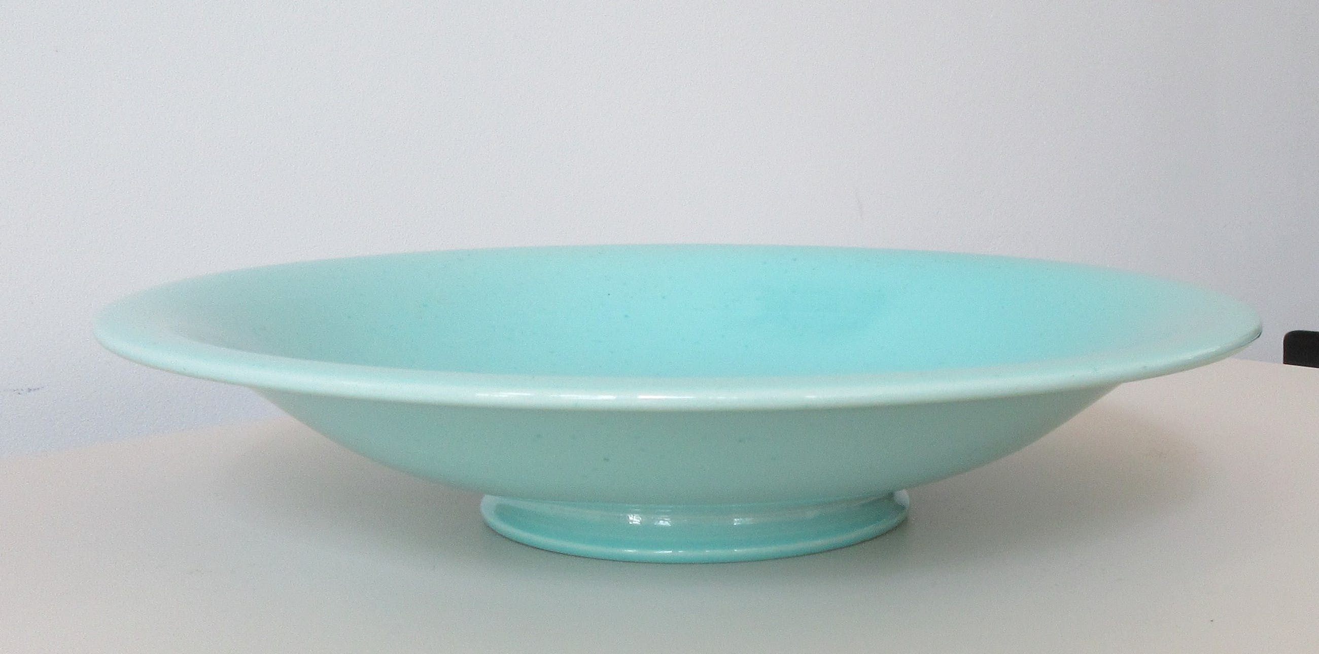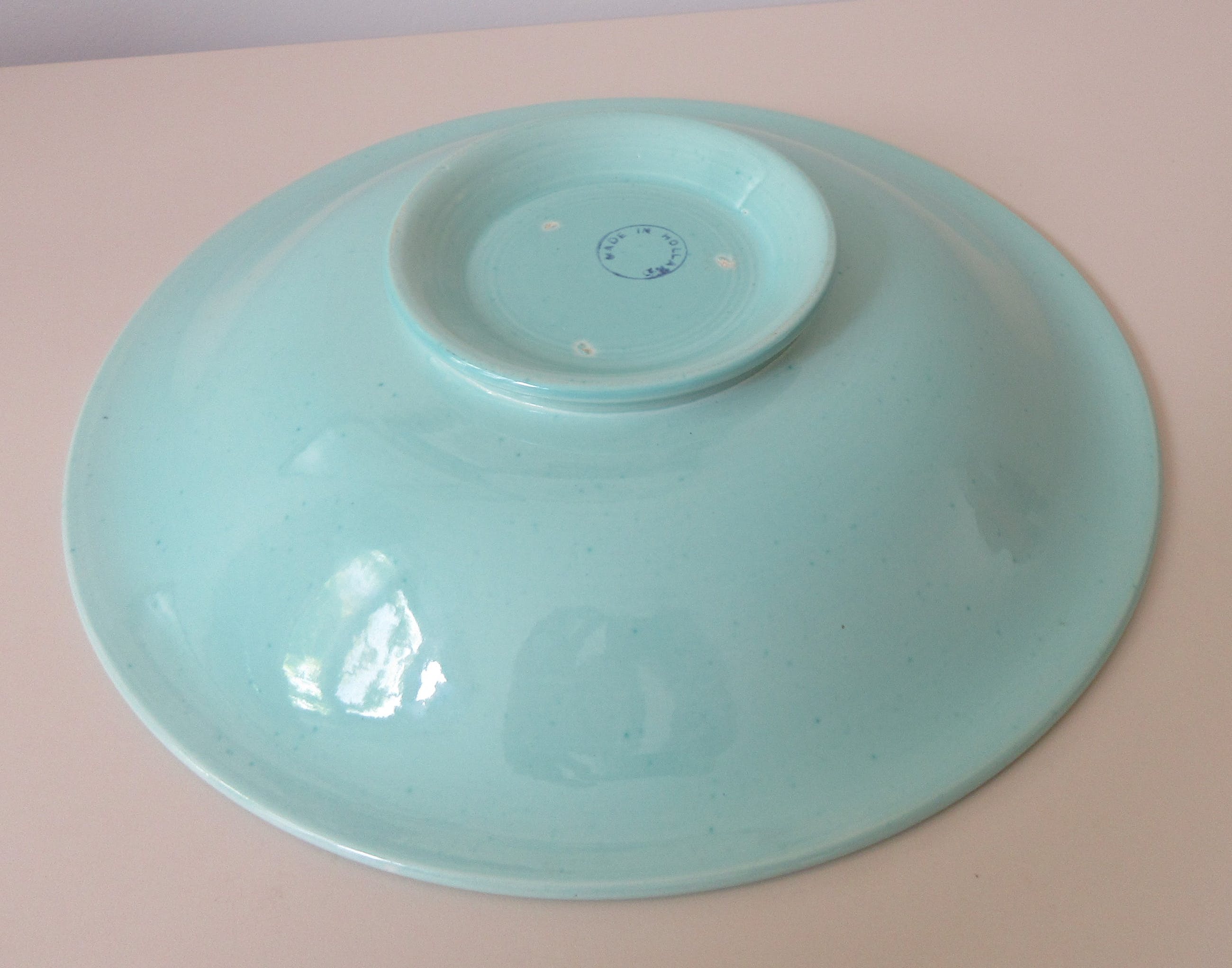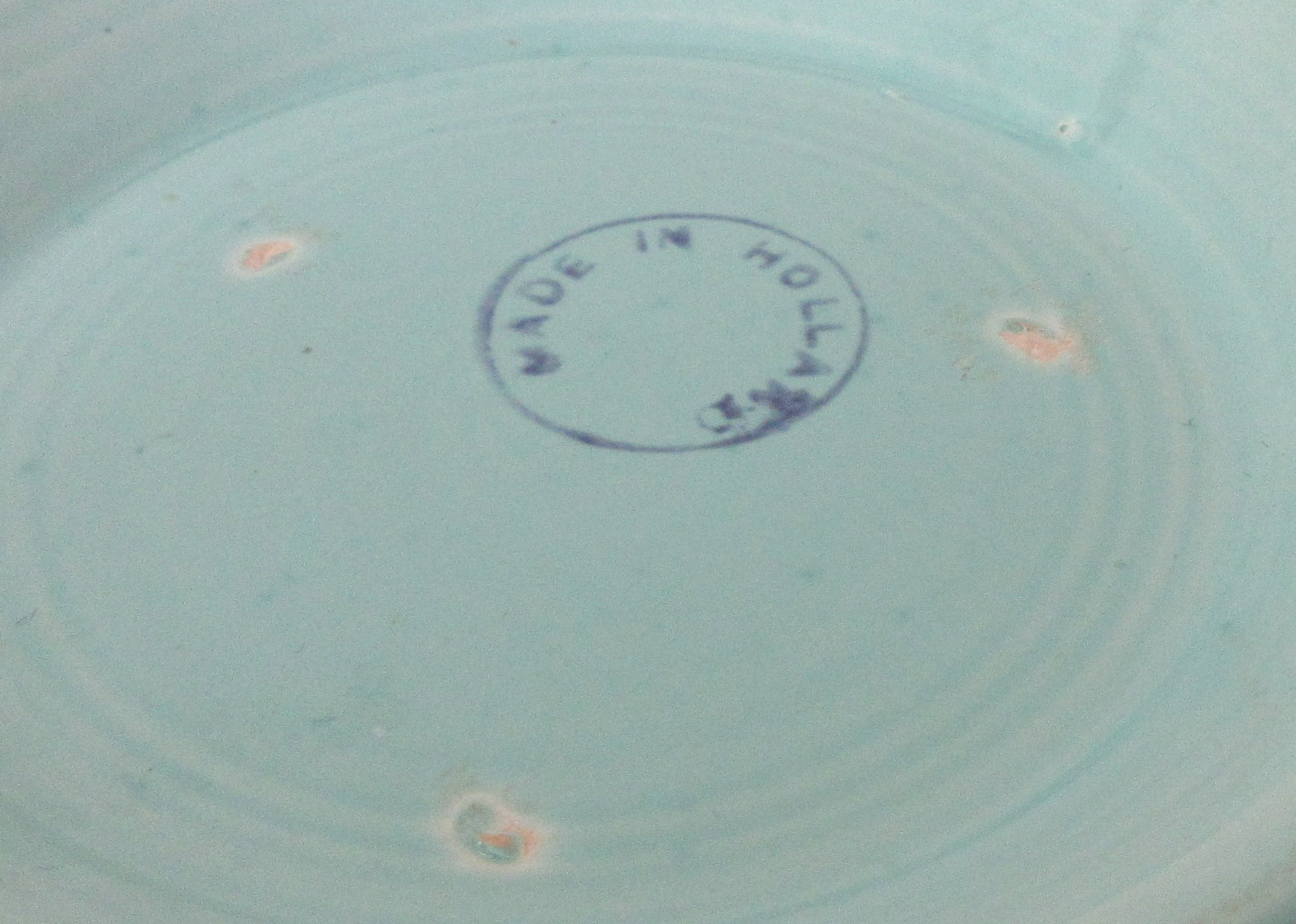 Turqoise platelen Fruitschaal van een Hollandse plateelfabriek, welke is onbekend namelijk alleen gemerkt 'Made in Holland' binnen een blauwe cirkel. In zeer goede onbeschadigde conditie.