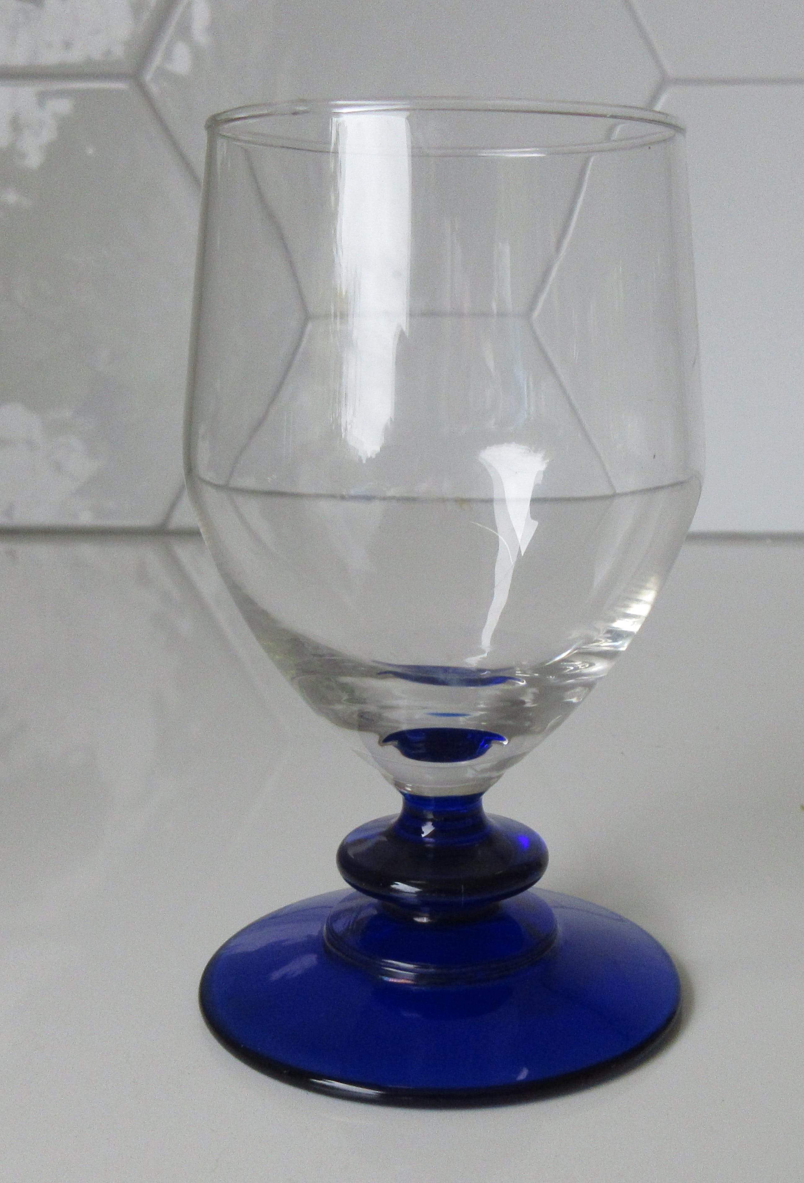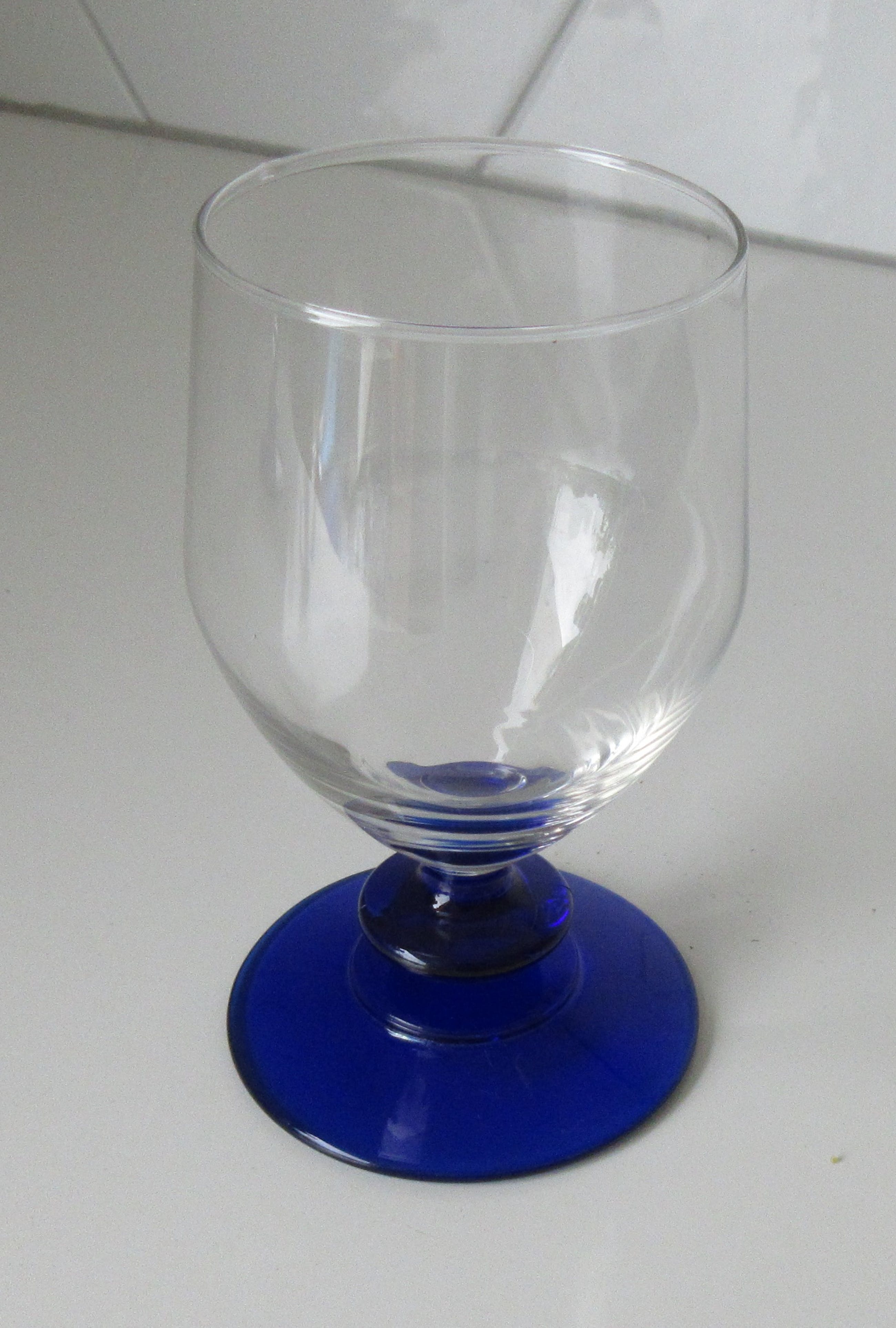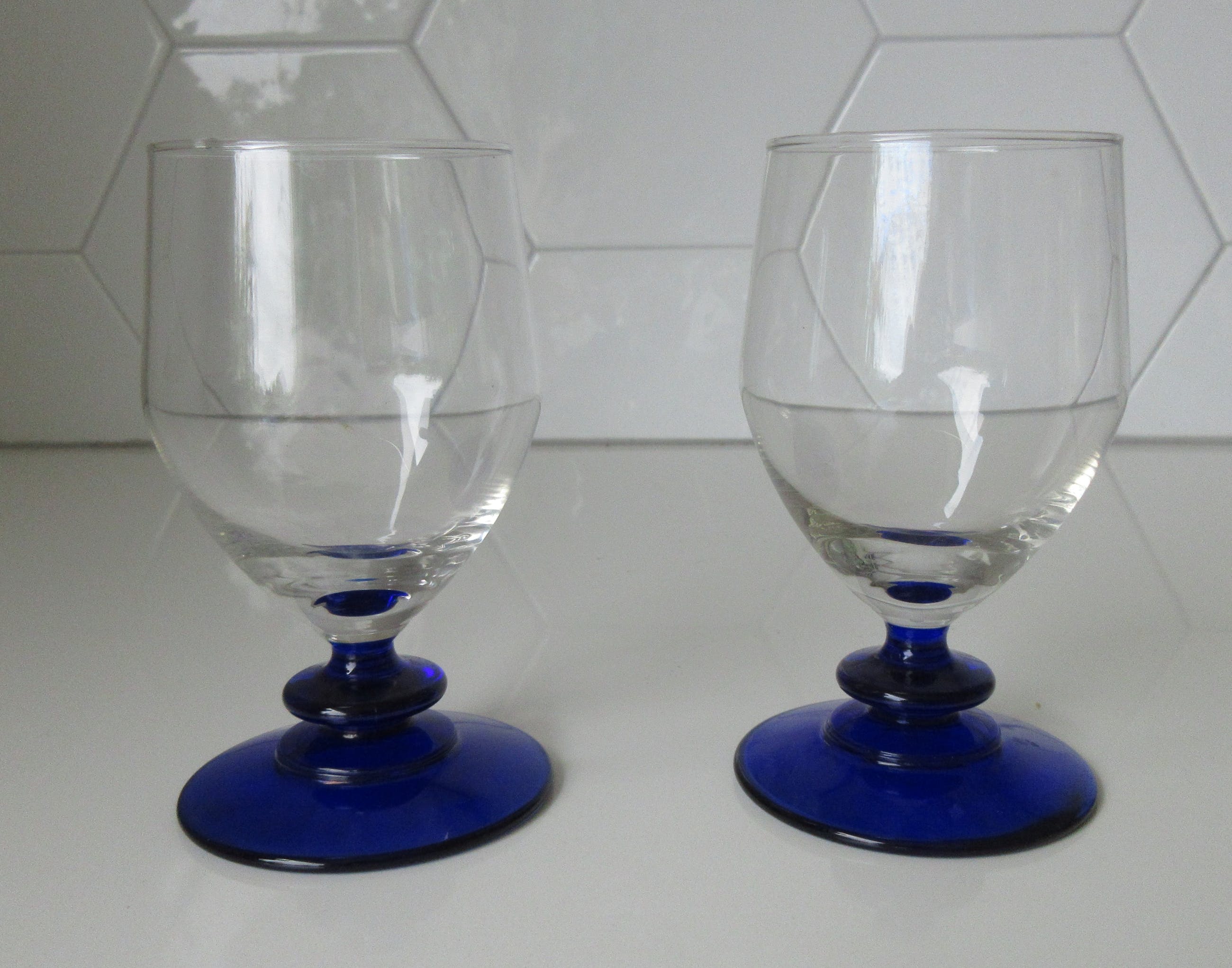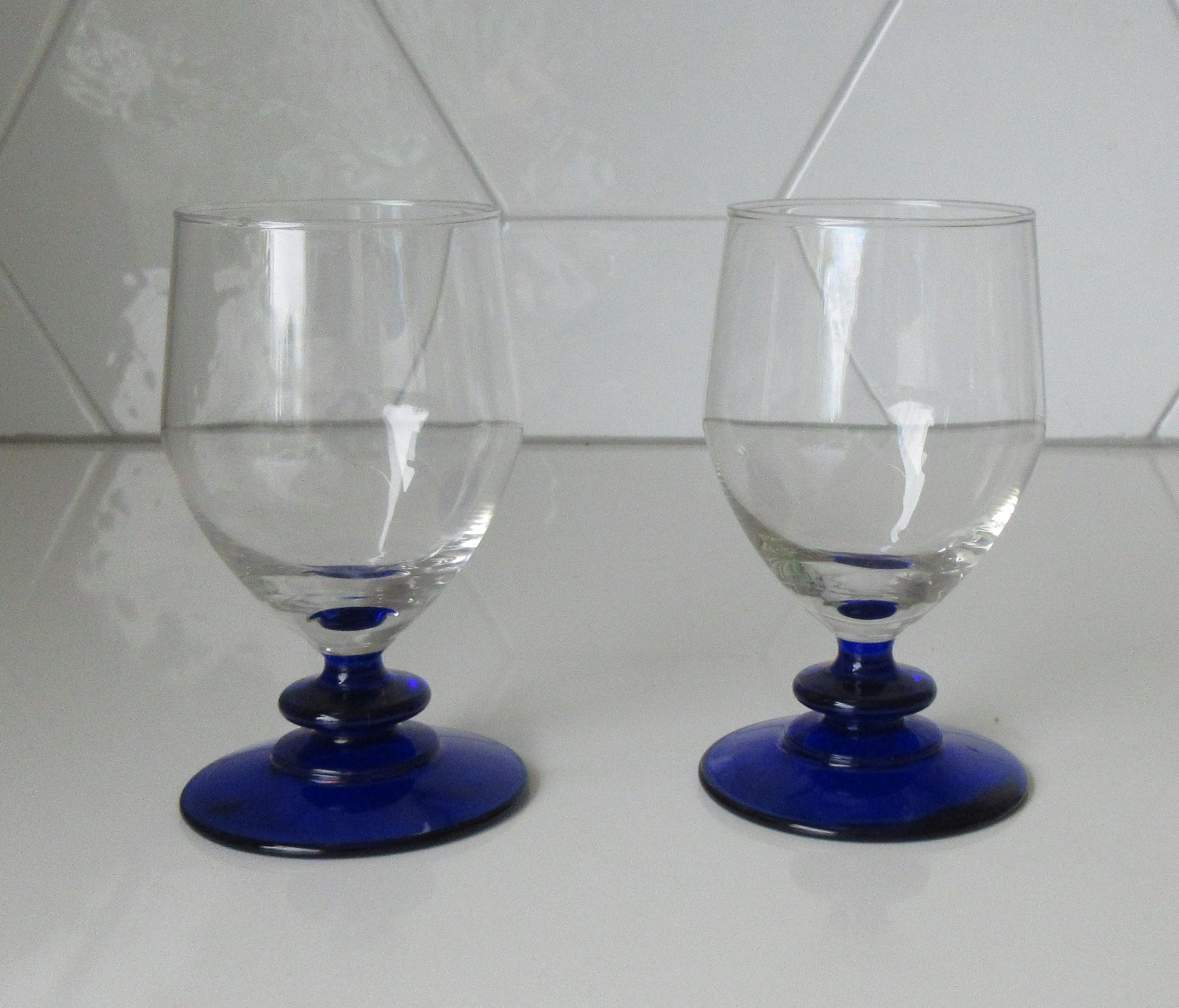 Twee art deco stijl wijnglaasjes met blauwe voet. Mooi model glaasje, niet gemerkt dus maker onbekend. Komen uit de jaren '80 waarschijnlijk.