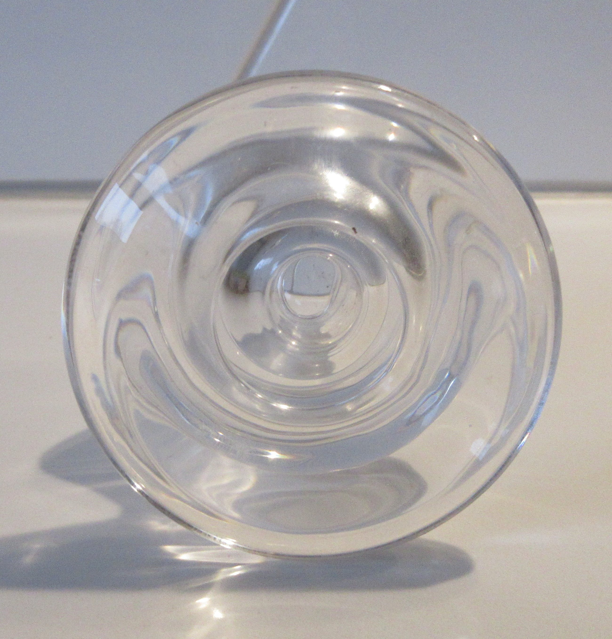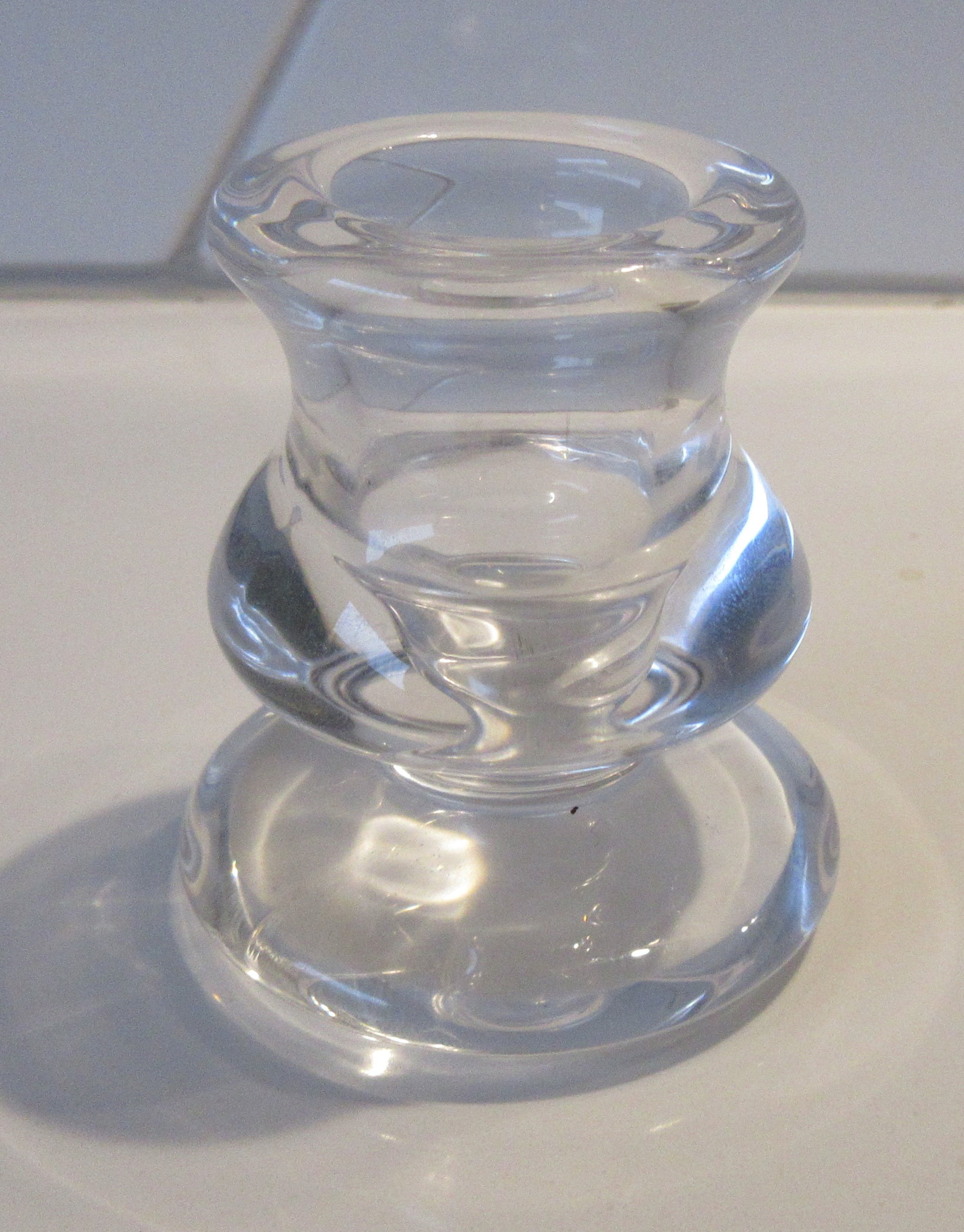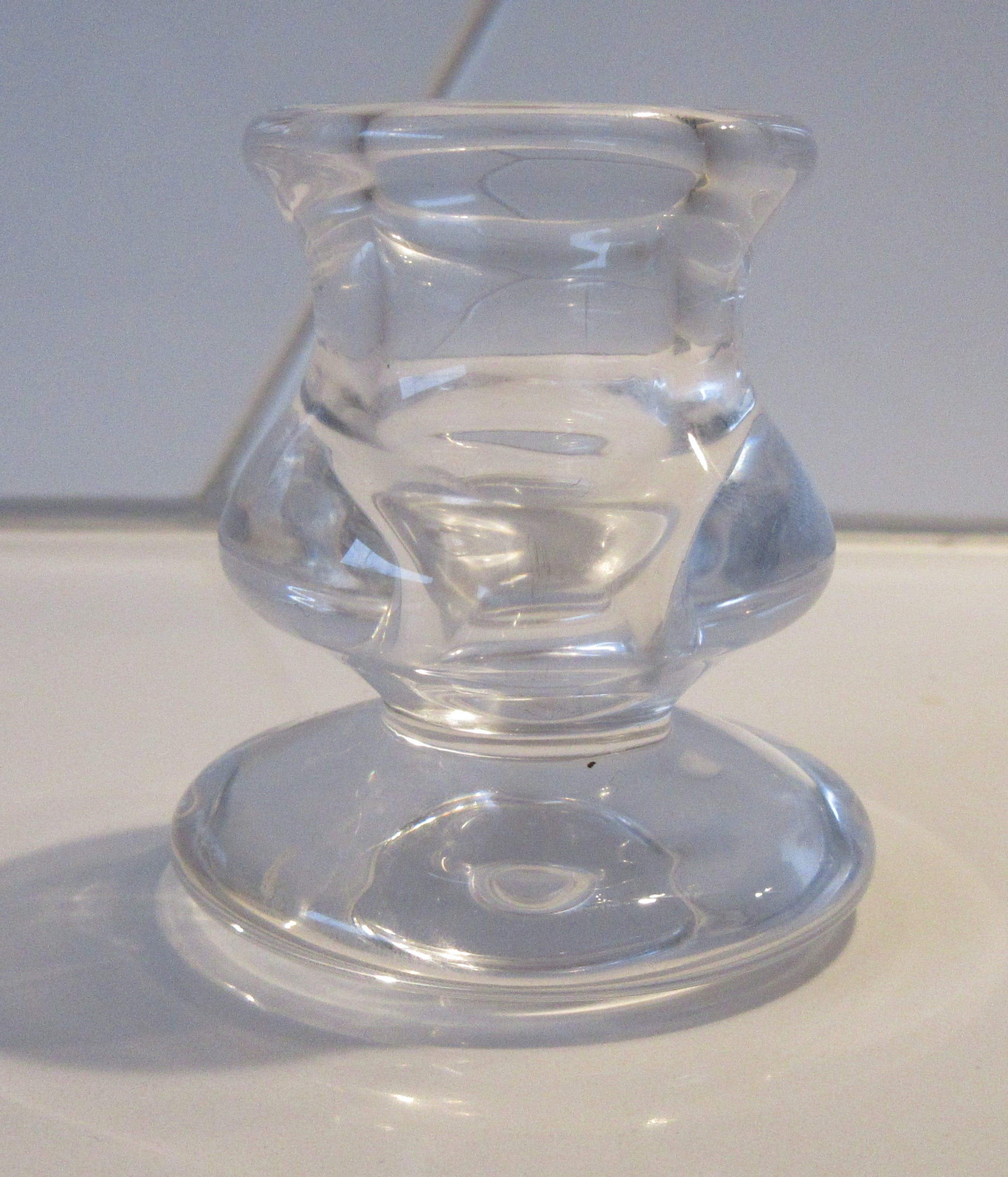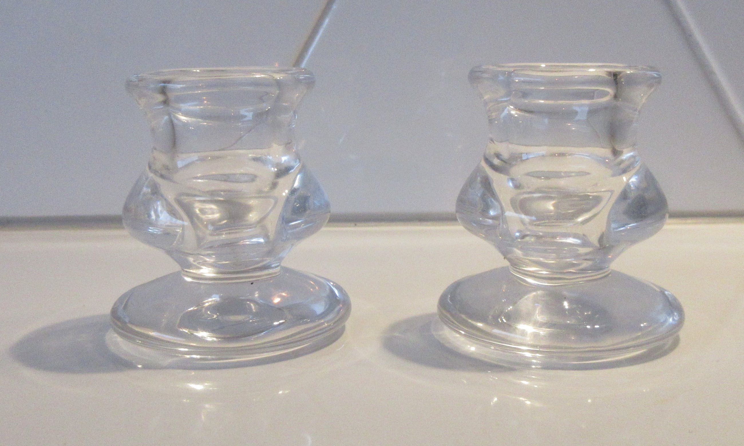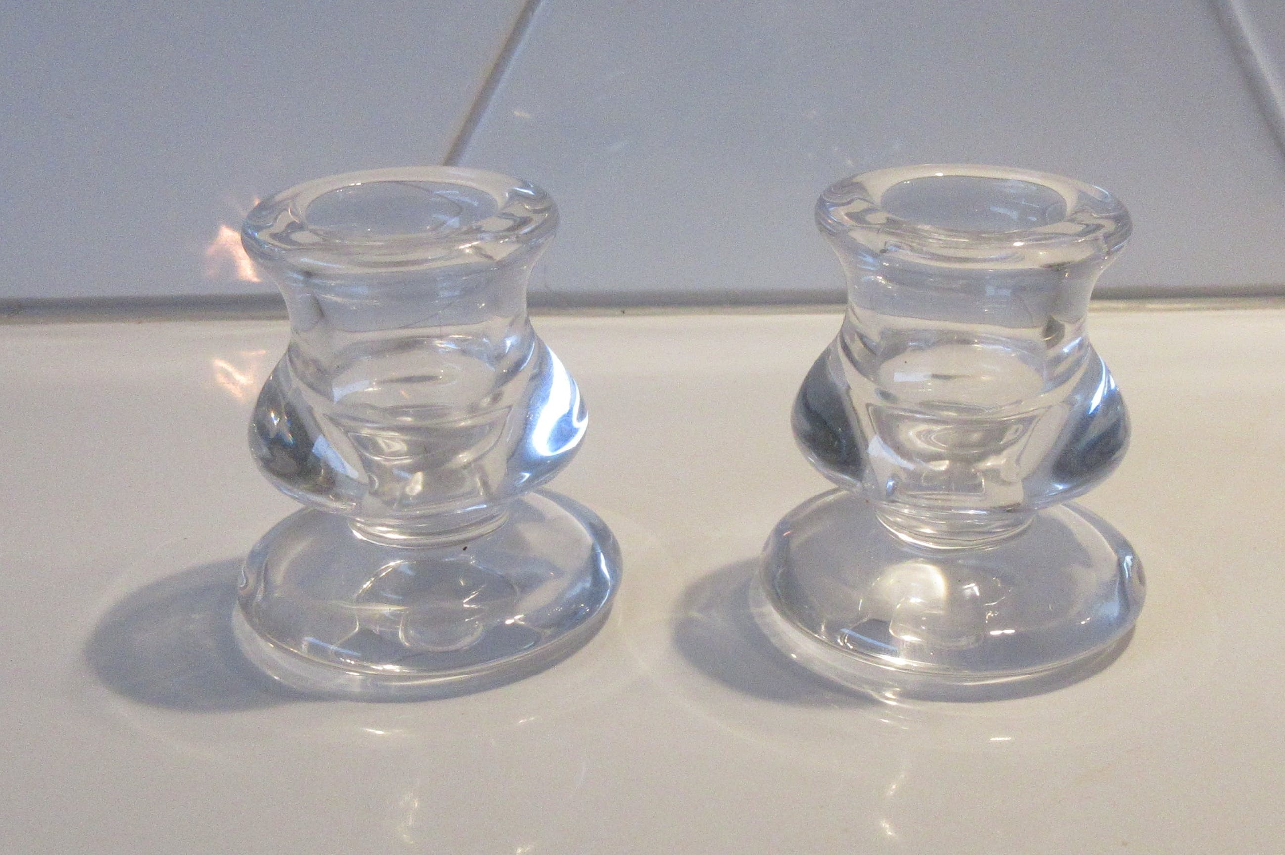 Twee blank glazen kandelaren. Mooie vorm, ontwerper of uitvoerder onbekend. Niet gemerkt.