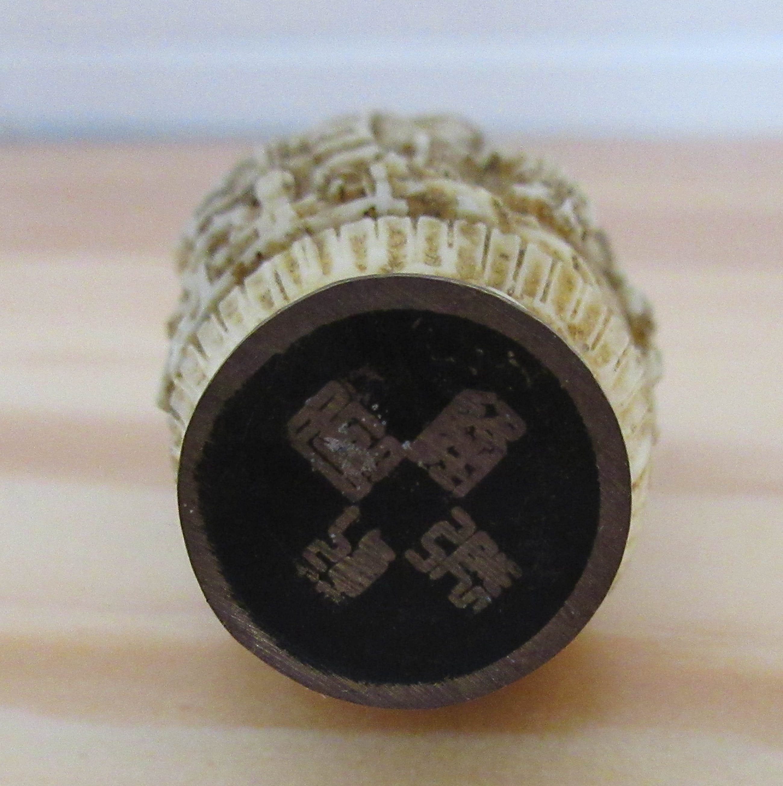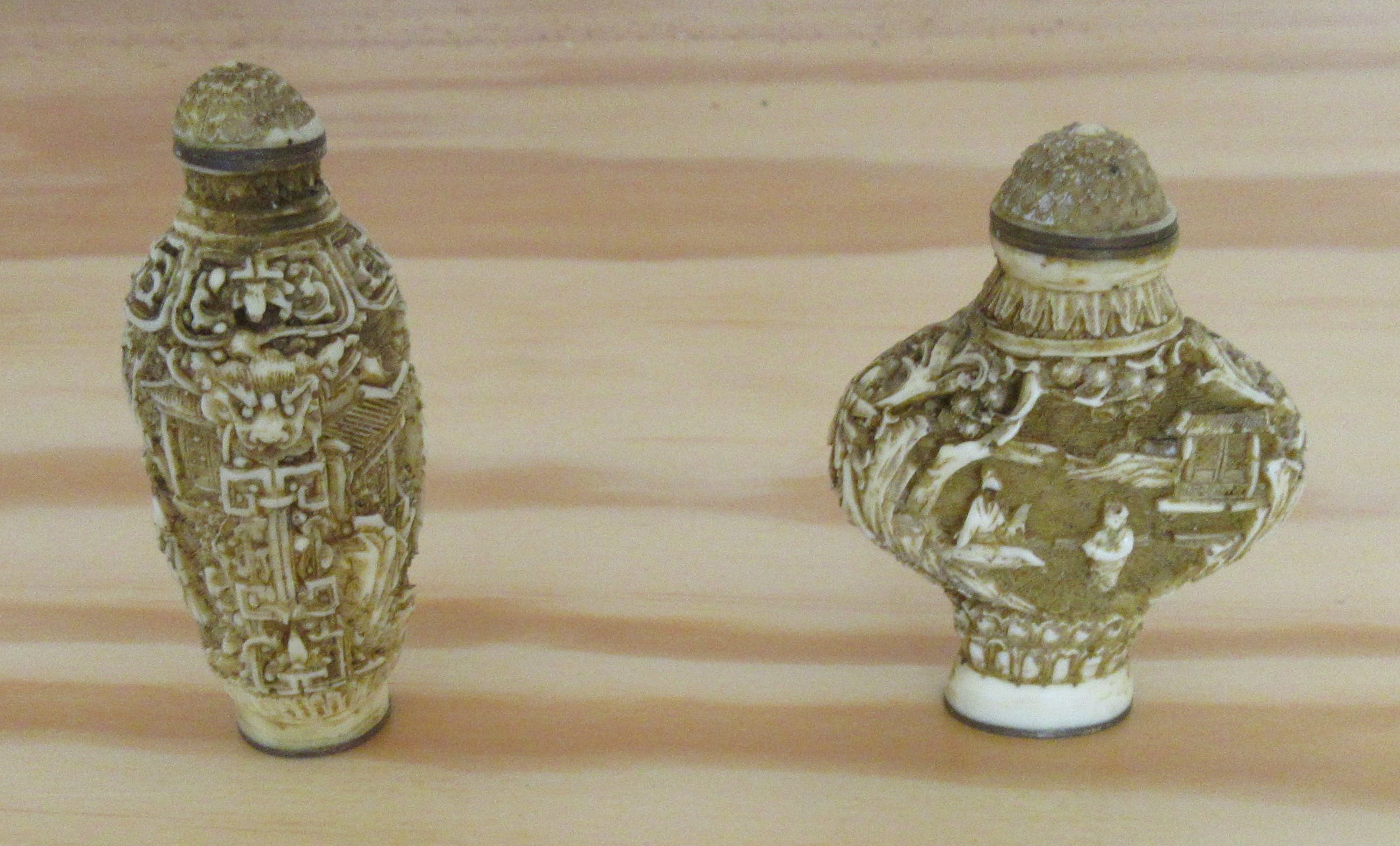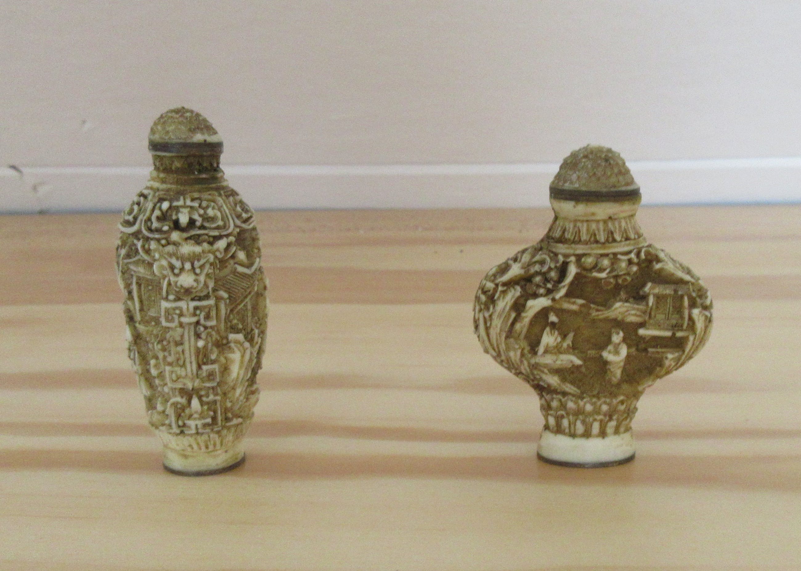 Twee Cinnabar handgesneden Chinese Snuifflacons gemaakt aan het begin van de 20e eeuw, prachtige decoratie met messing rand aan de onderzijde waarop de flesjes in Chinese karakters gemerkt zijn.