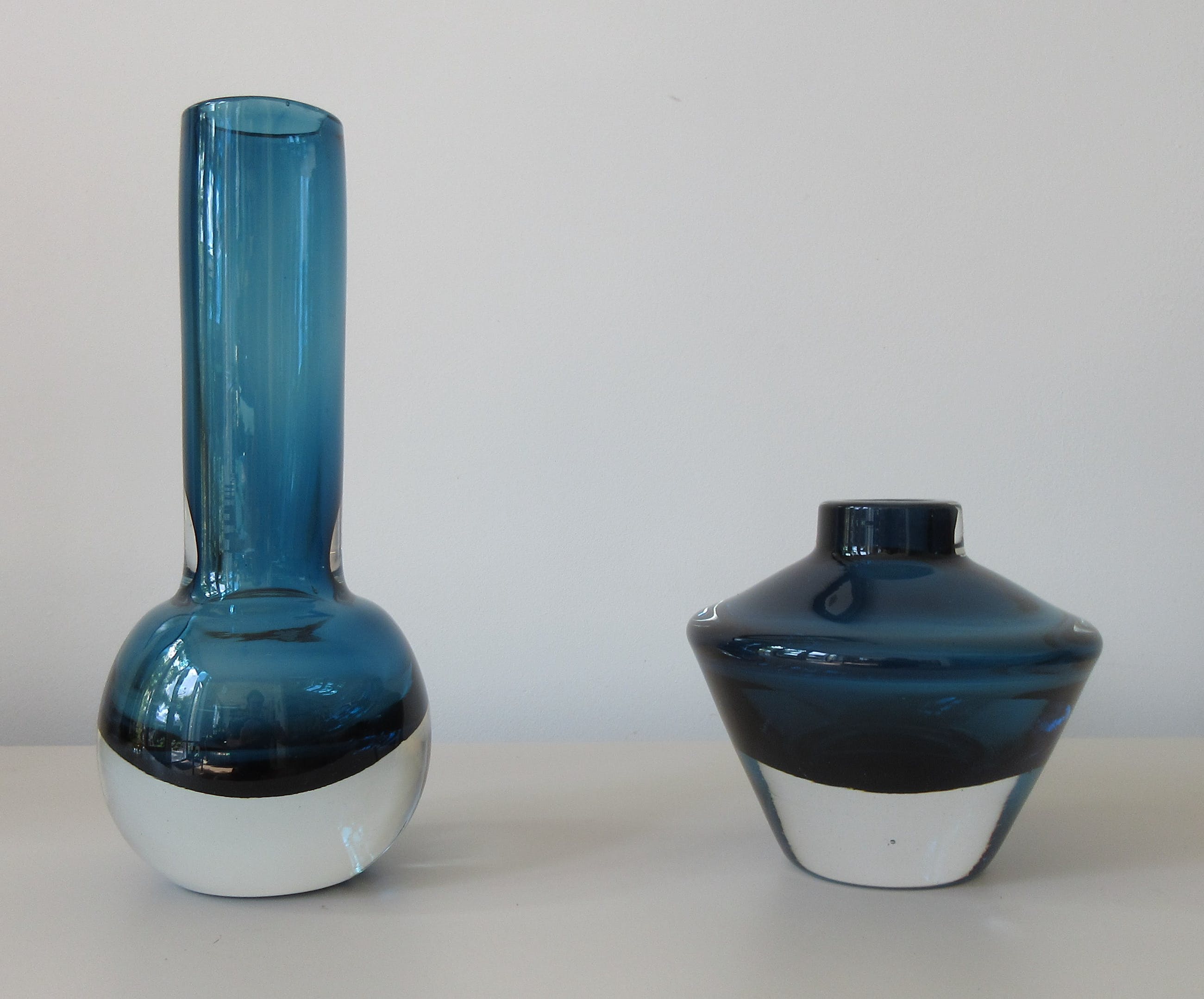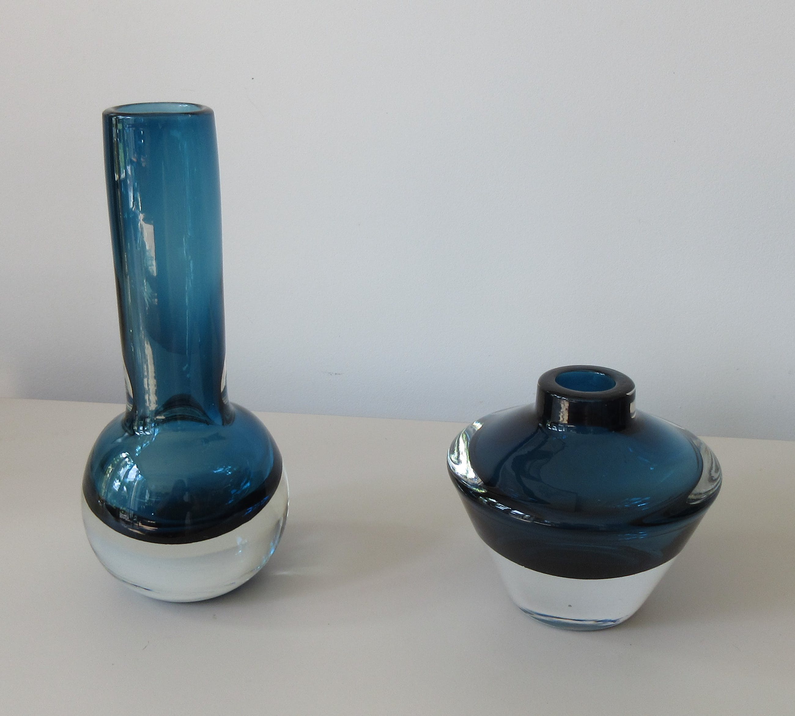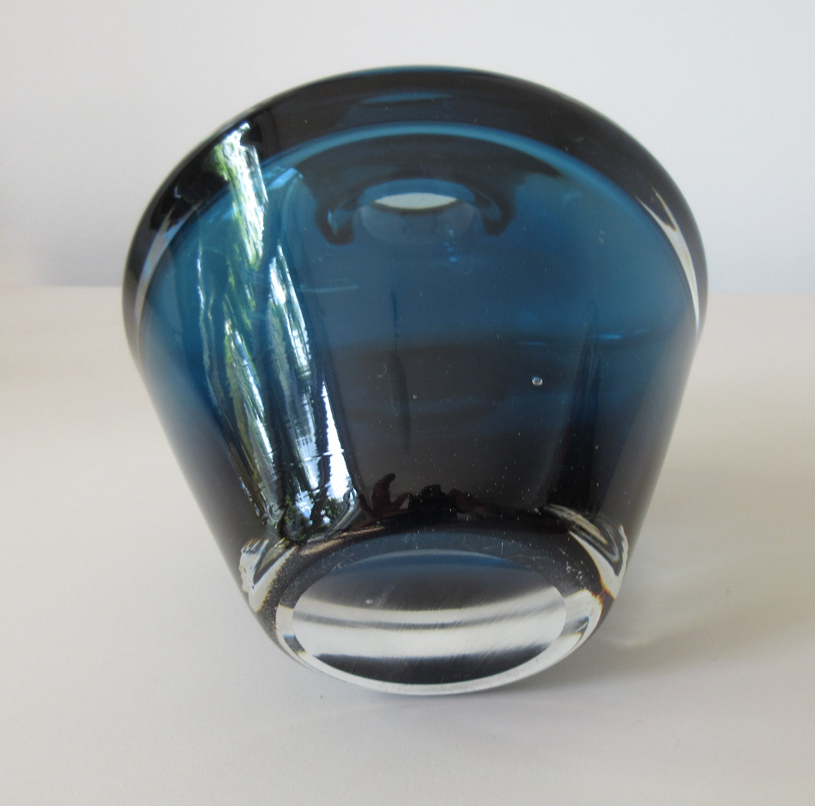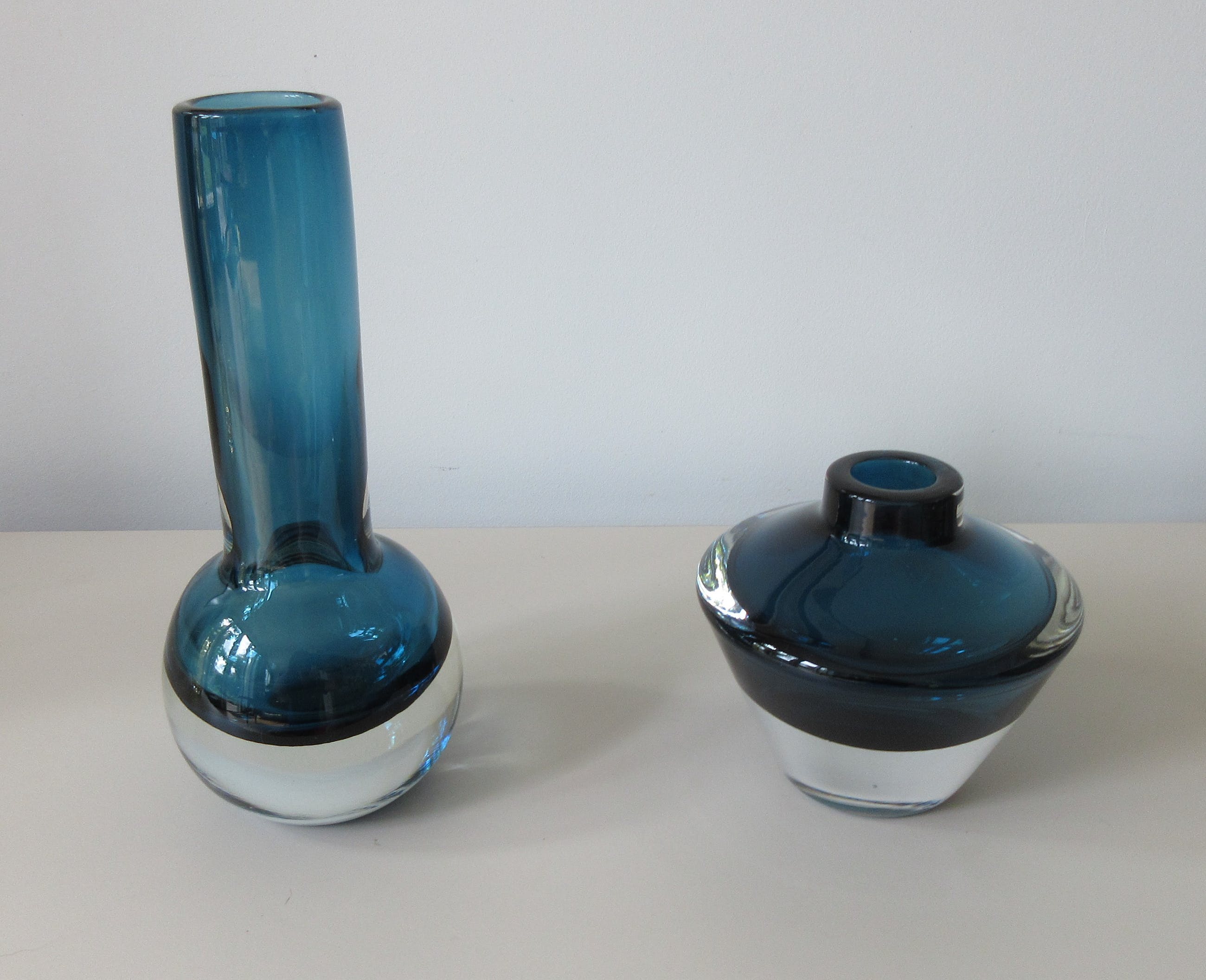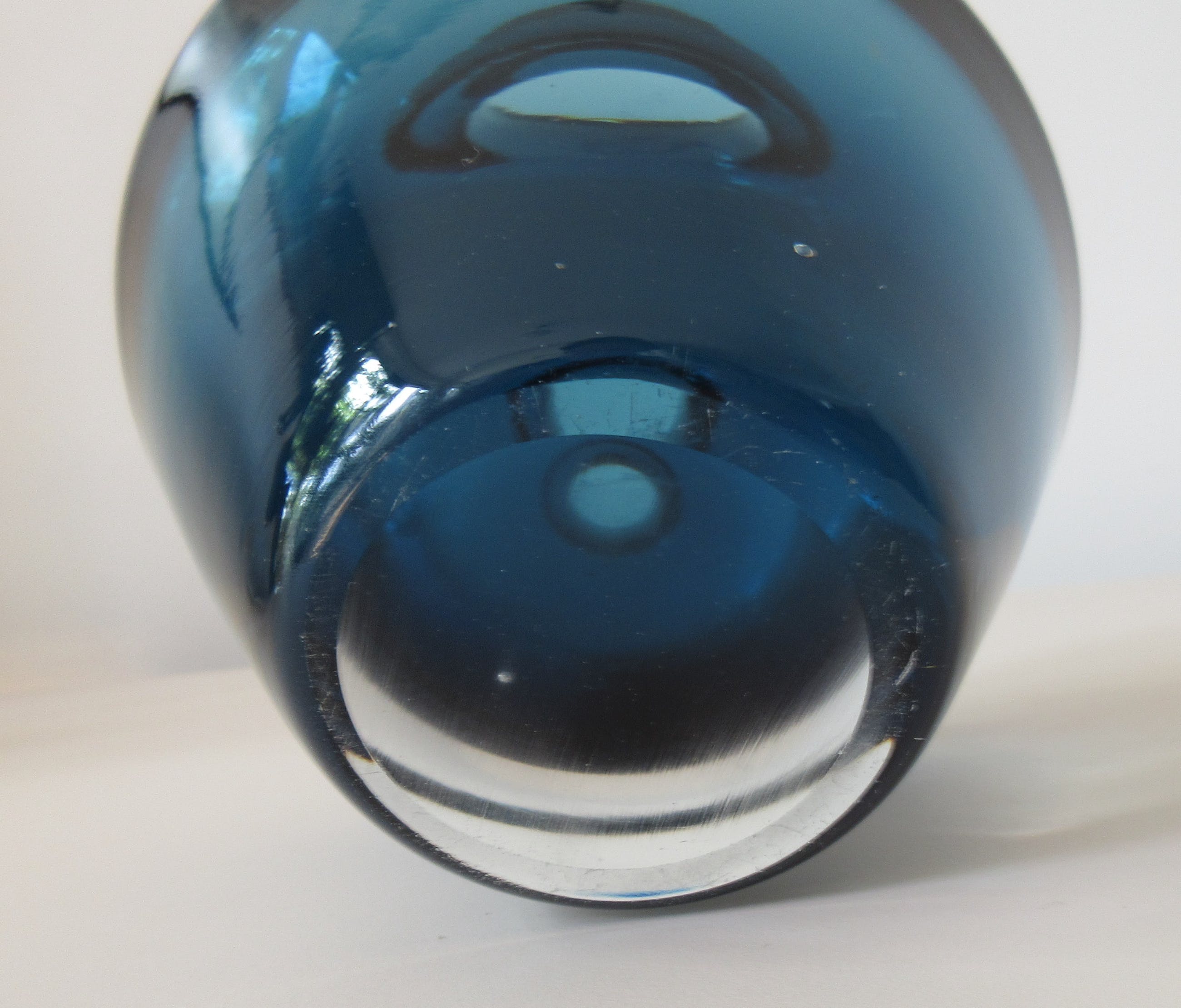 Twee dikwandige rookblauwe glazen discus en schoorsteen vaas. Hand geblazen. Beide in in perfecte conditie, ook geen spoor van (kalk)aanslag. Niet gemerkt wel voorzien van een gepolijst pontil merk.