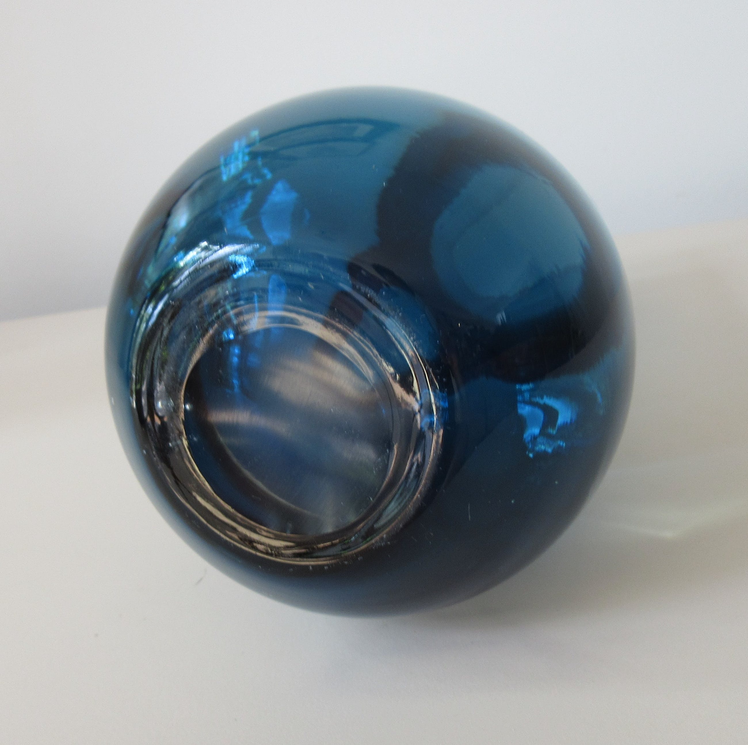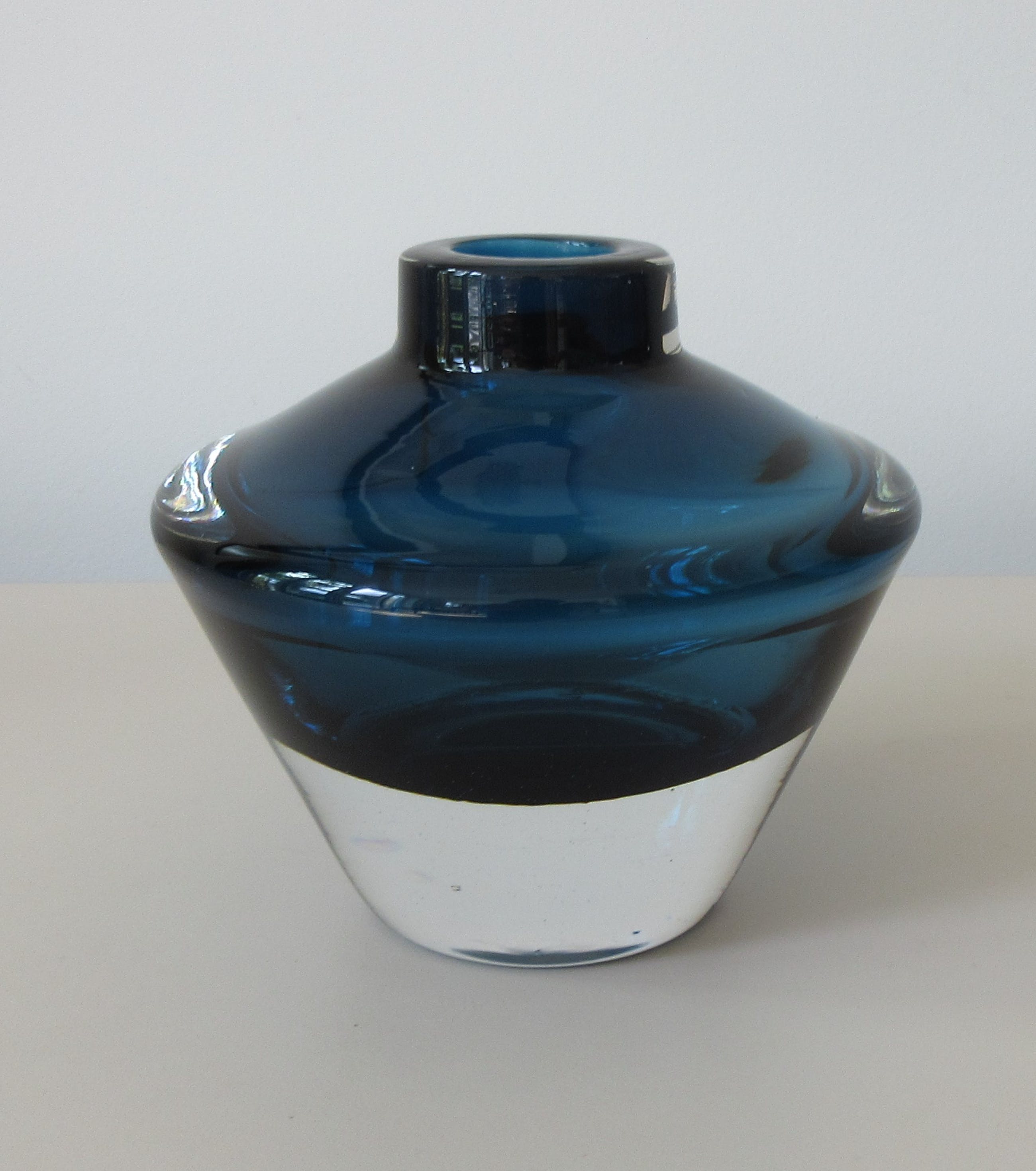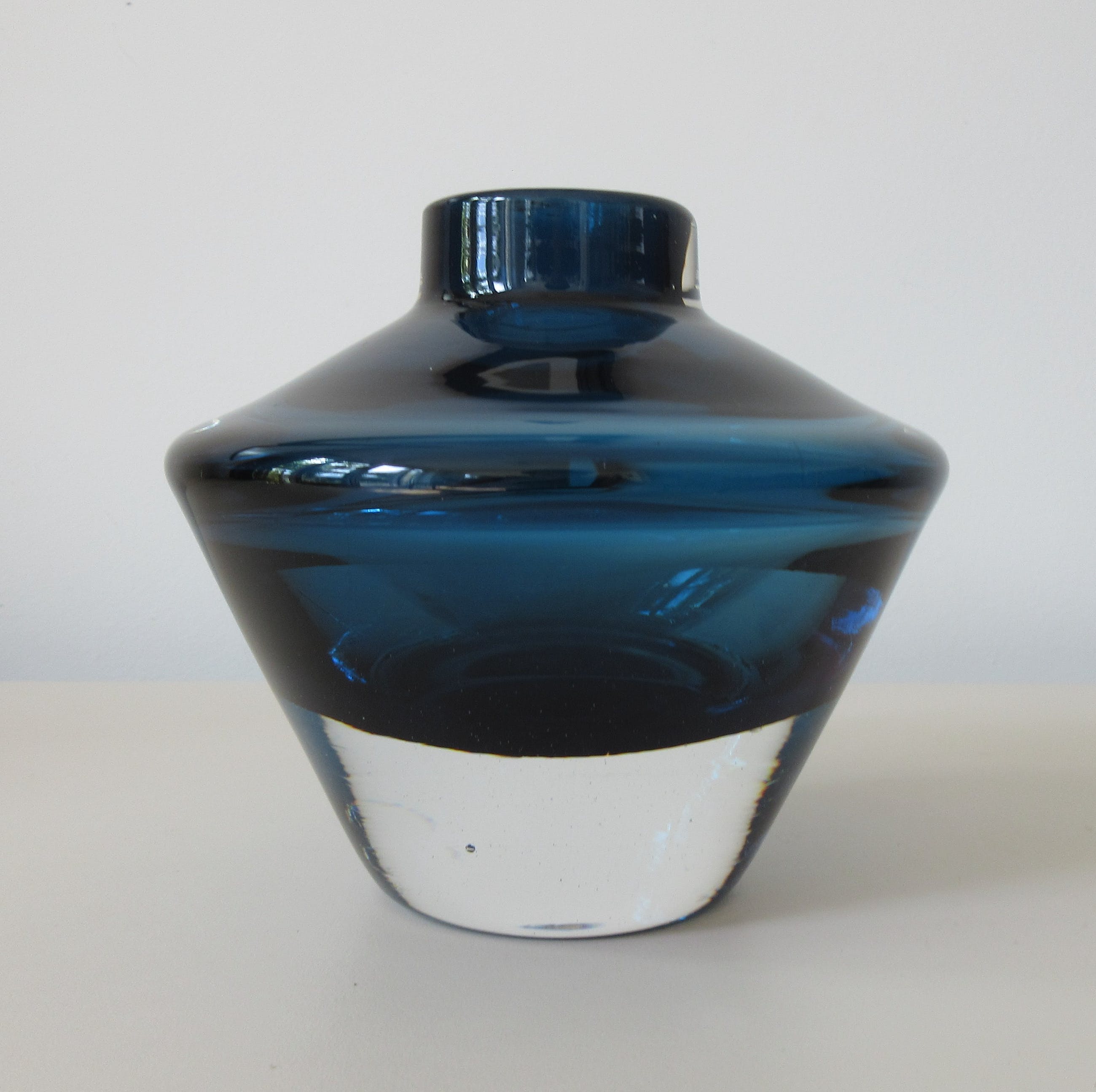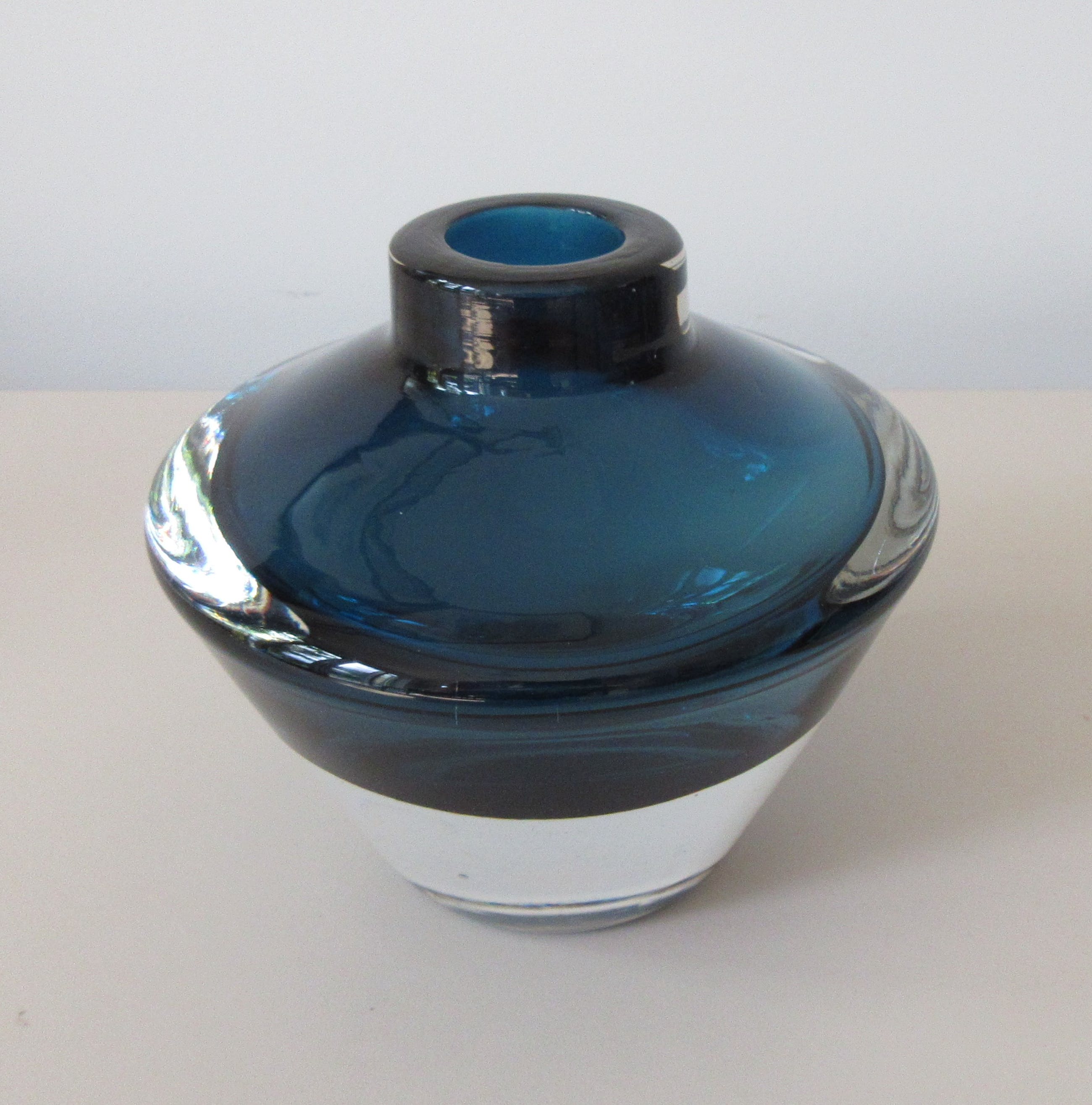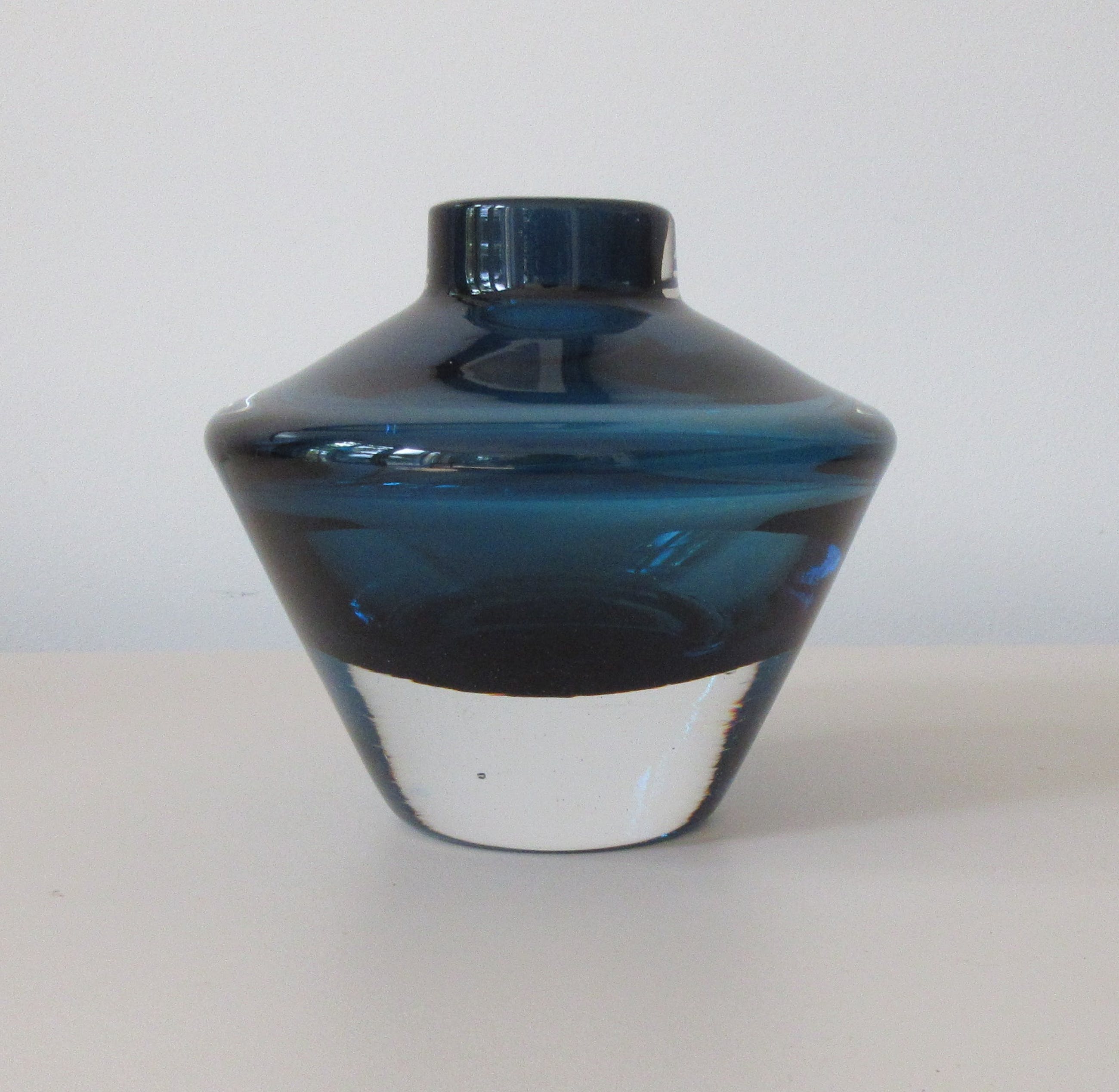 Twee dikwandige rookblauwe glazen discus en schoorsteen vaas. Hand geblazen. Beide in in perfecte conditie, ook geen spoor van (kalk)aanslag. Niet gemerkt wel voorzien van een gepolijst pontil merk.
