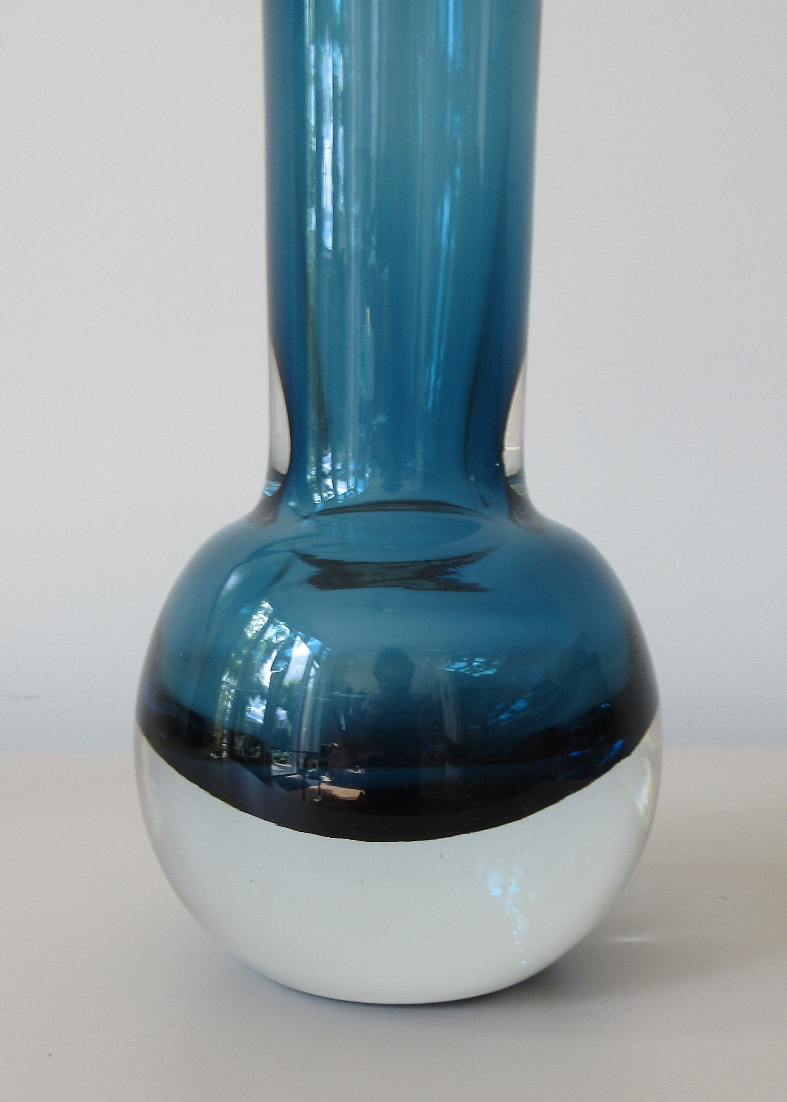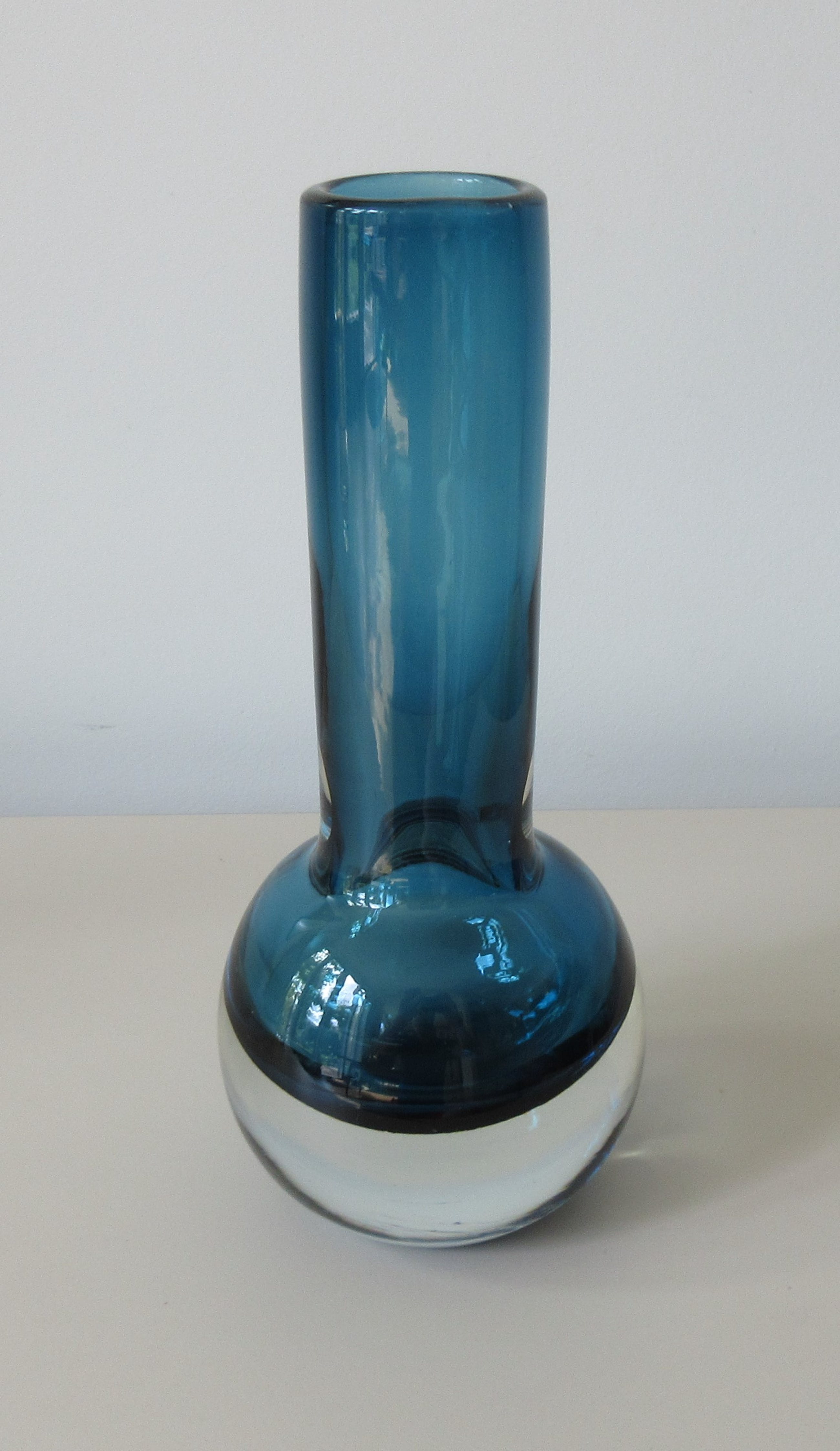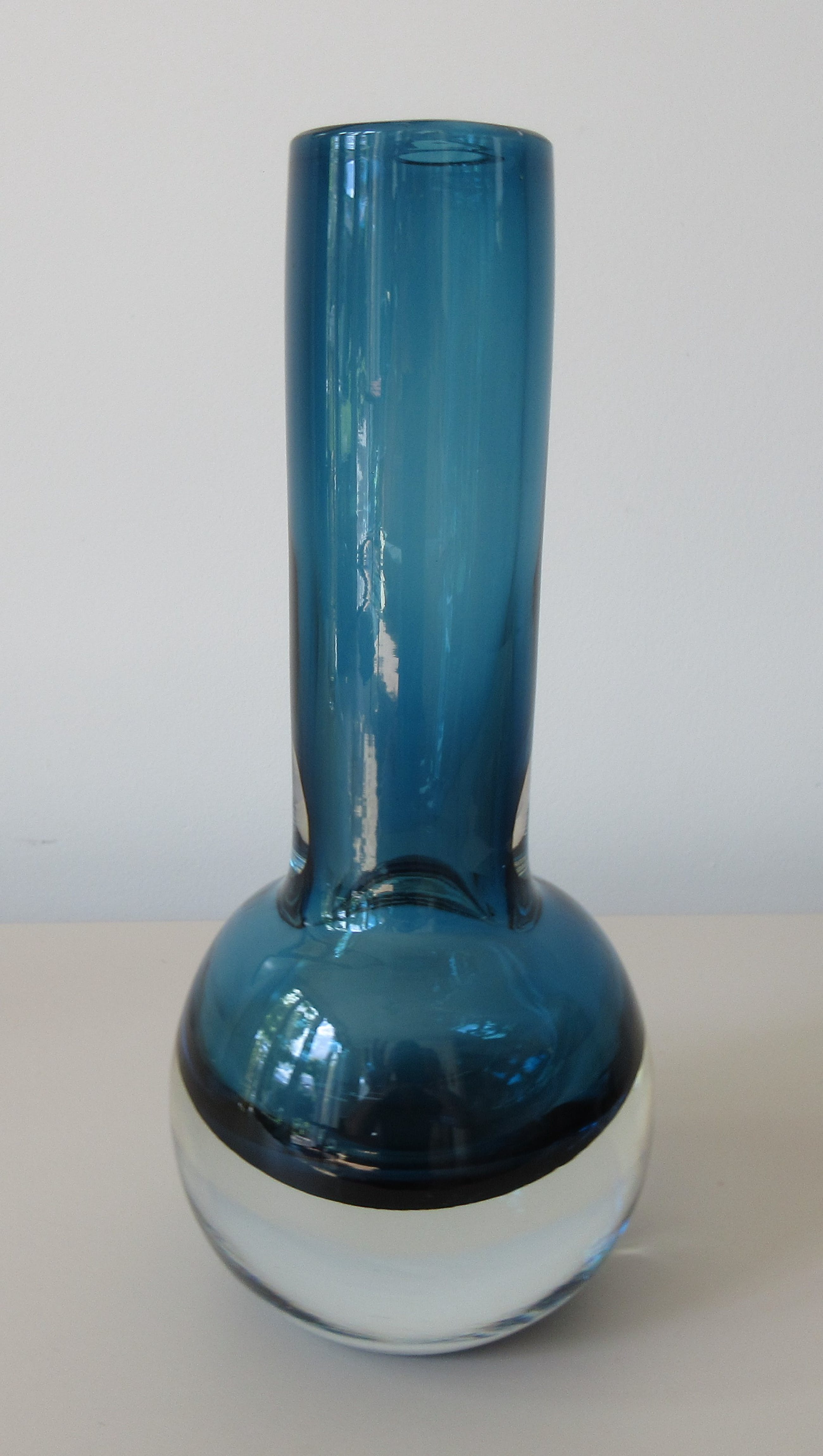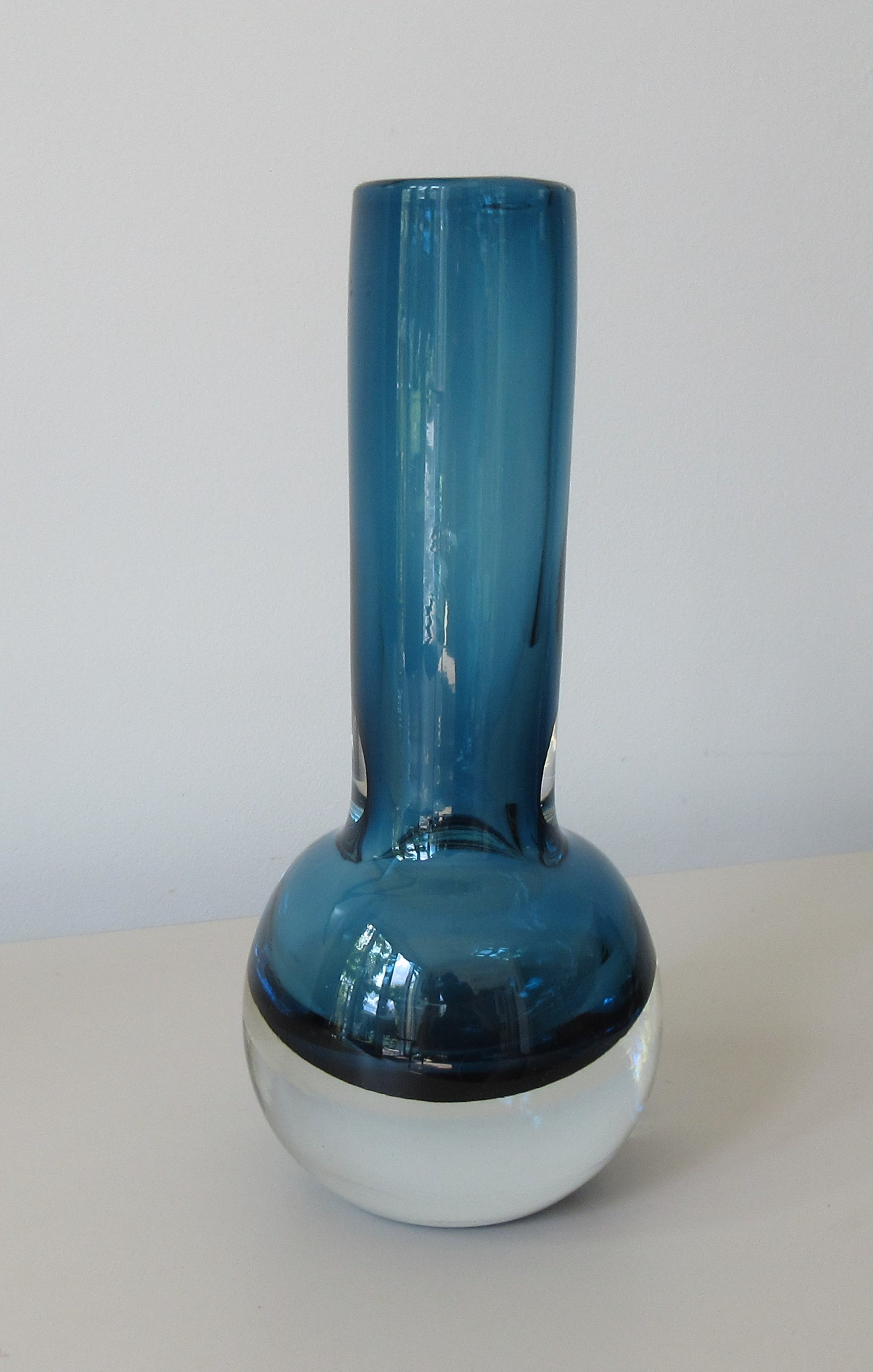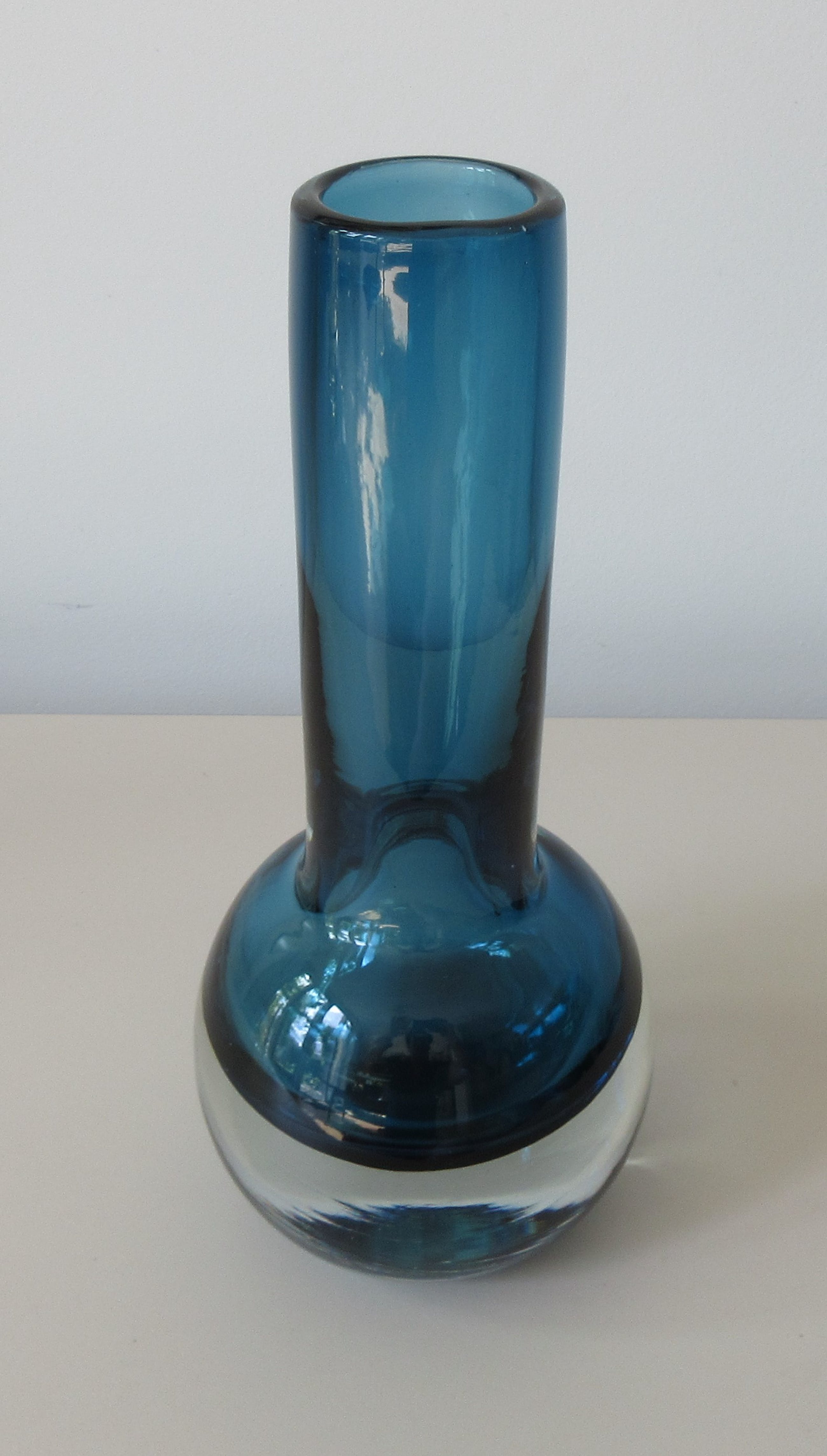Twee dikwandige rookblauwe glazen discus en schoorsteen vaas. Hand geblazen. Beide in in perfecte conditie, ook geen spoor van (kalk)aanslag. Niet gemerkt wel voorzien van een gepolijst pontil merk.