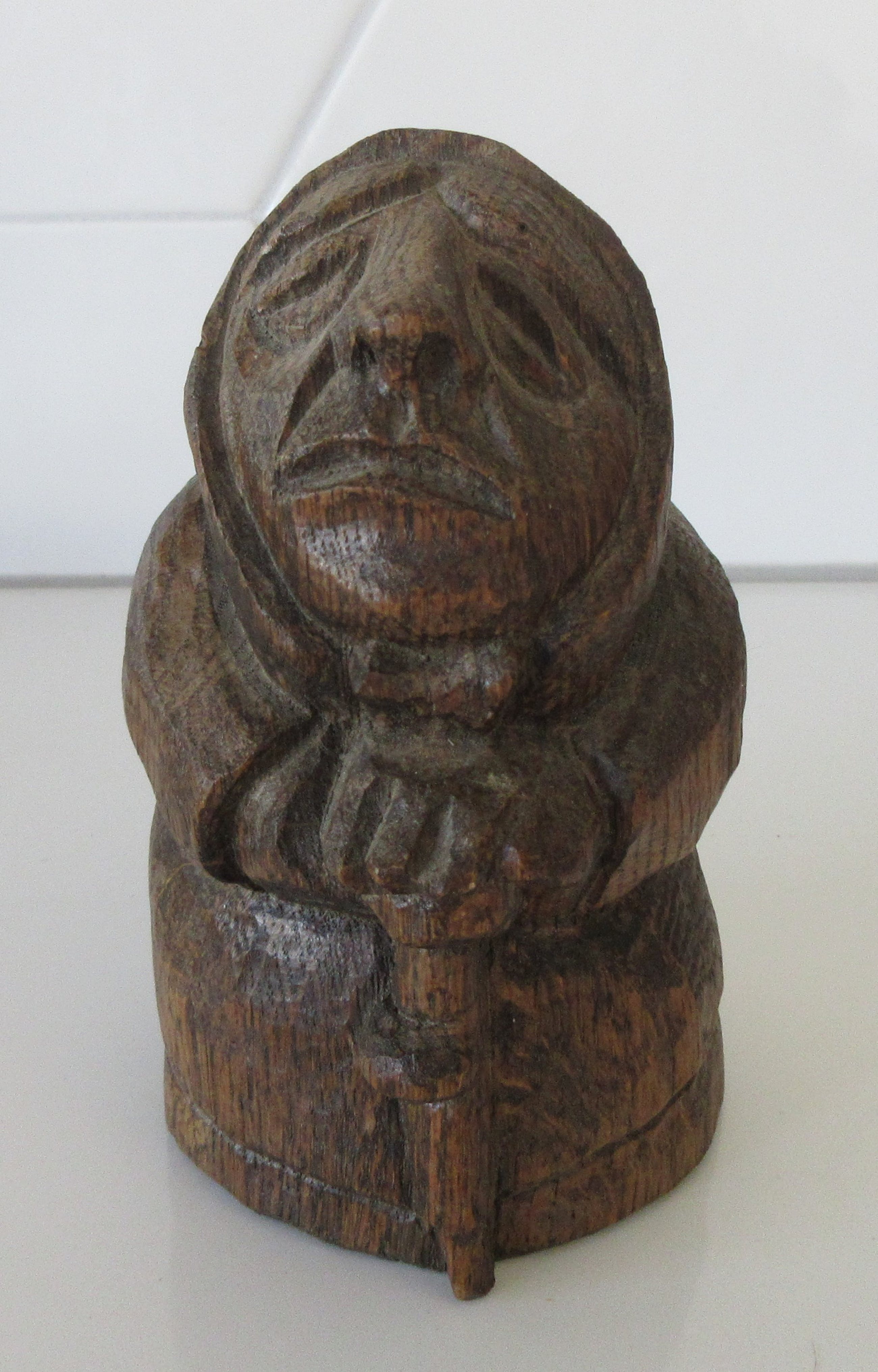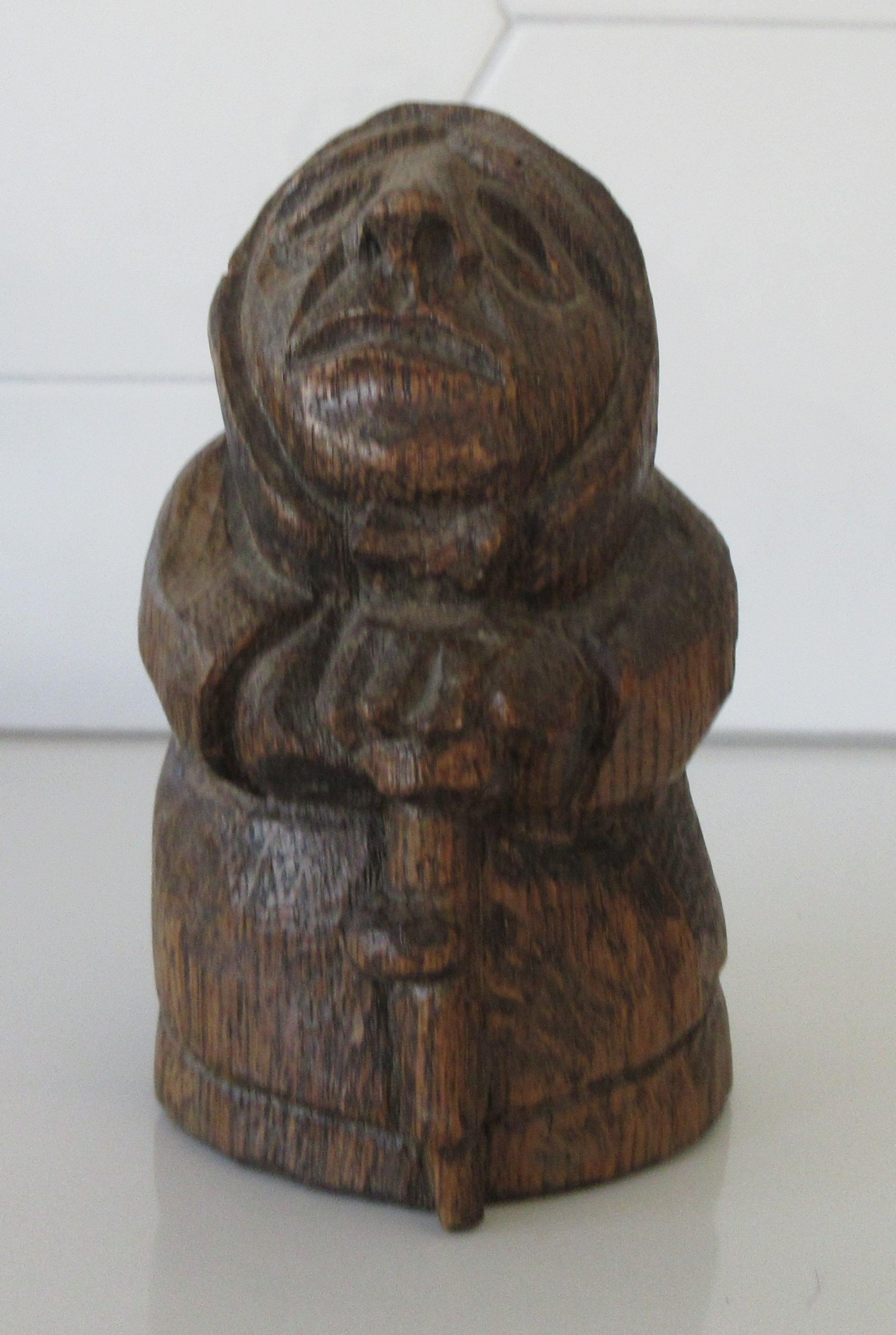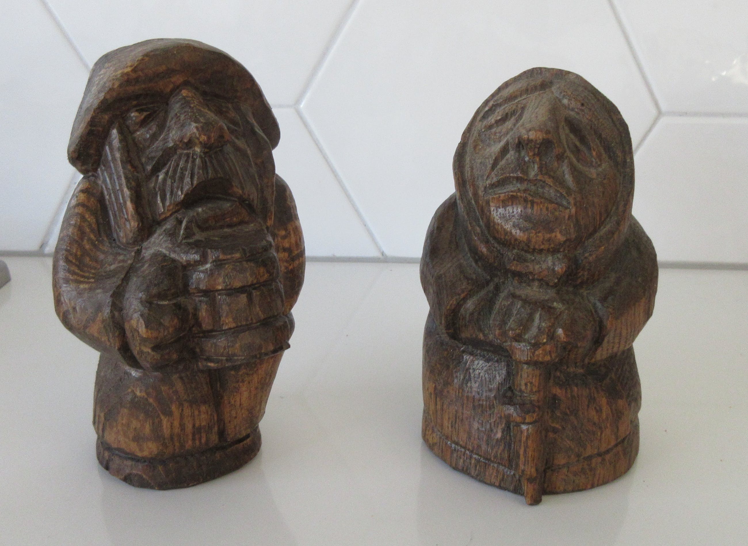 Twee handgesneden eiken houten figuurtjes van een (kabouter) mannetje met een pint bier in zijn hand en een (kabouter) vrouwtje met wandelstok. Redelijk goede kwaliteit snijwerk en mooie mimiek op de gezichten van de figuurtjes. Waarschijnlijk van Poolse of Russische makelij. Het mannetje is aan de onderzijde gesigneerd; K. Wotazyk of iets dergelijks en het vrouwtje is aan de achterzijde voorzien van een monogram. Beide in prima conditie.