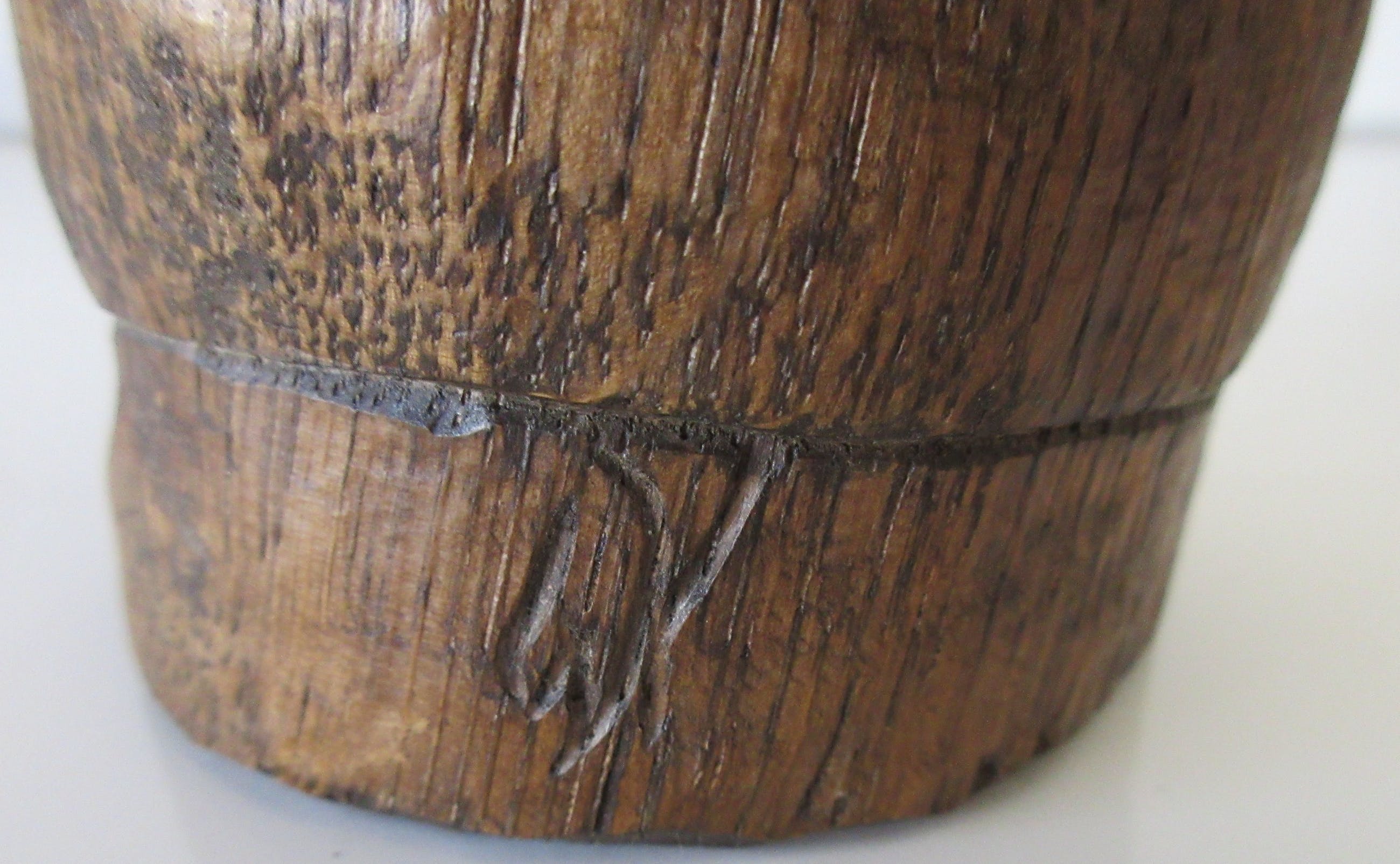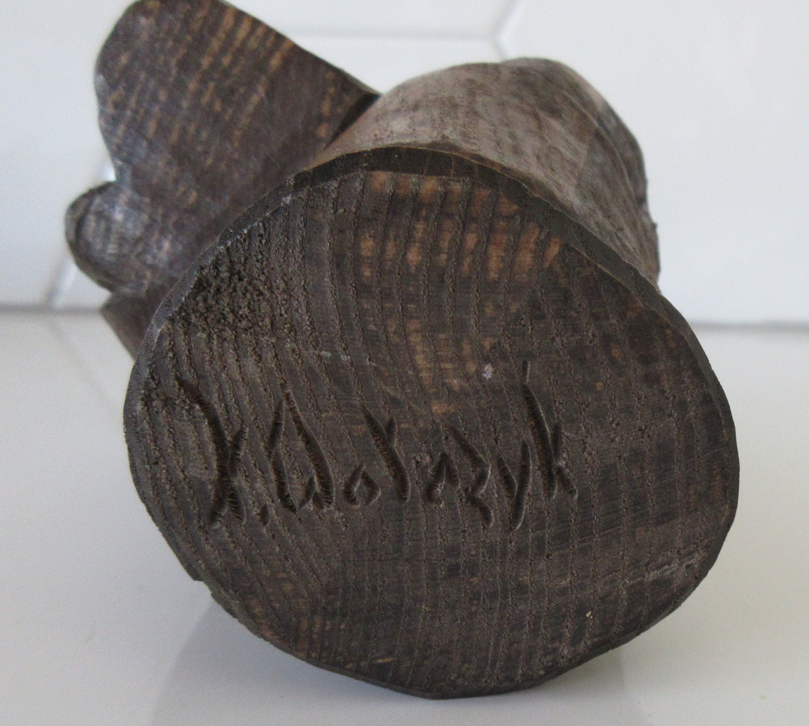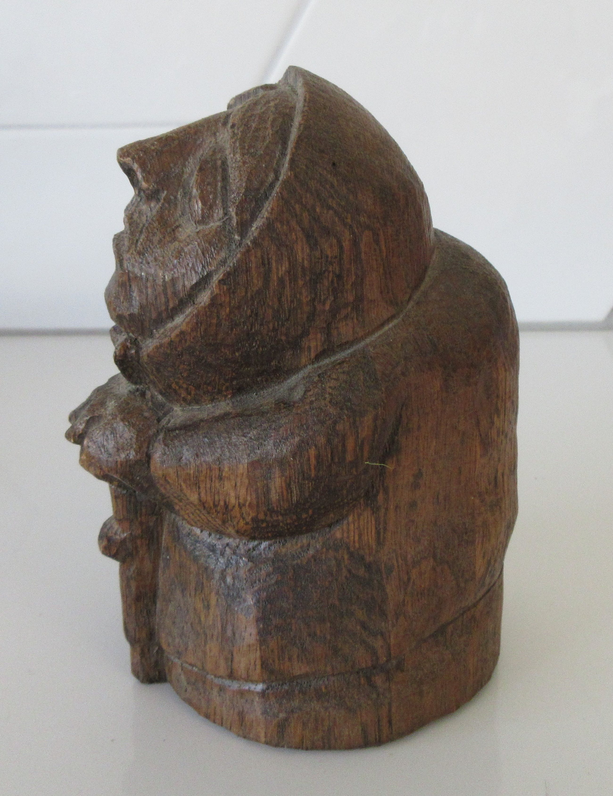 Twee handgesneden eiken houten figuurtjes van een (kabouter) mannetje met een pint bier in zijn hand en een (kabouter) vrouwtje met wandelstok. Redelijk goede kwaliteit snijwerk en mooie mimiek op de gezichten van de figuurtjes. Waarschijnlijk van Poolse of Russische makelij. Het mannetje is aan de onderzijde gesigneerd; K. Wotazyk of iets dergelijks en het vrouwtje is aan de achterzijde voorzien van een monogram. Beide in prima conditie.