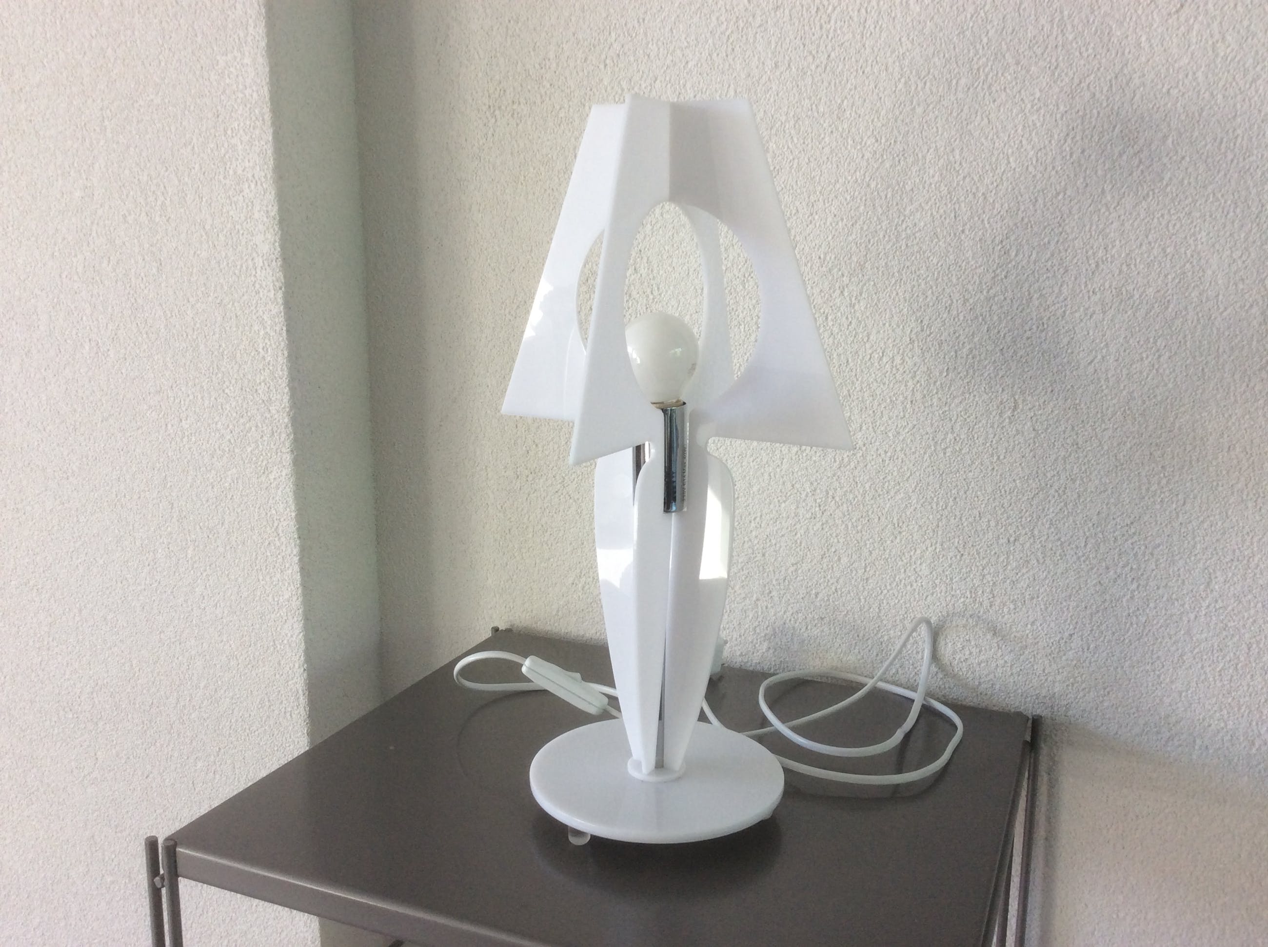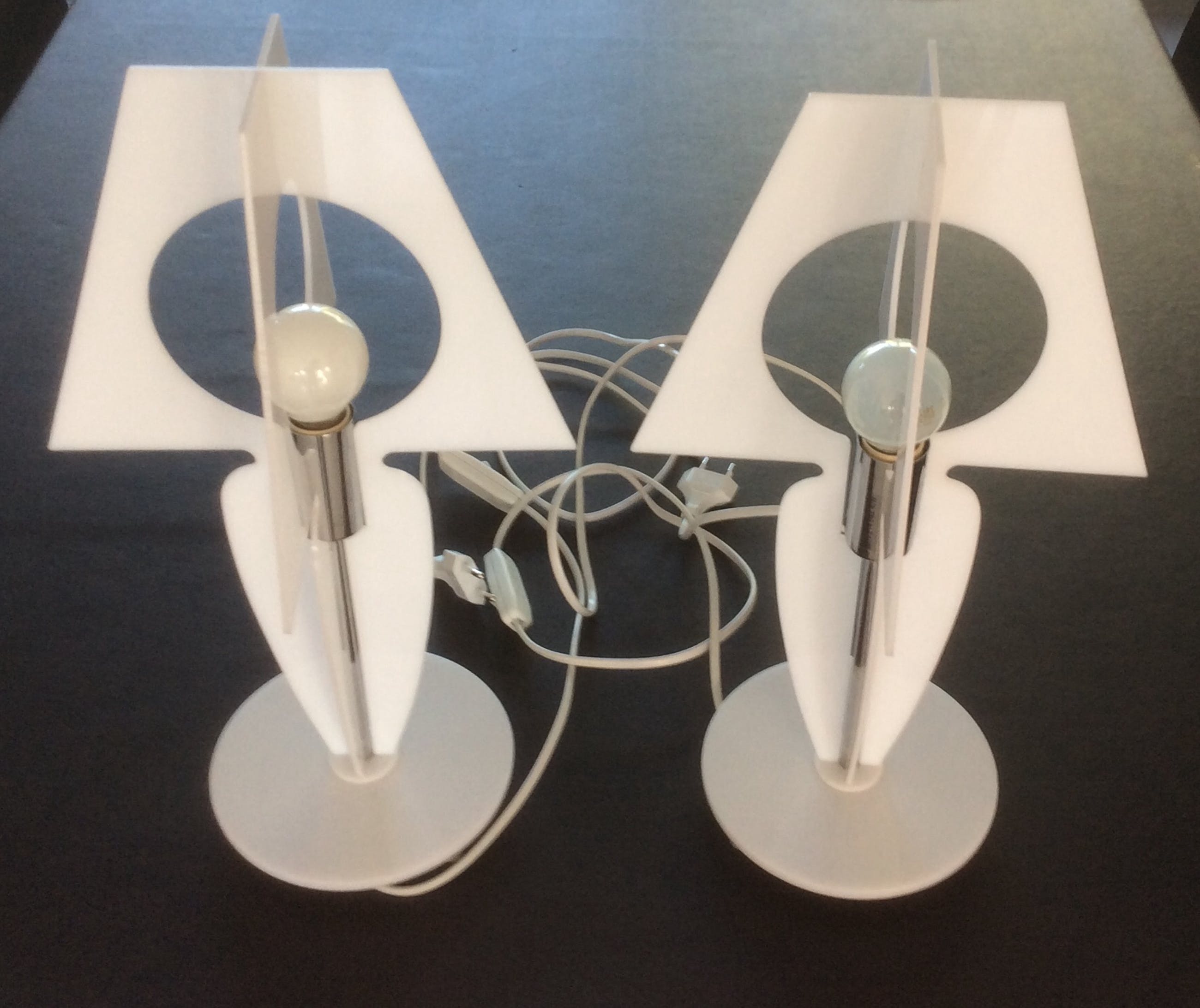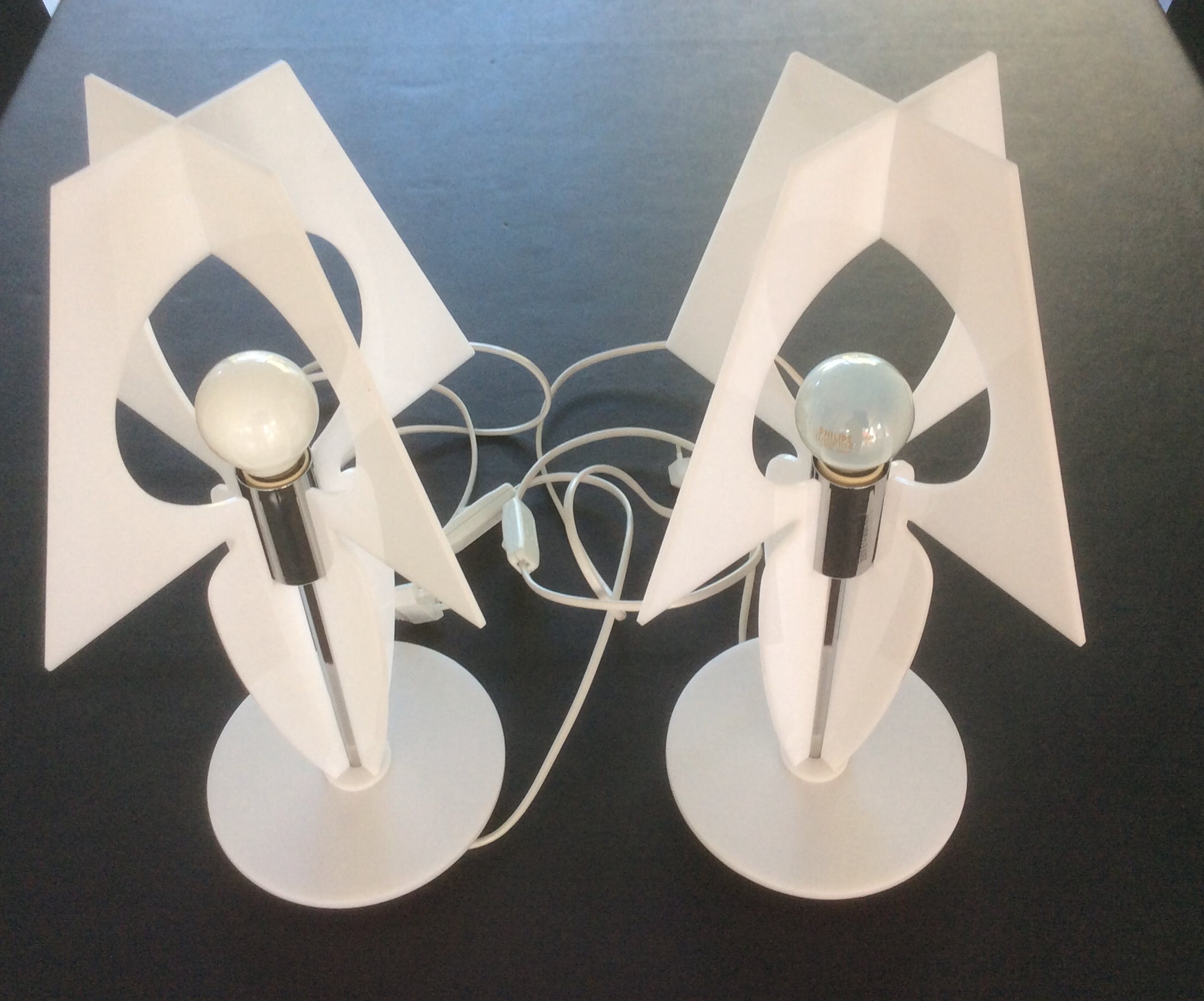 Twee identieke, goed werkende design tafellampen. Afkomstig van Willemse Verlichting, lid van de Lichtgroep Nederland. De witte kunststof is vrij van krasjes. De lampen zijn 40 cm hoog en 23 cm breed.