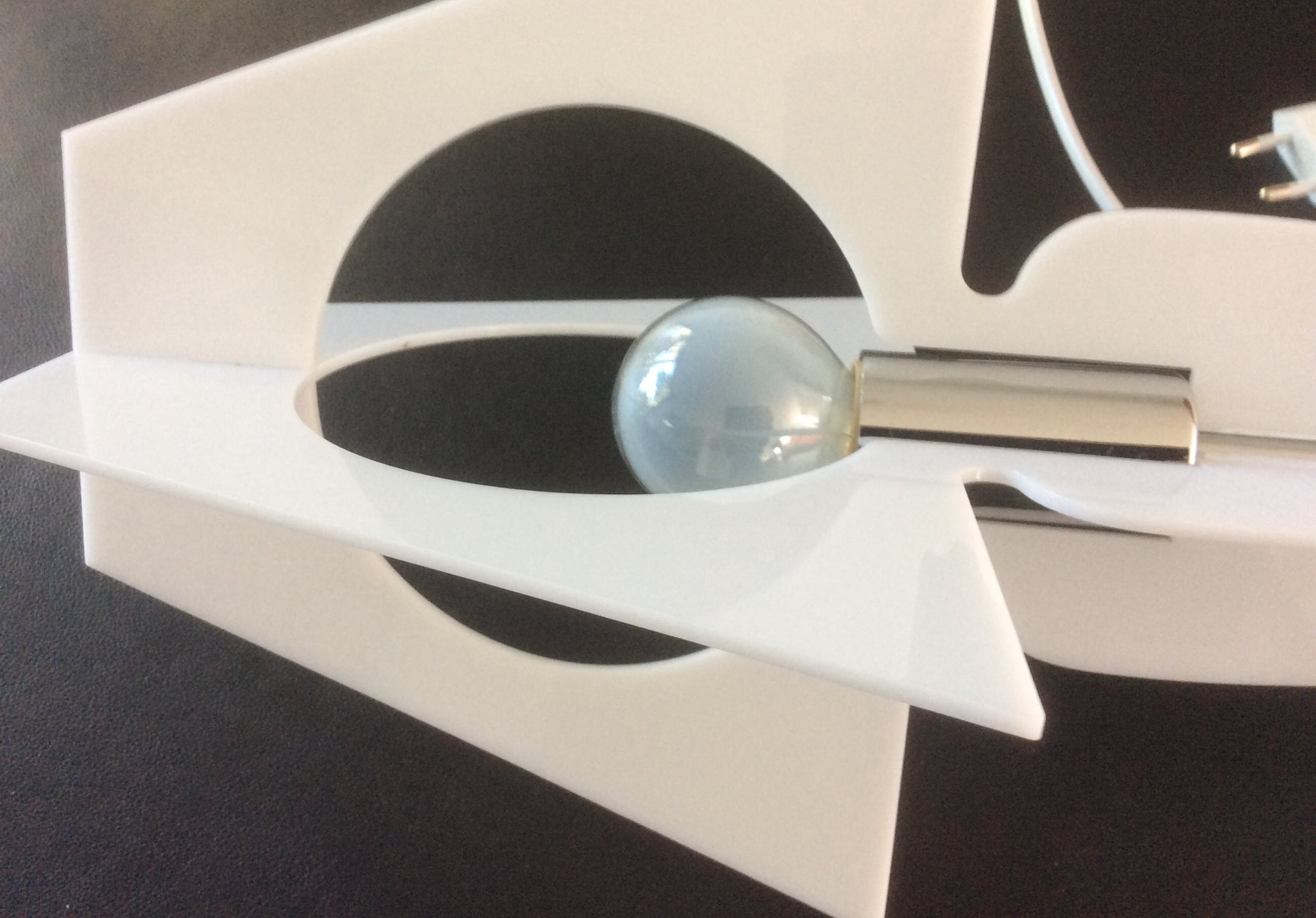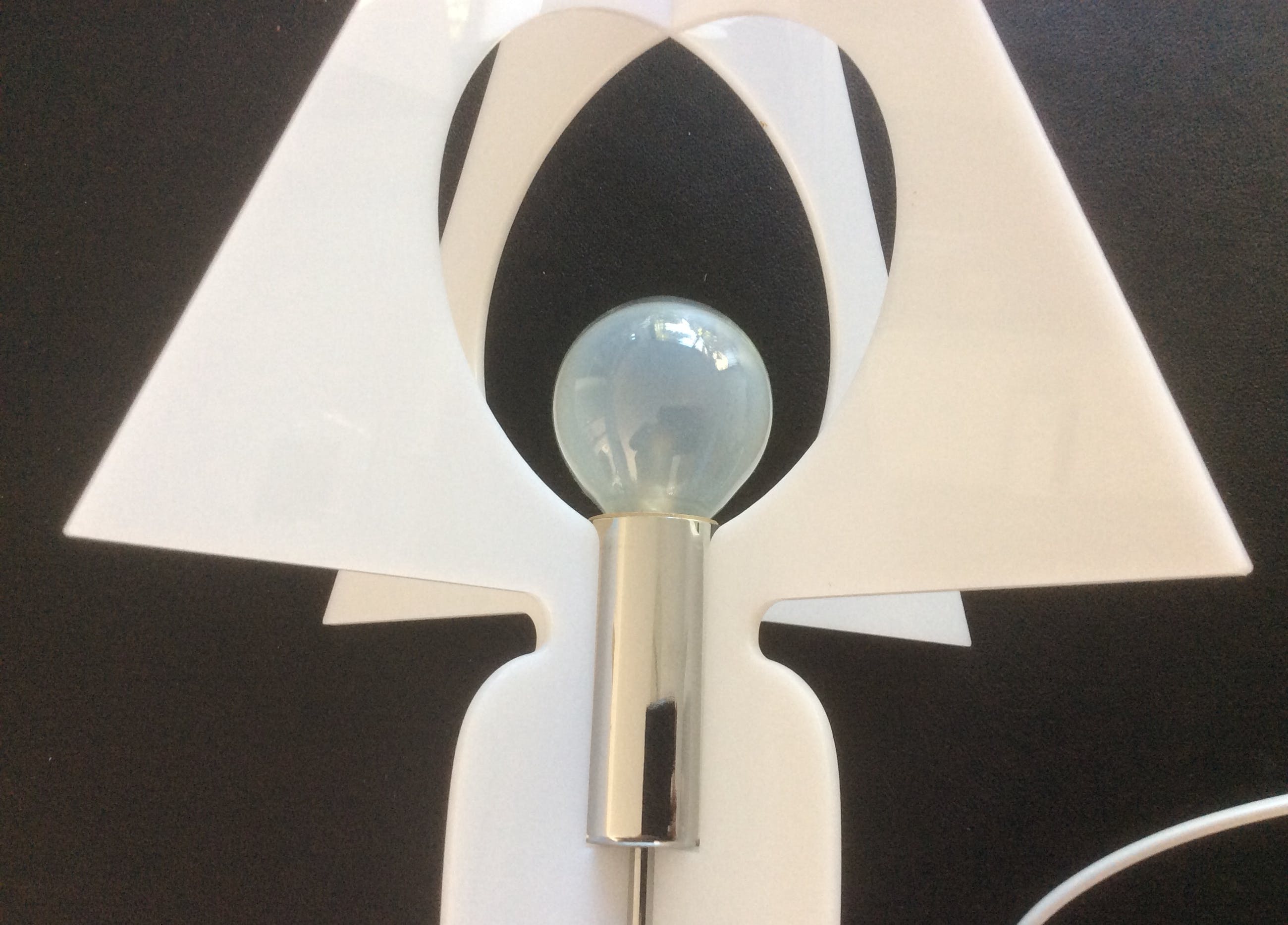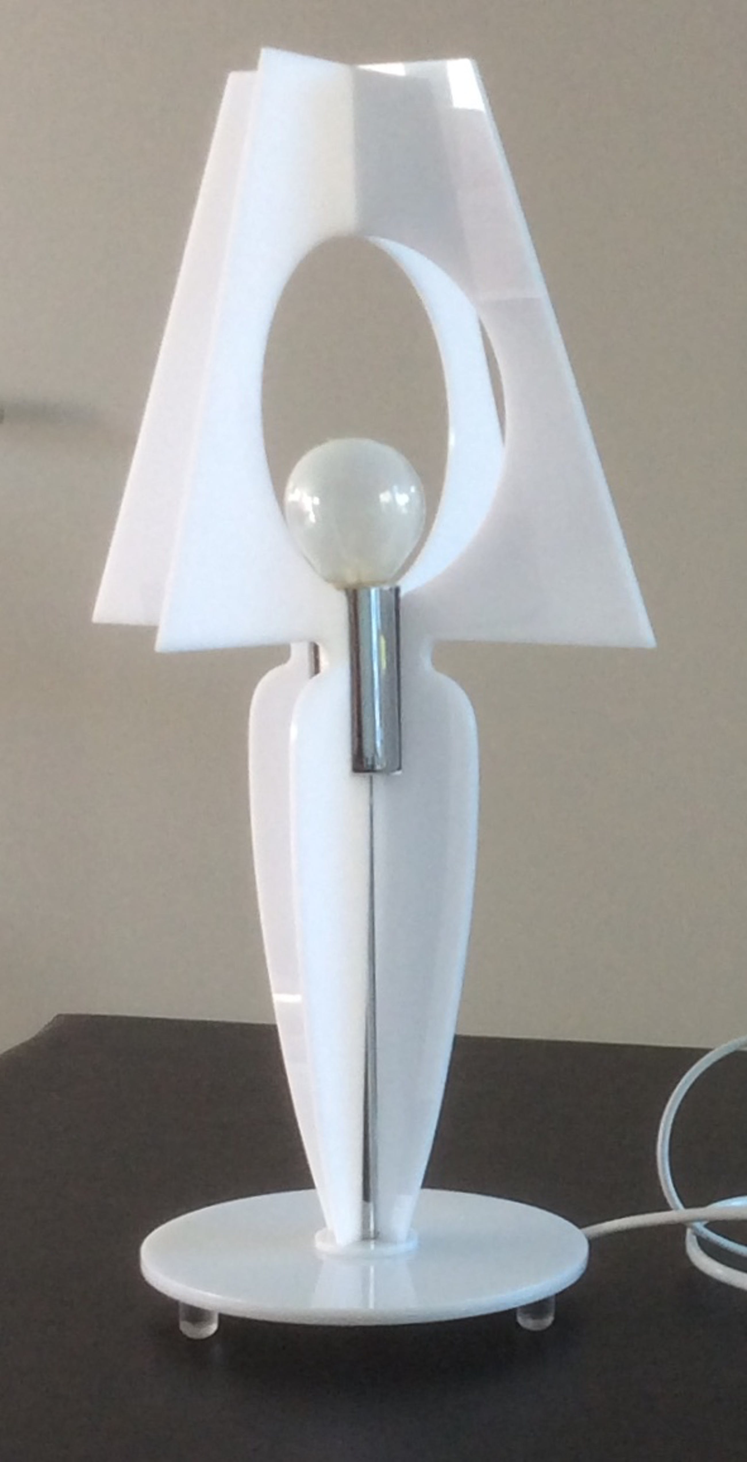 Twee identieke, goed werkende design tafellampen. Afkomstig van Willemse Verlichting, lid van de Lichtgroep Nederland. De witte kunststof is vrij van krasjes. De lampen zijn 40 cm hoog en 23 cm breed.