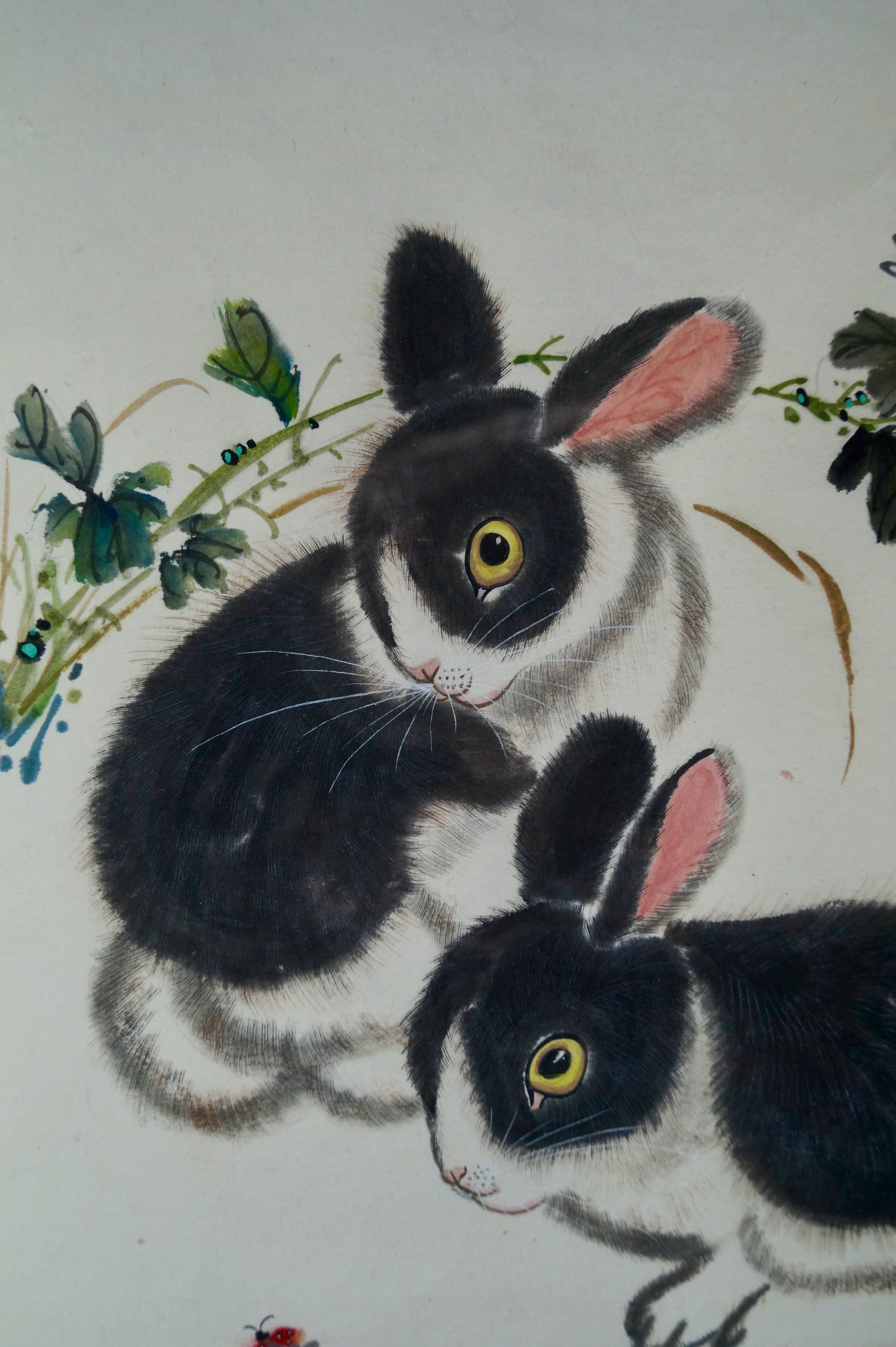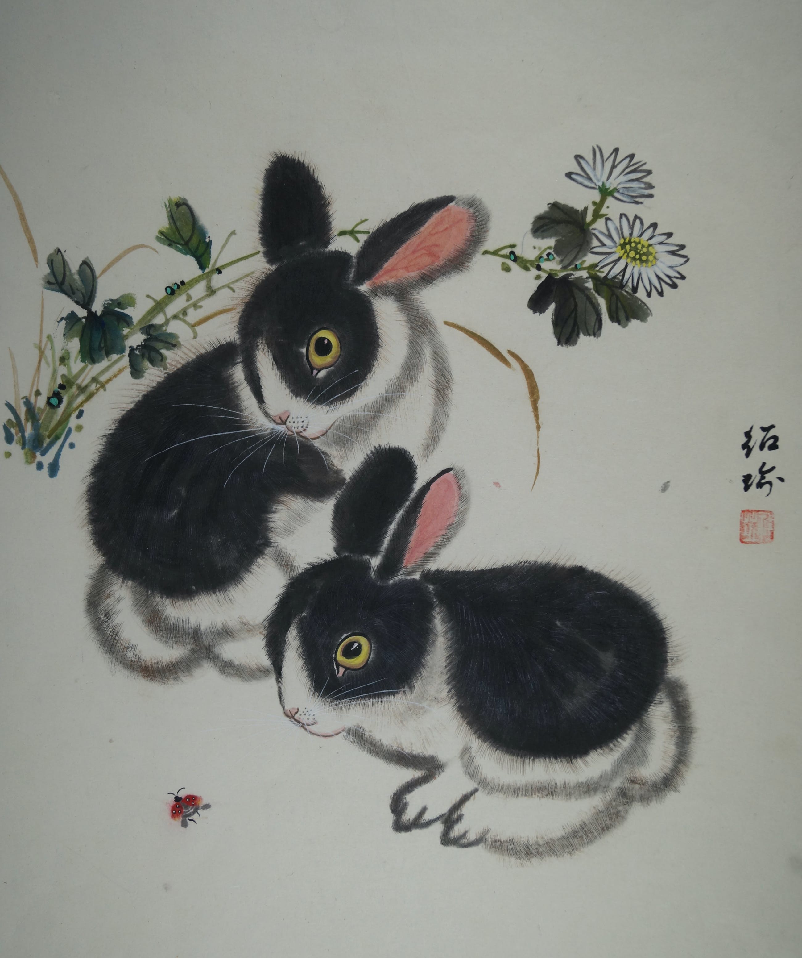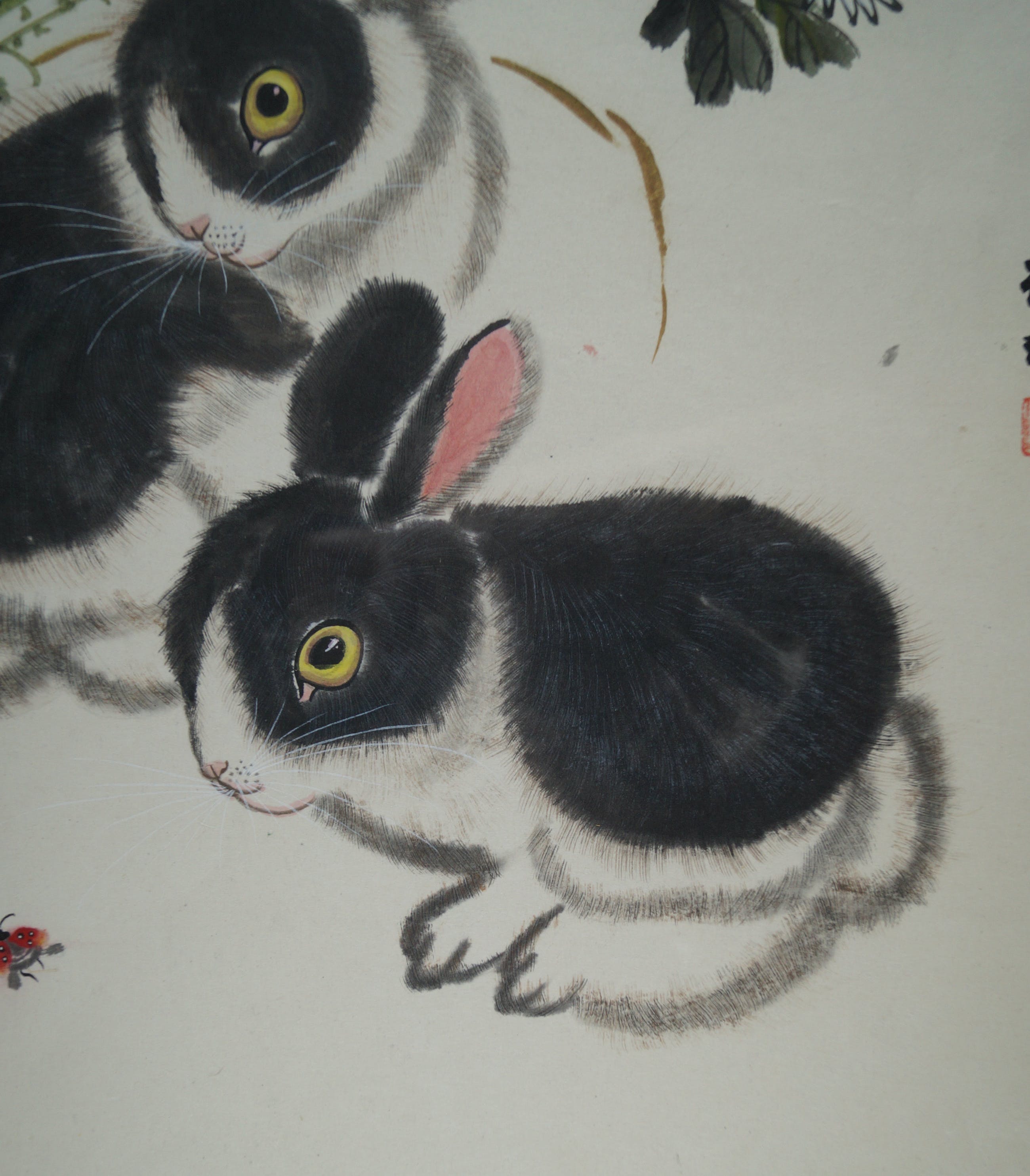 mooie aquarel van twee konijntjes gesigneerd en gestempeld in sierlijke Japanse karakters, die helaas voor Europeanen niet te ontcijferen zijn.