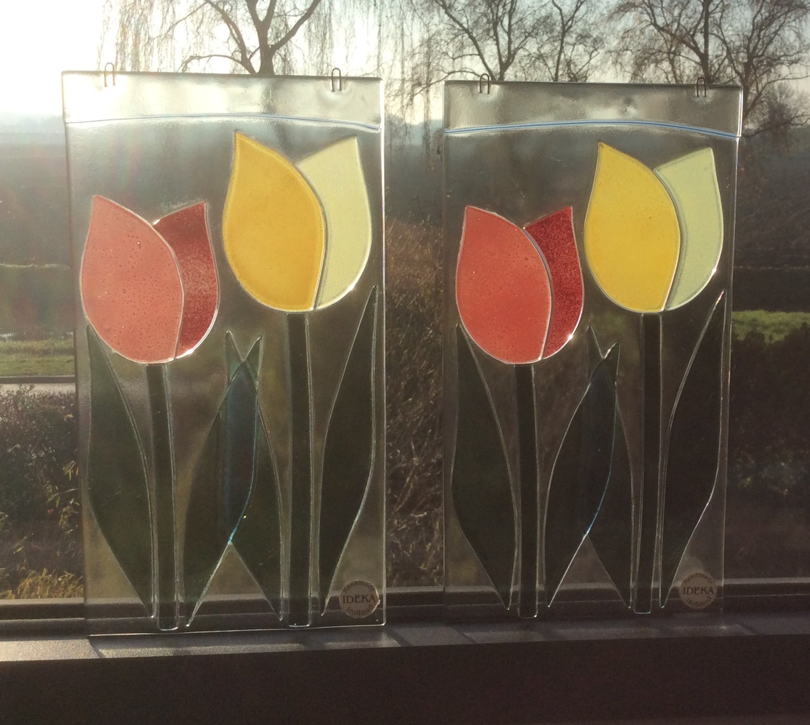 De kleurige tulpen zijn opgelegd (dubbelslag techniek). De originele sticker vermeldt: Handmade IDEKA Holland.