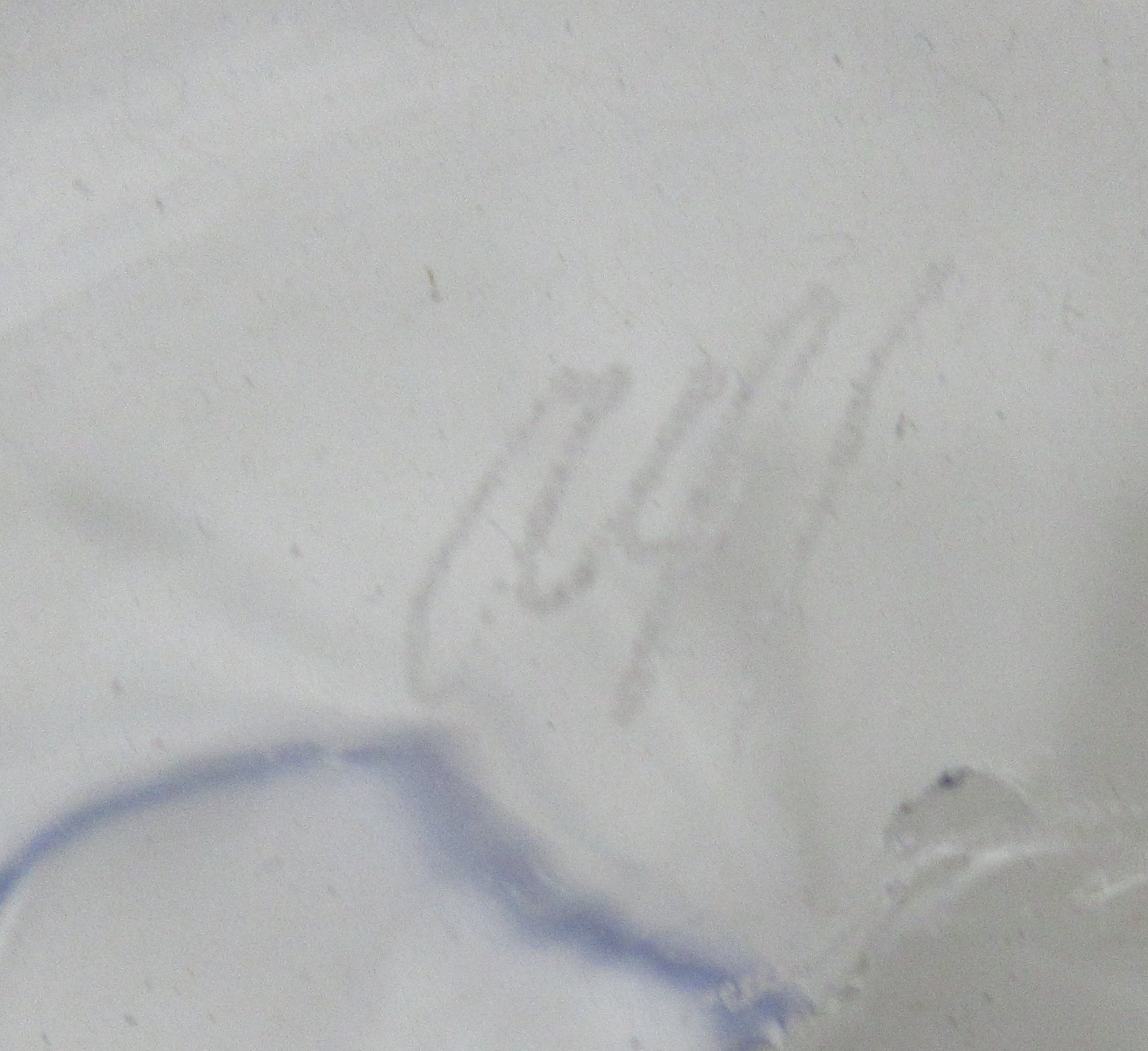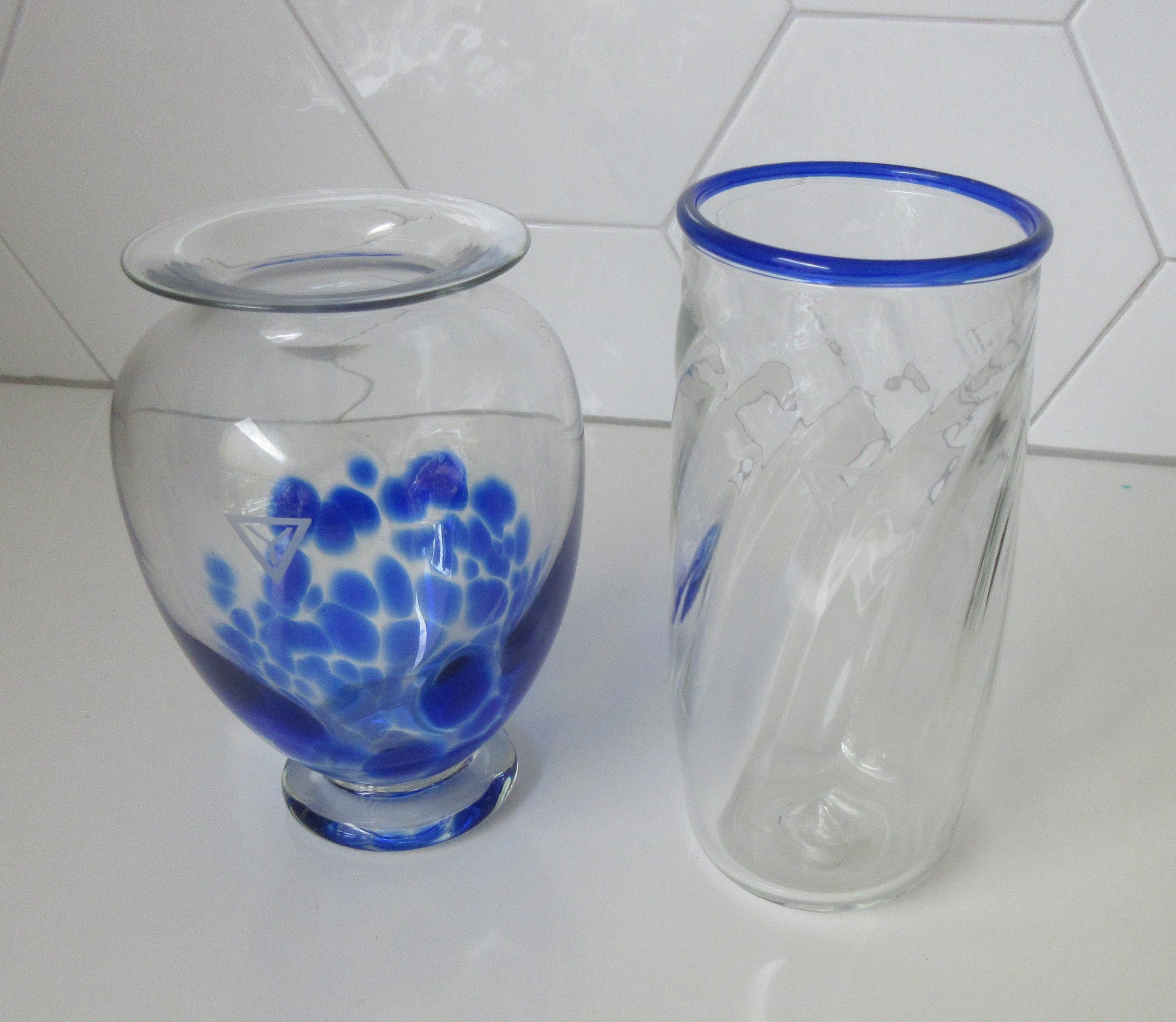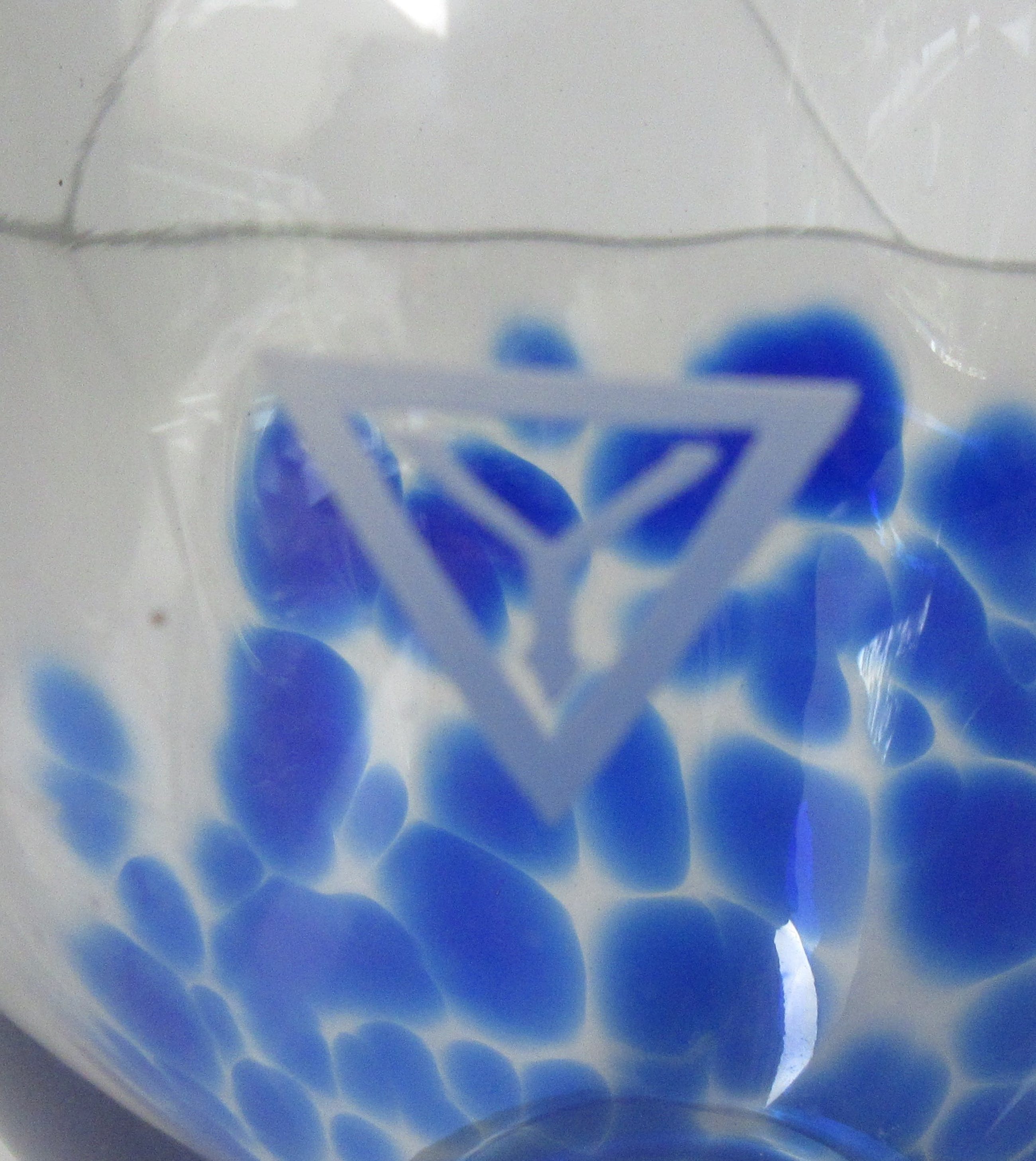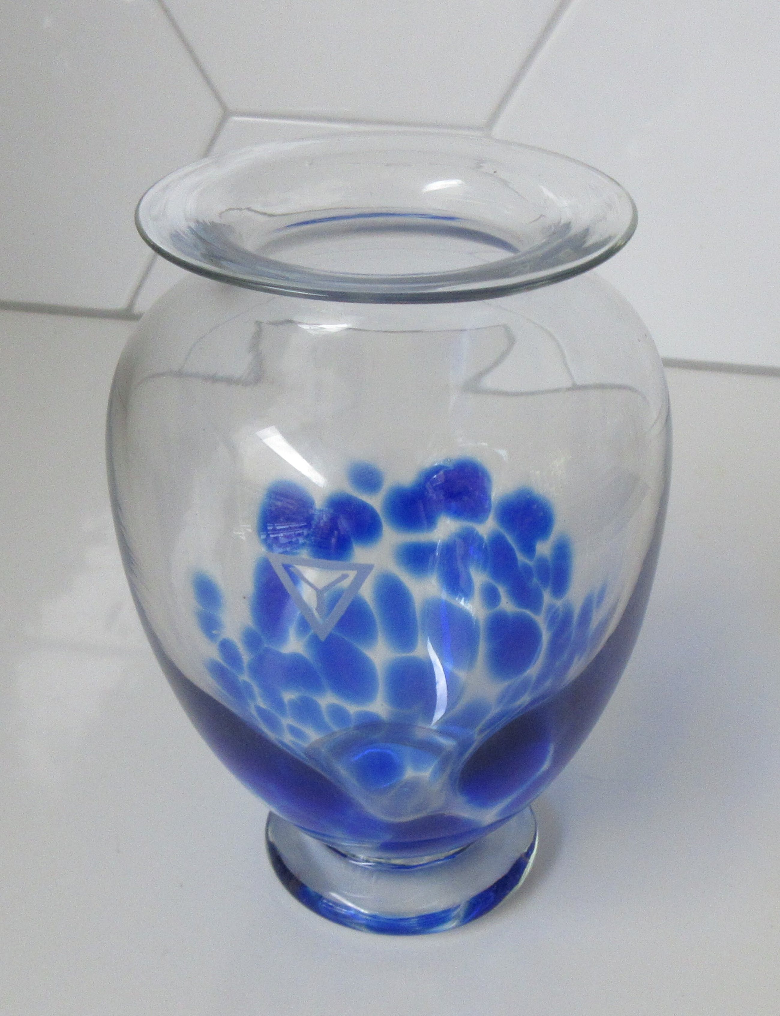 Twee mooie Deense Blanke en Kobalt blauwe Studio glazen vazen. Aan de onderzijde met de hand gesigneerd met een diamantpen. De signatuur is onbekend, maar er staat waarschijnlijk Alf. De vazen lijken bij elkaar te horen of uit een serie te zijn omdat ze dezelfde kleuren hebben, maar aan de voorzijde hebben de beide vazen een ingeslepen symbool of logo. Het heeft iets weg van een symbool van de Vrijmetselaars. Beide in onbeschadigde conditie.