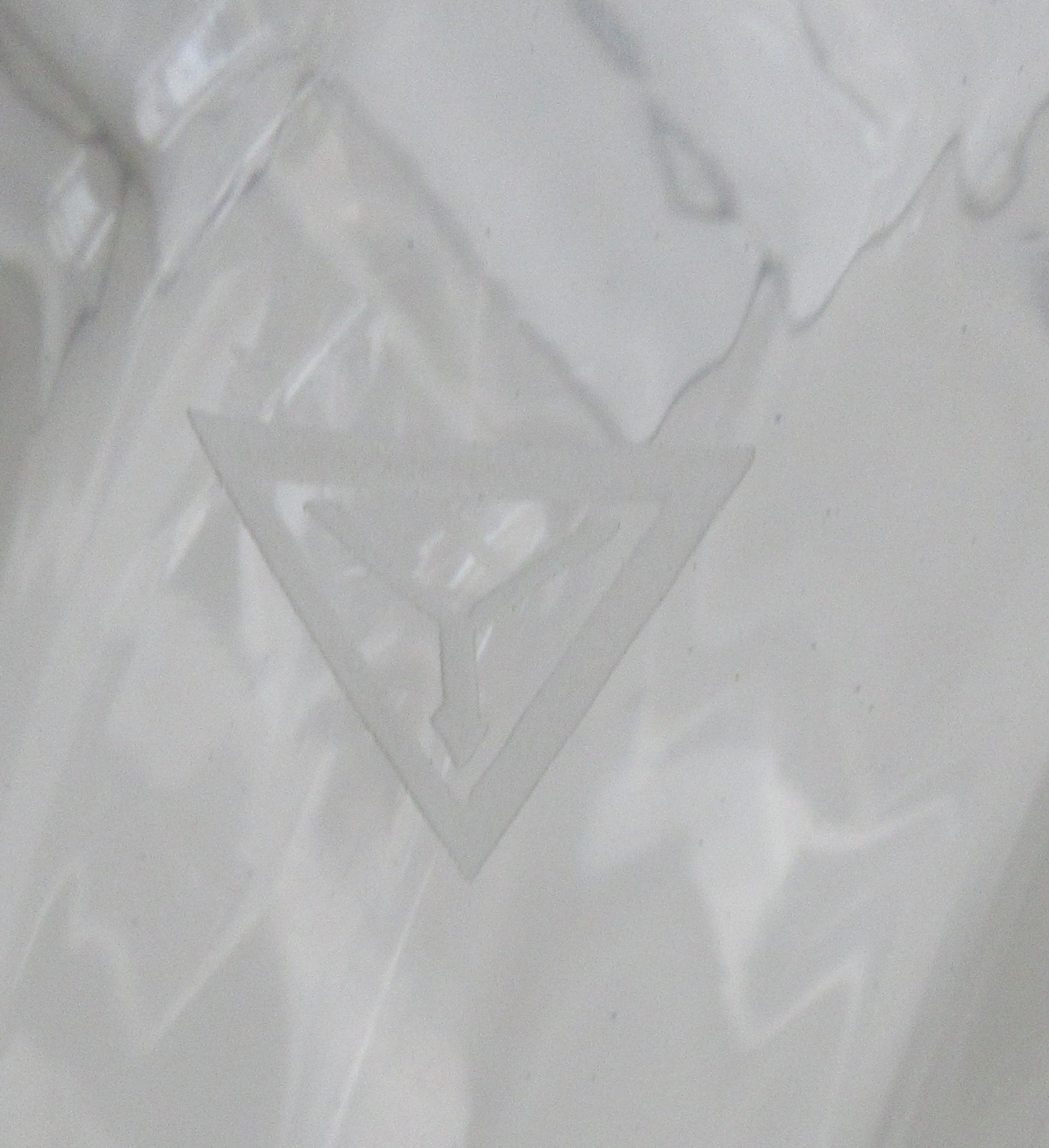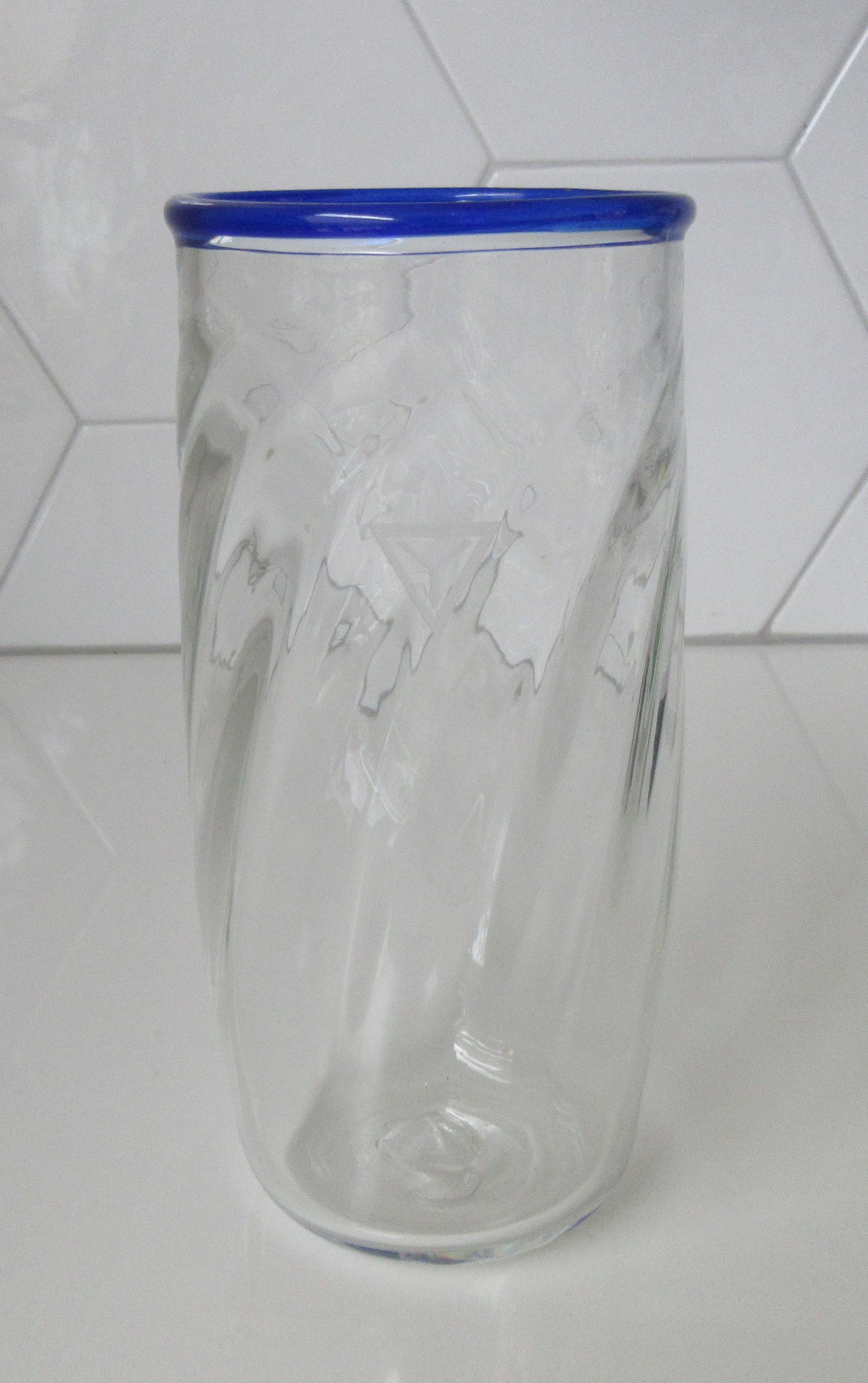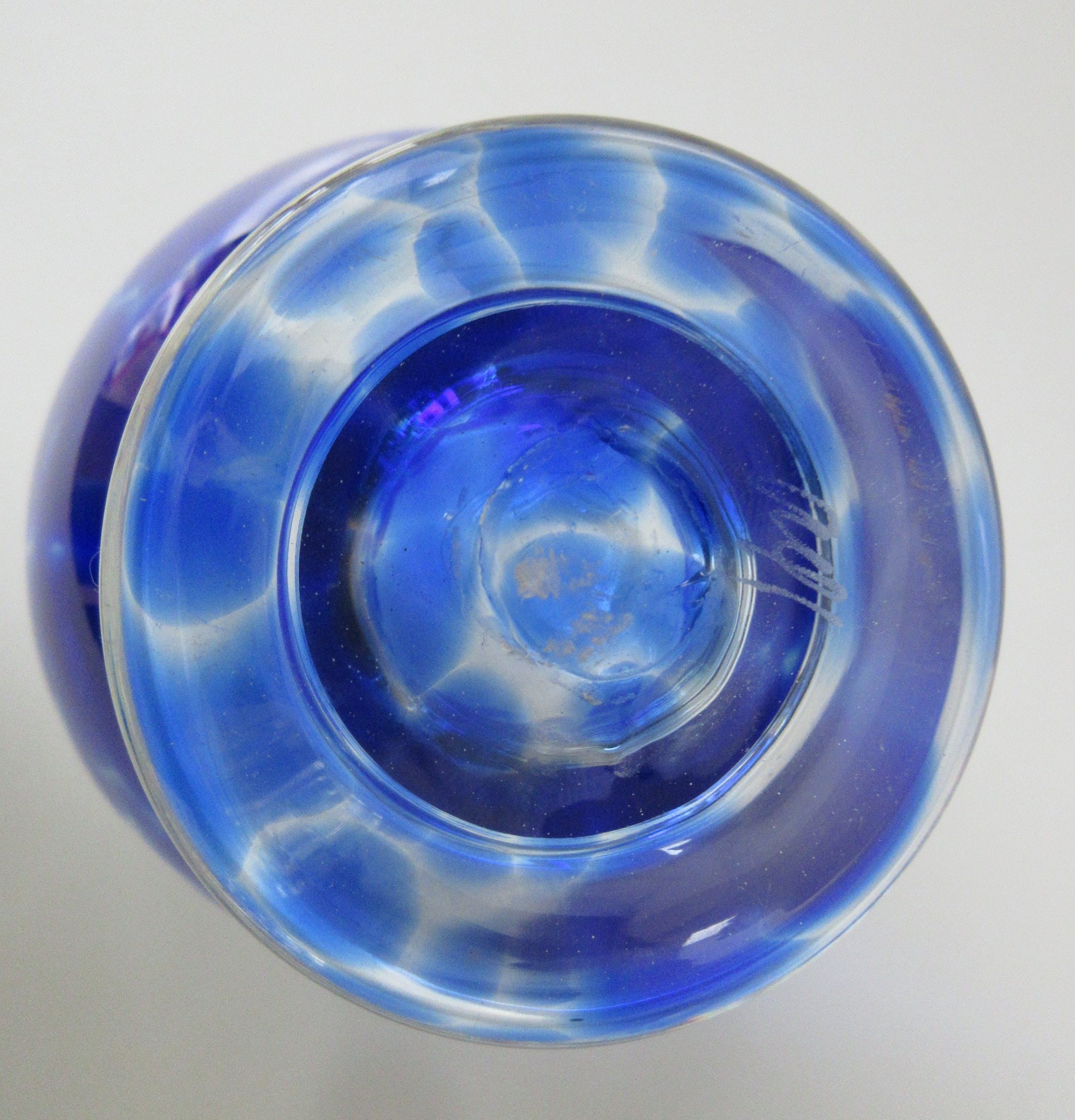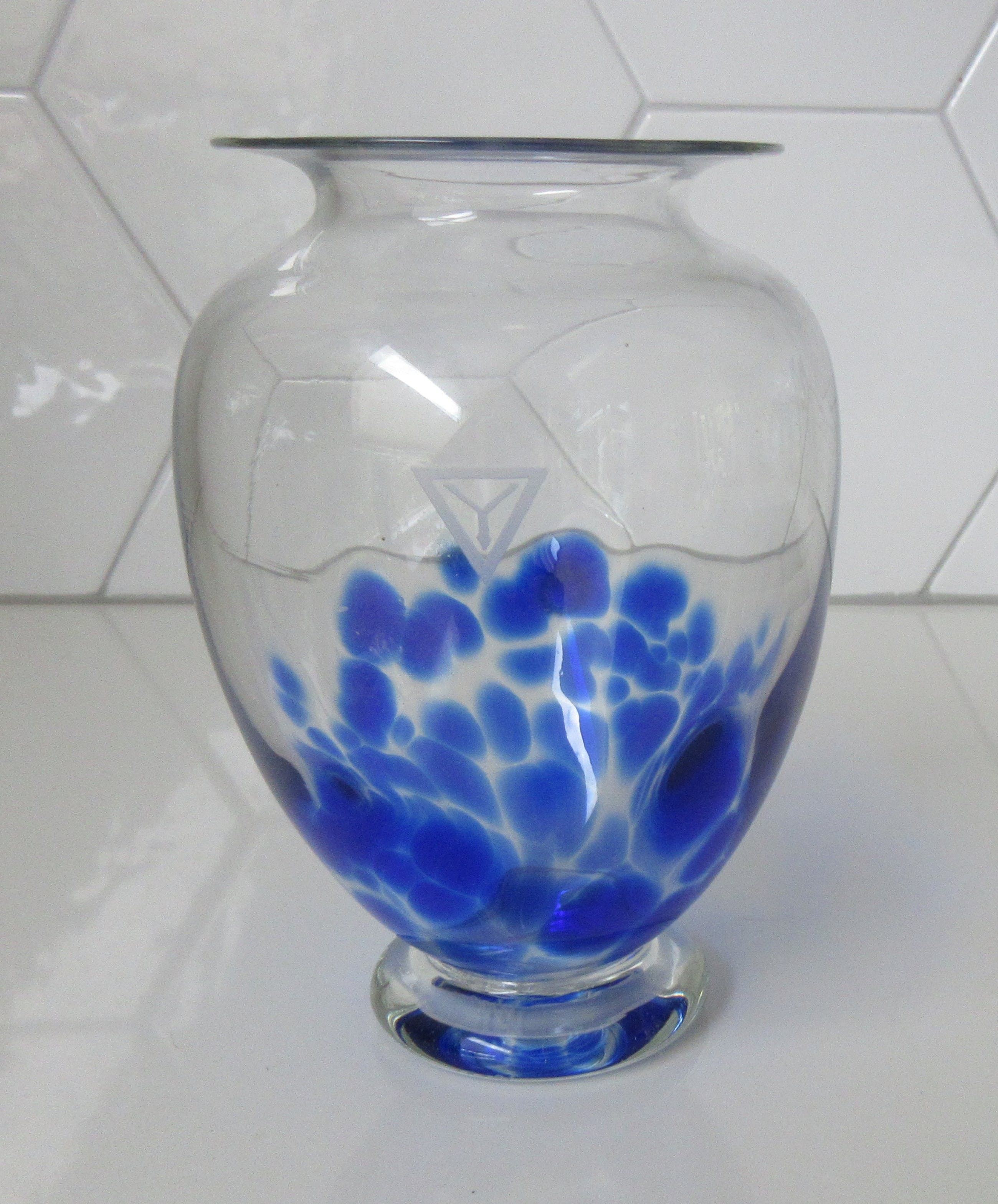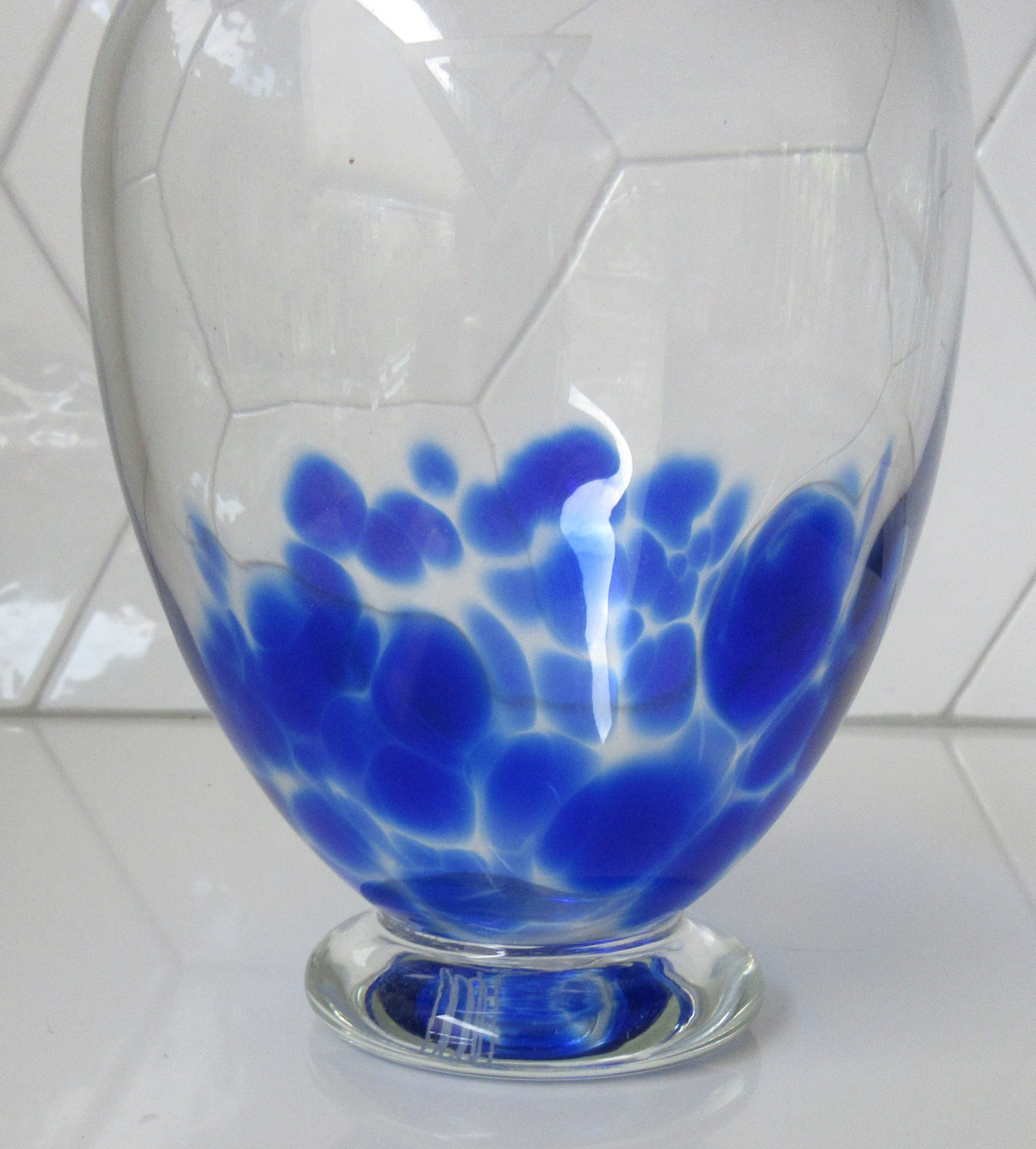 Twee mooie Deense Blanke en Kobalt blauwe Studio glazen vazen. Aan de onderzijde met de hand gesigneerd met een diamantpen. De signatuur is onbekend, maar er staat waarschijnlijk Alf. De vazen lijken bij elkaar te horen of uit een serie te zijn omdat ze dezelfde kleuren hebben, maar aan de voorzijde hebben de beide vazen een ingeslepen symbool of logo. Het heeft iets weg van een symbool van de Vrijmetselaars. Beide in onbeschadigde conditie.