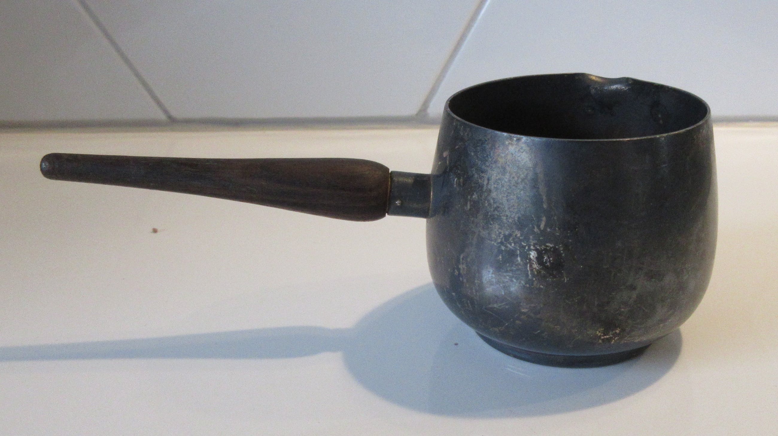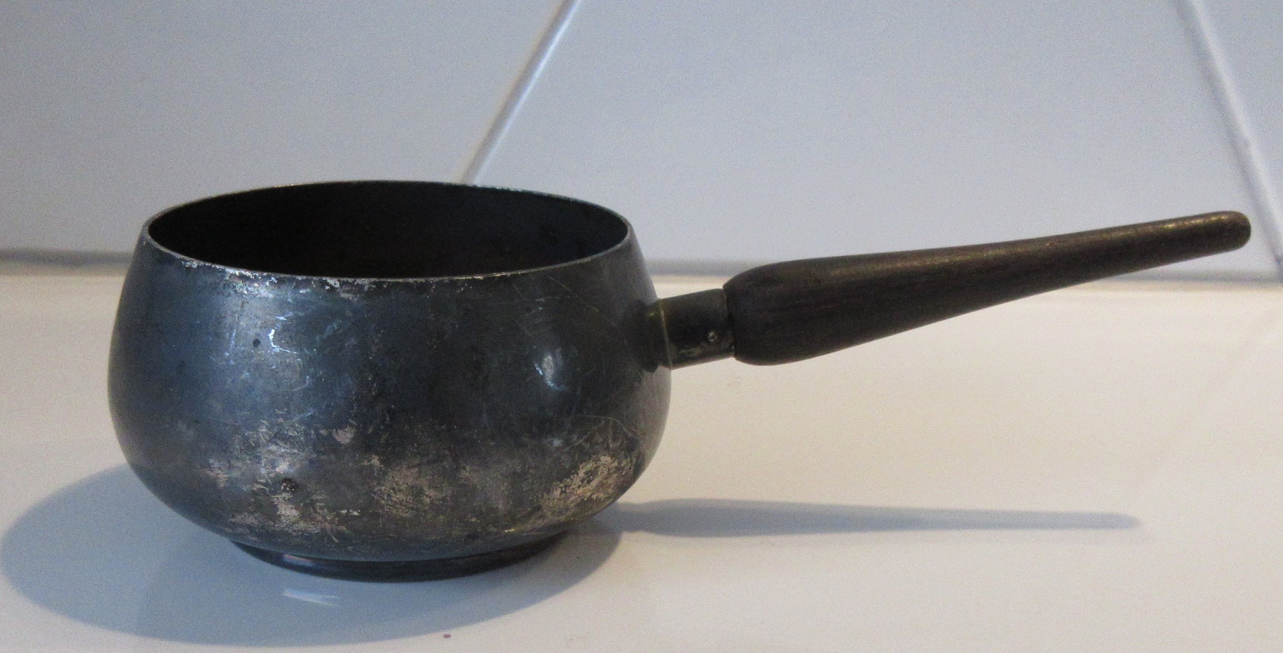 Twee verzilverde sauspannetjes met houten handvat - Keltum. In goede gebruikte conditie. Hebben wel wat aanslag. Voorzien van ingedrukt merk.