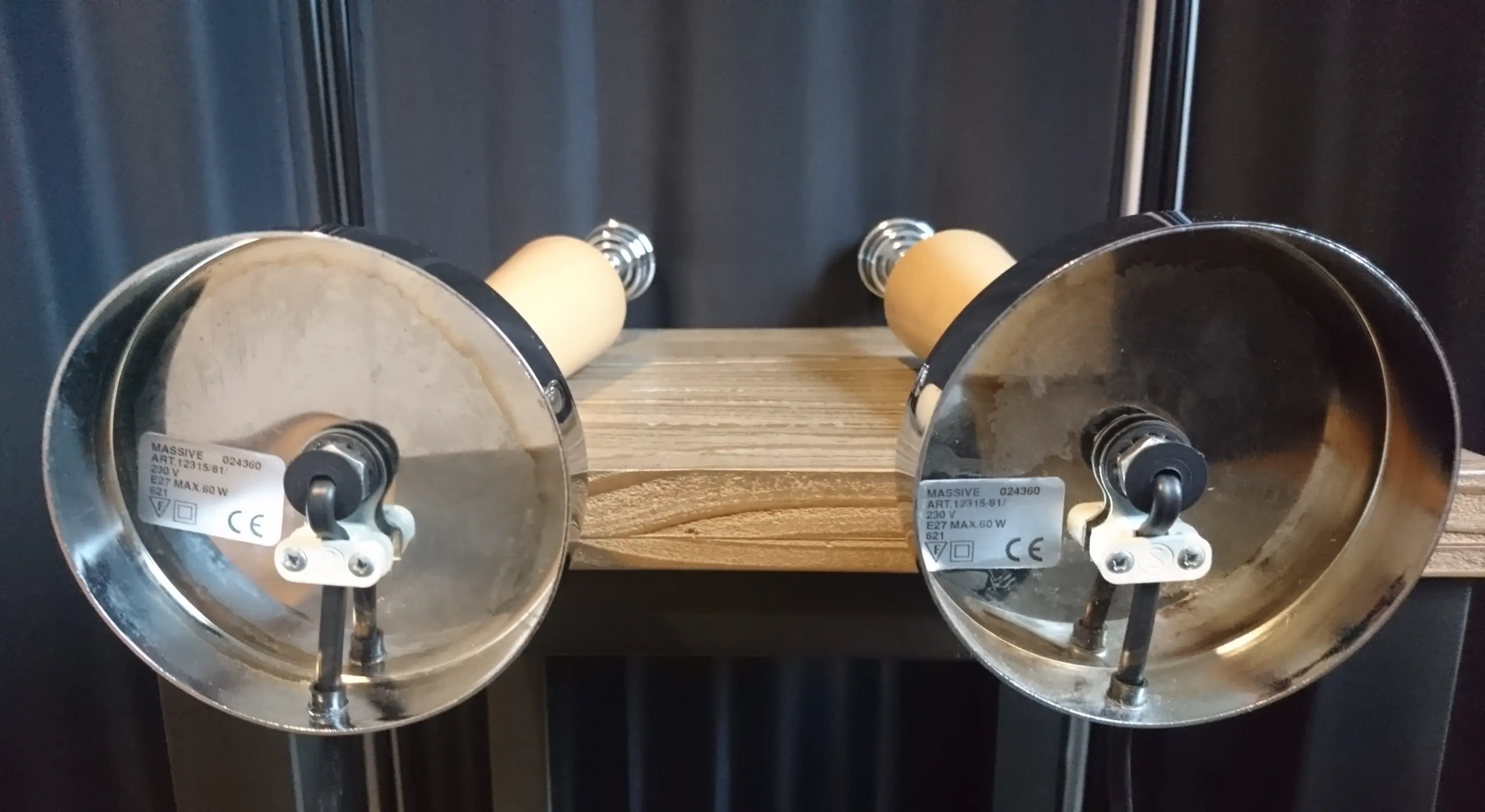 Twee vintage modernistische tafellampen/lampvoeten. Gemaakt van beukenhout en verchroomd staal. Worden aangeboden met de originele lampenkappen, maar twee nieuwe lampenkappen naar eigen smaak zouden zeker niet misstaan (één lampenkap is in redelijk staat, de ander heeft gebruikssporen/vouwen). De opgegeven maten zijn van de lampvoeten zonder kap.