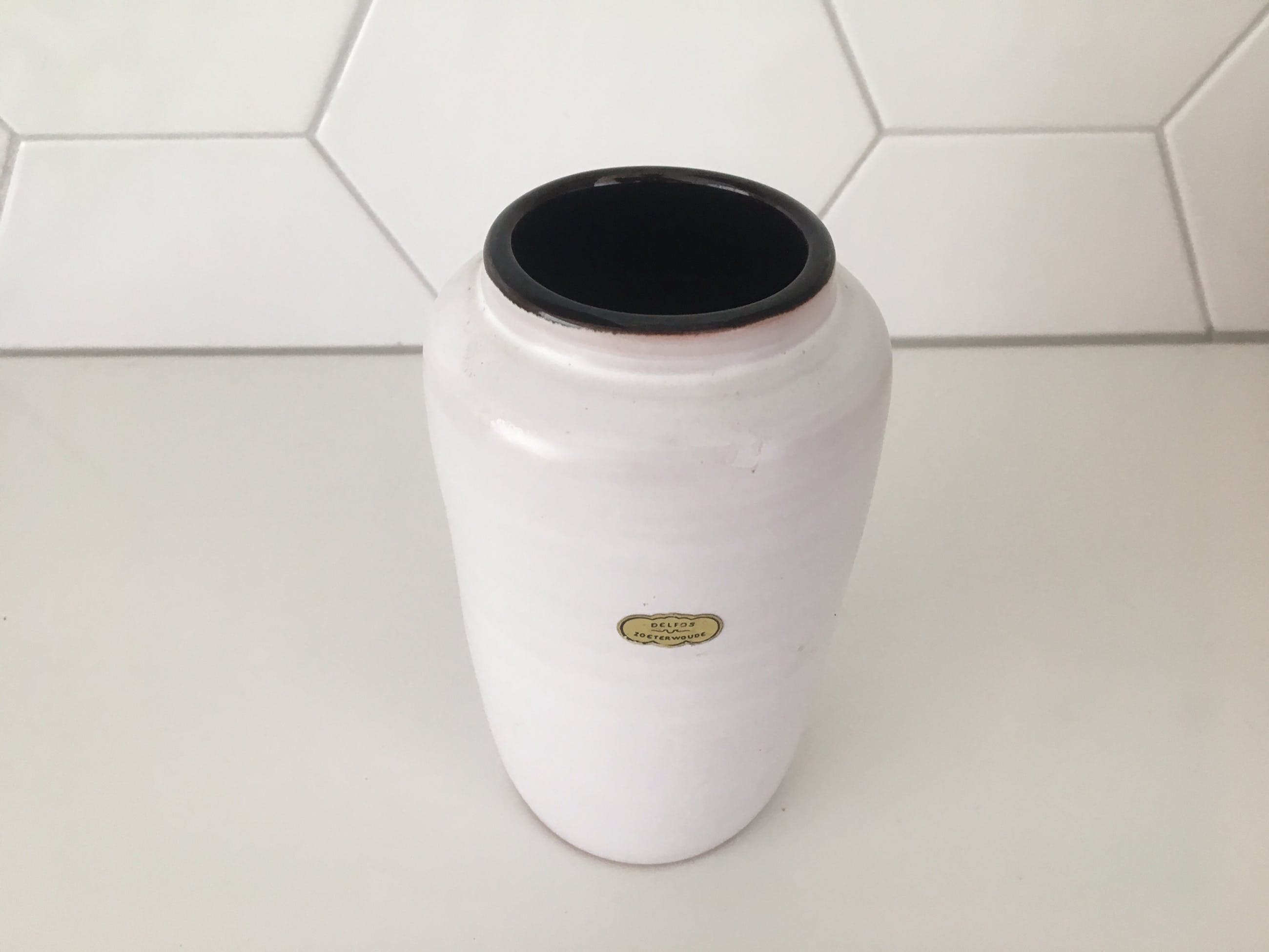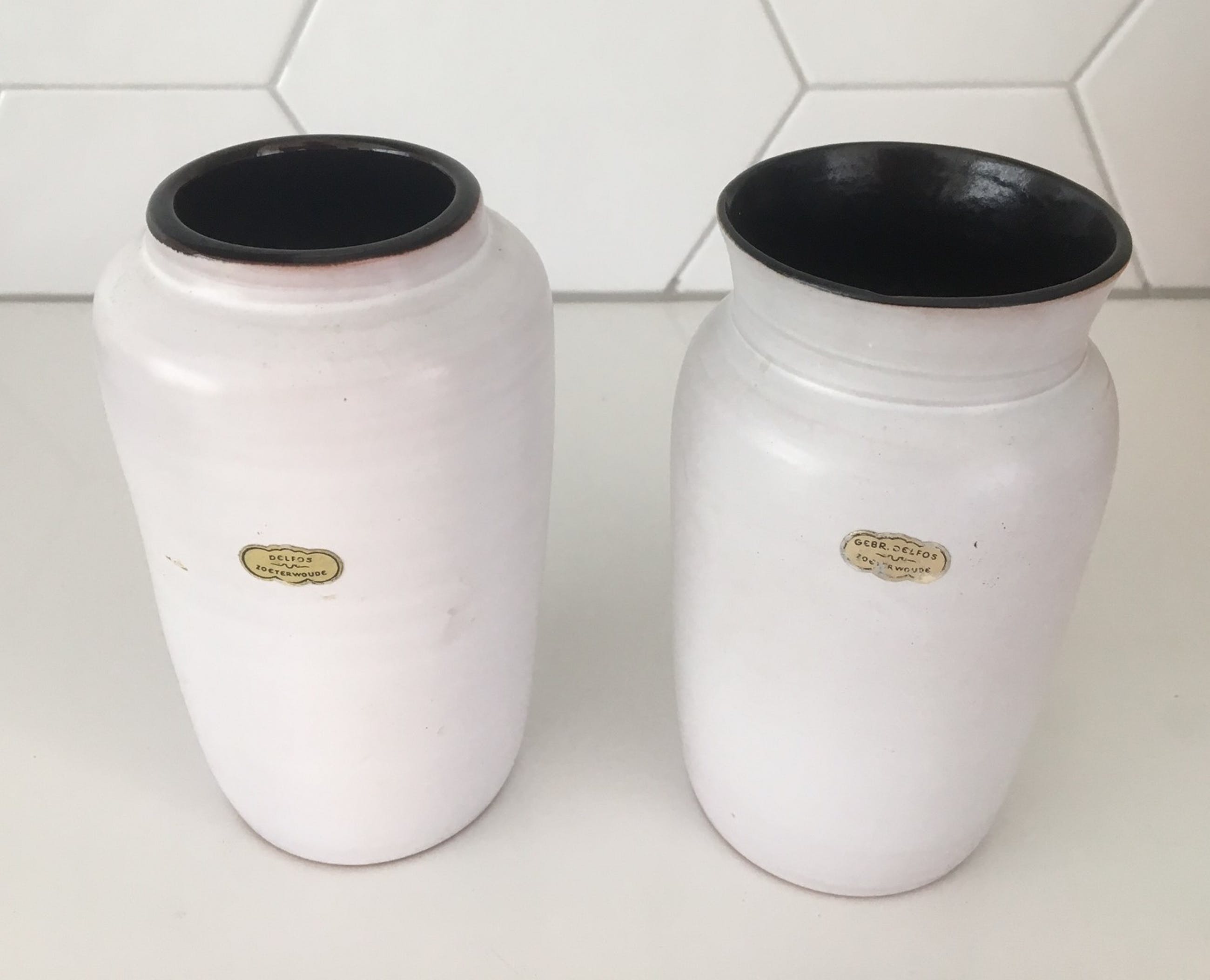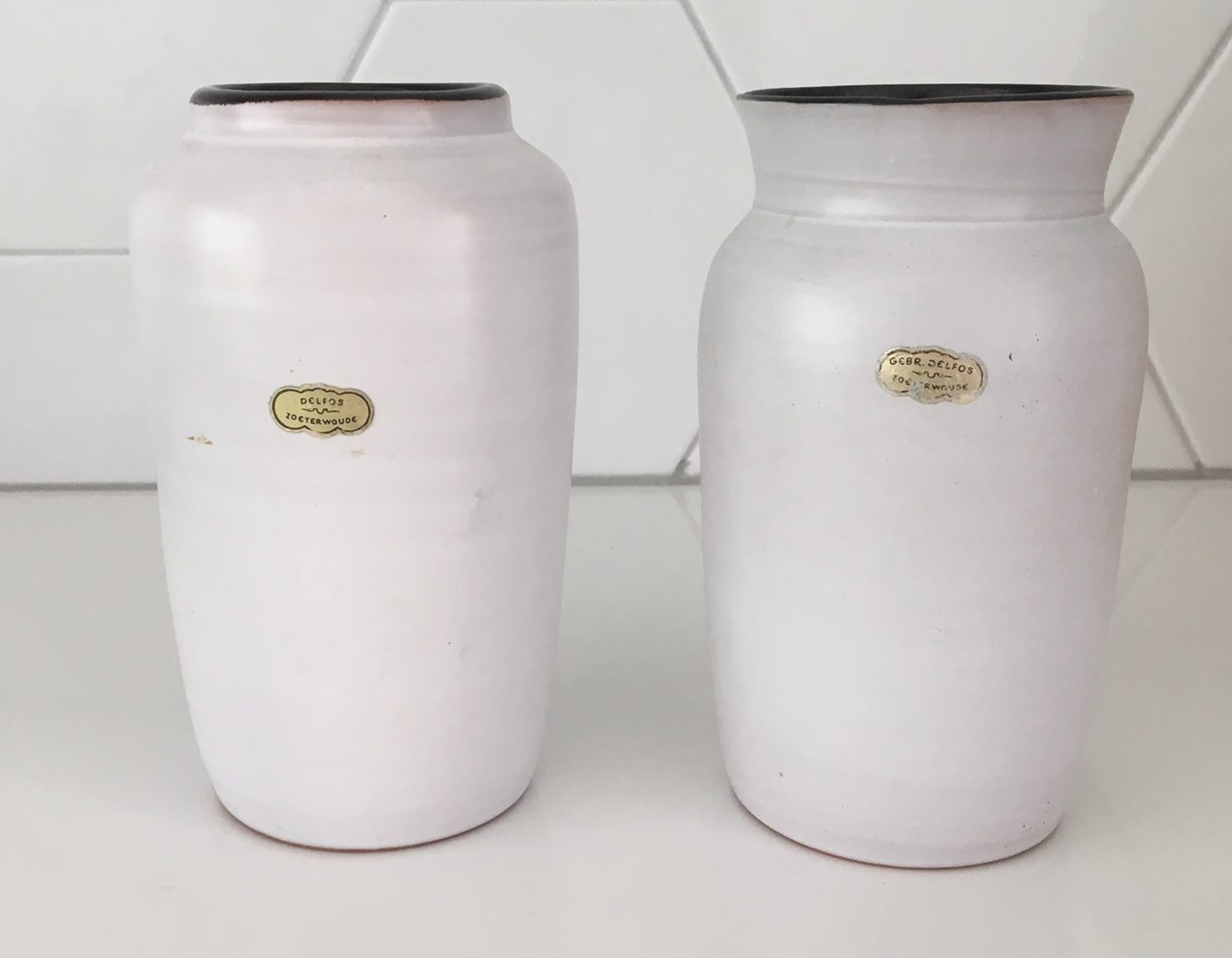 Twee witte aardewerk vaasjes Delfos Zoeterwoude. In prima onbeschadigde conditie en gemerkt met een gouden sticker.