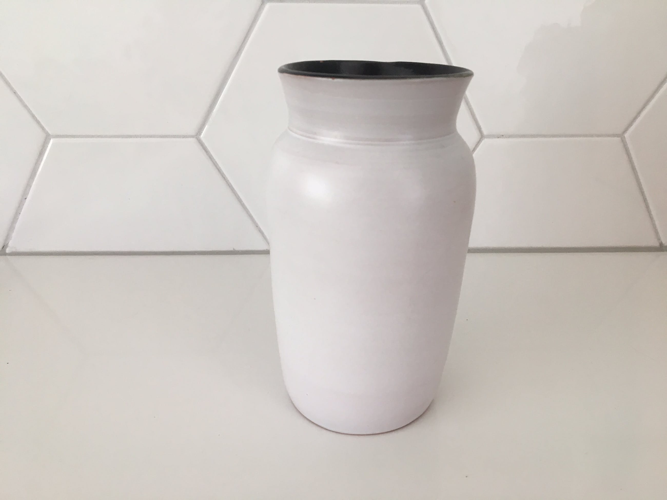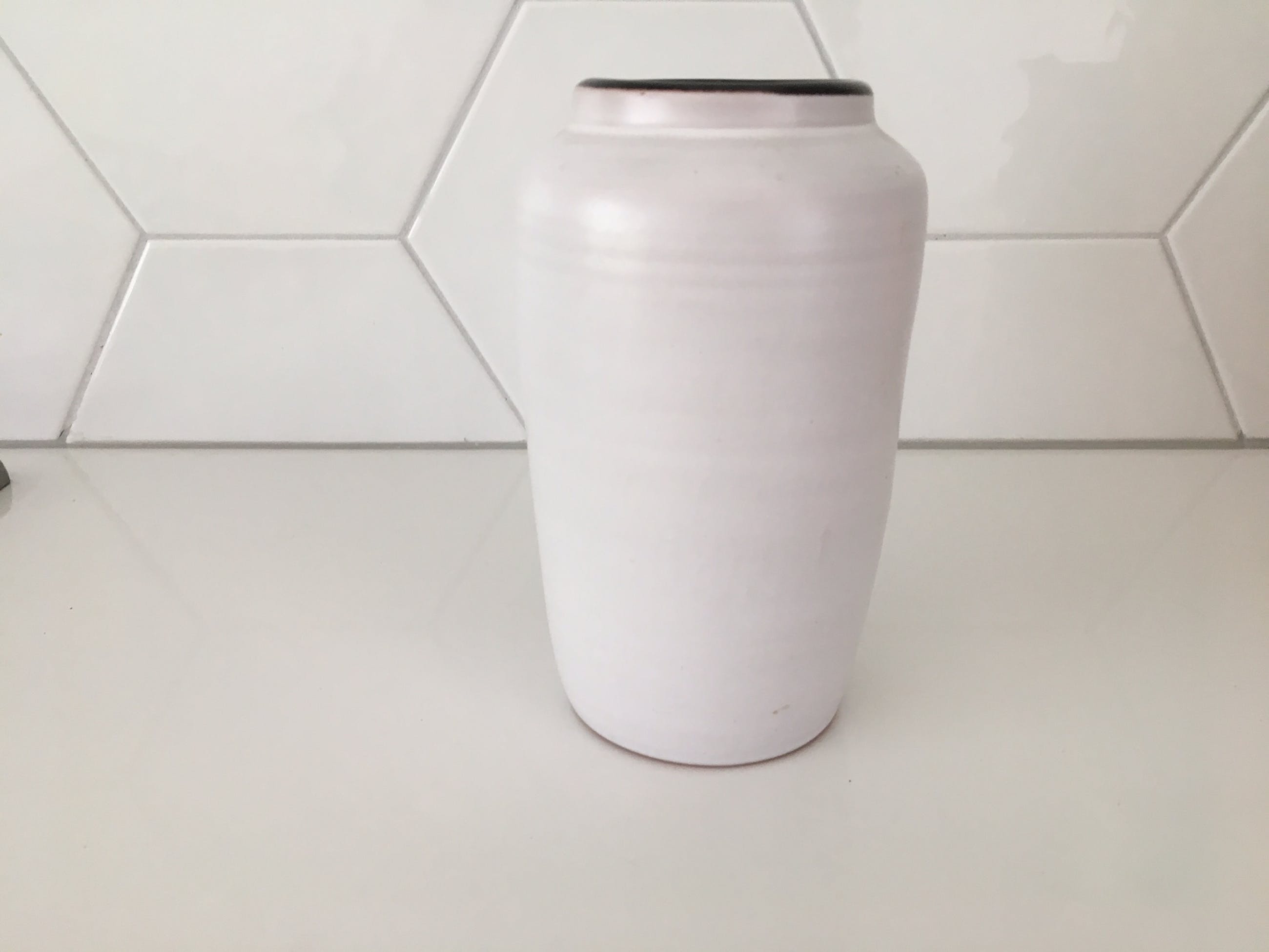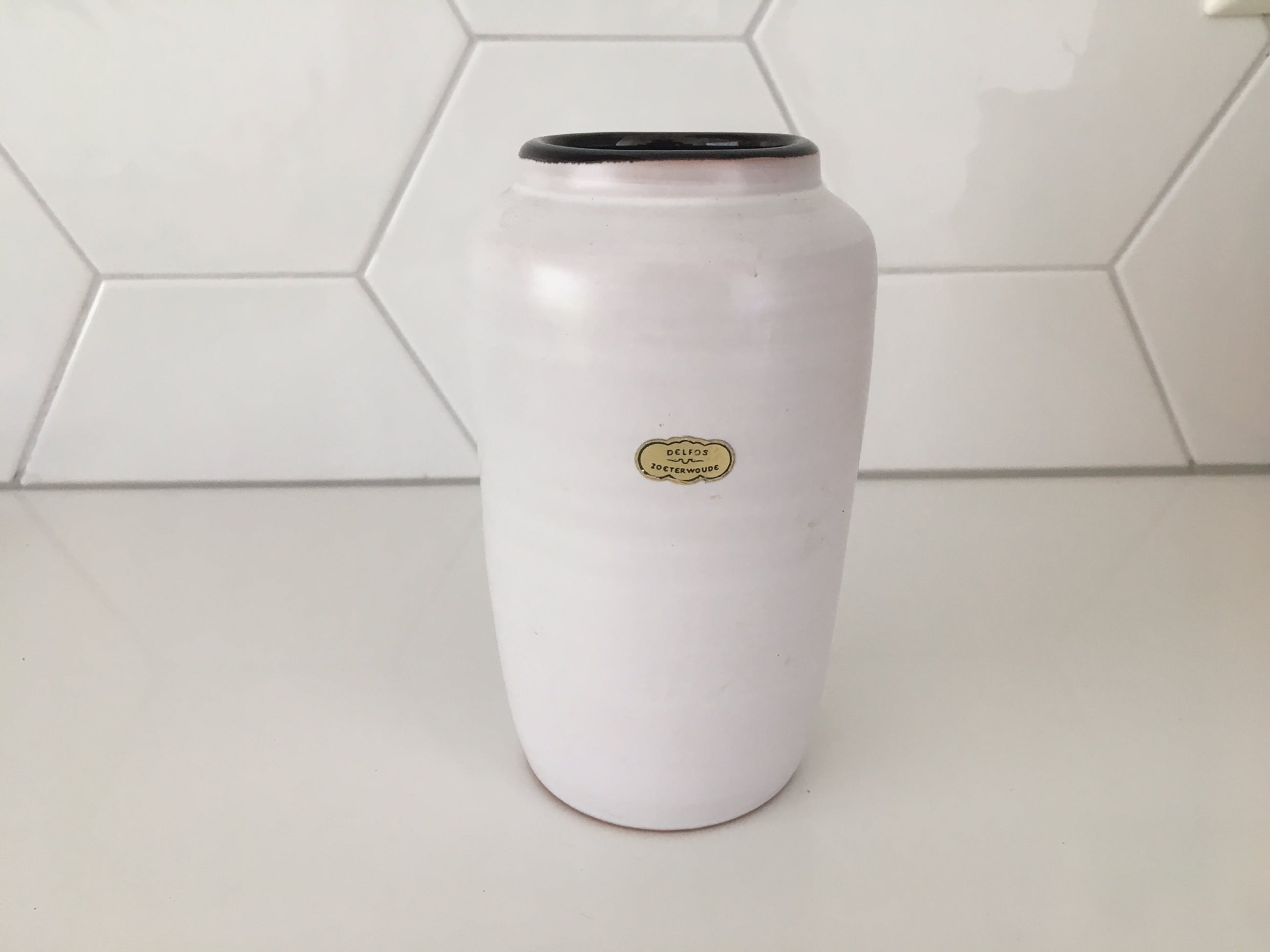 Twee witte aardewerk vaasjes Delfos Zoeterwoude. In prima onbeschadigde conditie en gemerkt met een gouden sticker.