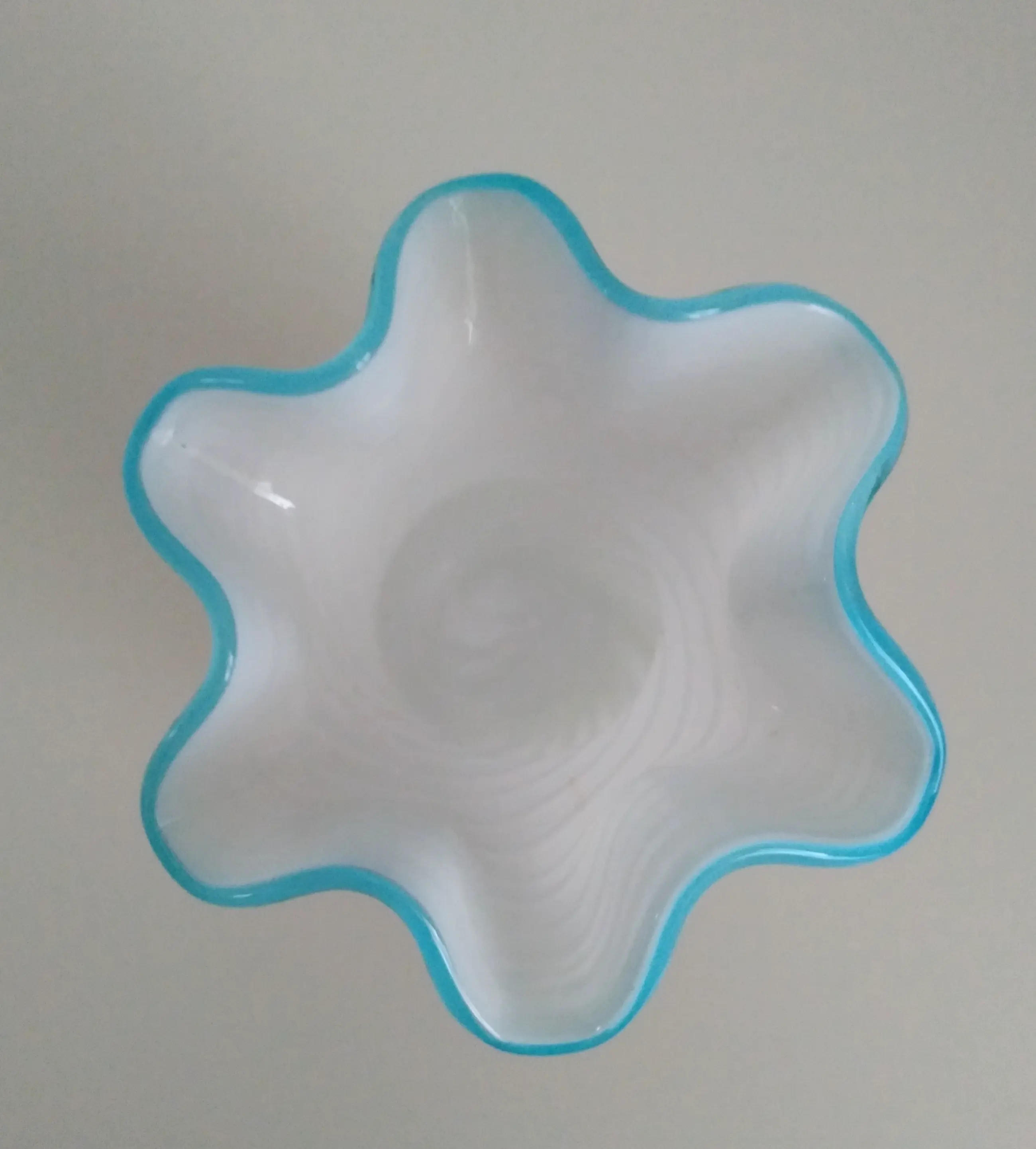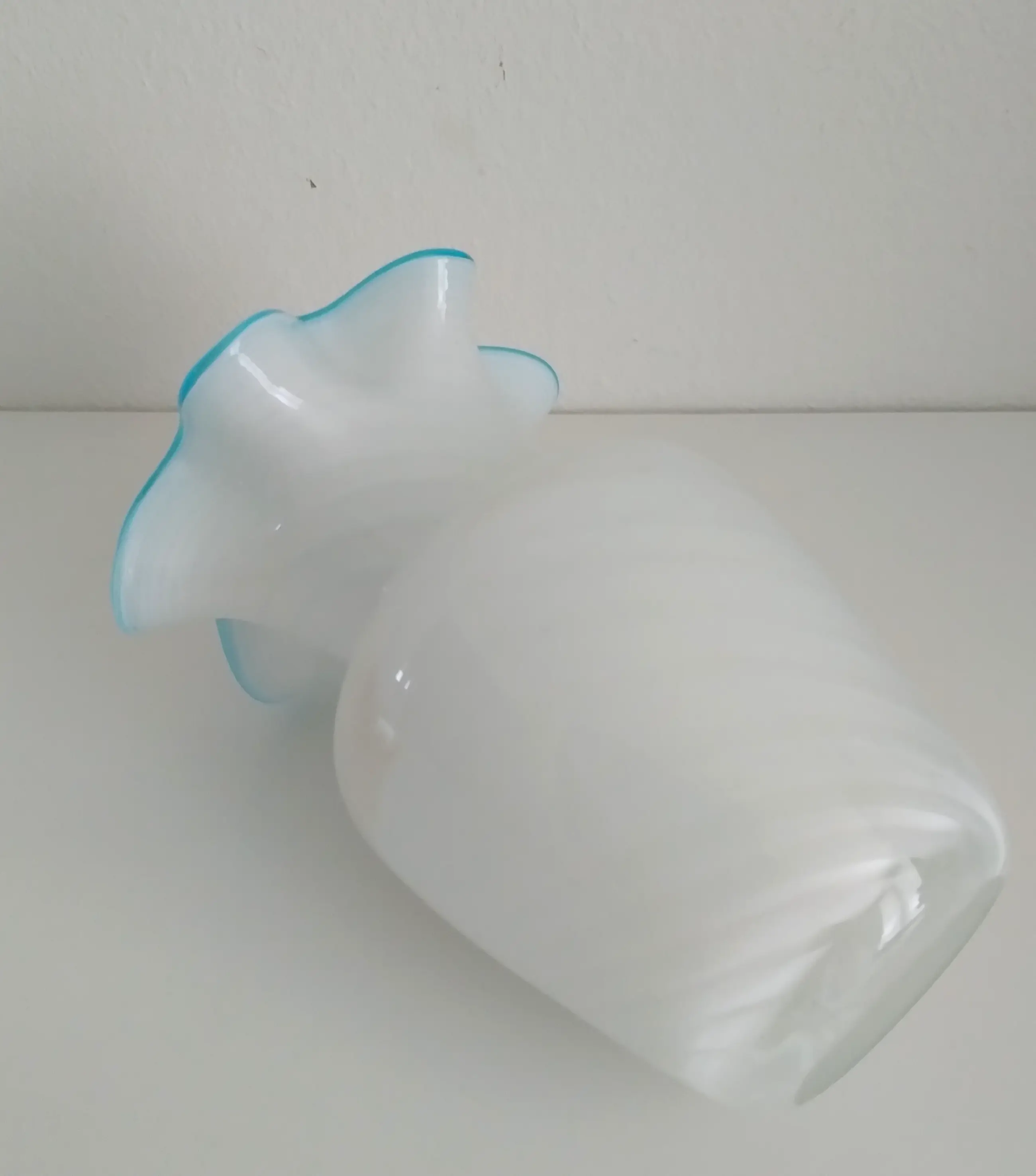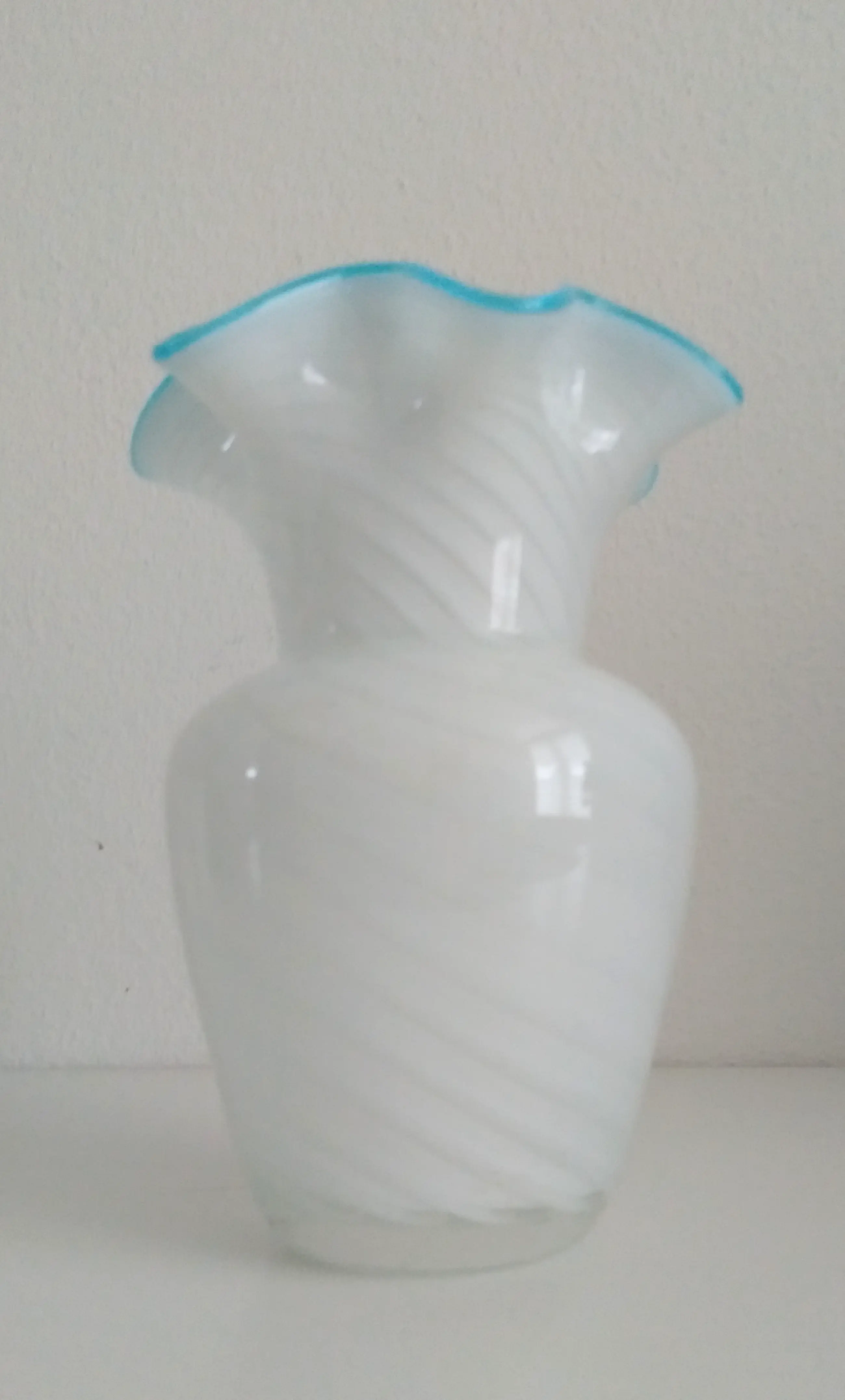 Zeer elegante vaas van handgemaakt/mondgeblazen glas. De voet is helder transparant, daaruit rijzen witte, diagonale lijnen op. De blikvanger is natuurlijk de 'kraag', deze is afgezet met een een lint van een opvallende tint blauw glas. Verkeert in zeer goede staat.