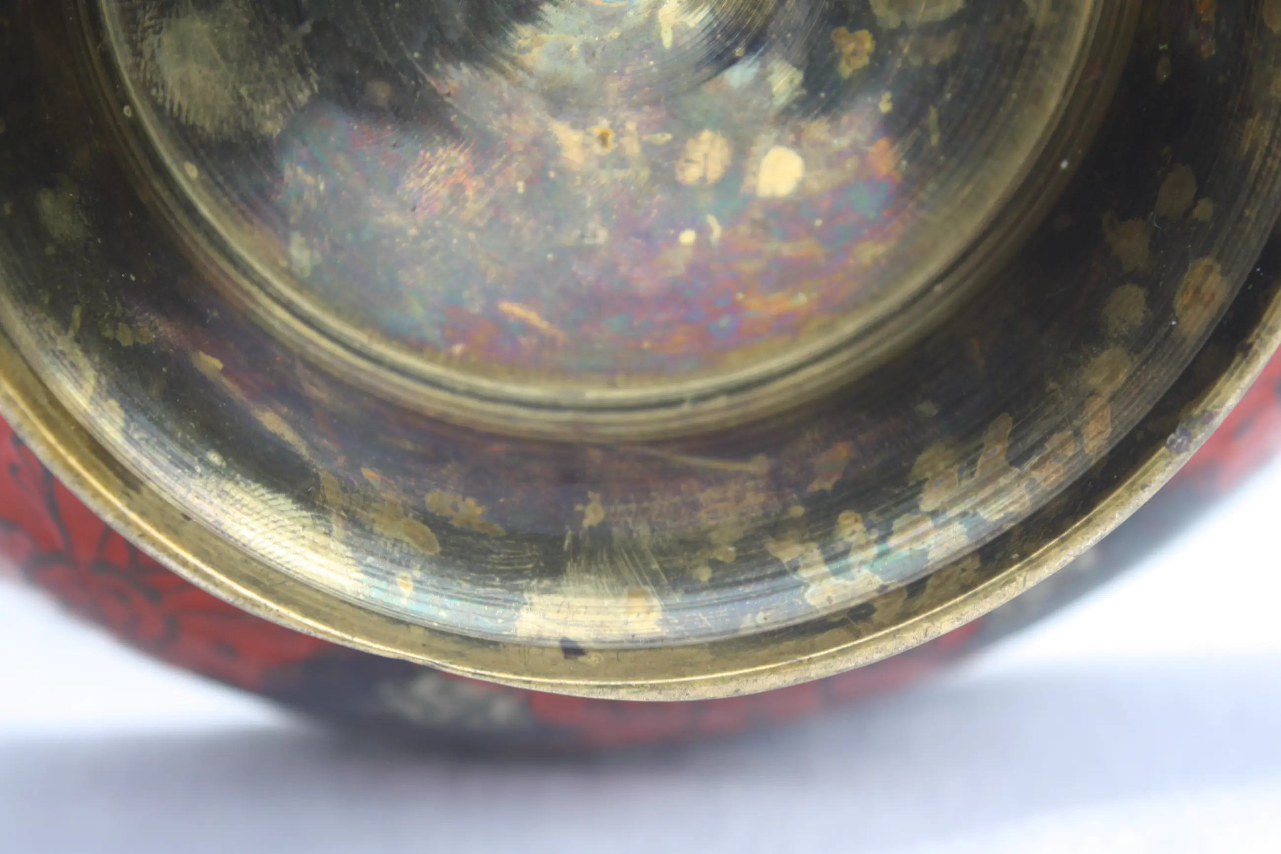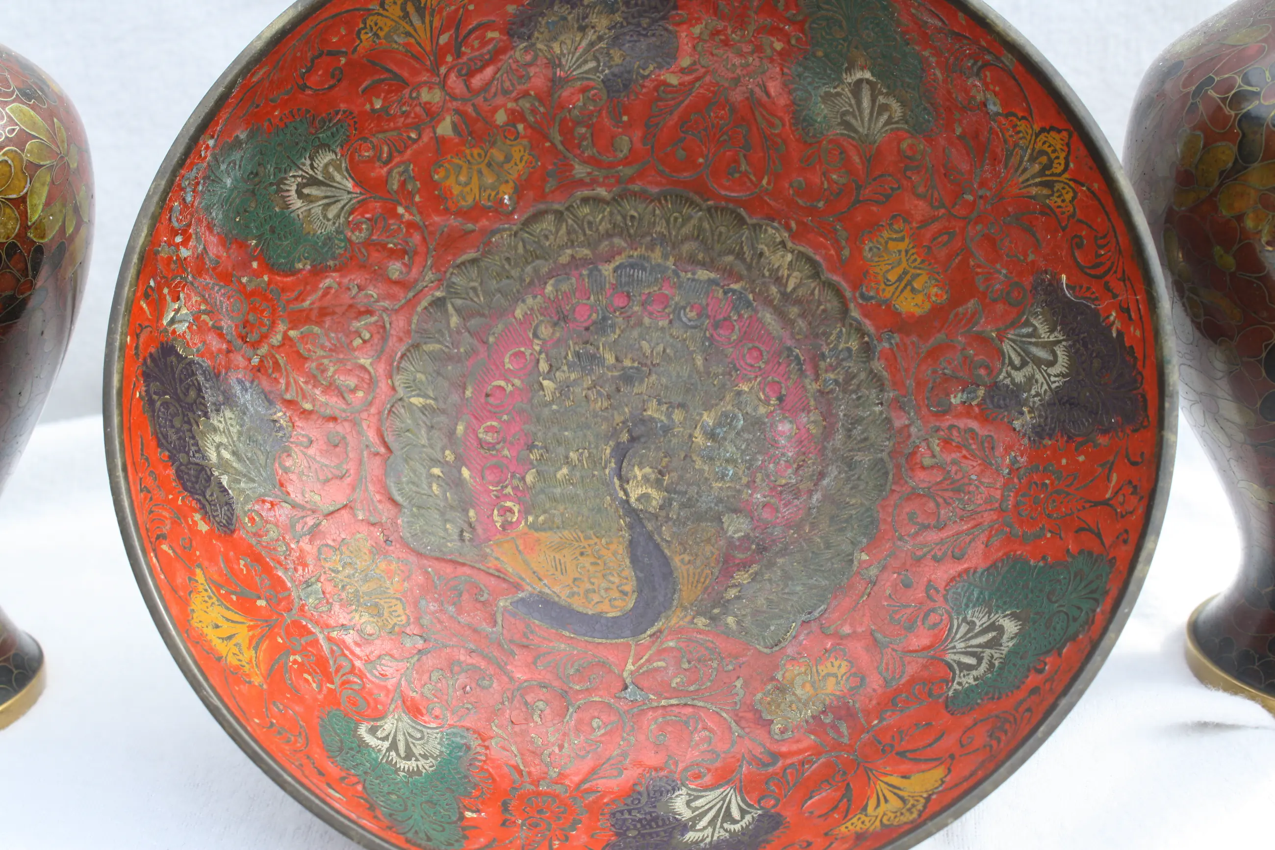 Aangeboden uit mijn Prive-Verzameling Twee Prachtige Cloisonne Vazen en een Zeer oude Cloisonne Schaal met Pauw Decor.