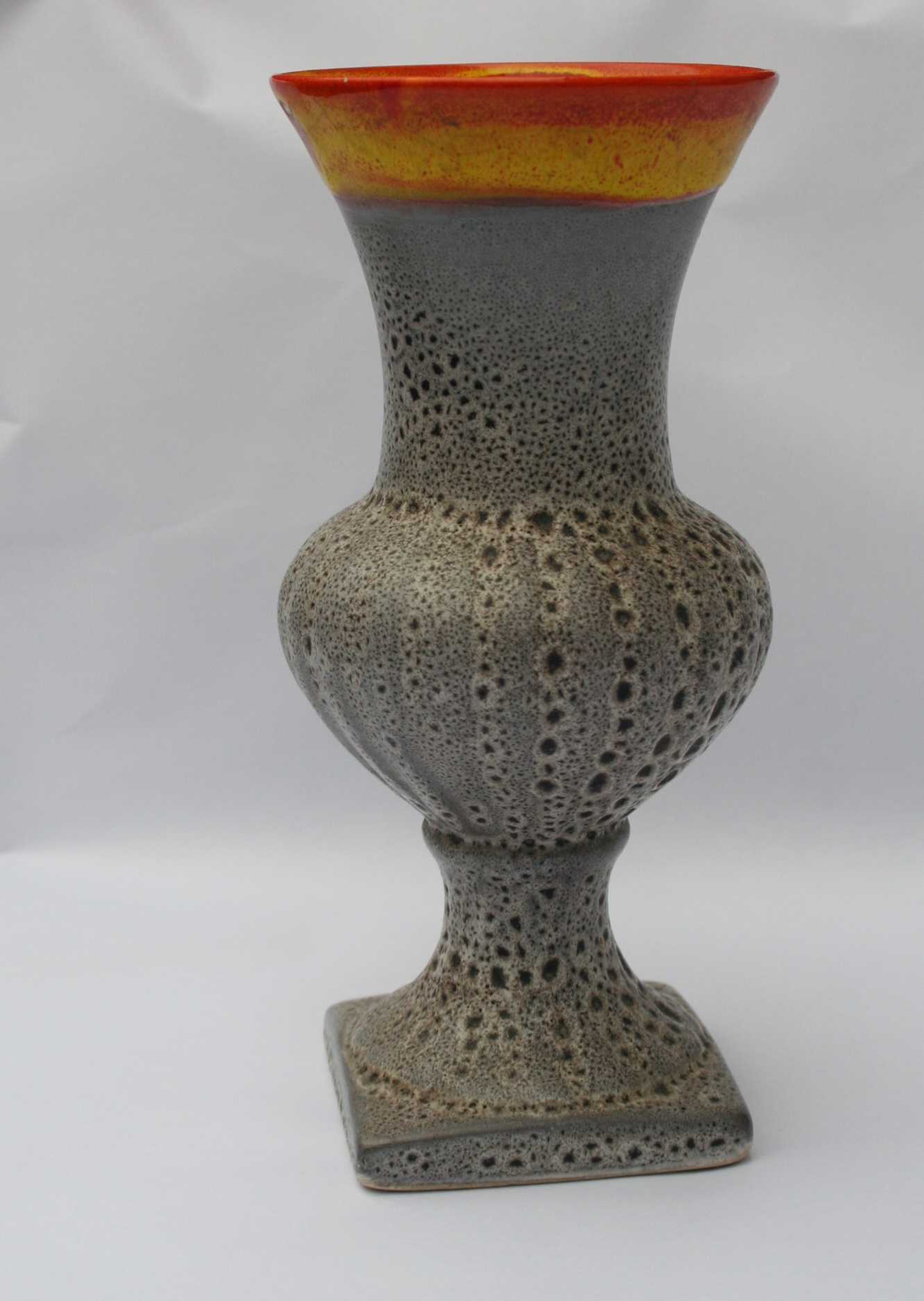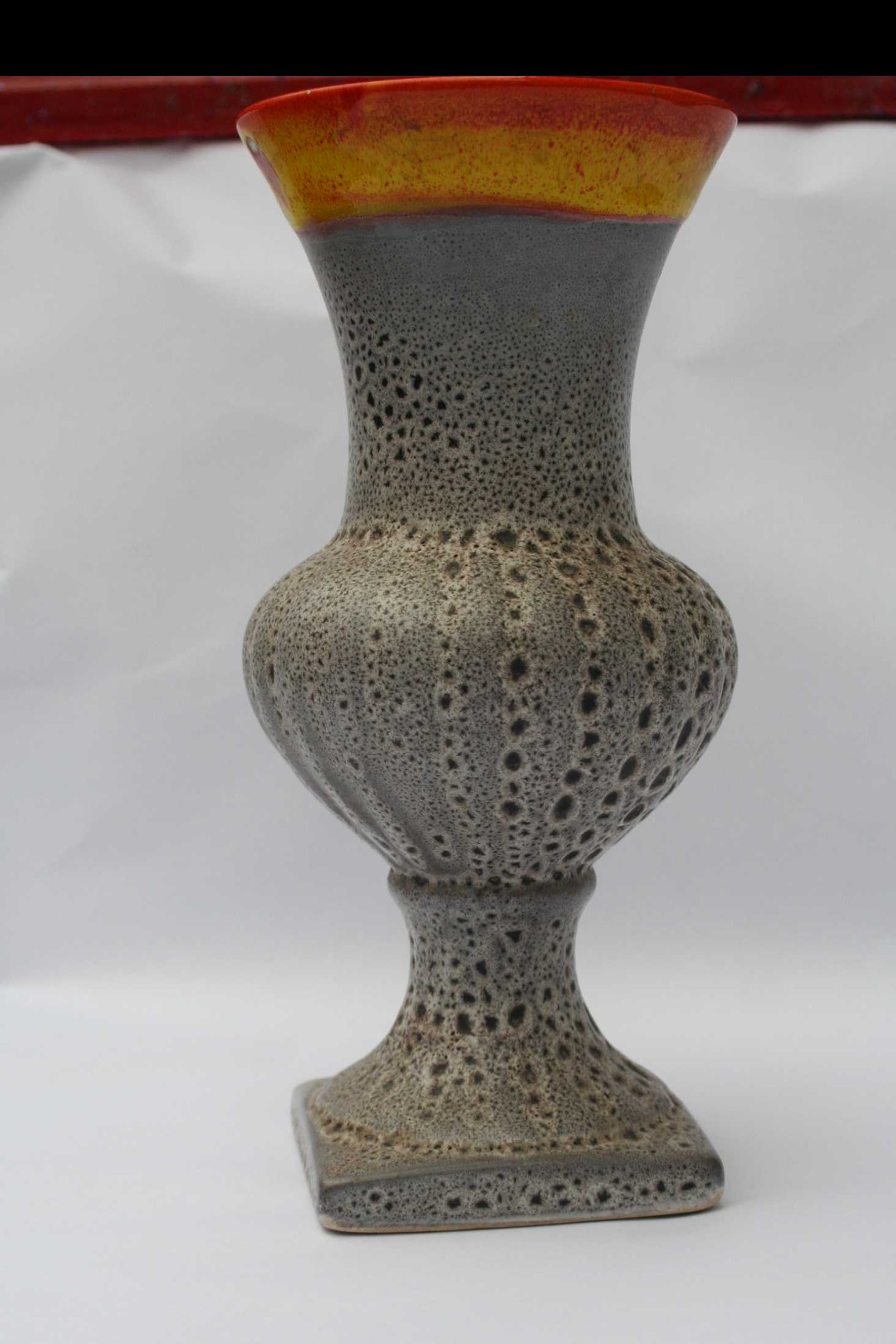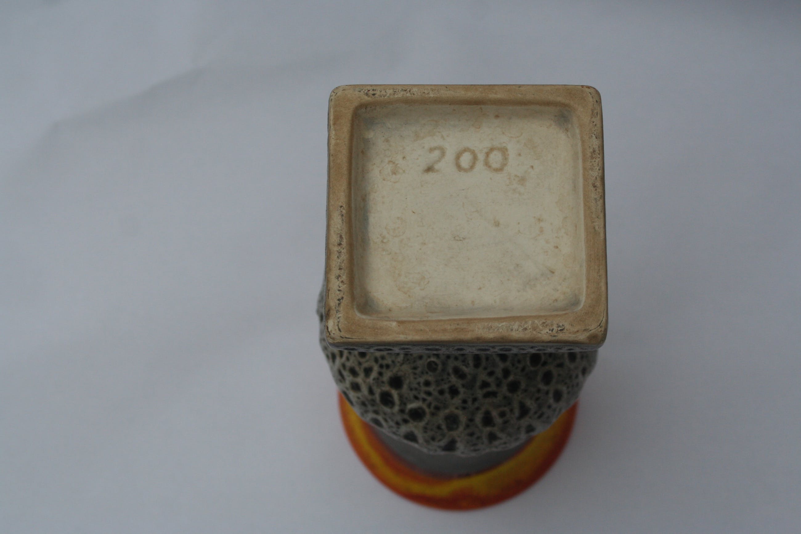 Vaas met grijs glazuur, dikke laag. Bovenzijde glazuur in felle kleuren. Voet is vierkant. Aan de onderzijde staat 200. Keramist / galerie is onbekend.