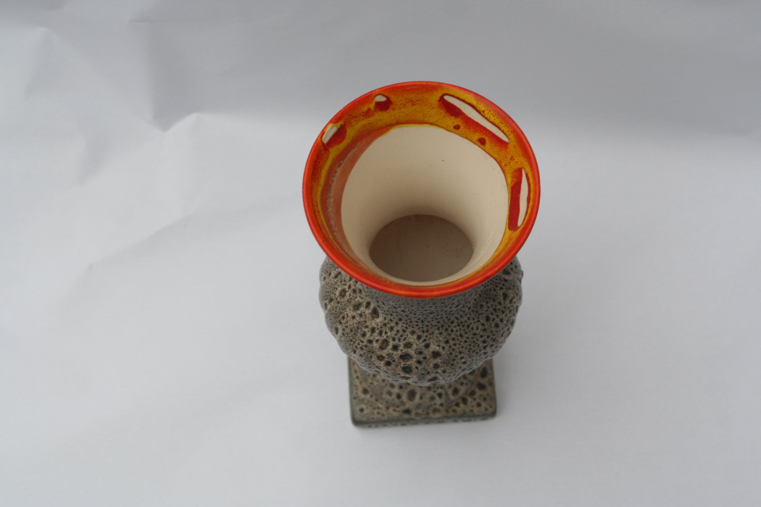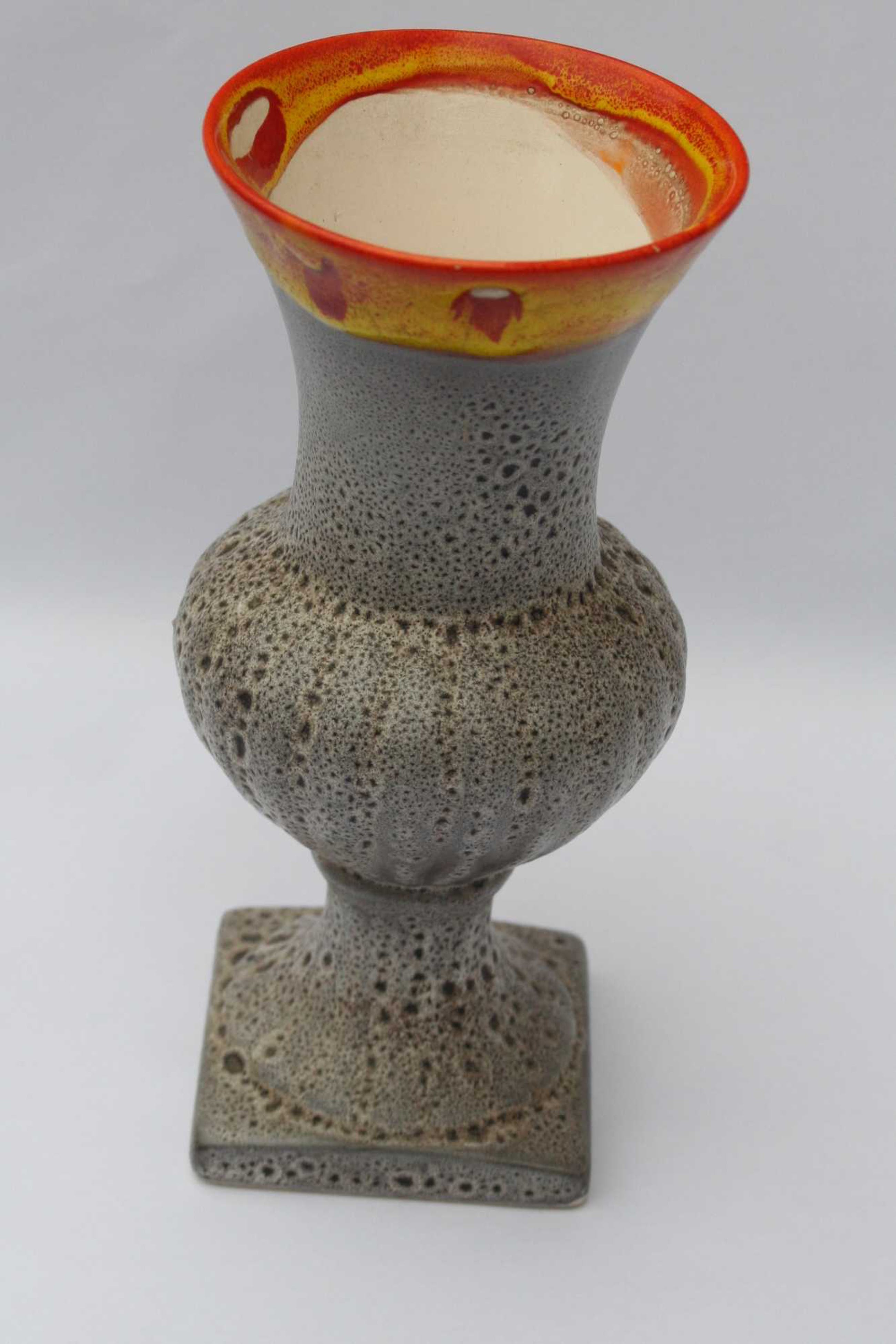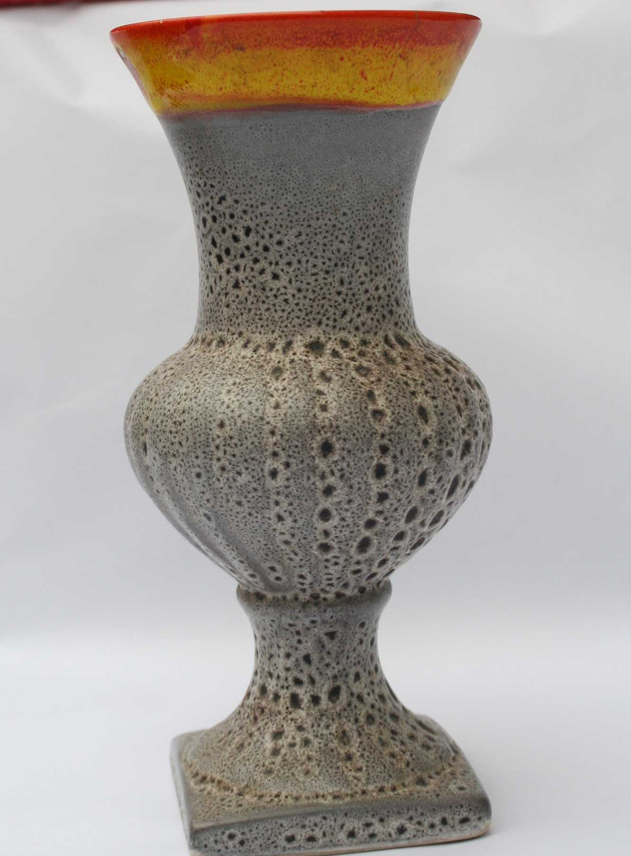 Vaas met grijs glazuur, dikke laag. Bovenzijde glazuur in felle kleuren. Voet is vierkant. Aan de onderzijde staat 200. Keramist / galerie is onbekend.