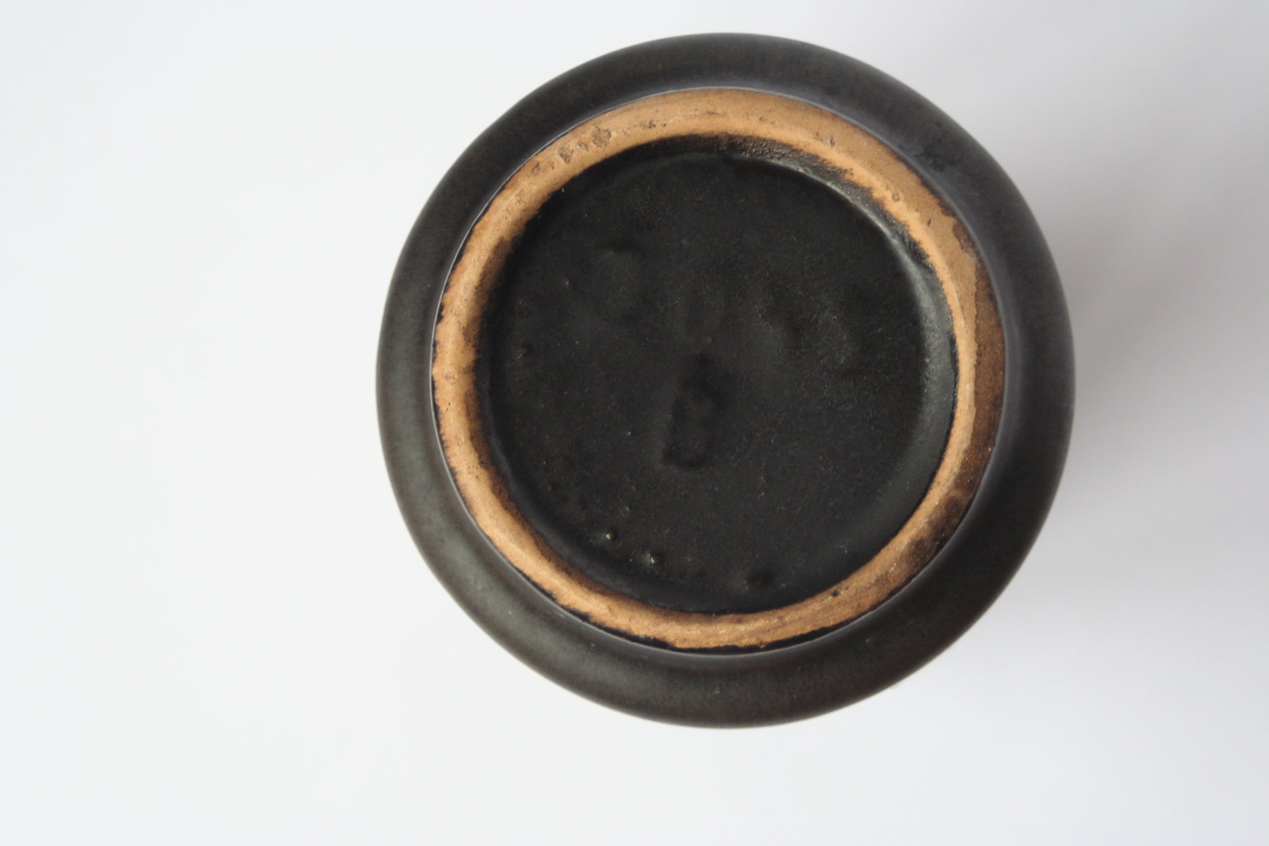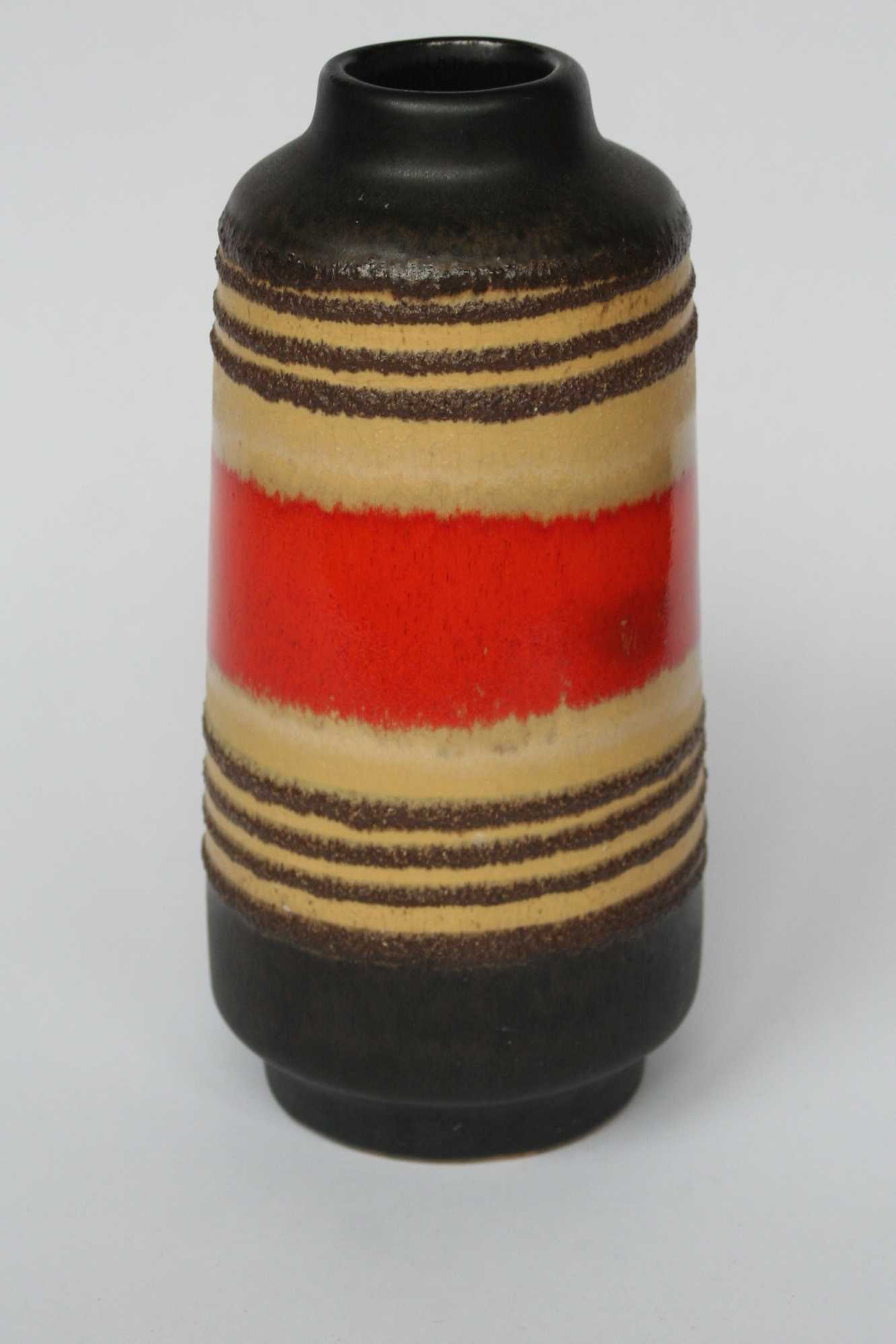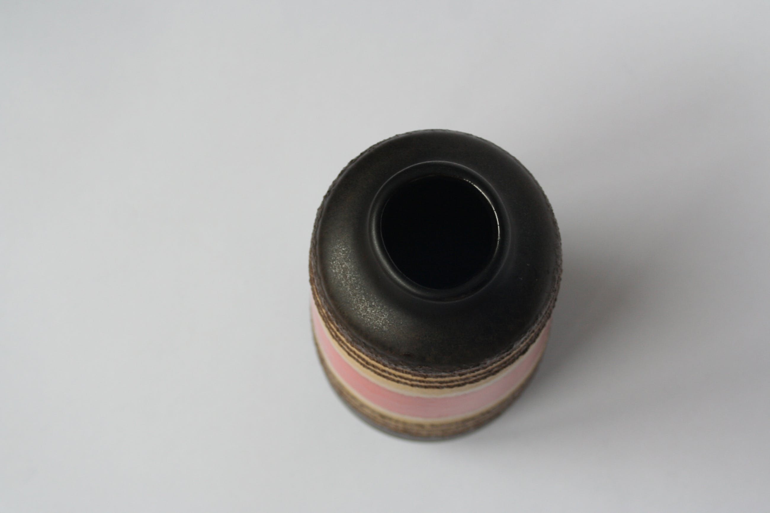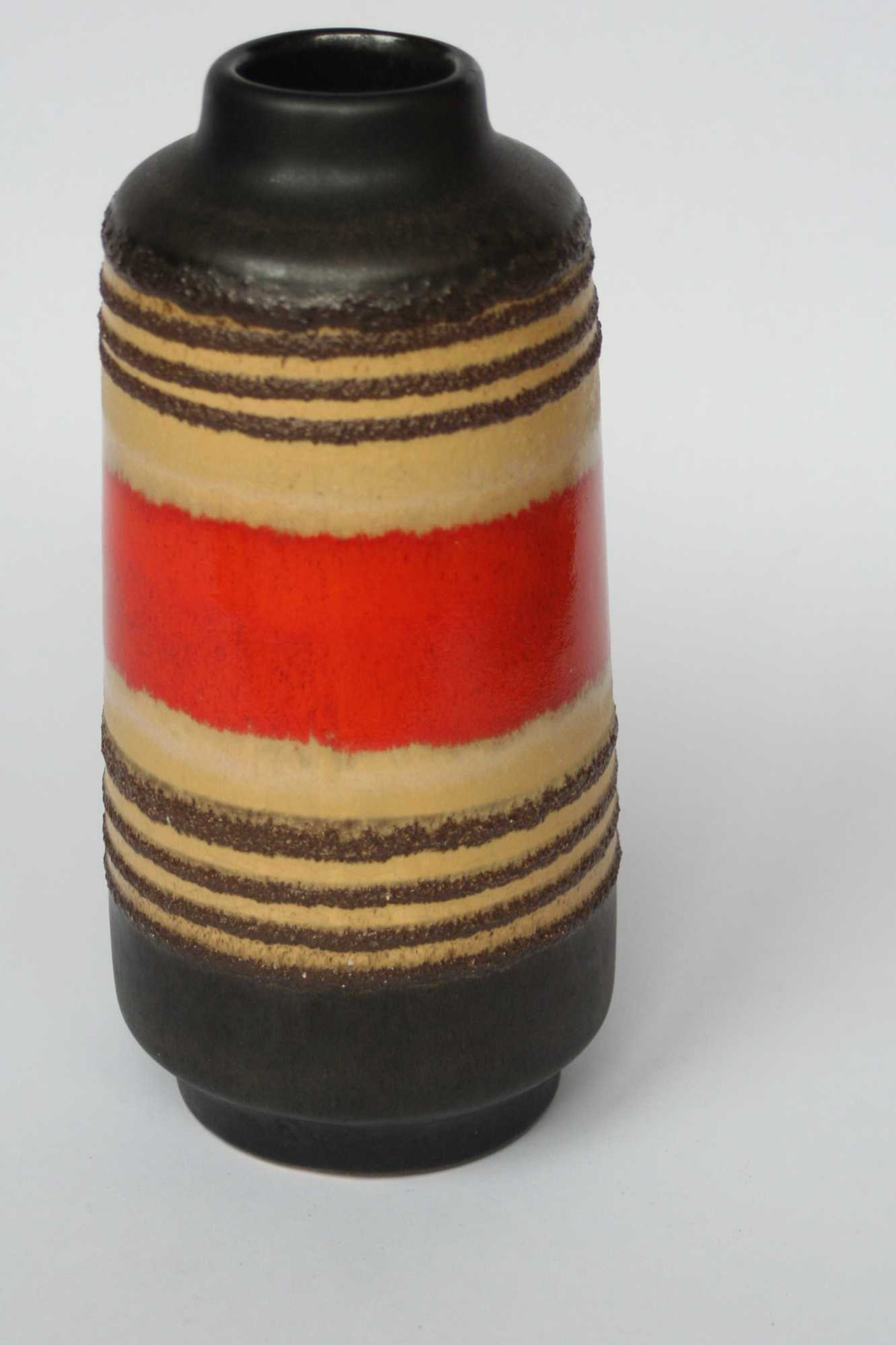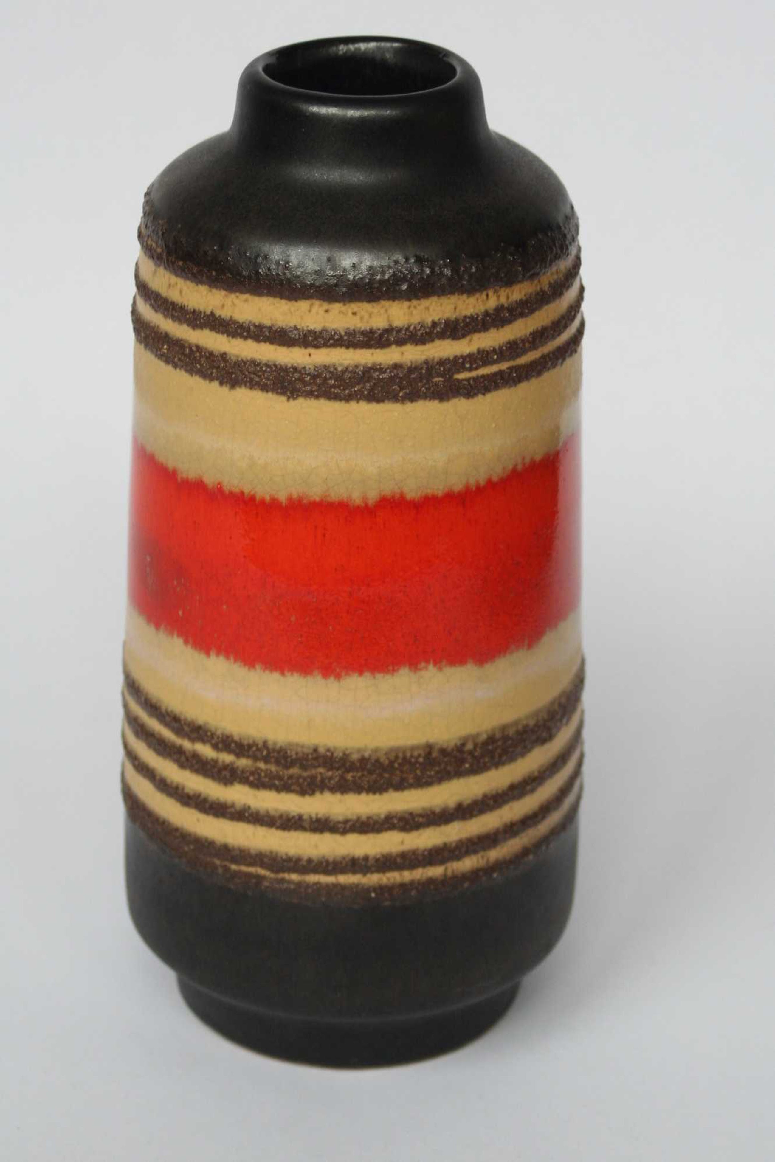 Fraaie vaas met hoogglans glazuur en dikke verschillende dikke structuur randen. Typische naoorlogse Germany stijl / vintage. Werden ook door enkele Nederlandse bedrijven gemaakt, handgedraaid, met veel aandacht voor de glazuurlagen.