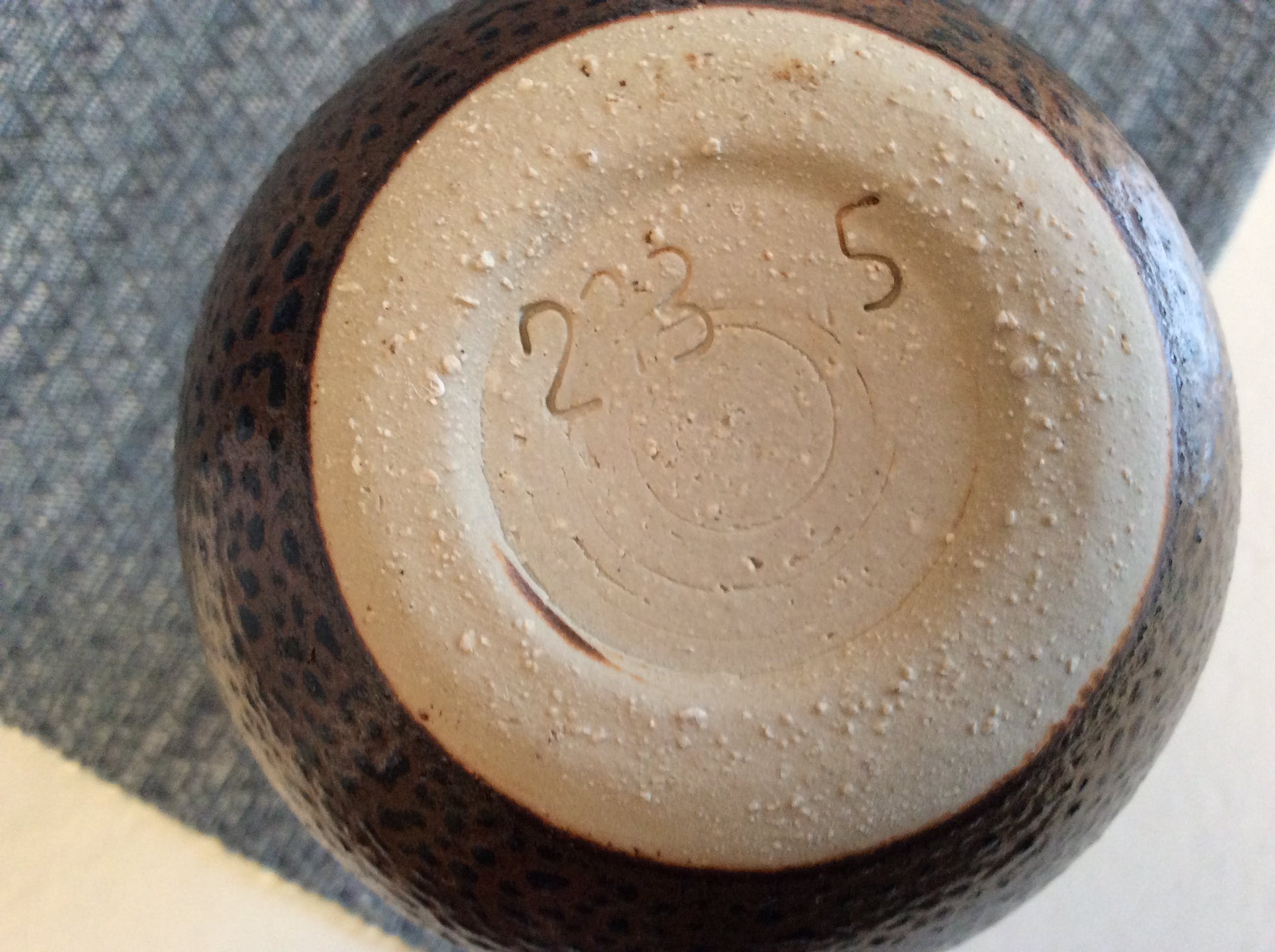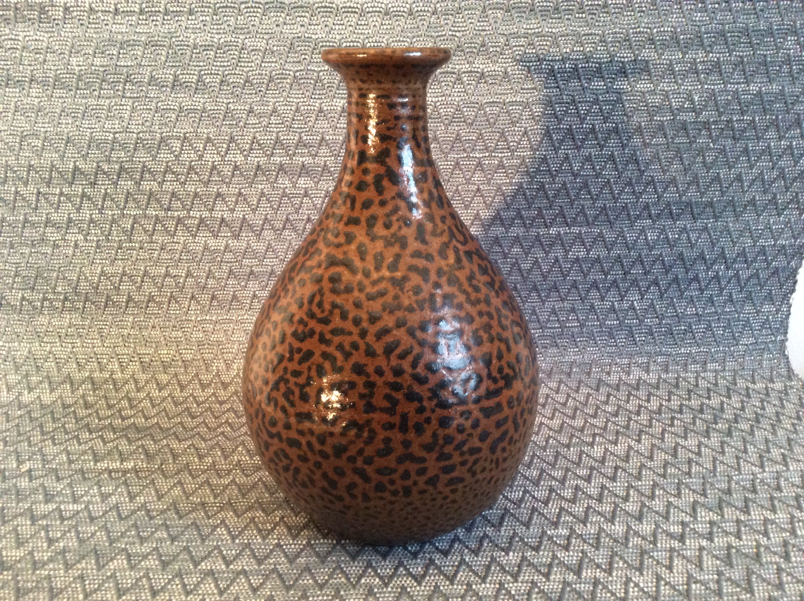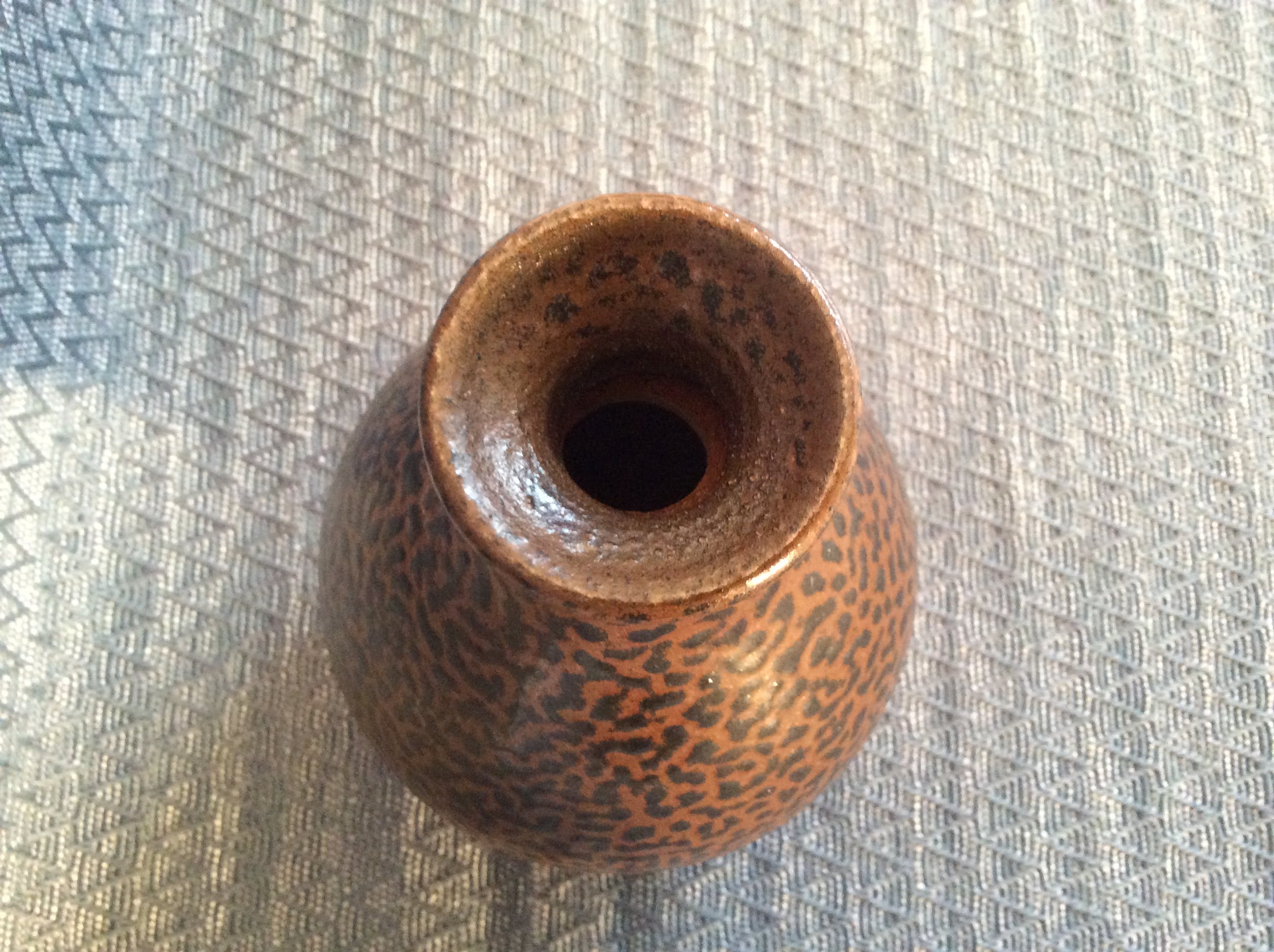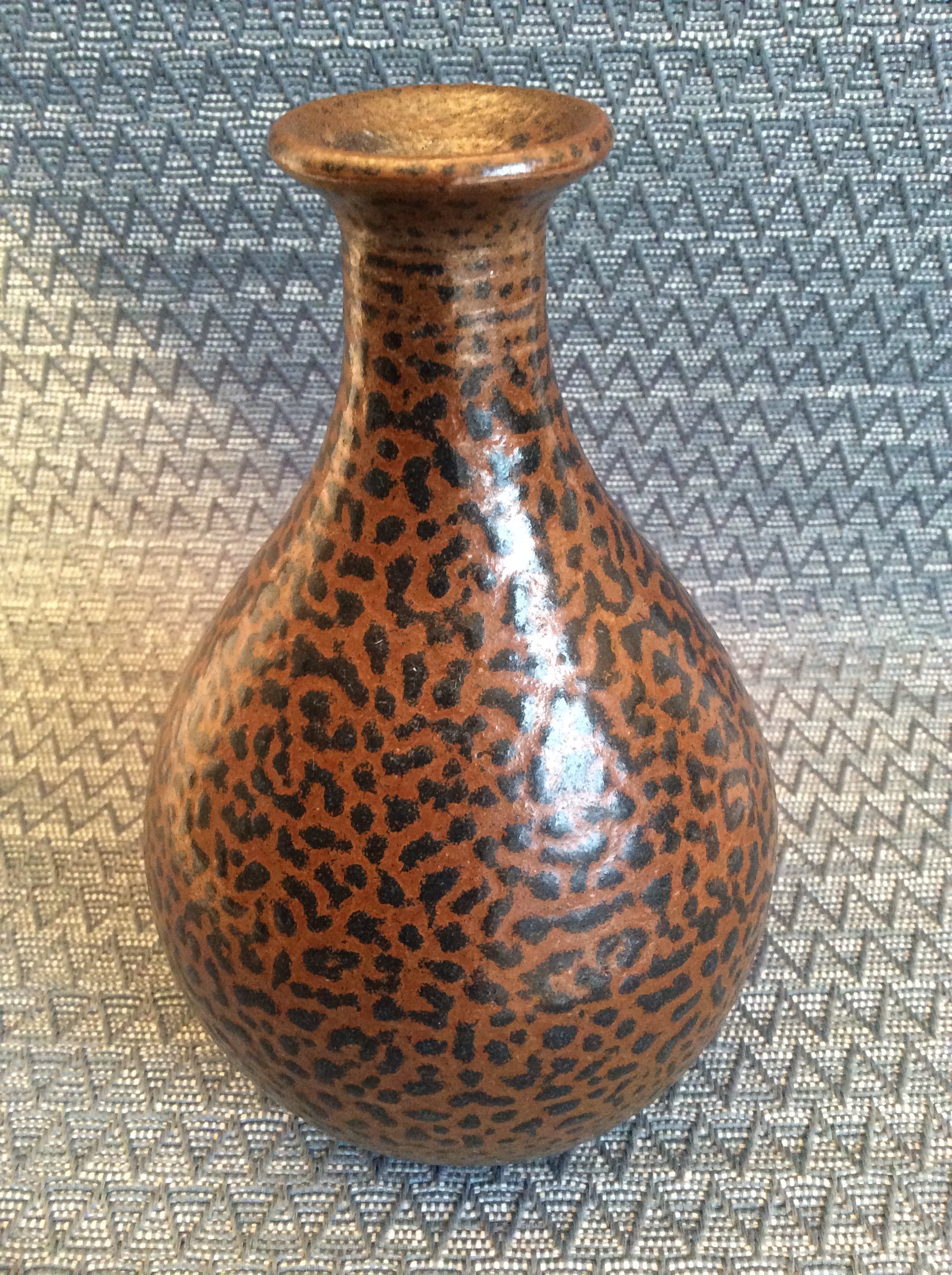 Keramiek vaas met luipaard patroon, mooi afgeglazuurd, onderop voorzien van nummering, keramist onbekend. Hoogte 16 cm, max doorsnede 10. In prima staat.