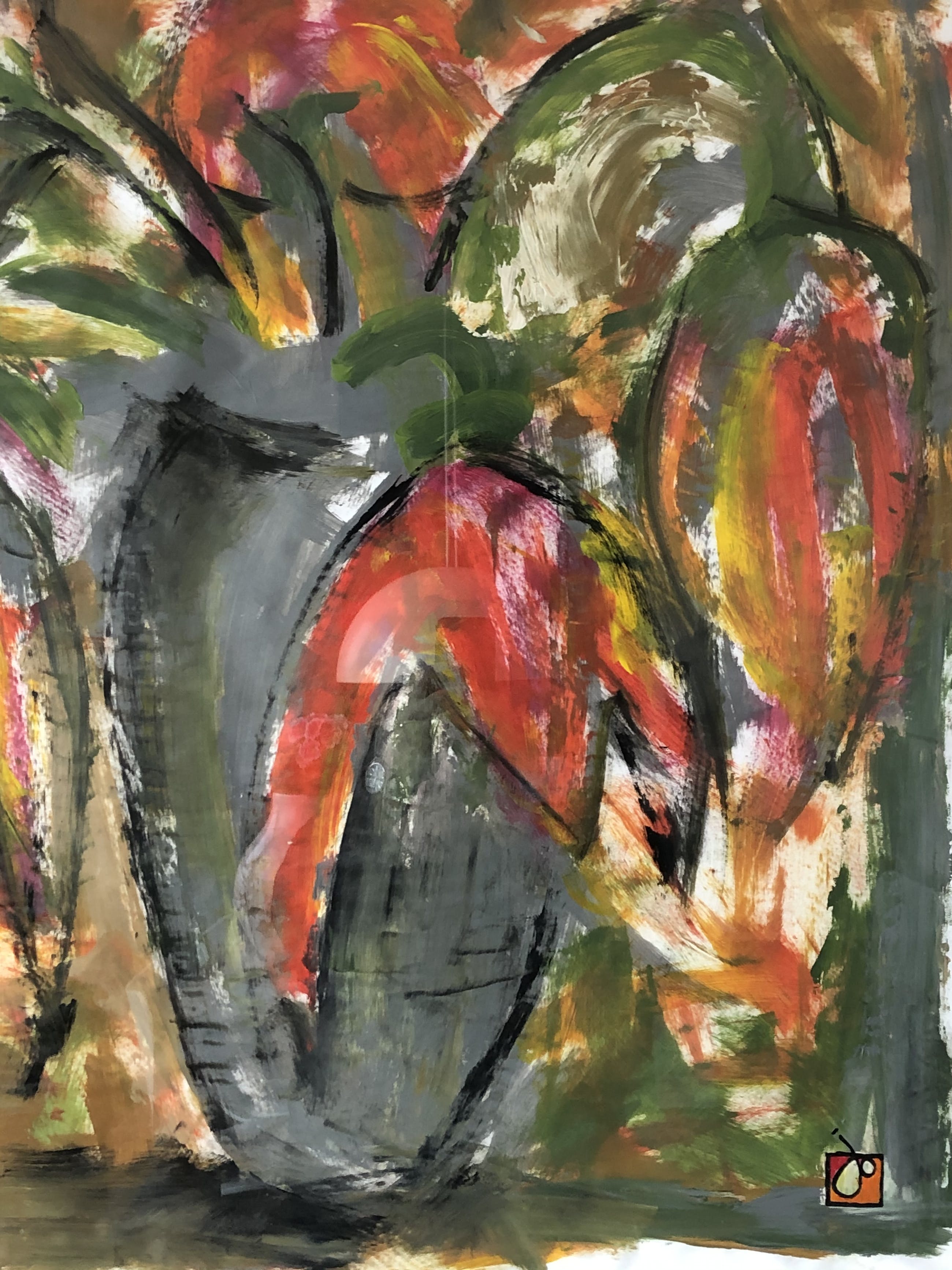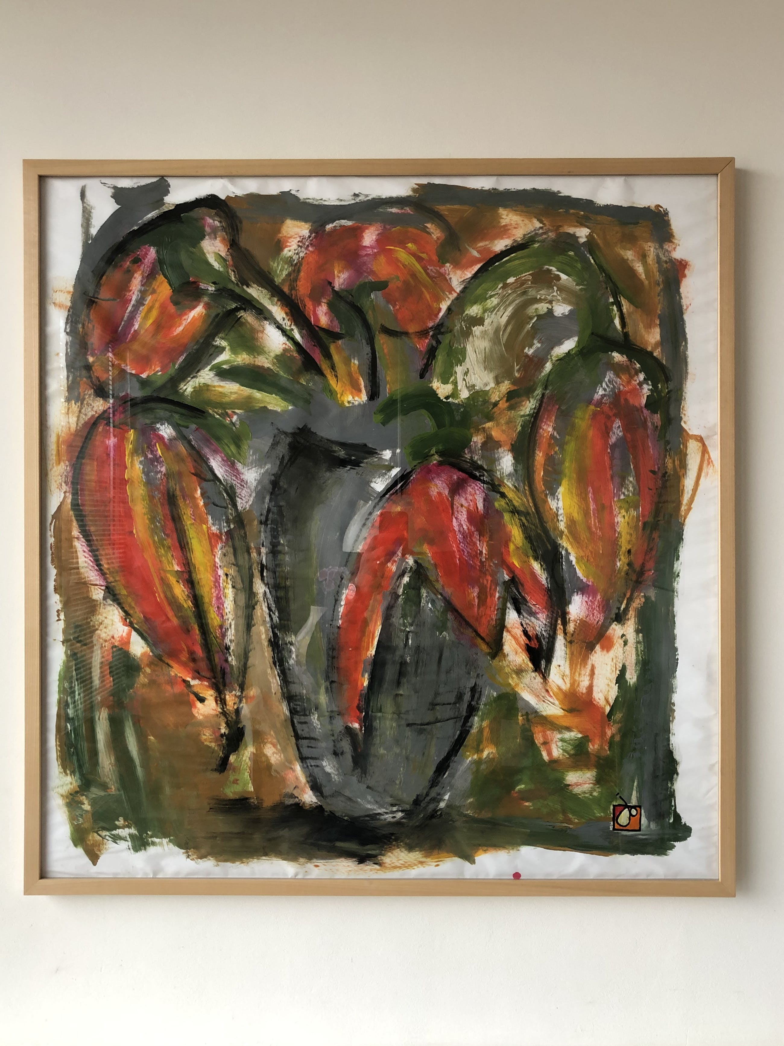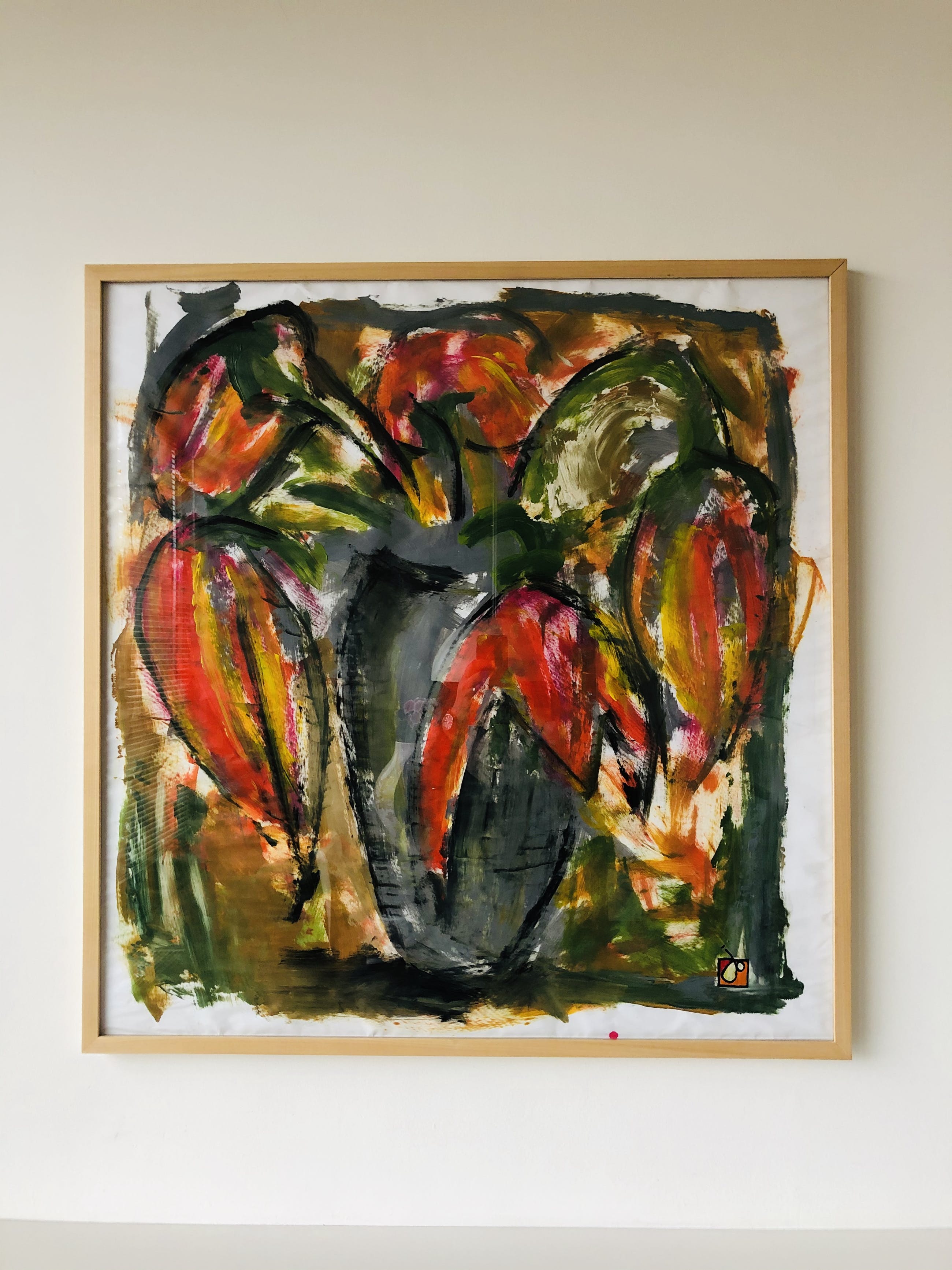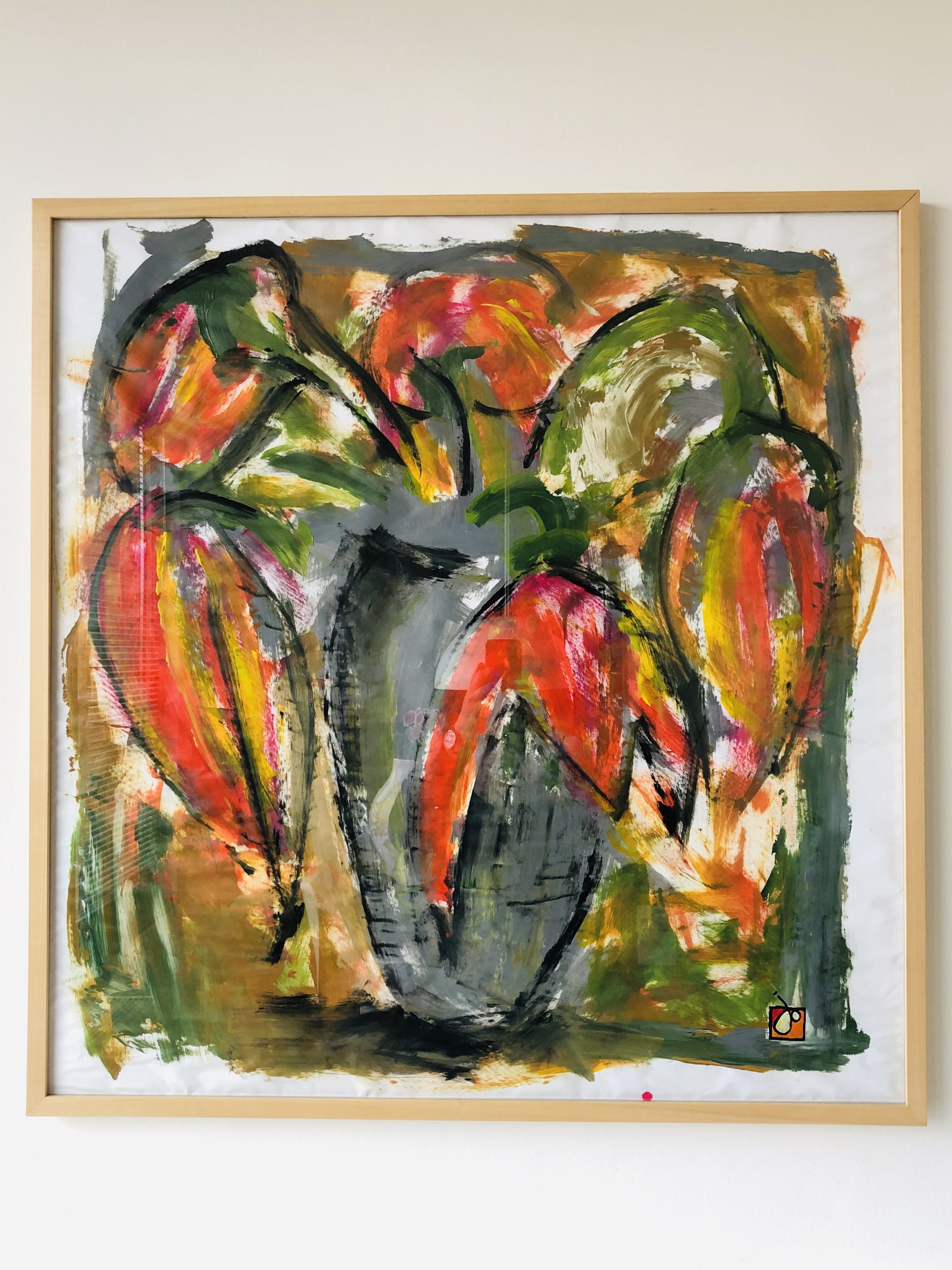 Haal het voorjaar in huis met dit prachtige grote expressionistiche schilderij van een vaas met tulpen.