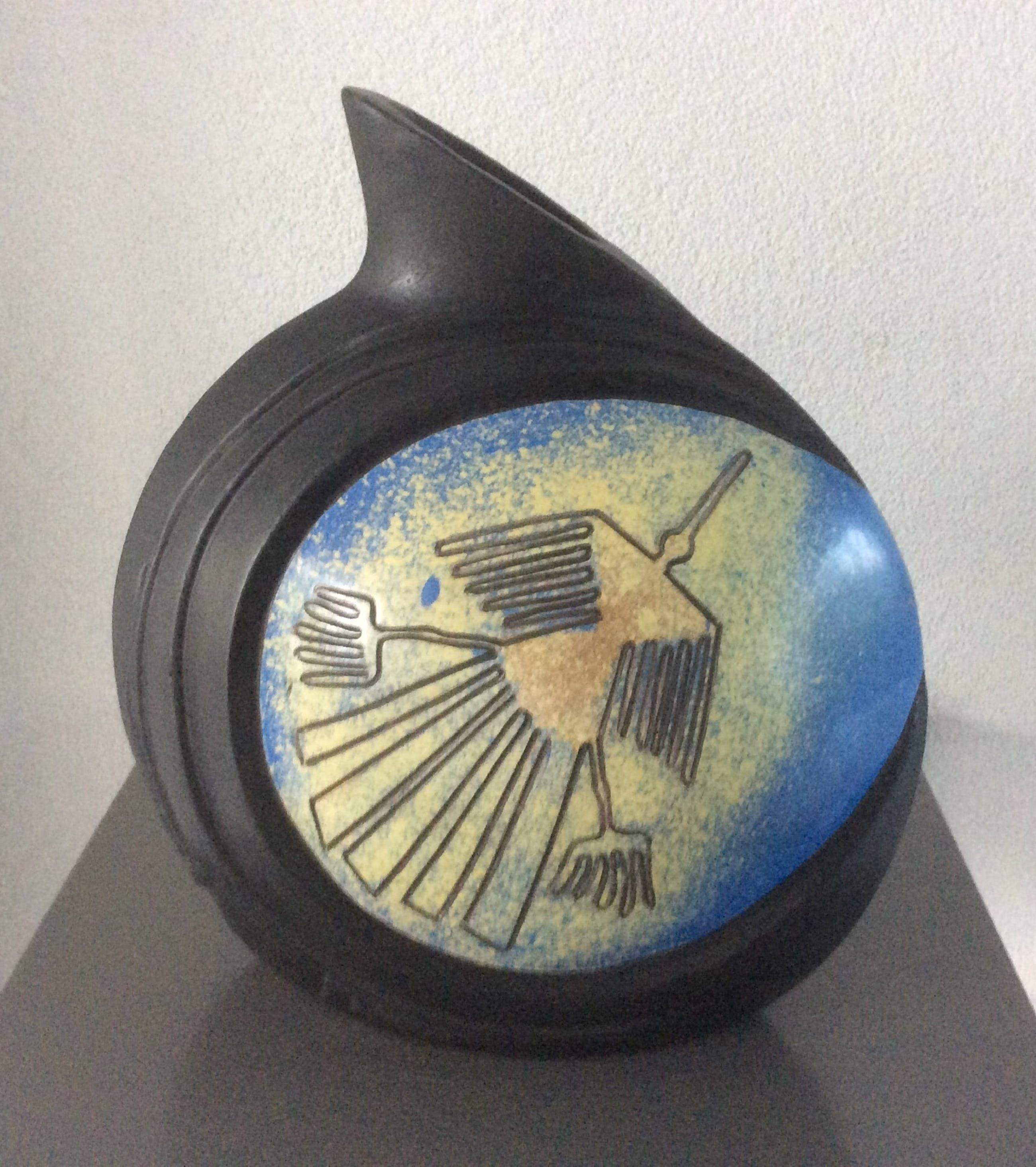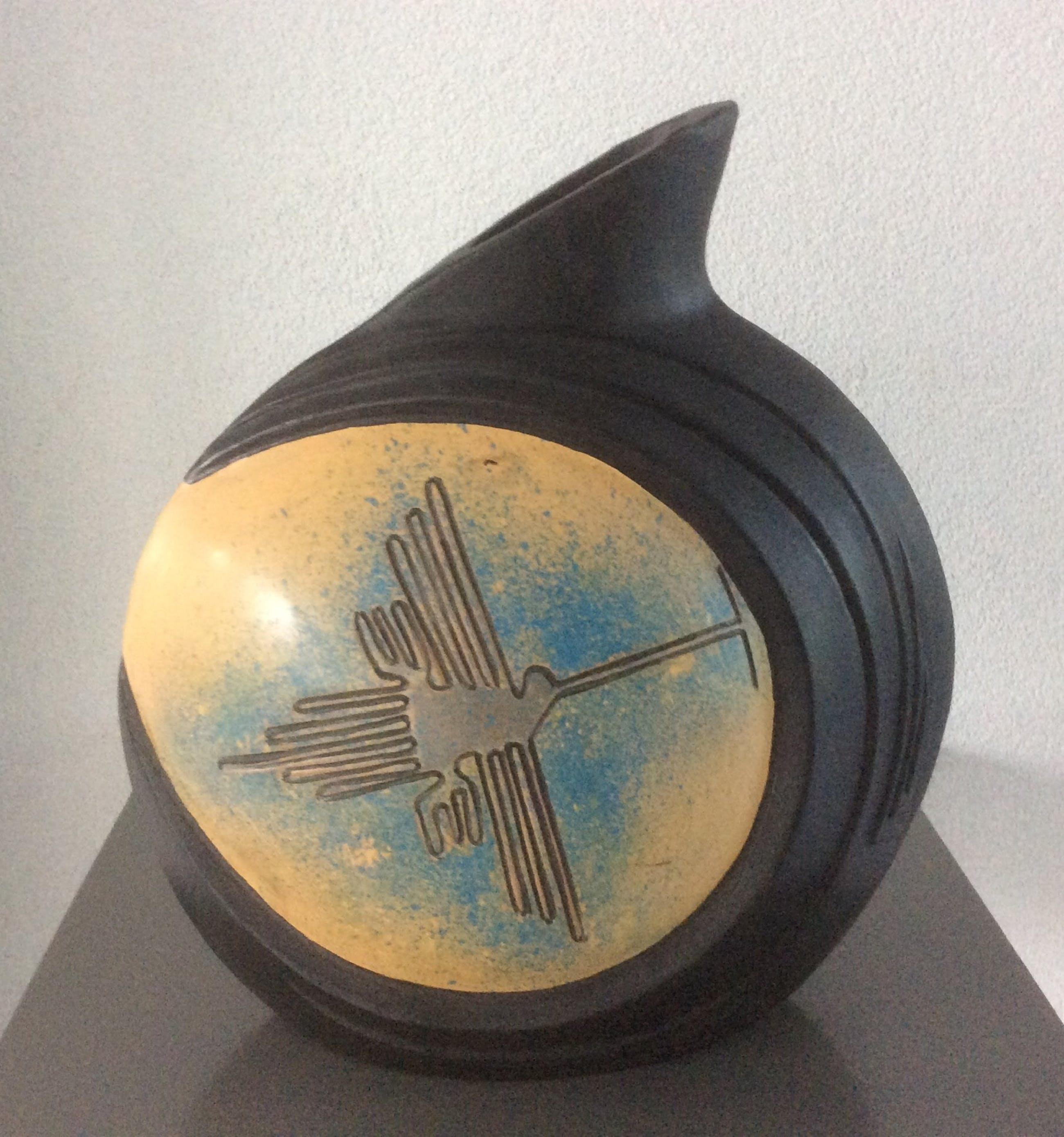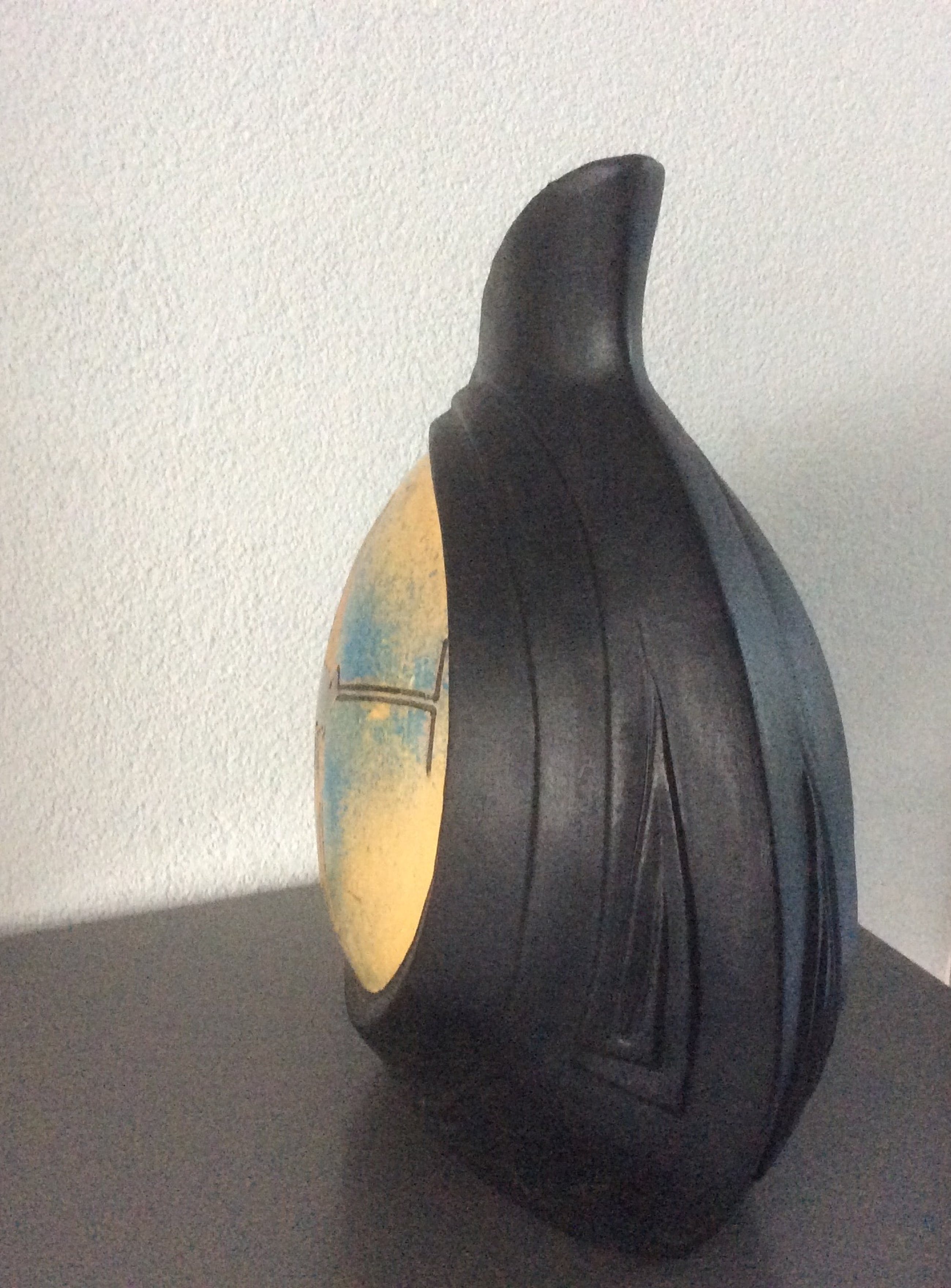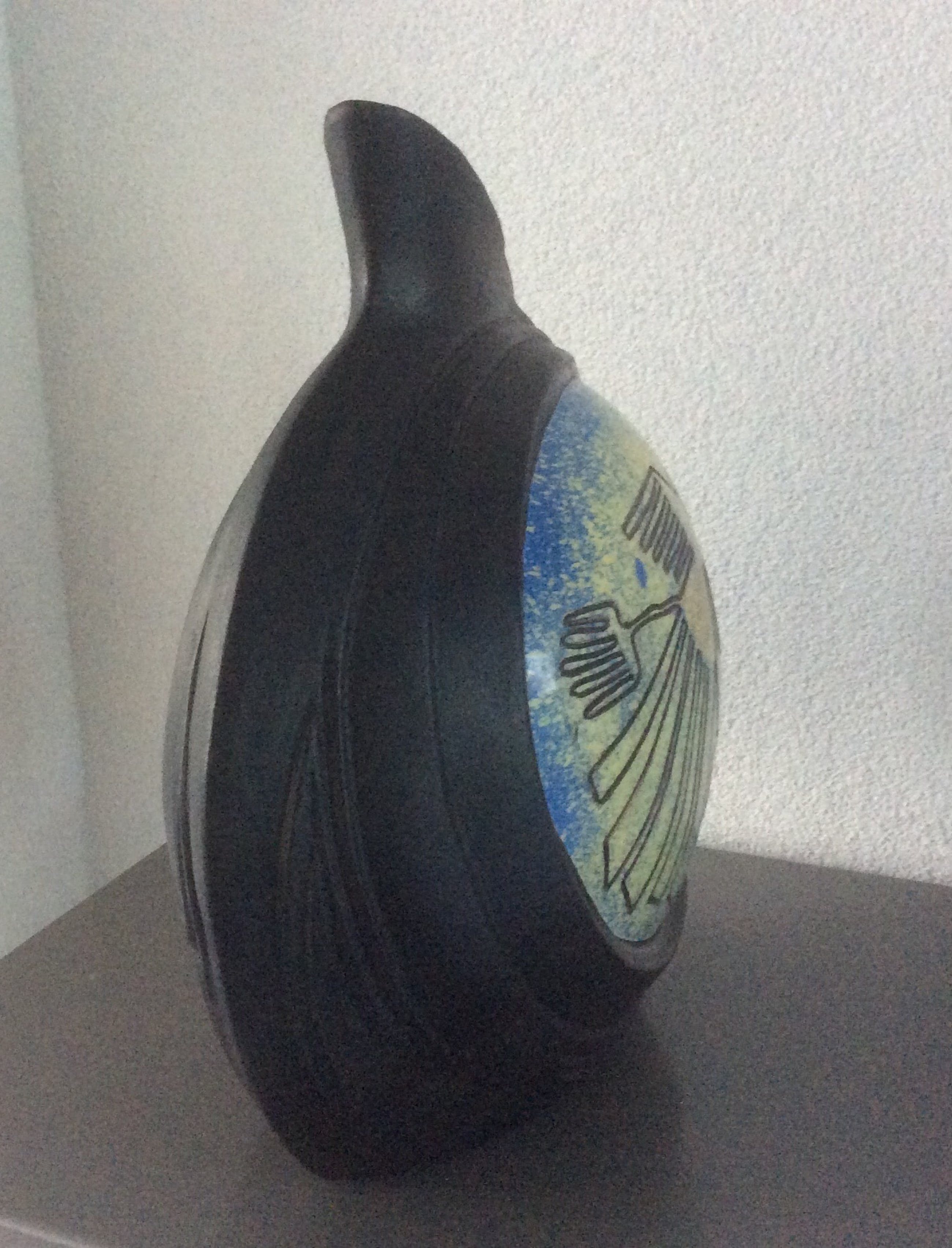 De vaas toont aan twee zijden een gestileerde vogelfiguren in diepdruk.