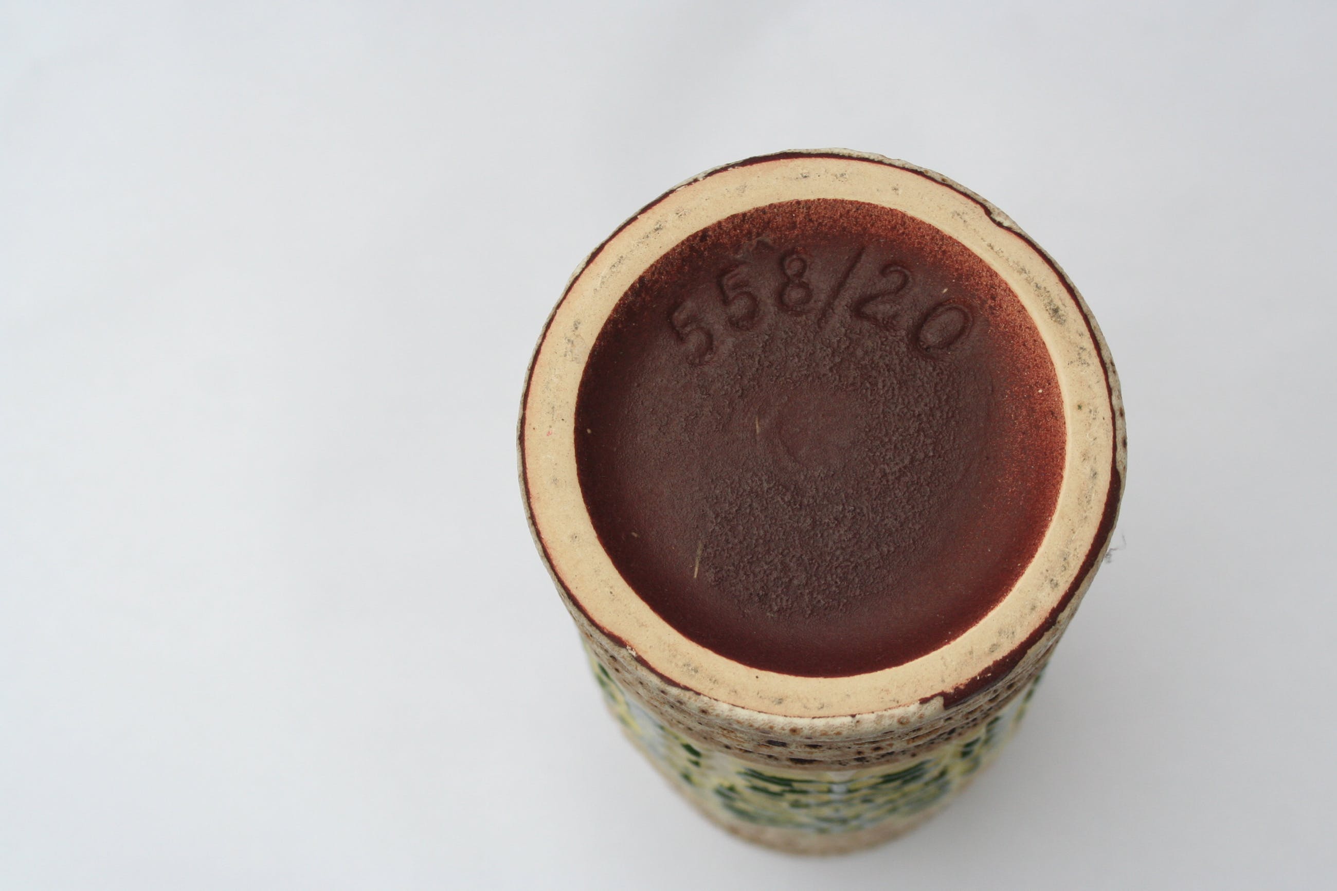 Fraaie vaas met dik glazuur, soms Fat Lava genoemd, middenin met bloemmotief. Model 588/20 staat aan de onderzijde.