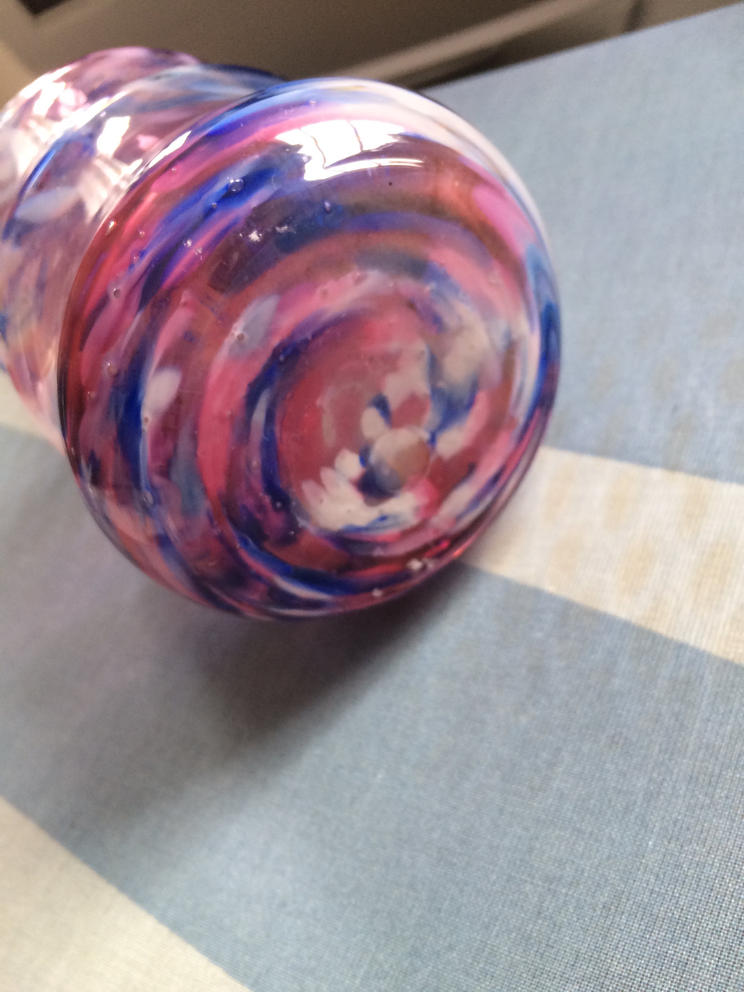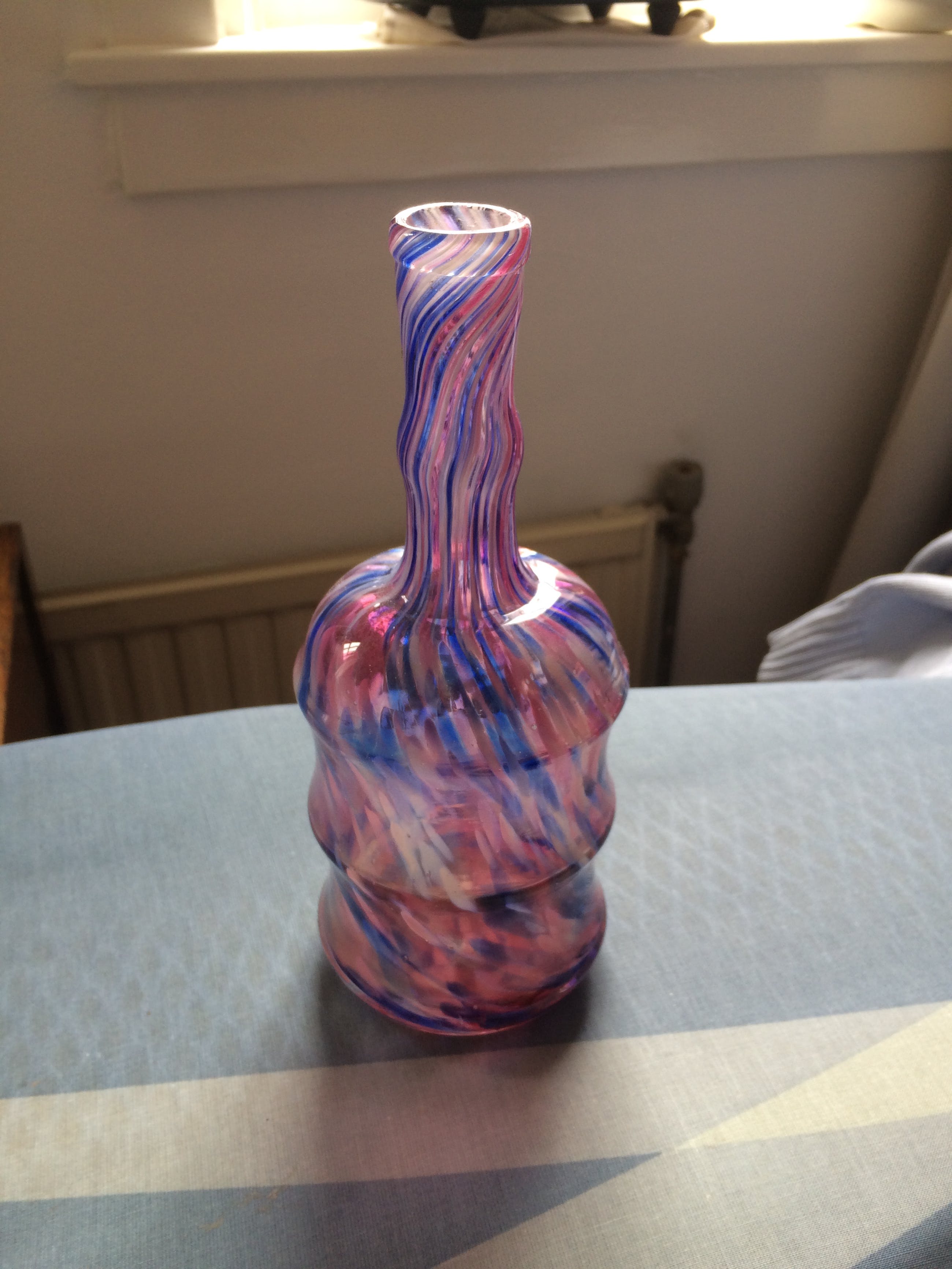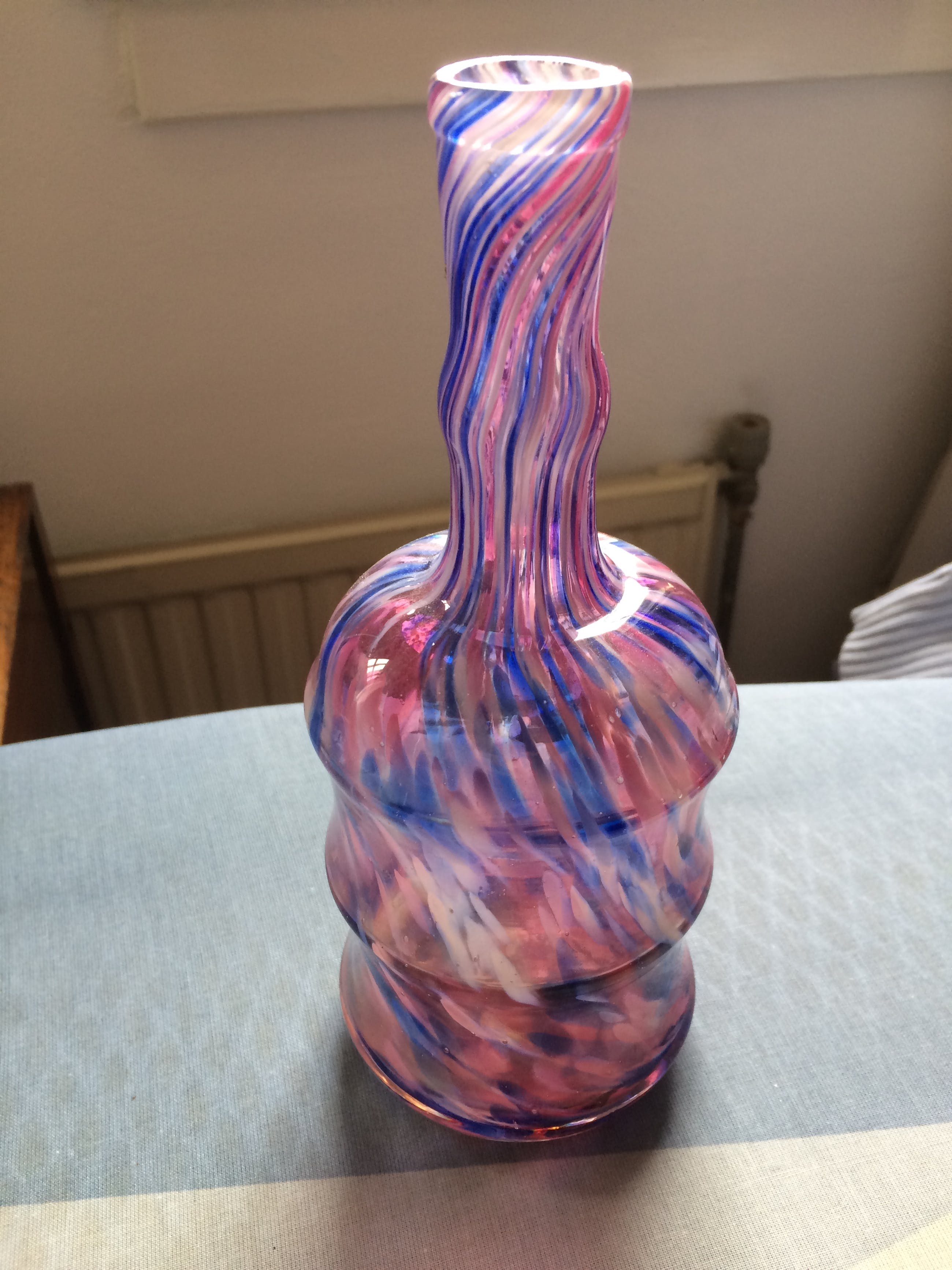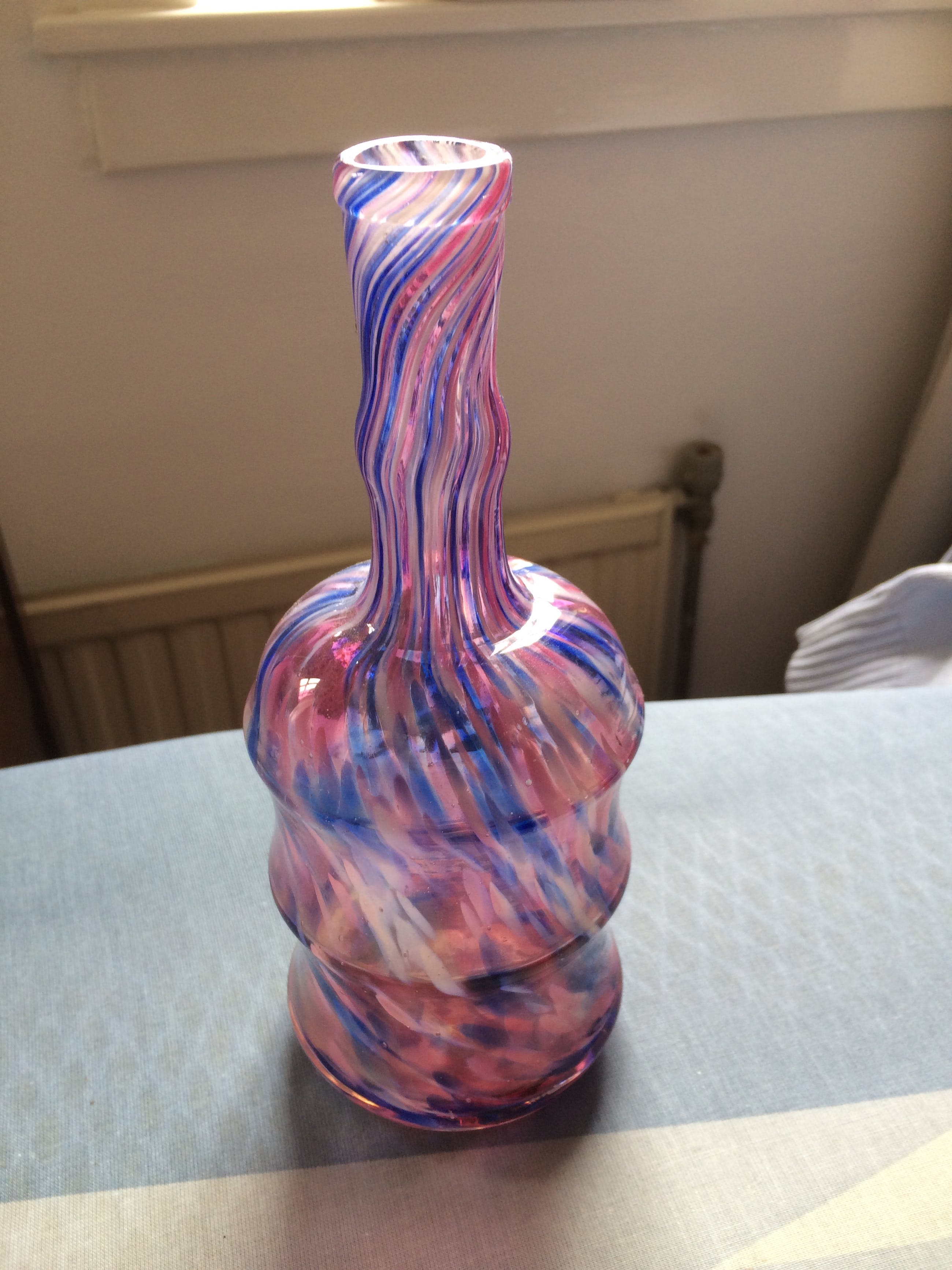 Veelkleurige flesvaas uit Murano( Venetië )Enkele oneffenheden uit hetfabricage-proces.Van oorsprong is dit een sier-flesvaasmaar de vaas kan uiteraard ook gebruikt als vaas met een fraaiebloesemtak , o.i.d.Verzending per PostNL. ( k.k. )
