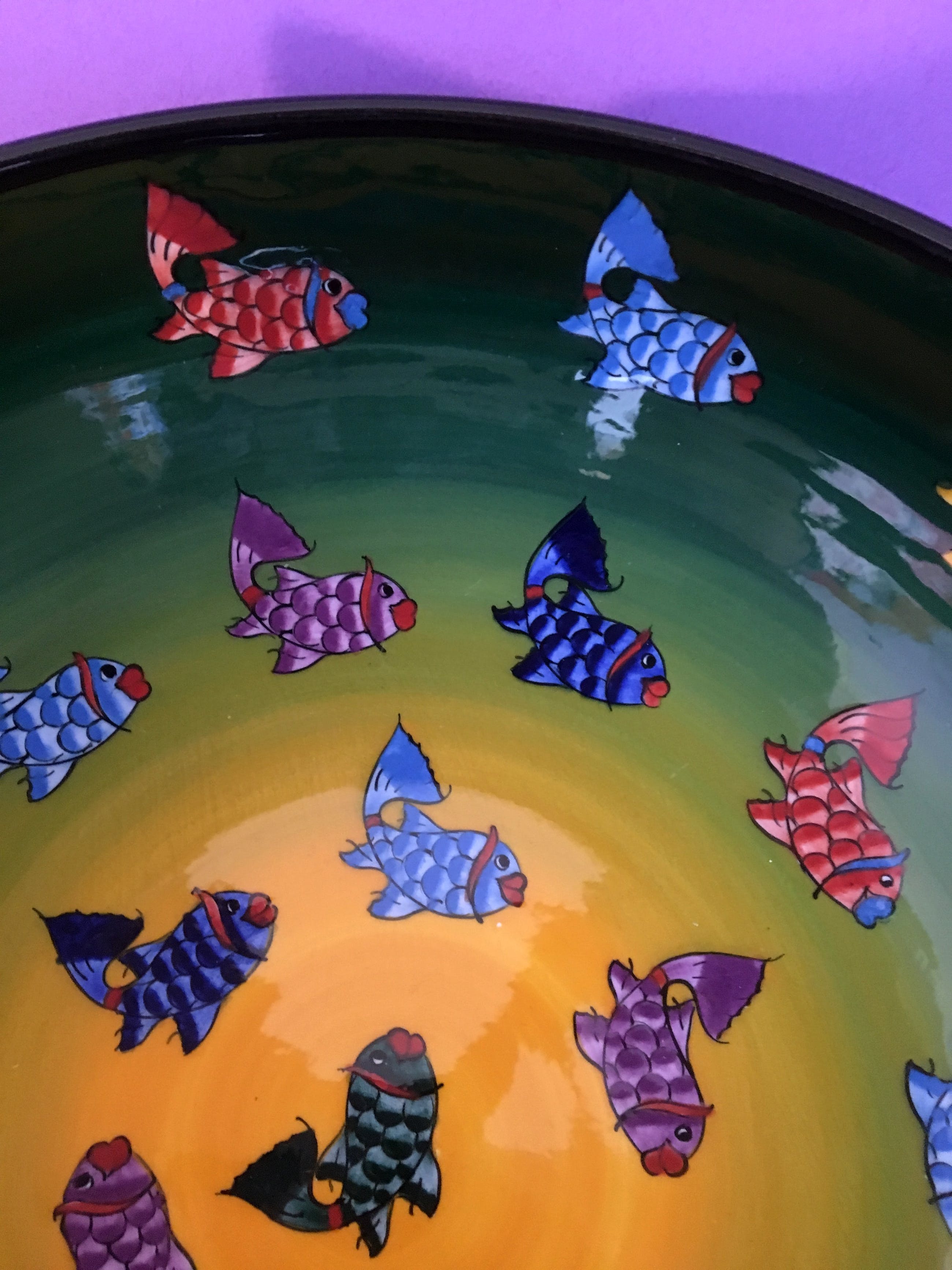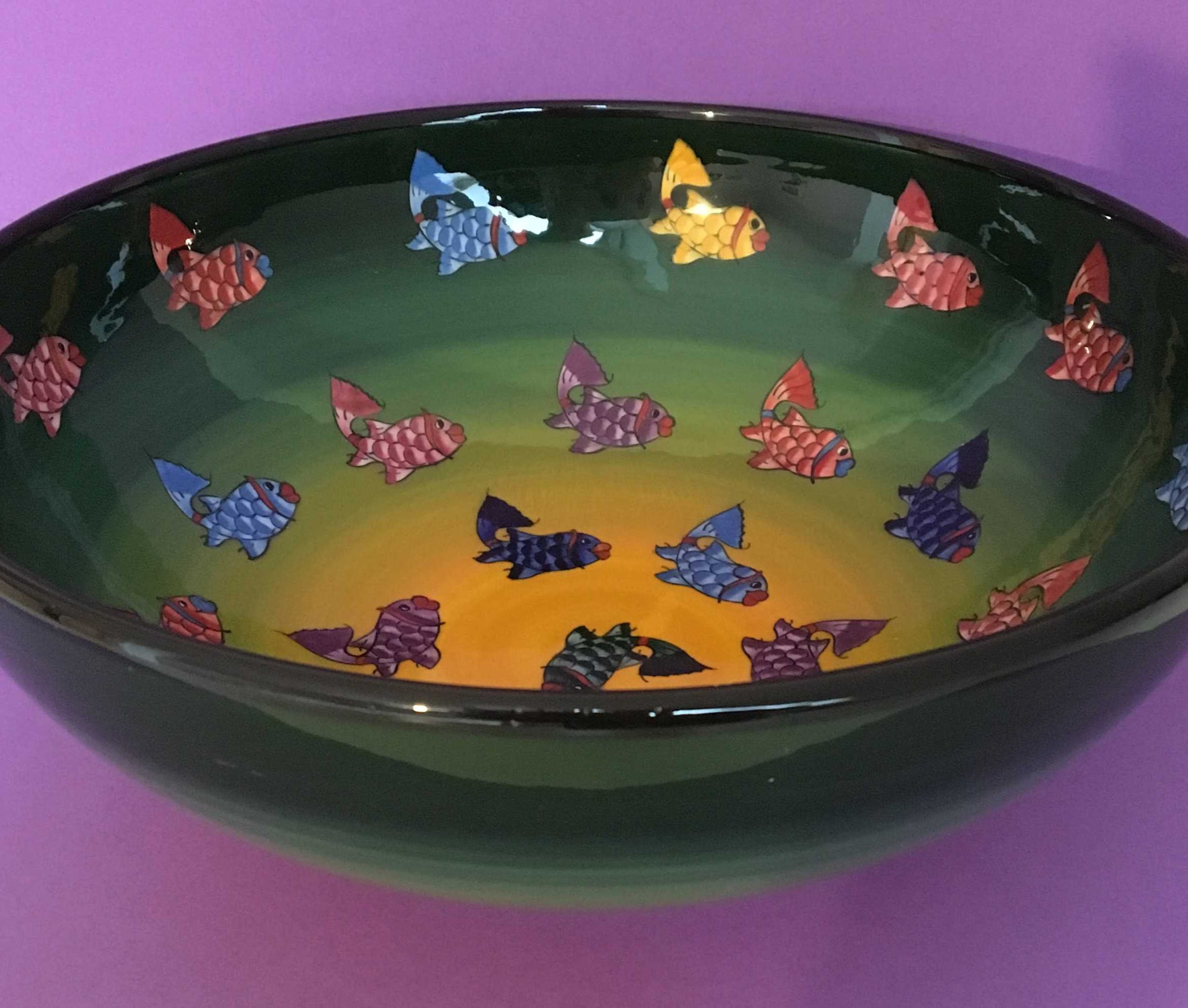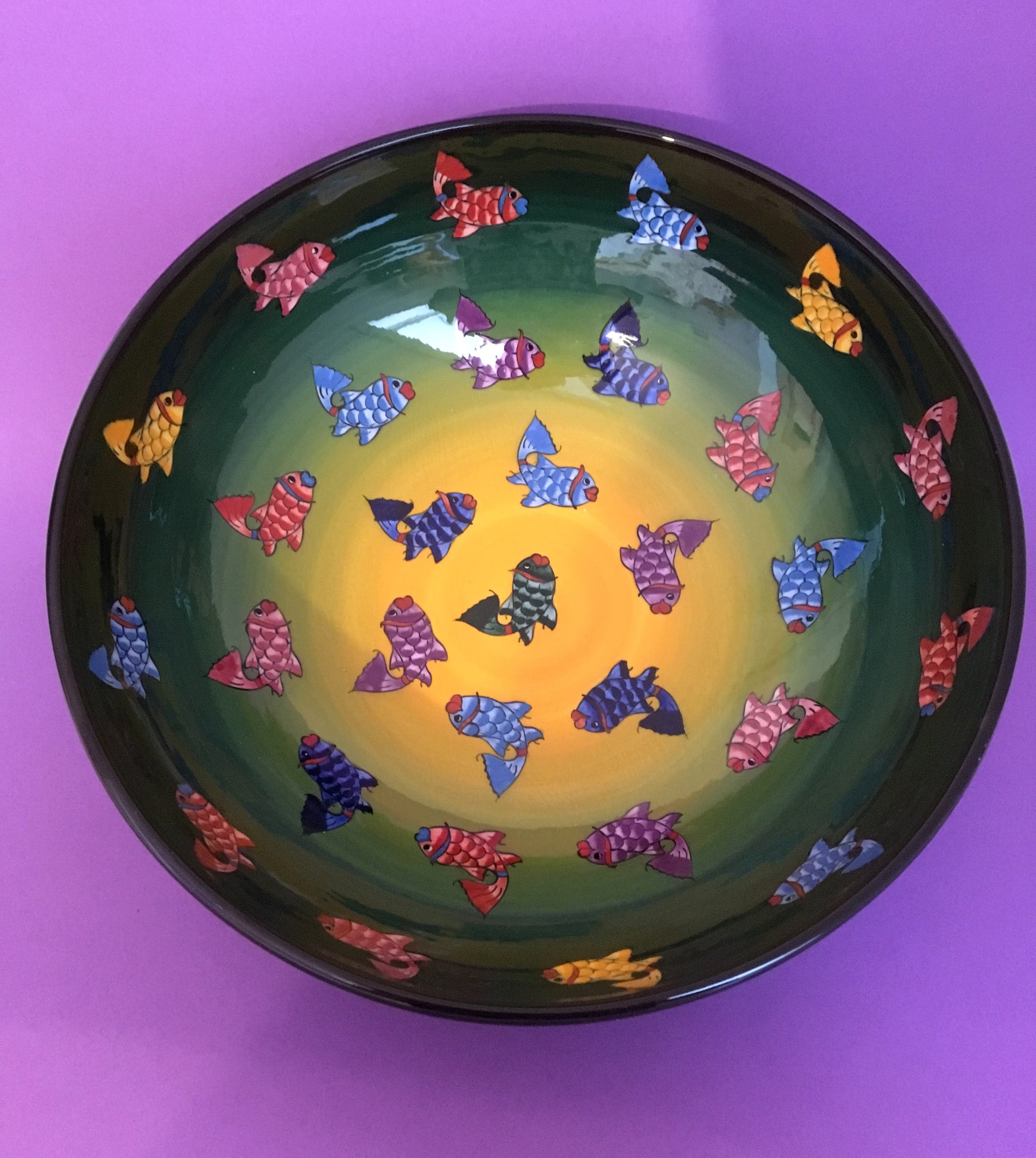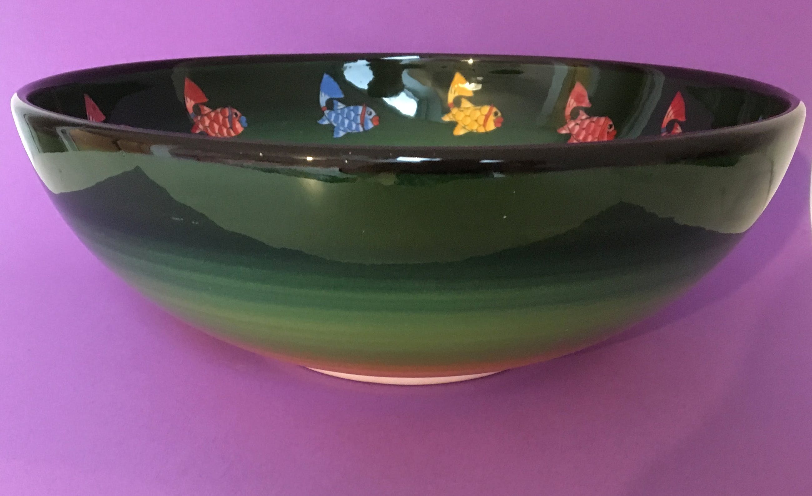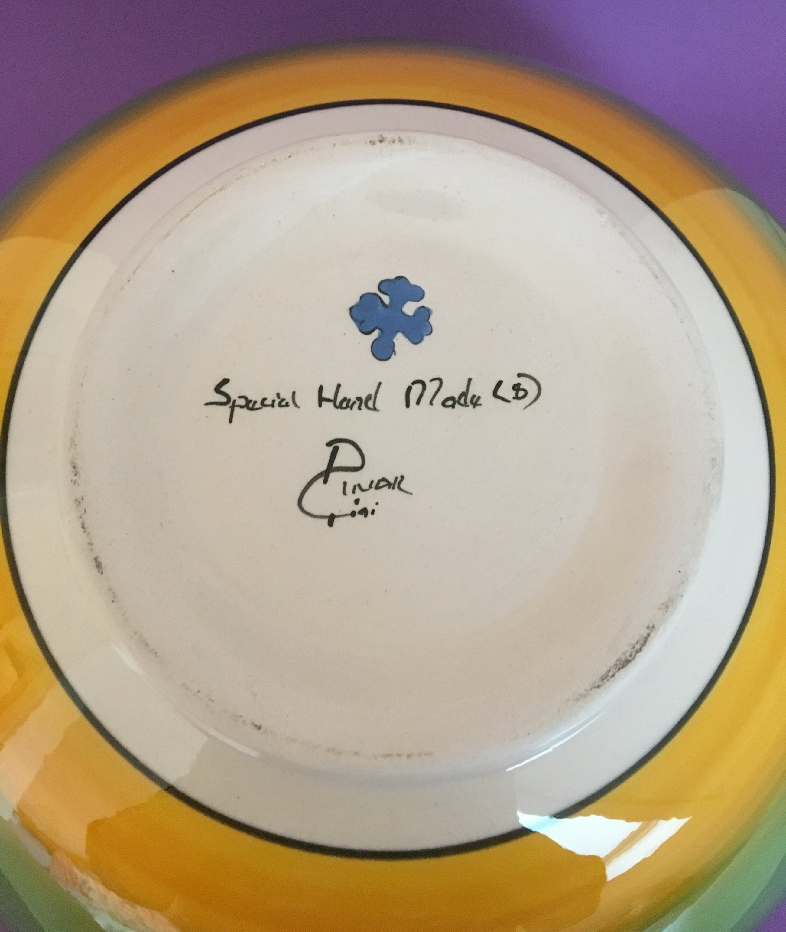 Fraaie veel kleurige schaal, handgedraaid, handgeschilderd. Witbakkende klei, hoogglans geglazuurd. Gesigneerd met Gigi Pinar, mij onbekend. Diameter van deze vrolijke schaal 30 cm. Hoogte 11 cm. Zonder gebreken. Gewicht 1328 gram.