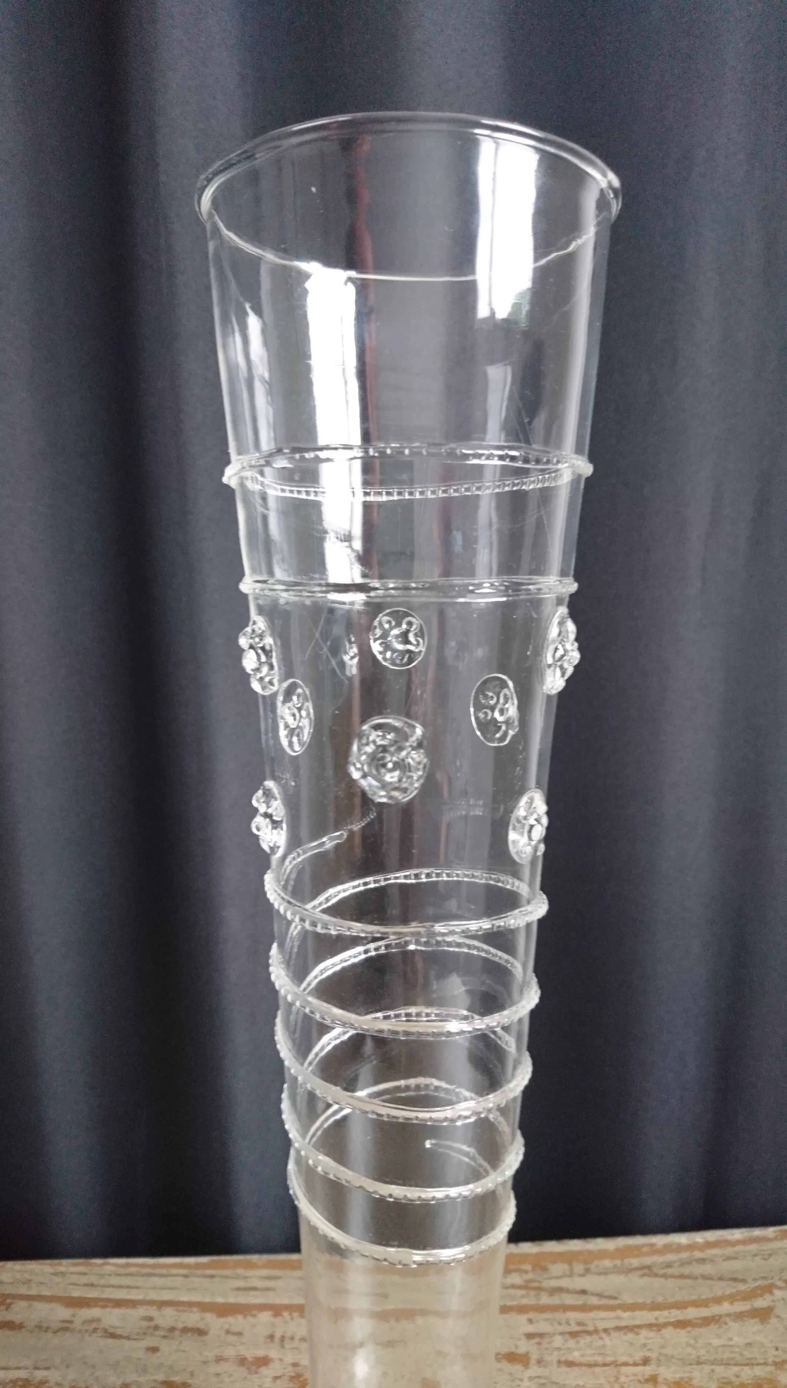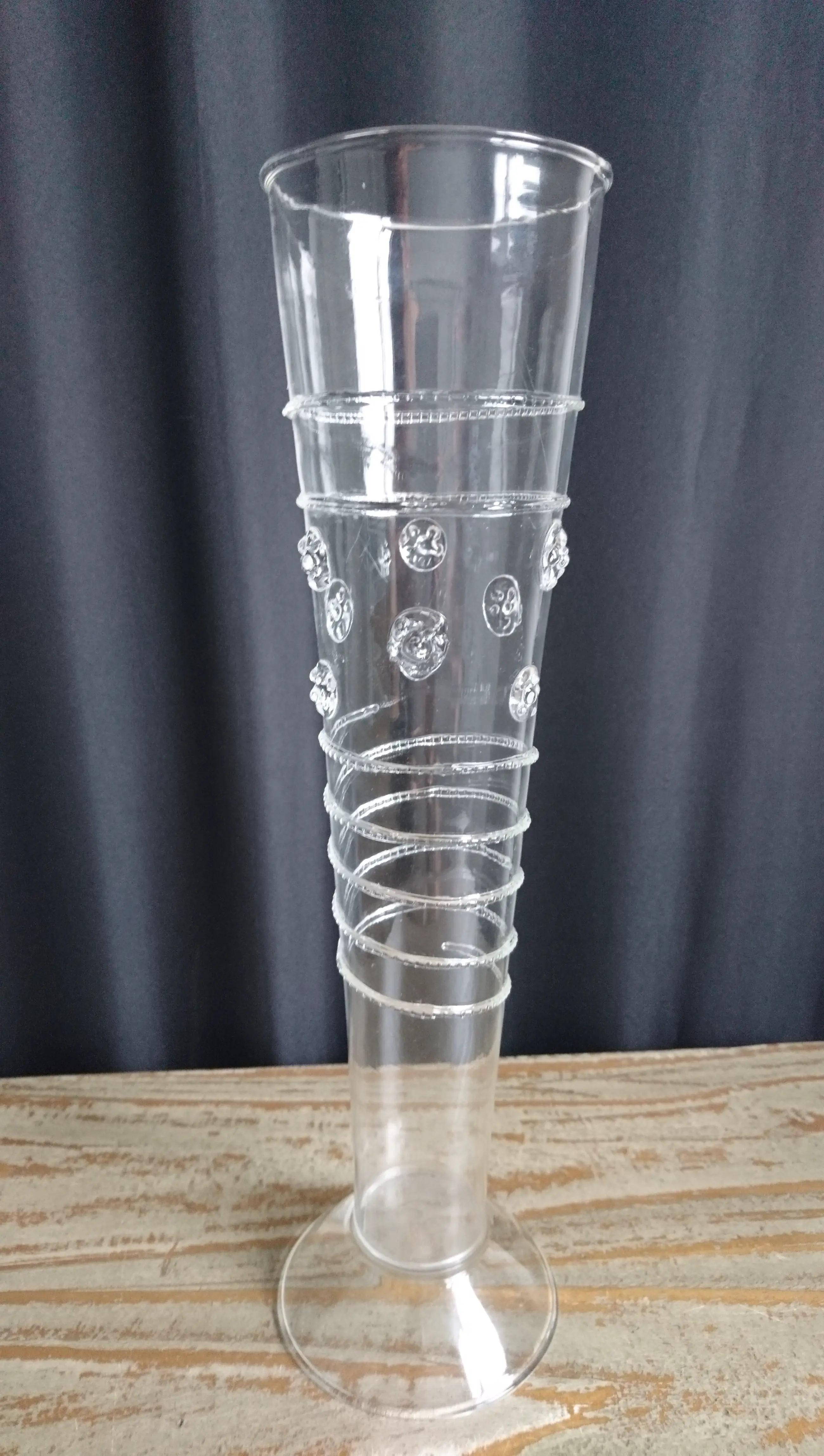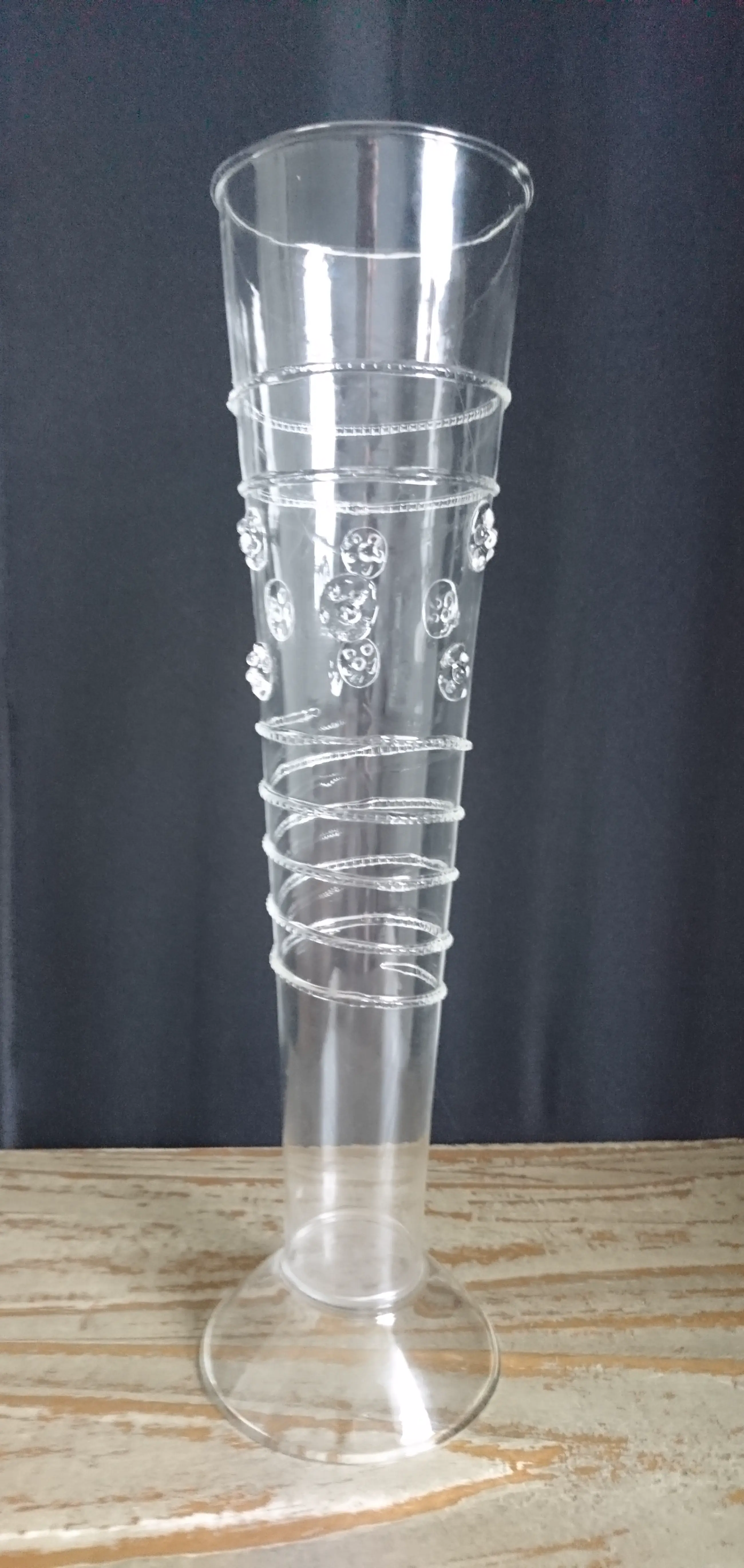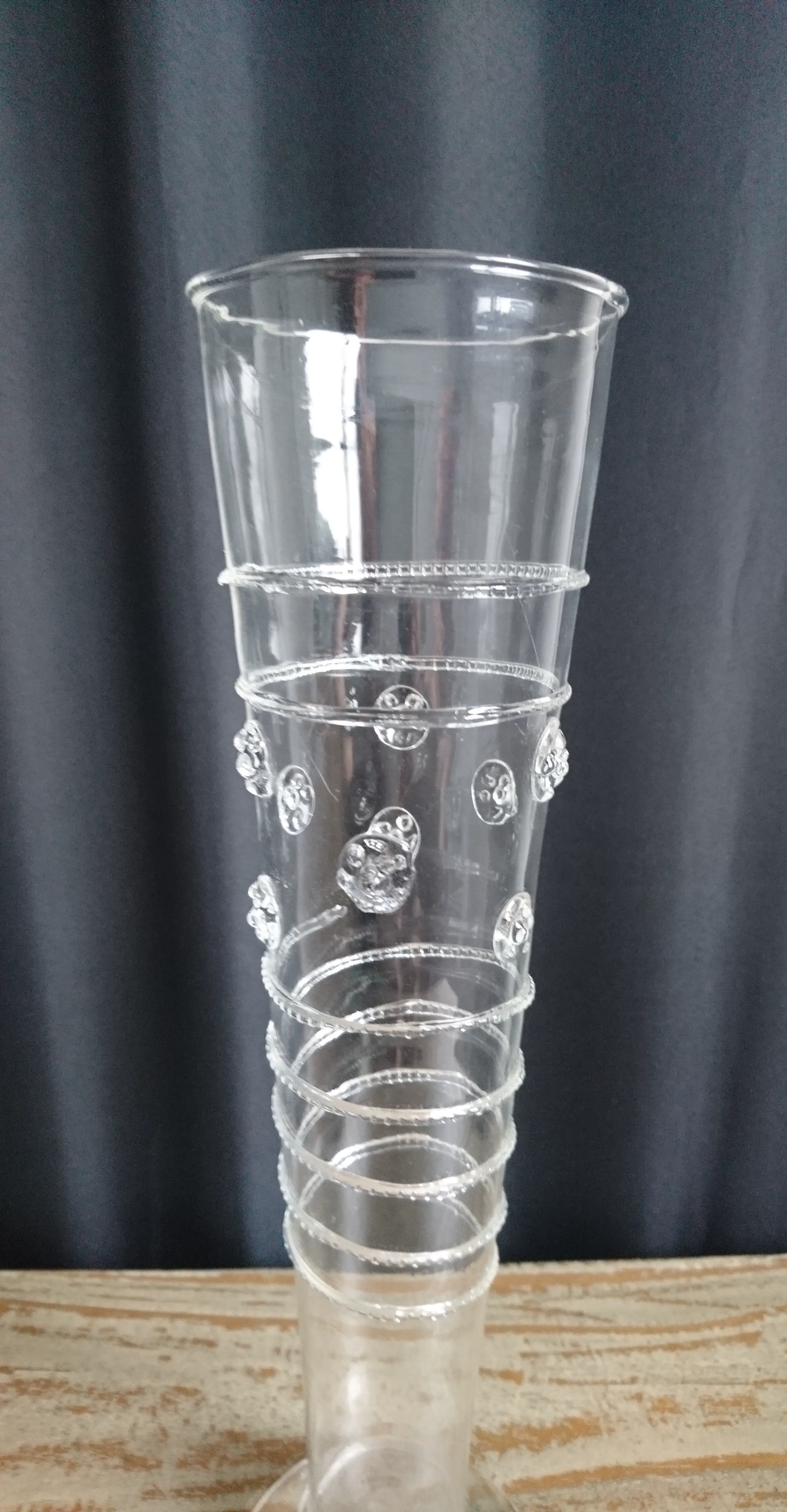 Venetiaans mondgeblazen glazen flute (replica). Het glas is versierd met linten en noppen. Het is zeer licht en dun glaswerk. In goede staat. Wordt beschermd verpakt en verzonden.