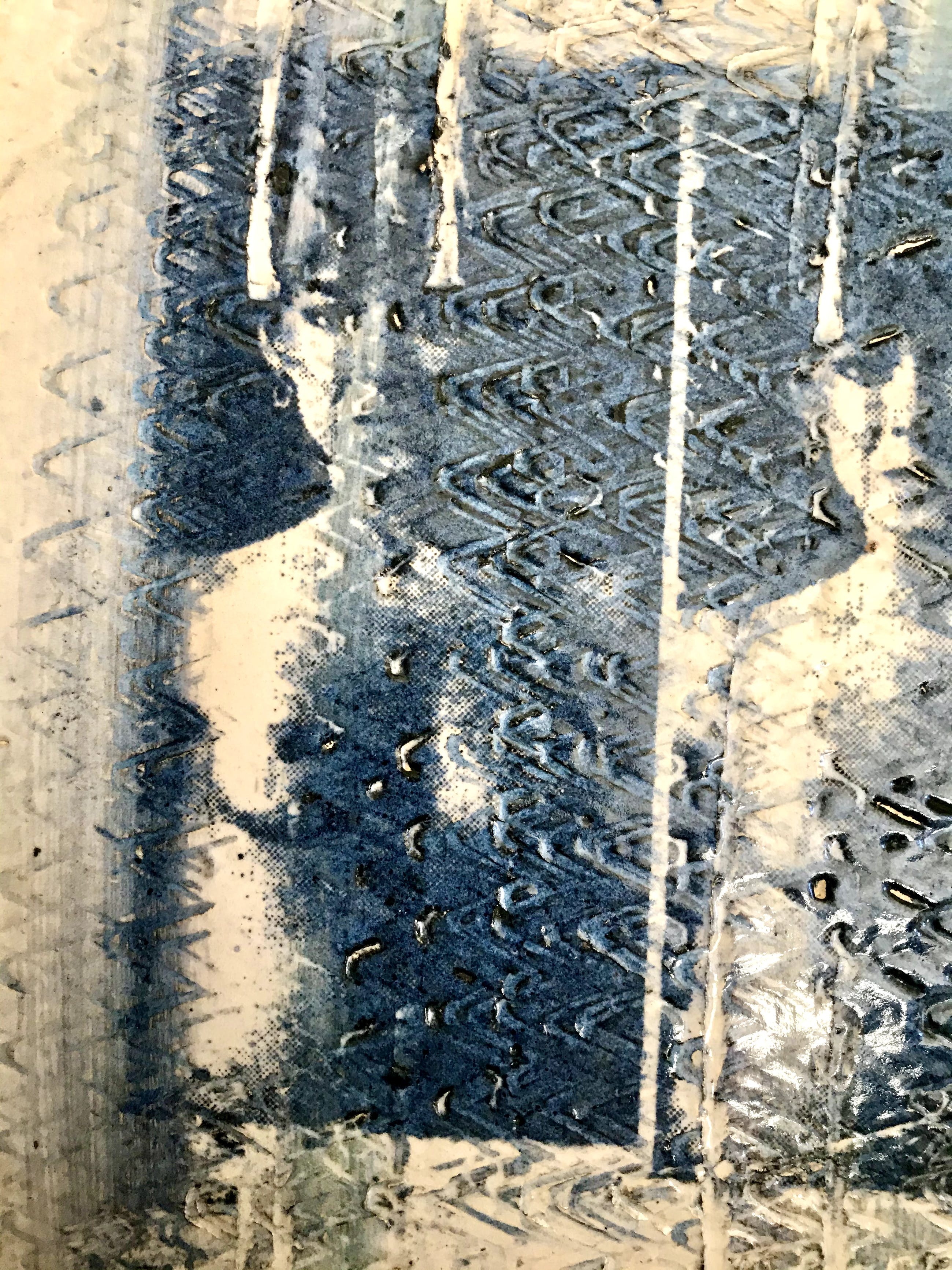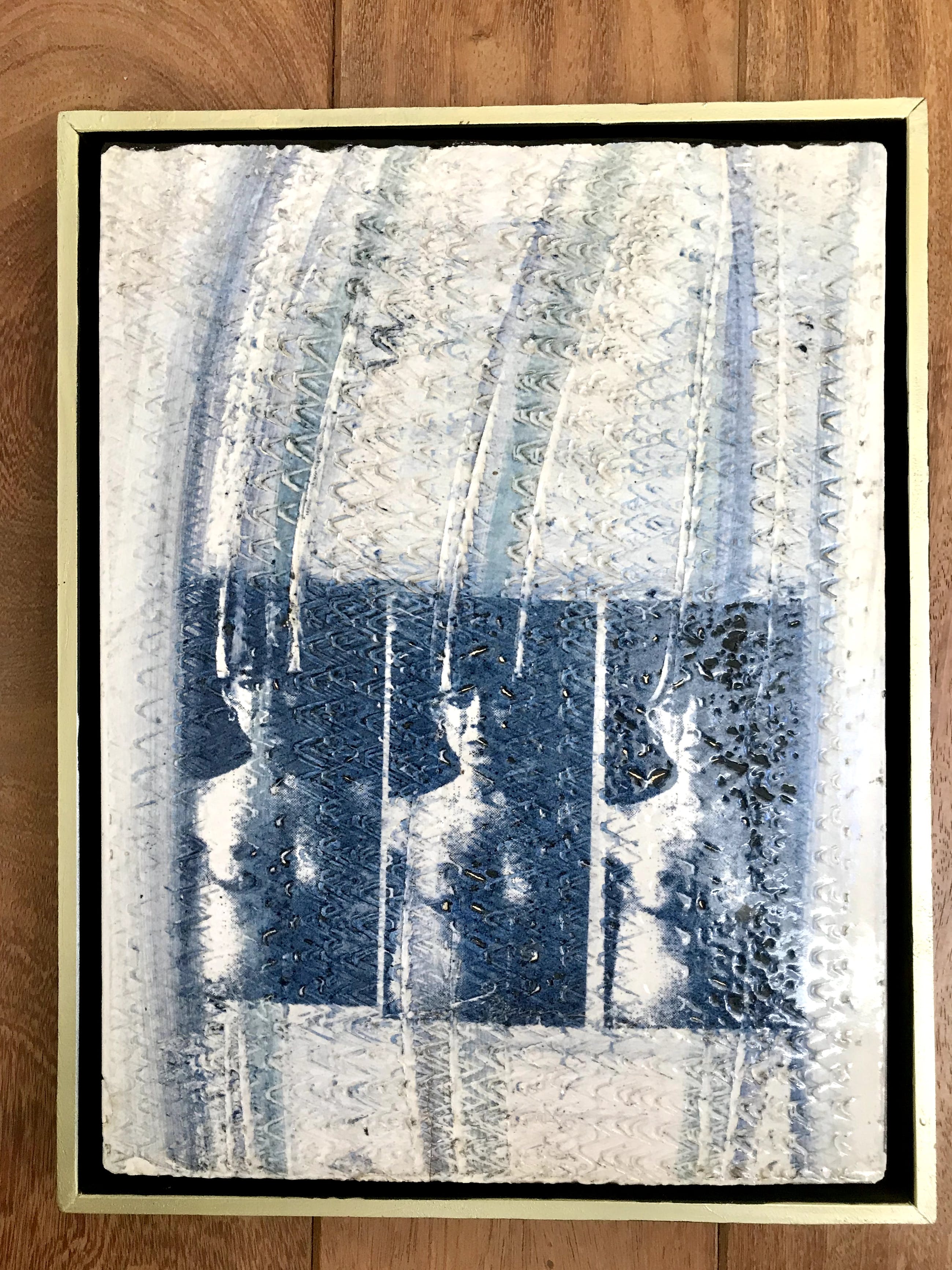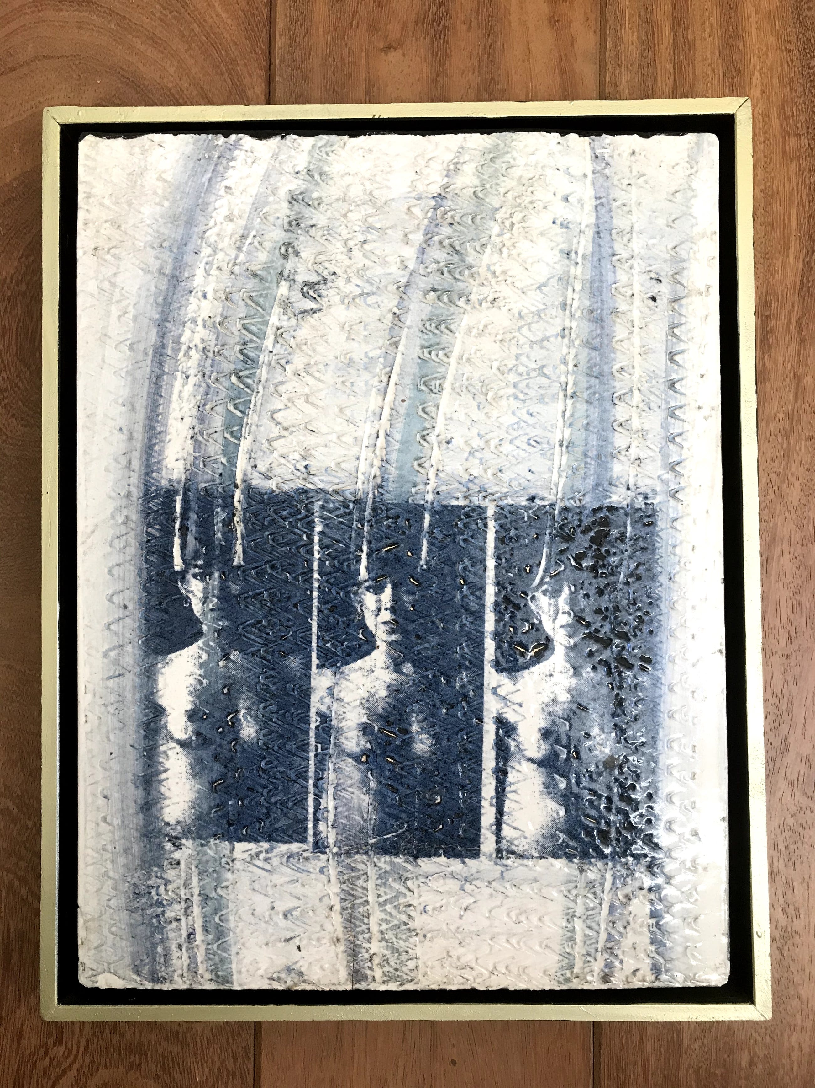 Erotische foto van dame,  bewerkt en geëtst in keramische plaat.