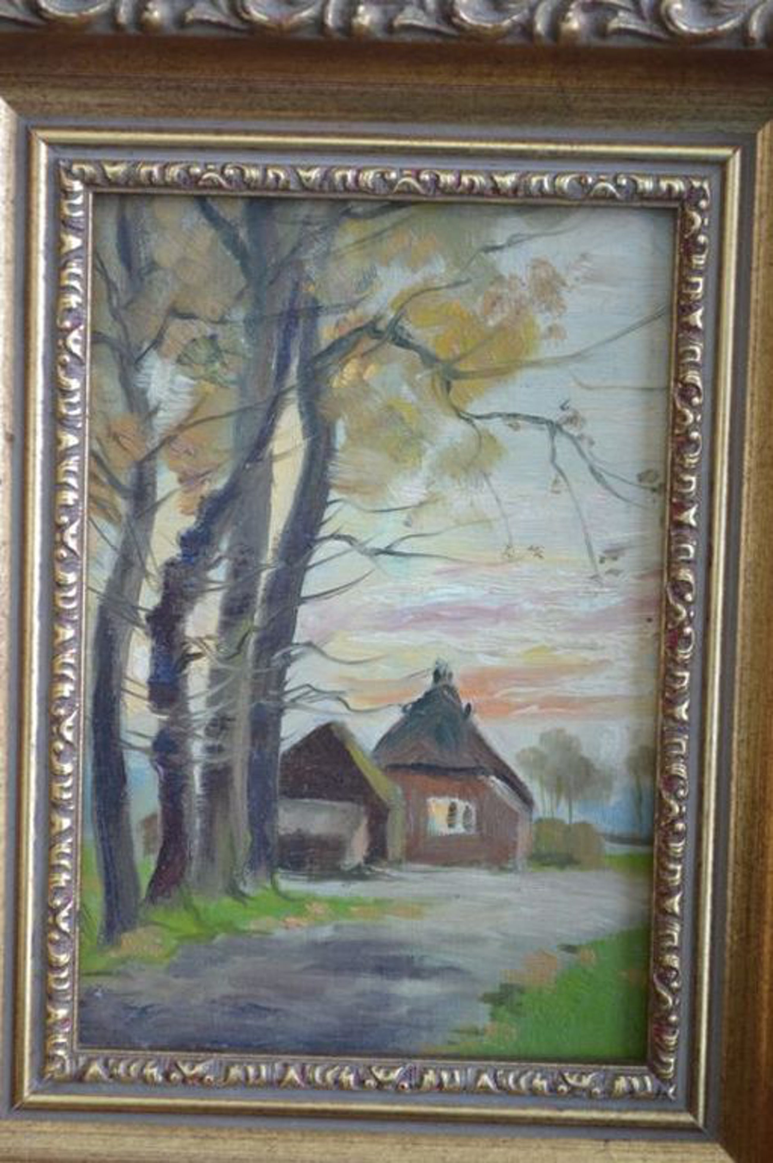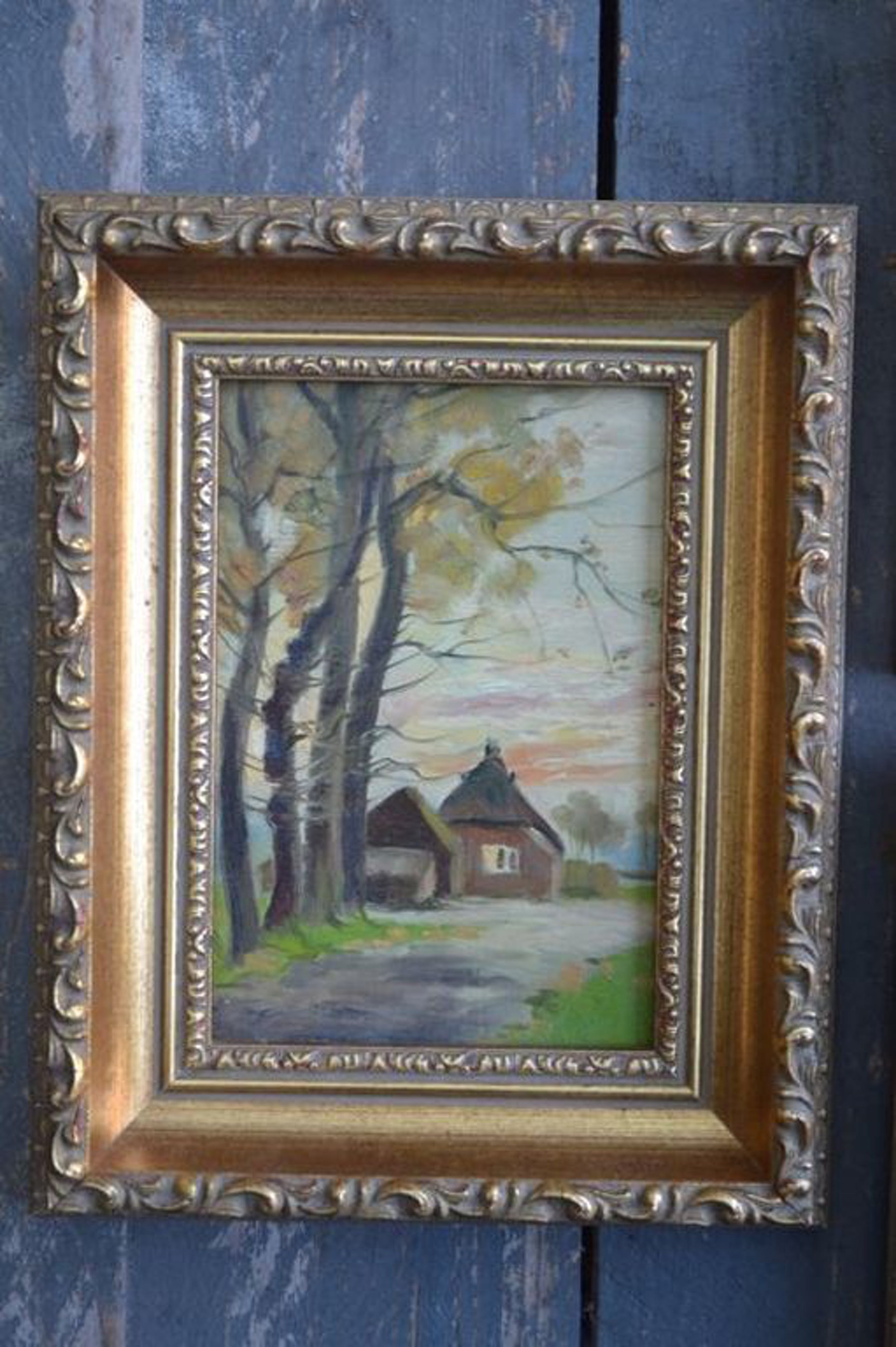 2) Landschap met boerderij en bomen. Olieverf op doek op board. Afmeting schilderij 16,5x11,5 cm en van de lijst 24x19cm.