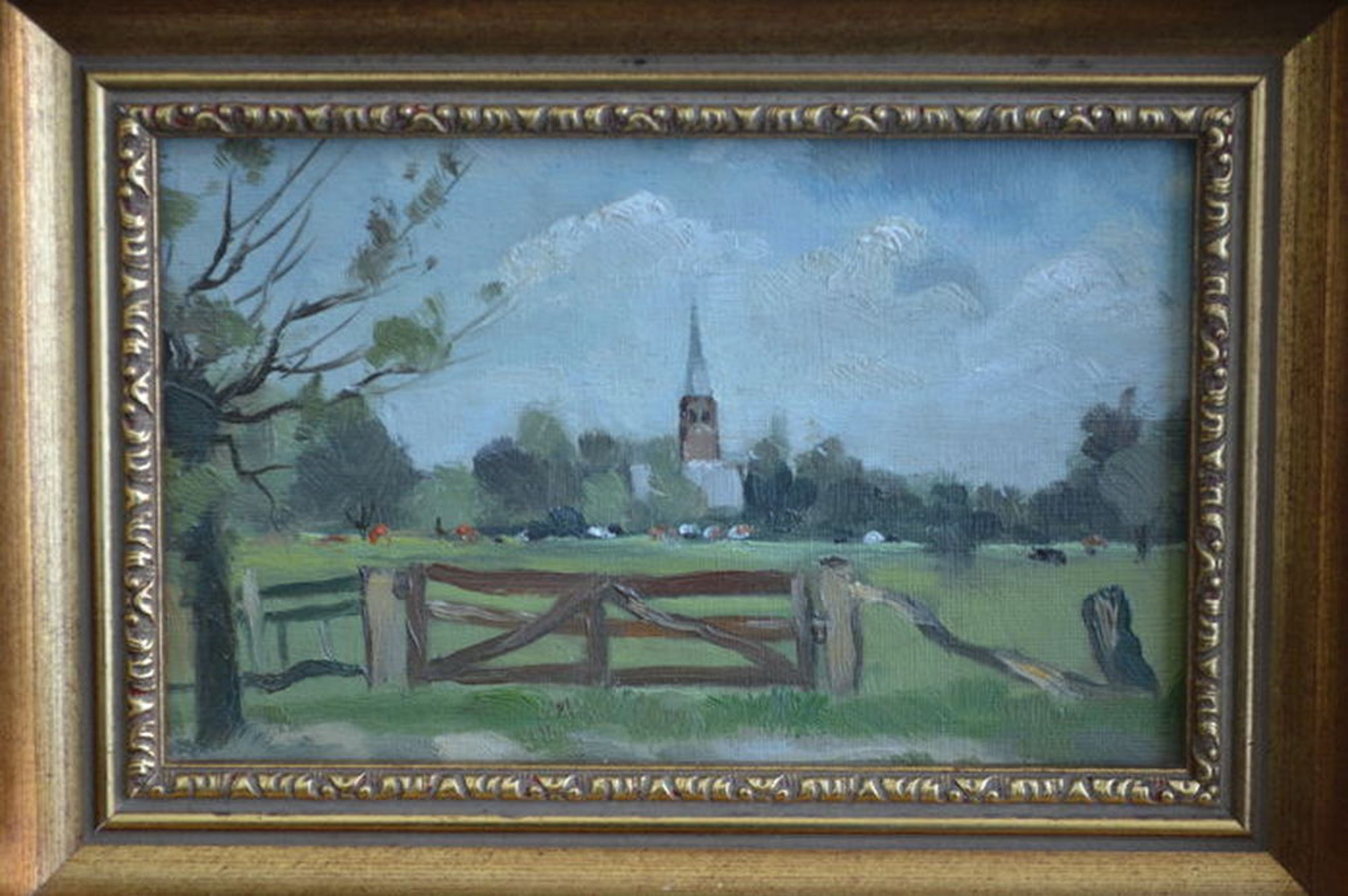 3) Landschap met weiland en kerk. Olieverf op doek op board. Afmeting schilderij 18x12cm en van de lijst 26x19cm.