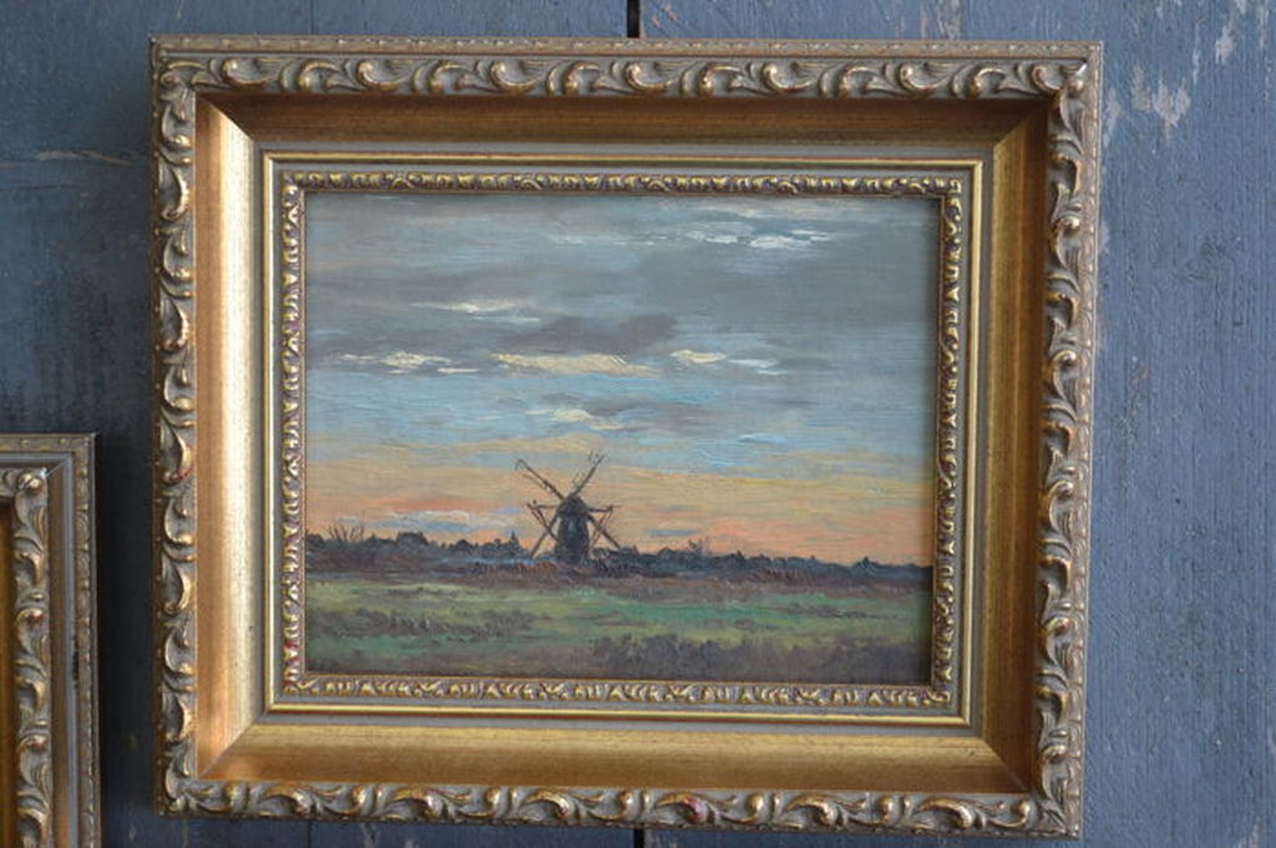1) Landschap met molen en vallende avond. Olieverf op doek op karton. Afmeting schilderij 19x14,5 cm en van de lijst 26x22cm.