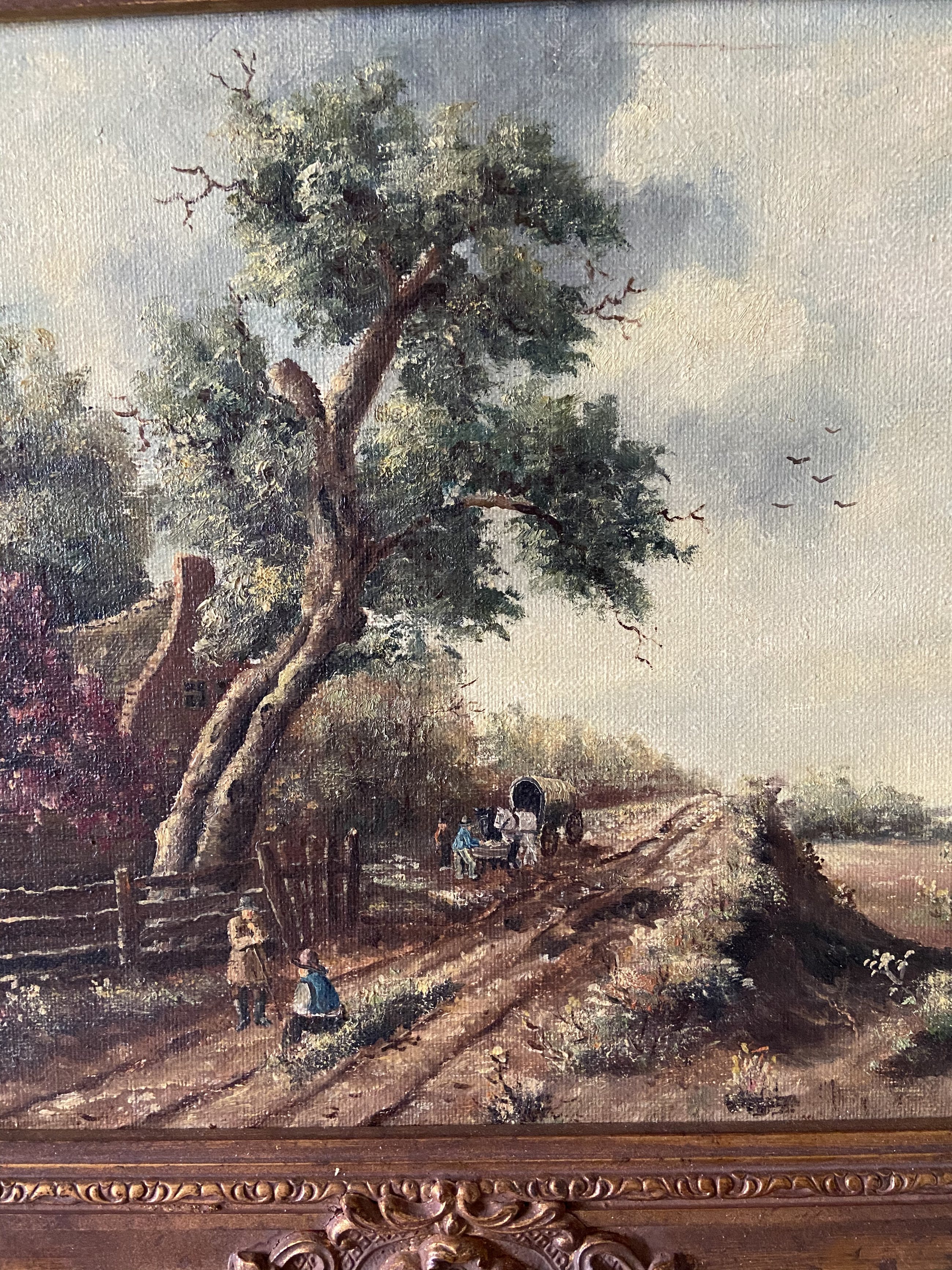 Romantische afbeelding van landweg met huifkar en figuren, omzoomd door bomen.